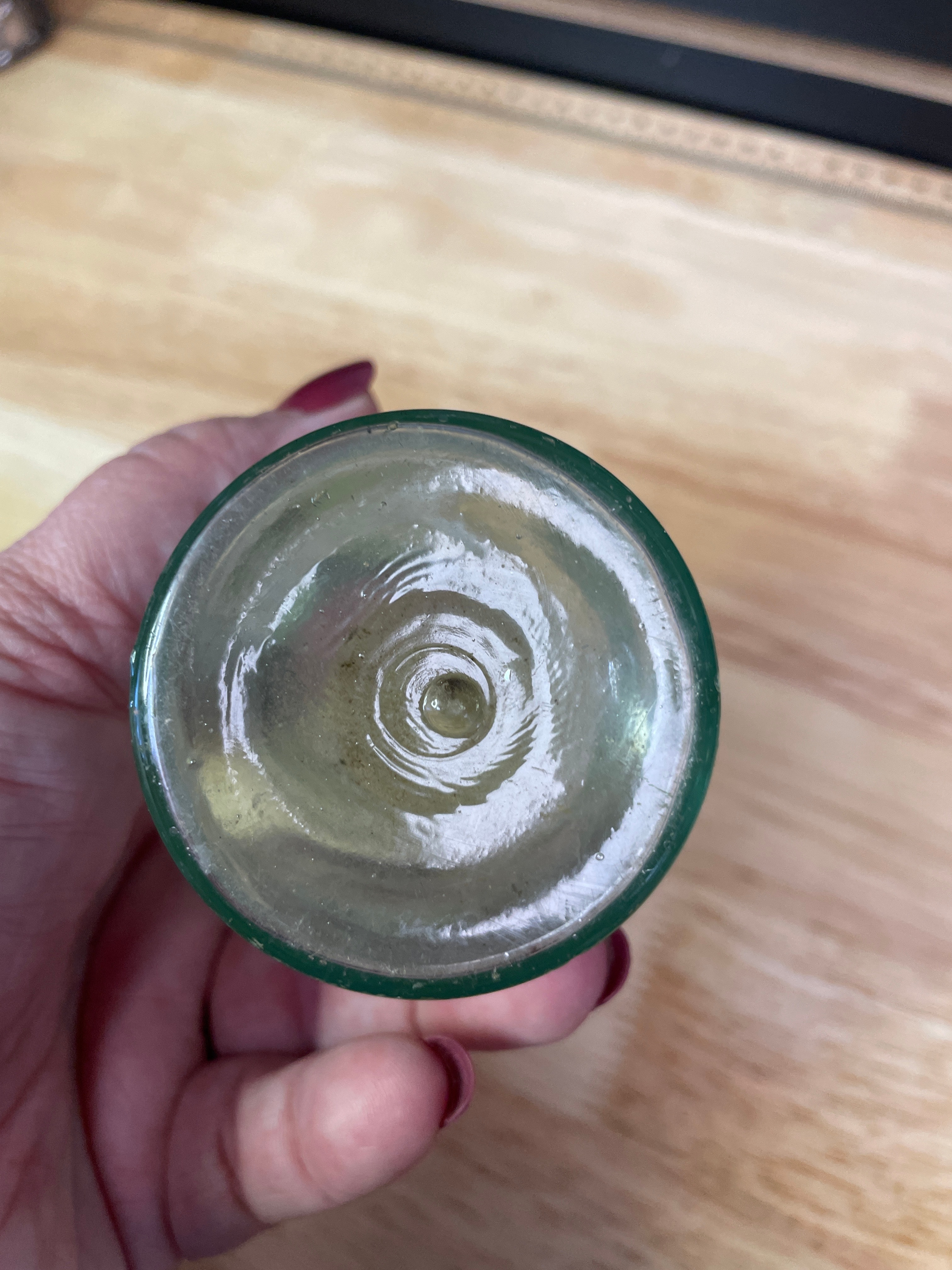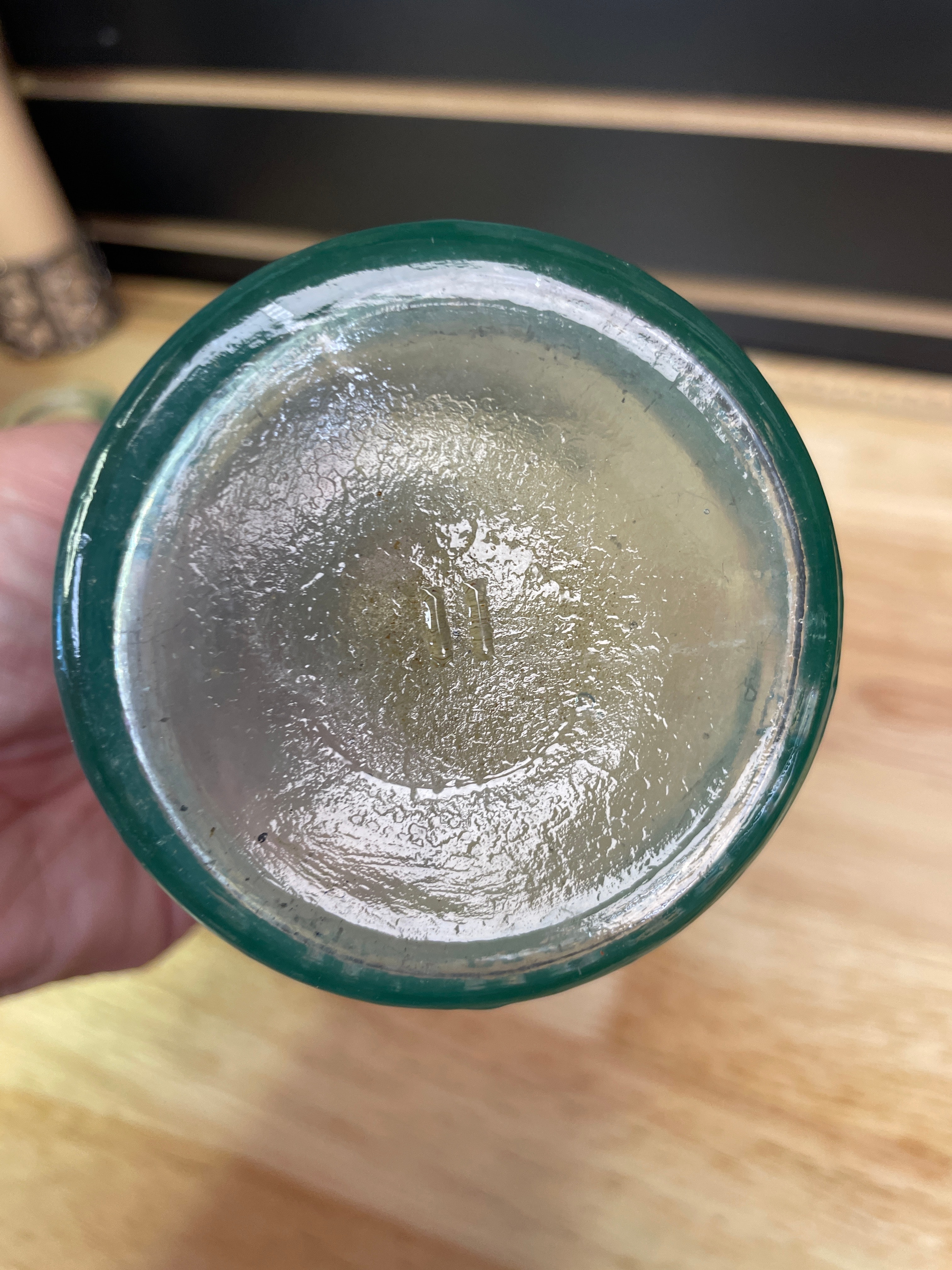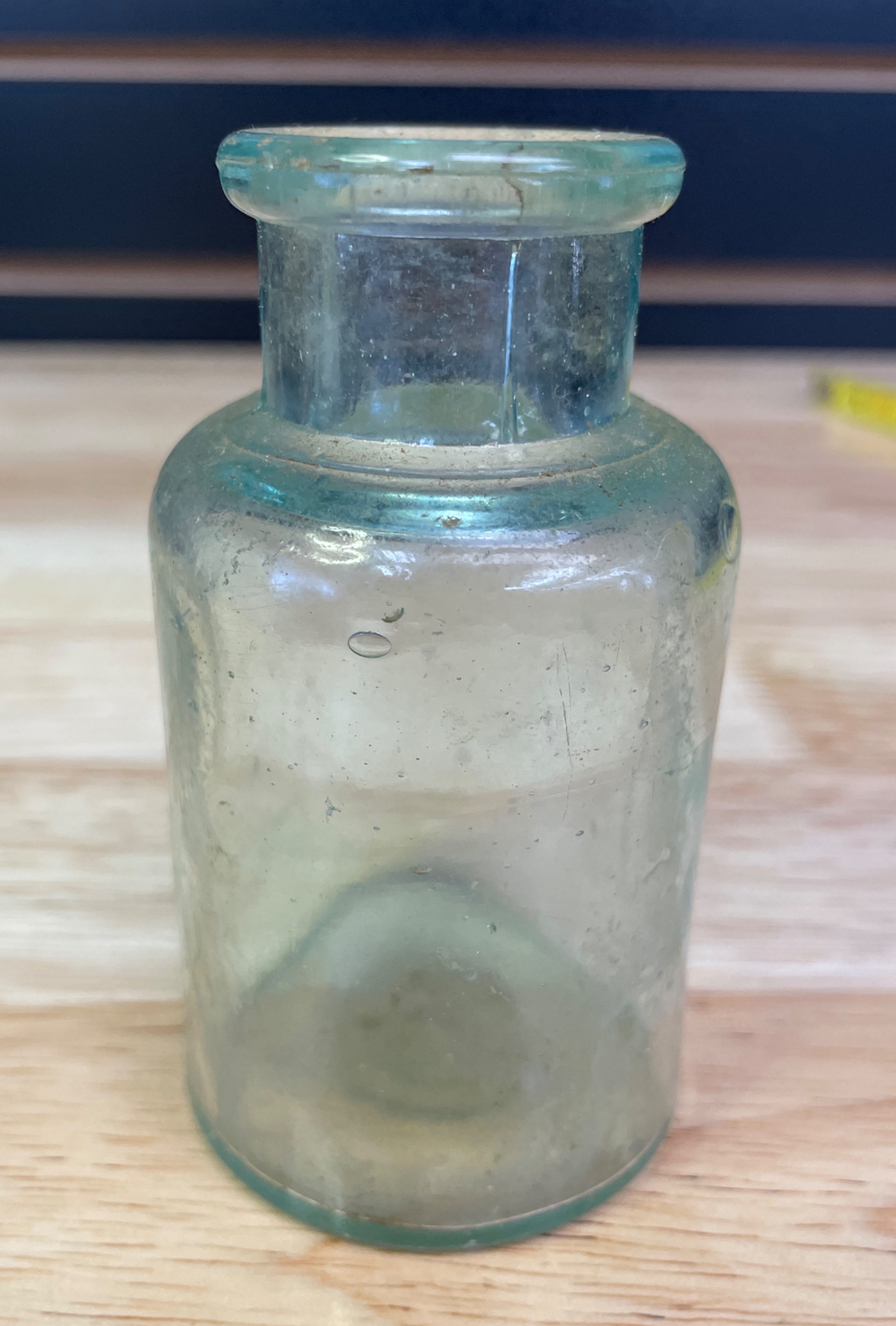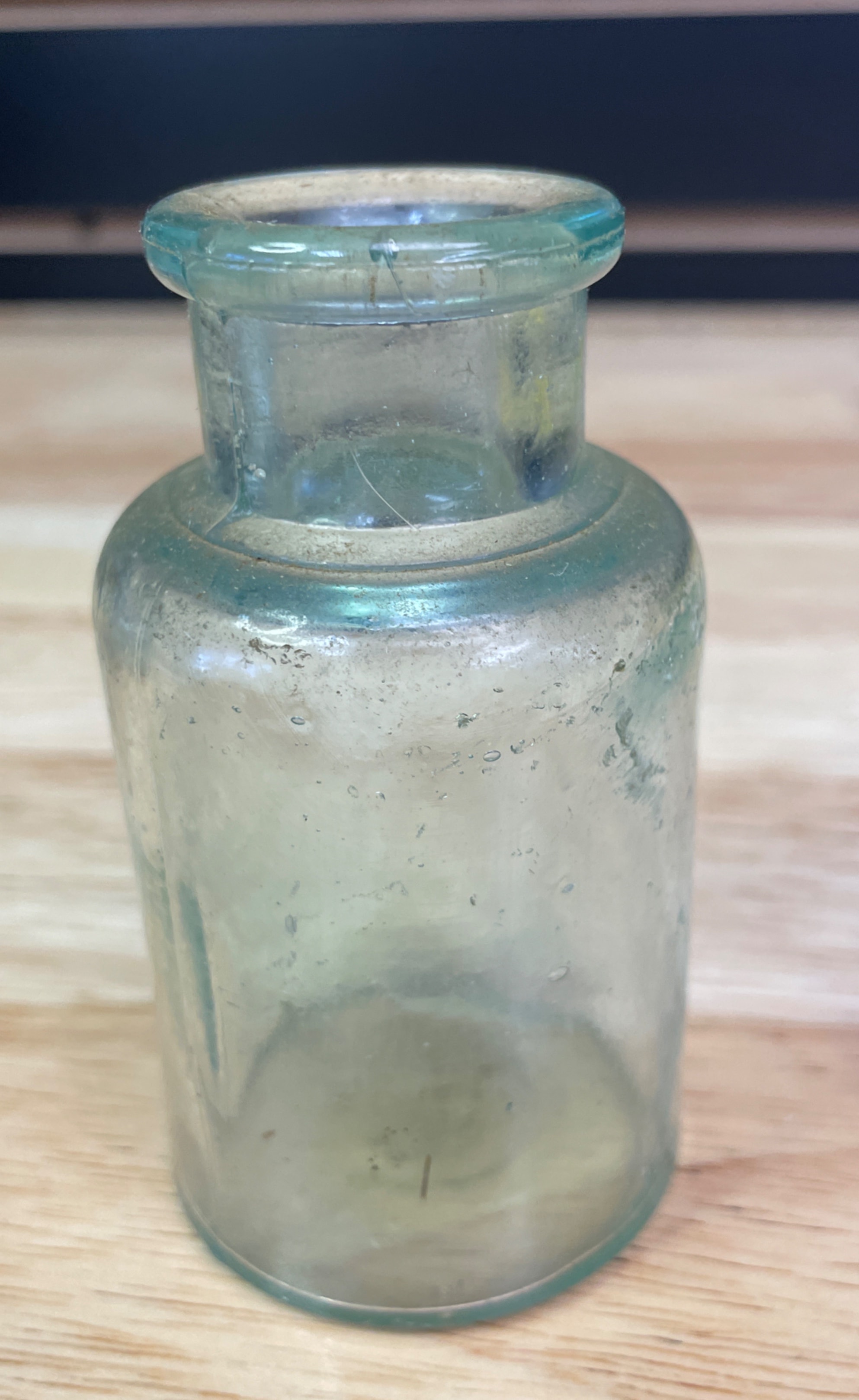 Three vintage glass bottles and jar, including a small clear-to-light-green jar with a wire bail handle embossed ‘WIRE SIDE’ (approx. 3 inches tall), a small plain light greenish-blue bottle, and a larger light greenish-blue bottle embossed ‘MELLIN’S FOOD CO, ‘ ‘SMALL SIZE, ‘ and ‘BOSTON U.S.A., ‘ with a ‘1’ on the bottom.