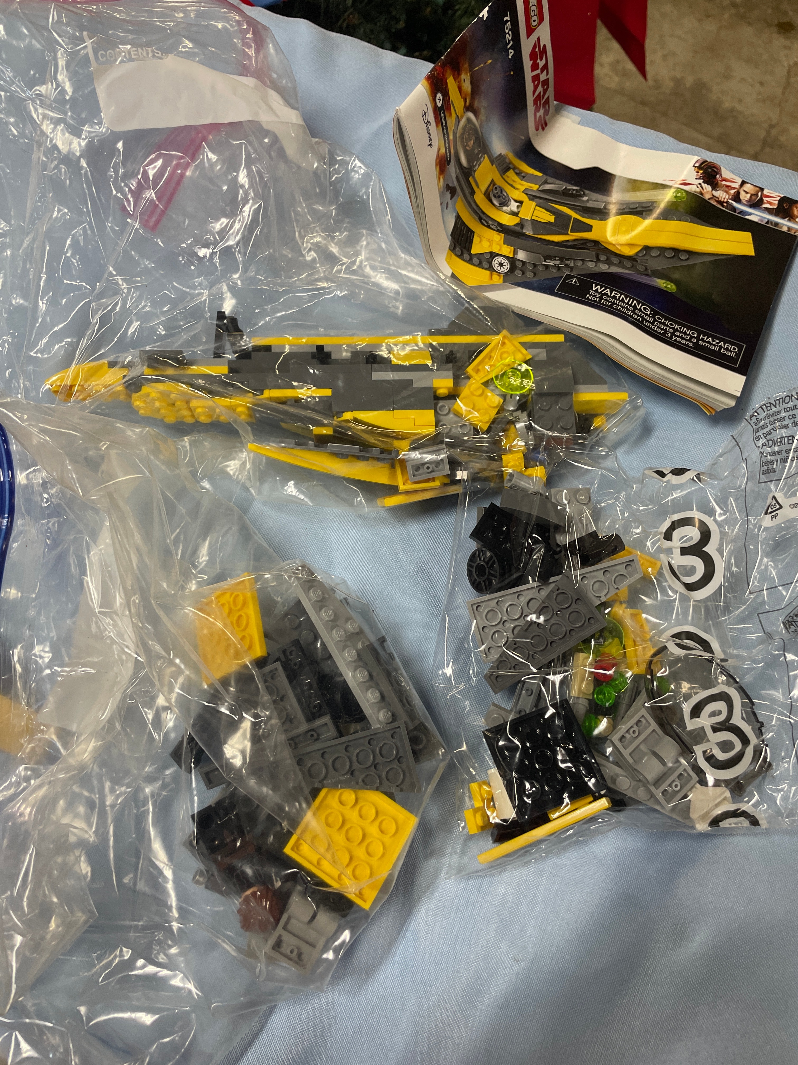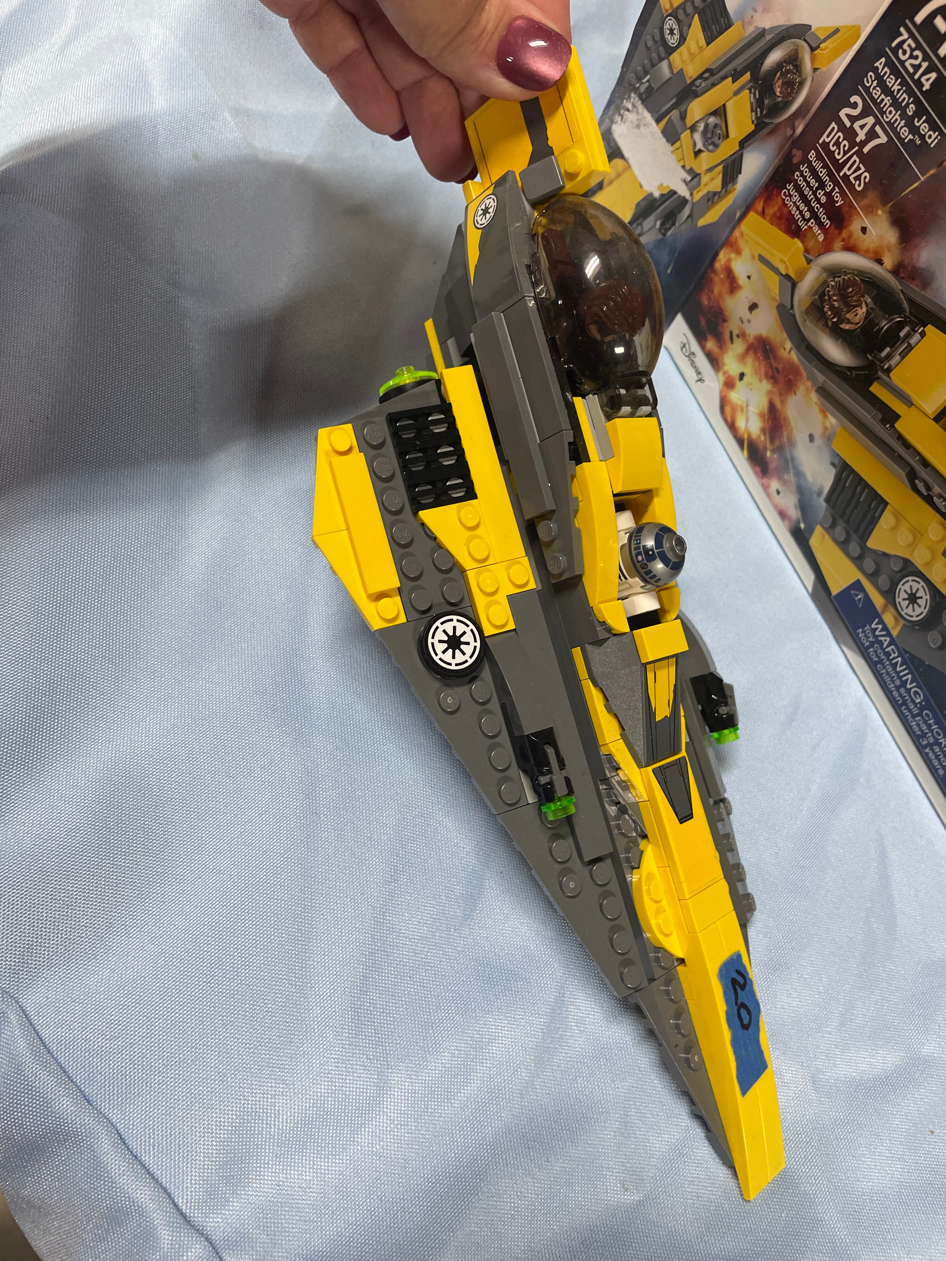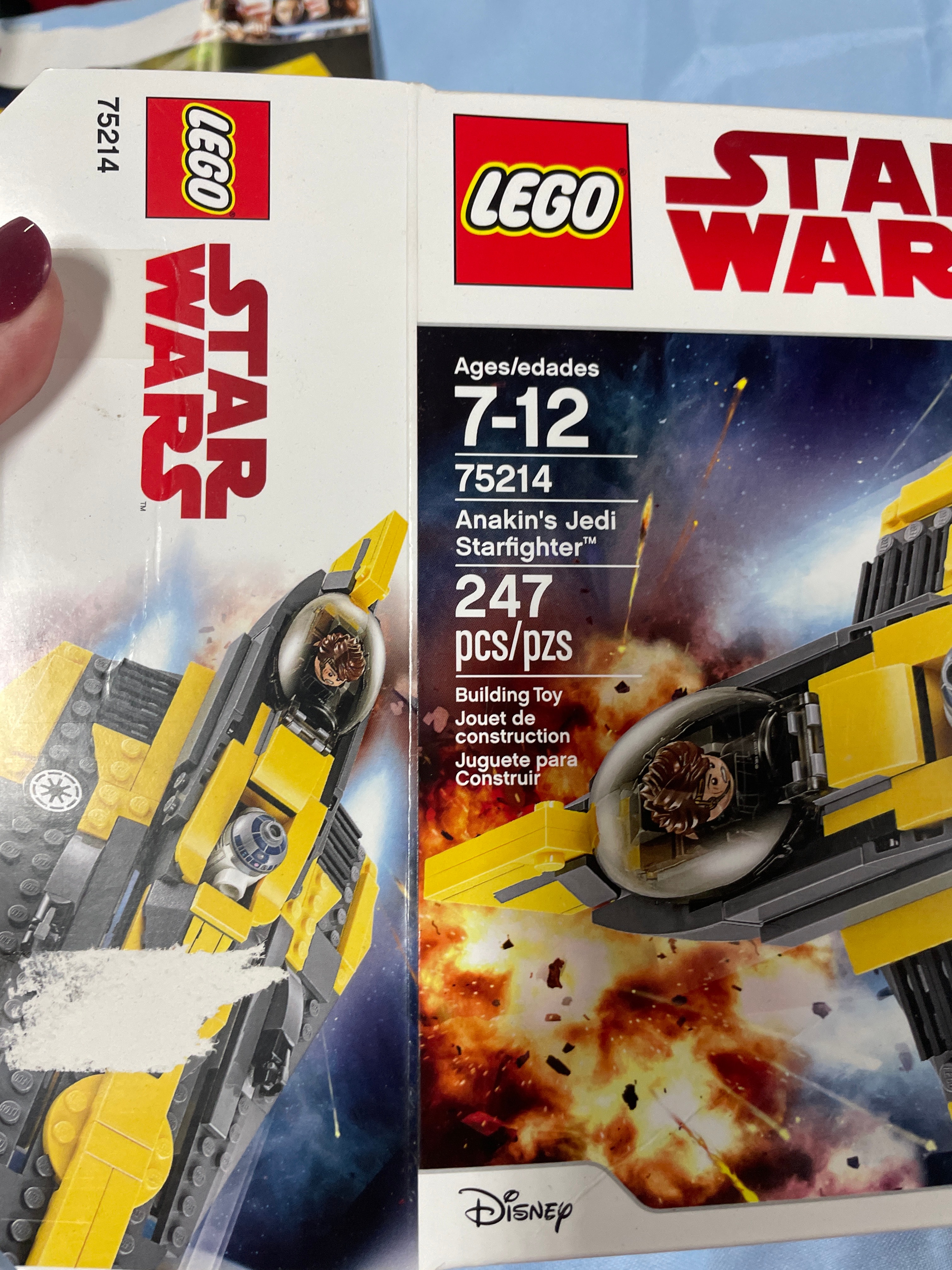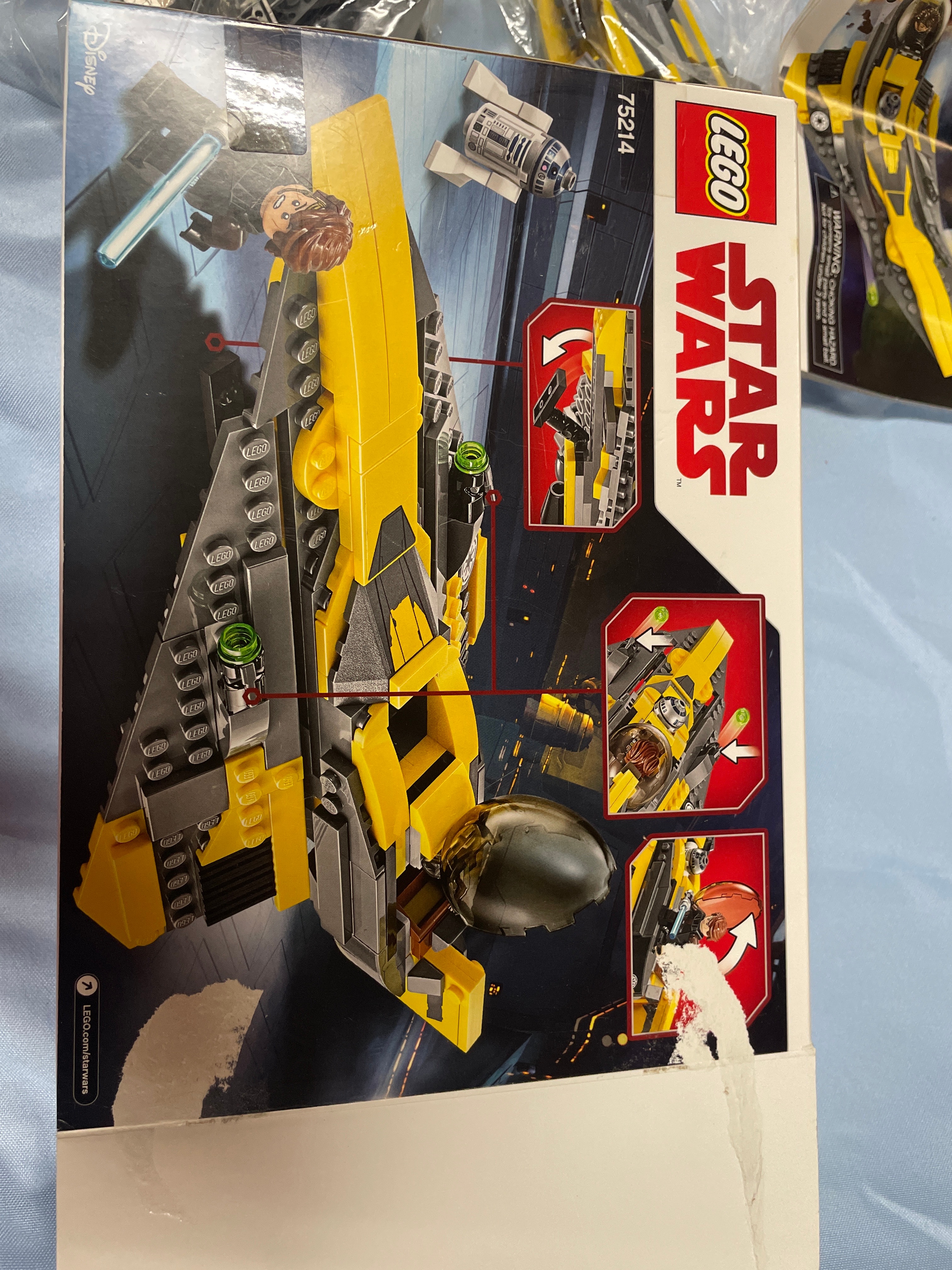 A yellow and dark grey LEGO Star Wars ‘Anakin’s Jedi Starfighter™’ building toy set, model 75214, with 247 pieces, presented in its original box and including an assembled starfighter.