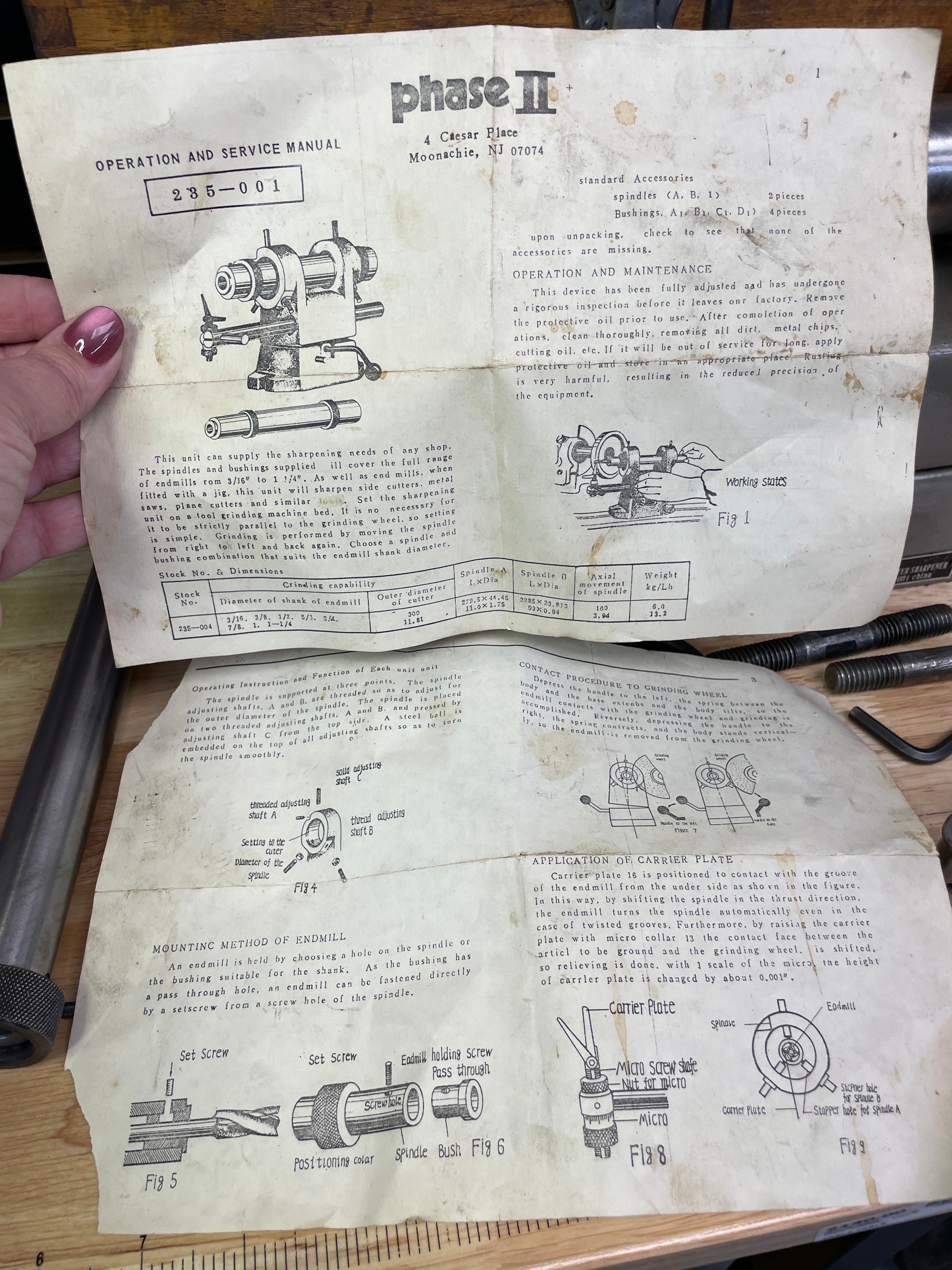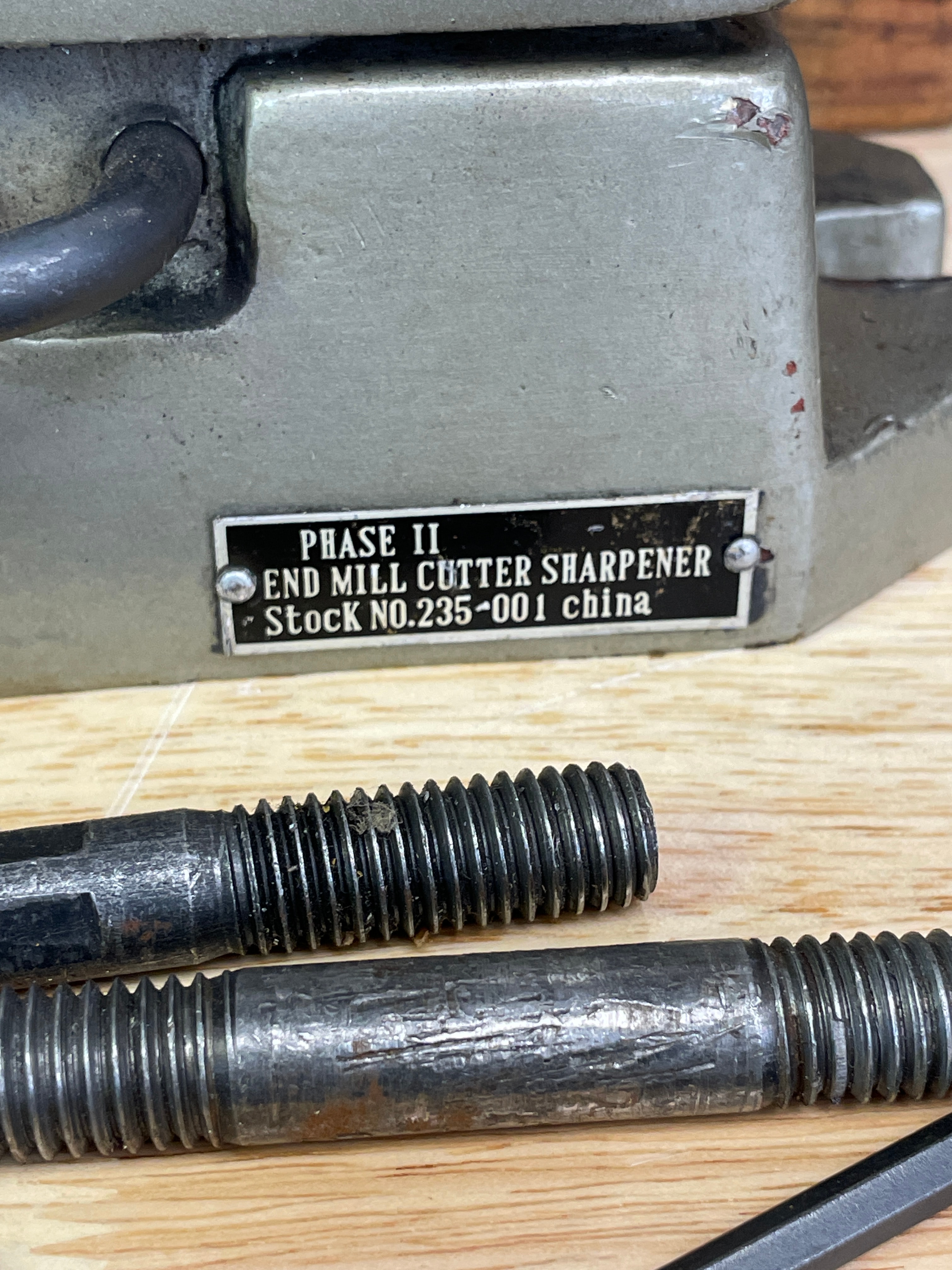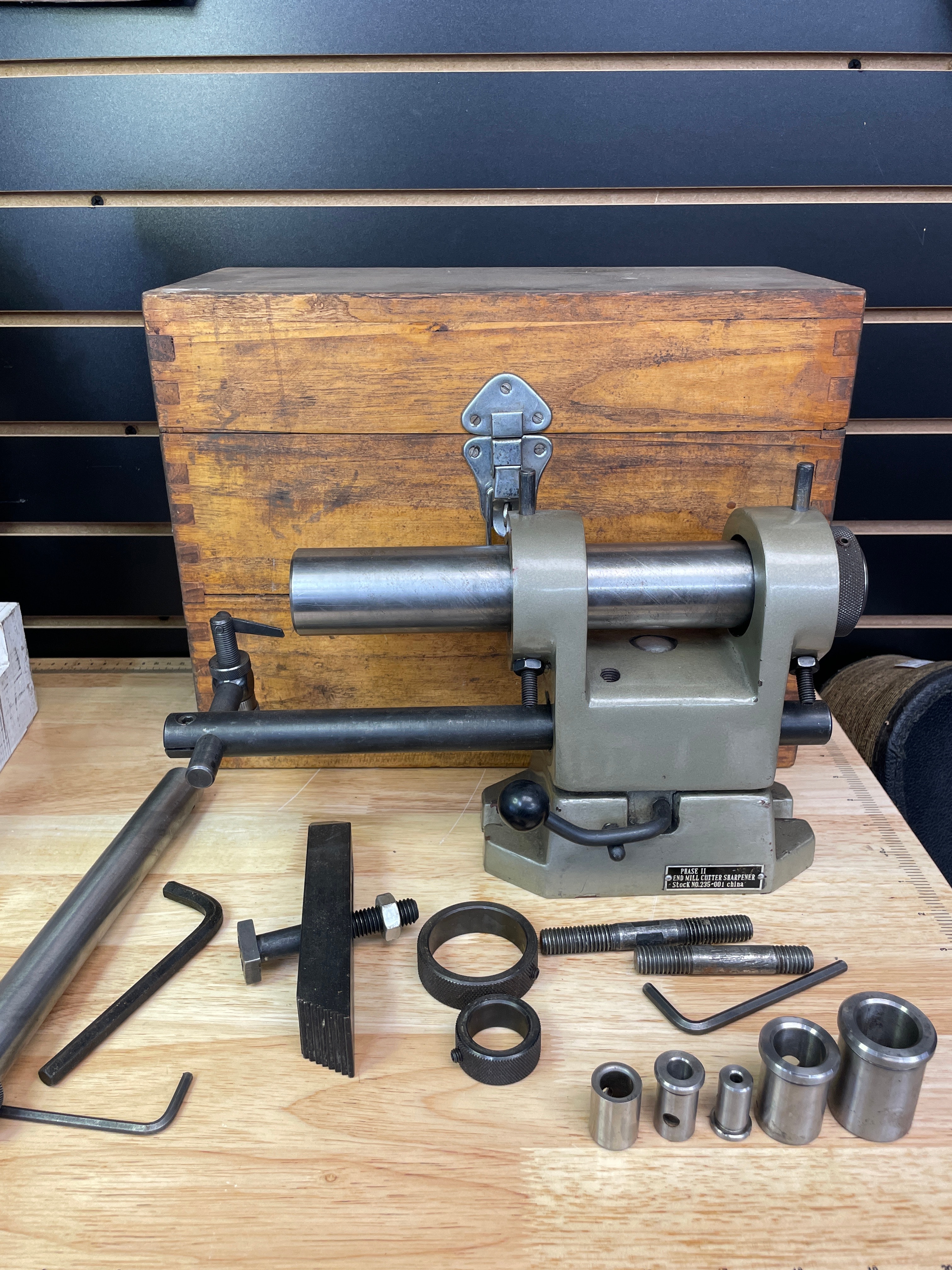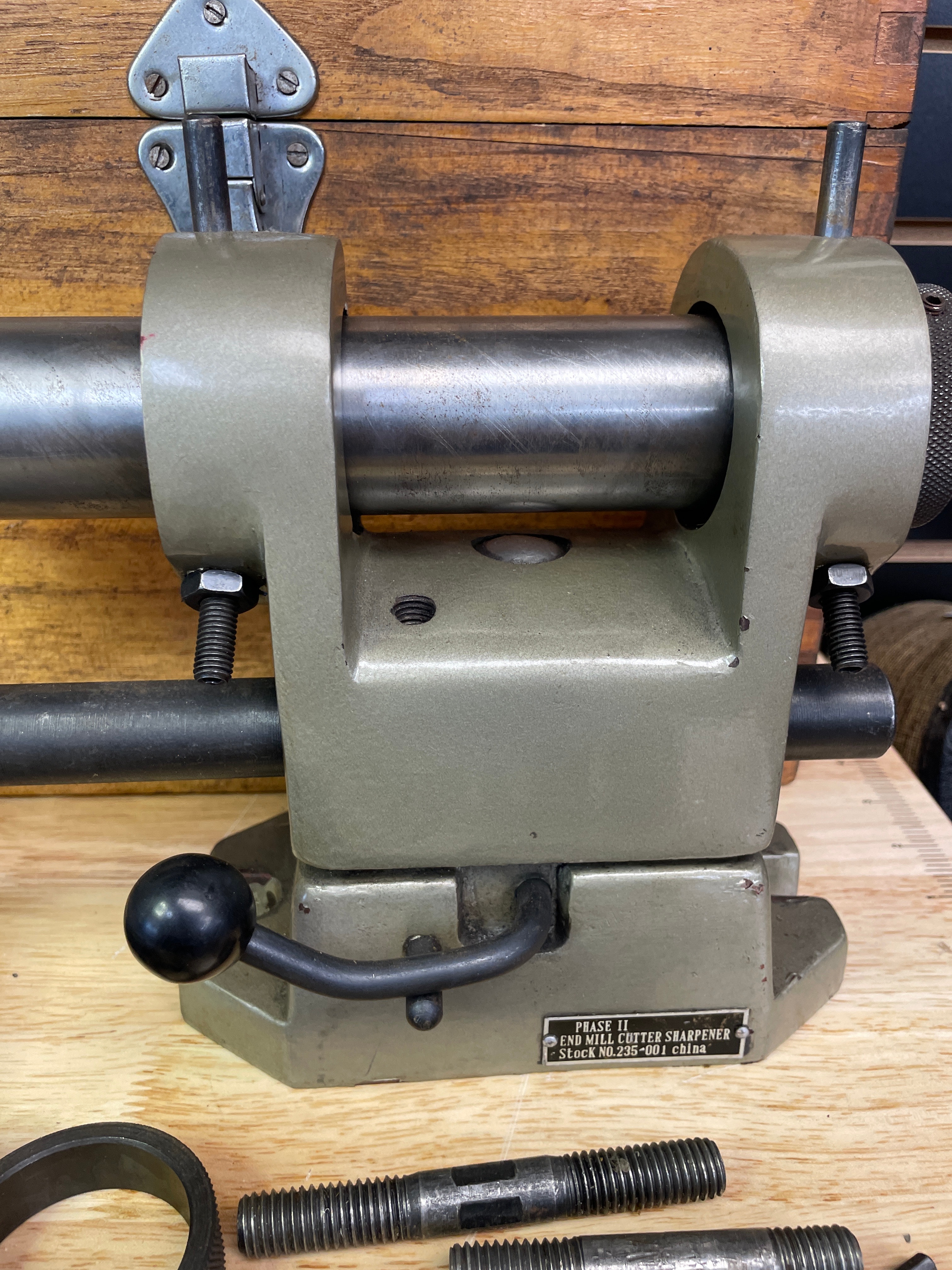 One olive green/grey and silver-tone metal Phase II End Mill Cutter Sharpener, marked “PHASE II END MILL CUTTER SHARPENER Stock NO. 235-001 china”, along with various black and silver-tone metal accessories, a natural brown wooden storage box, and its “OPERATION AND SERVICE MANUAL”.