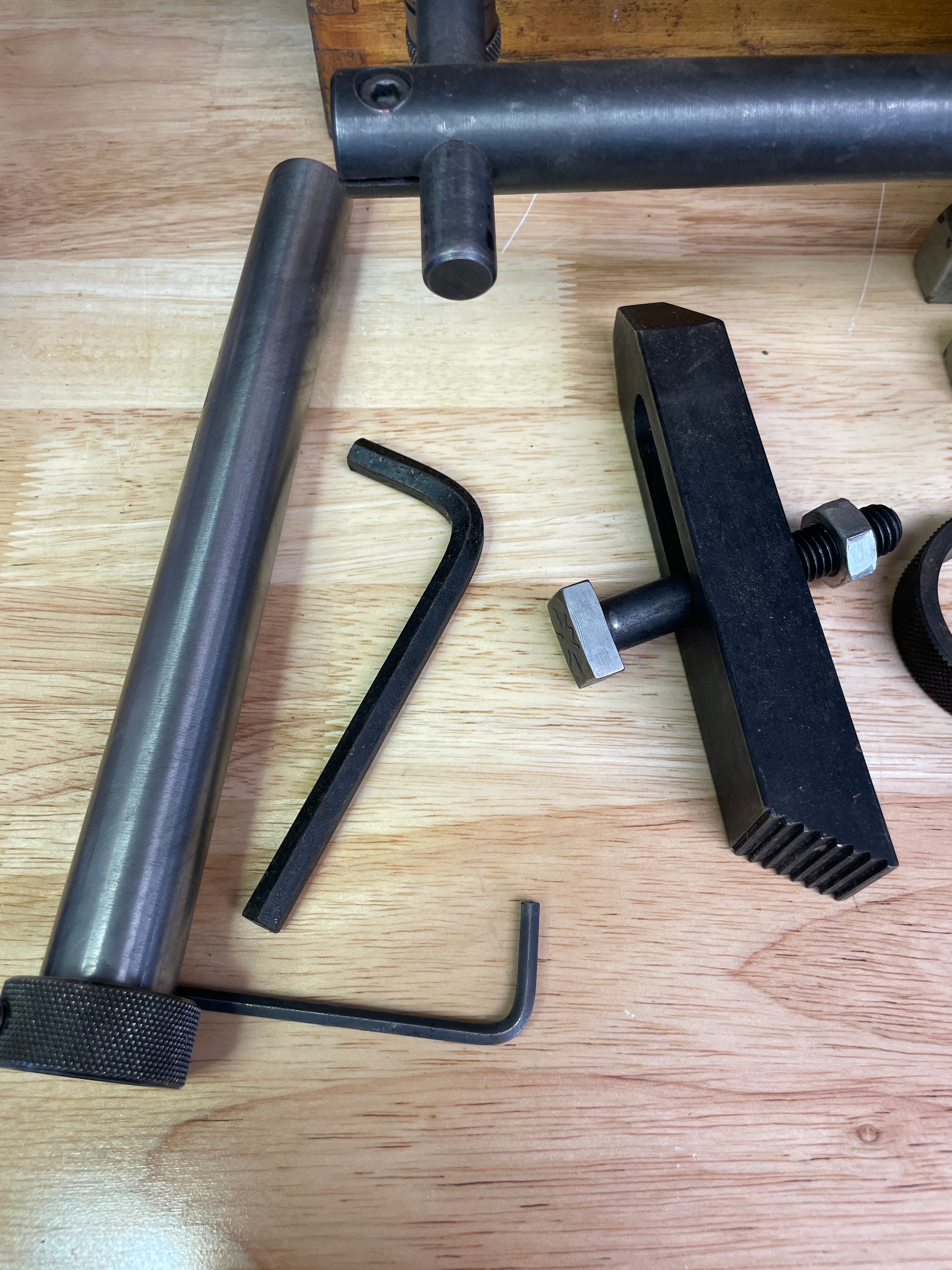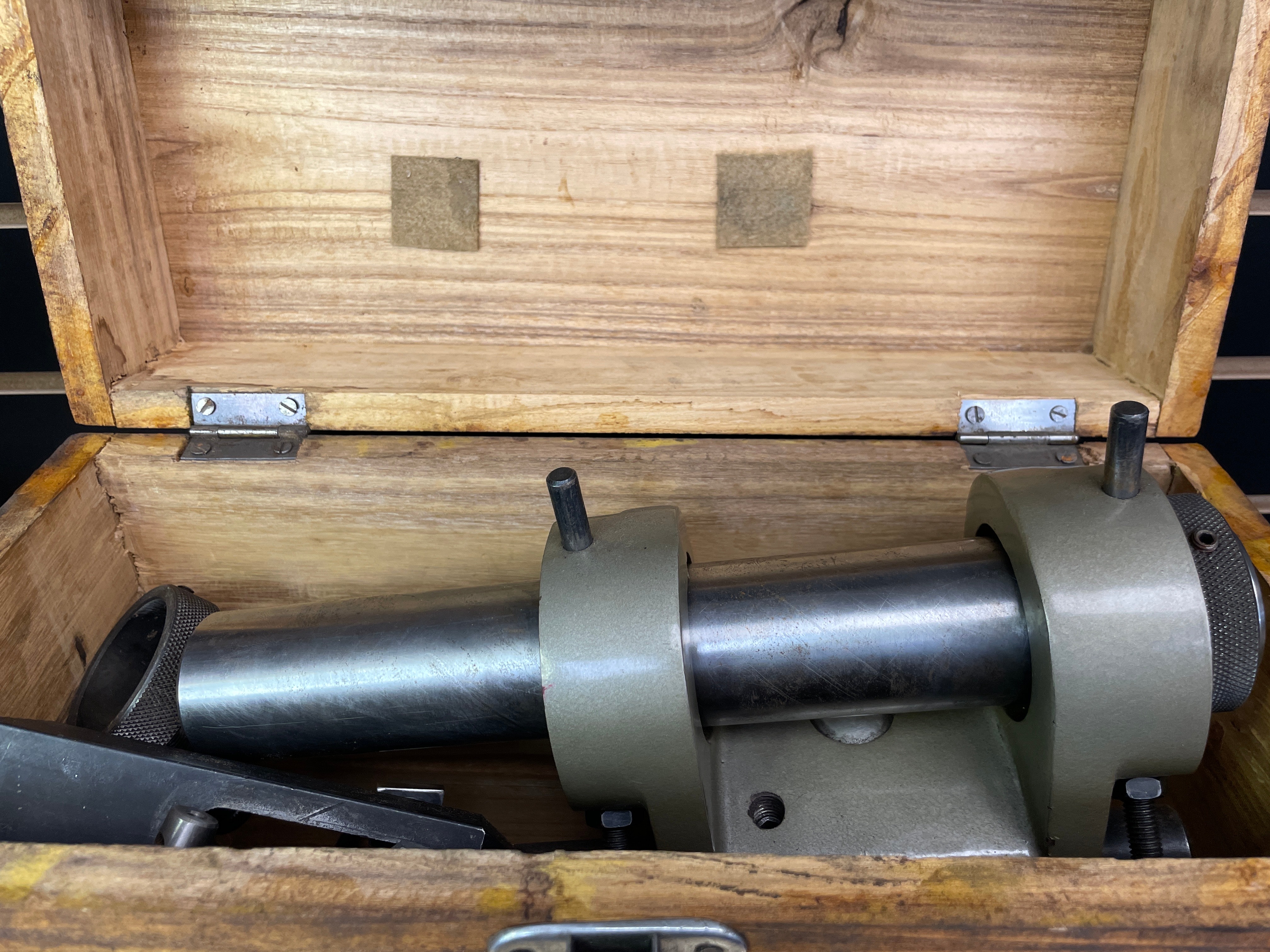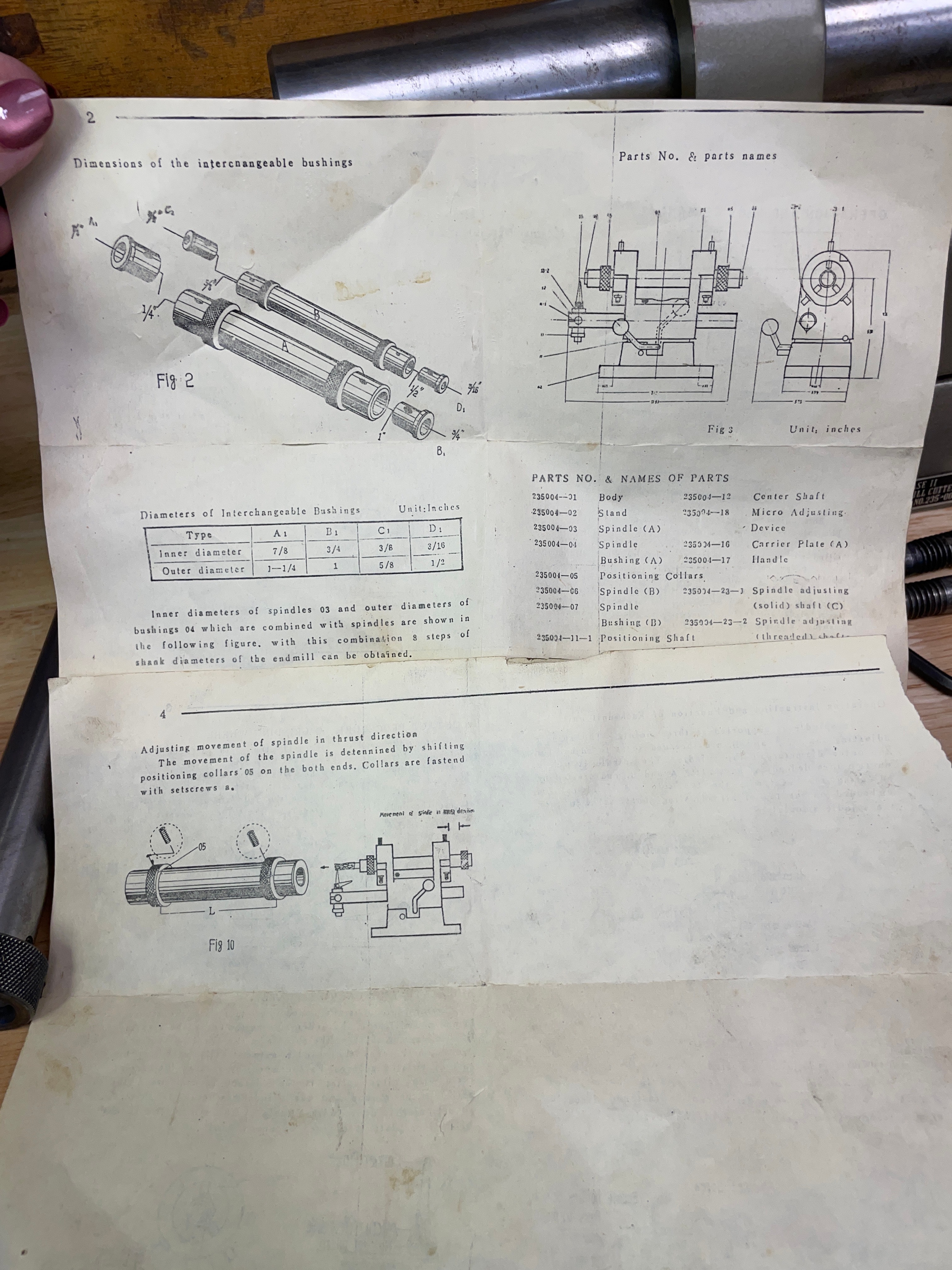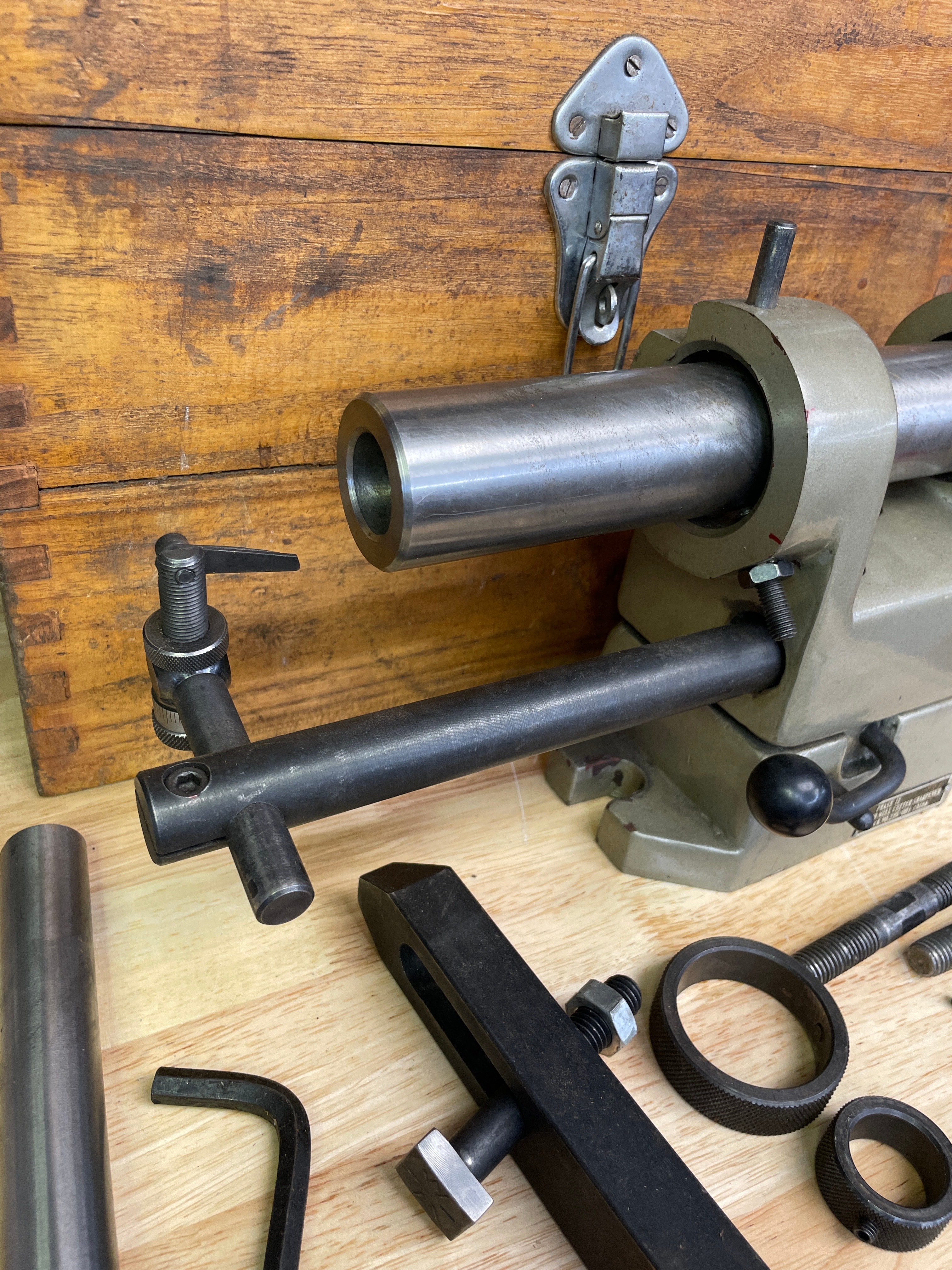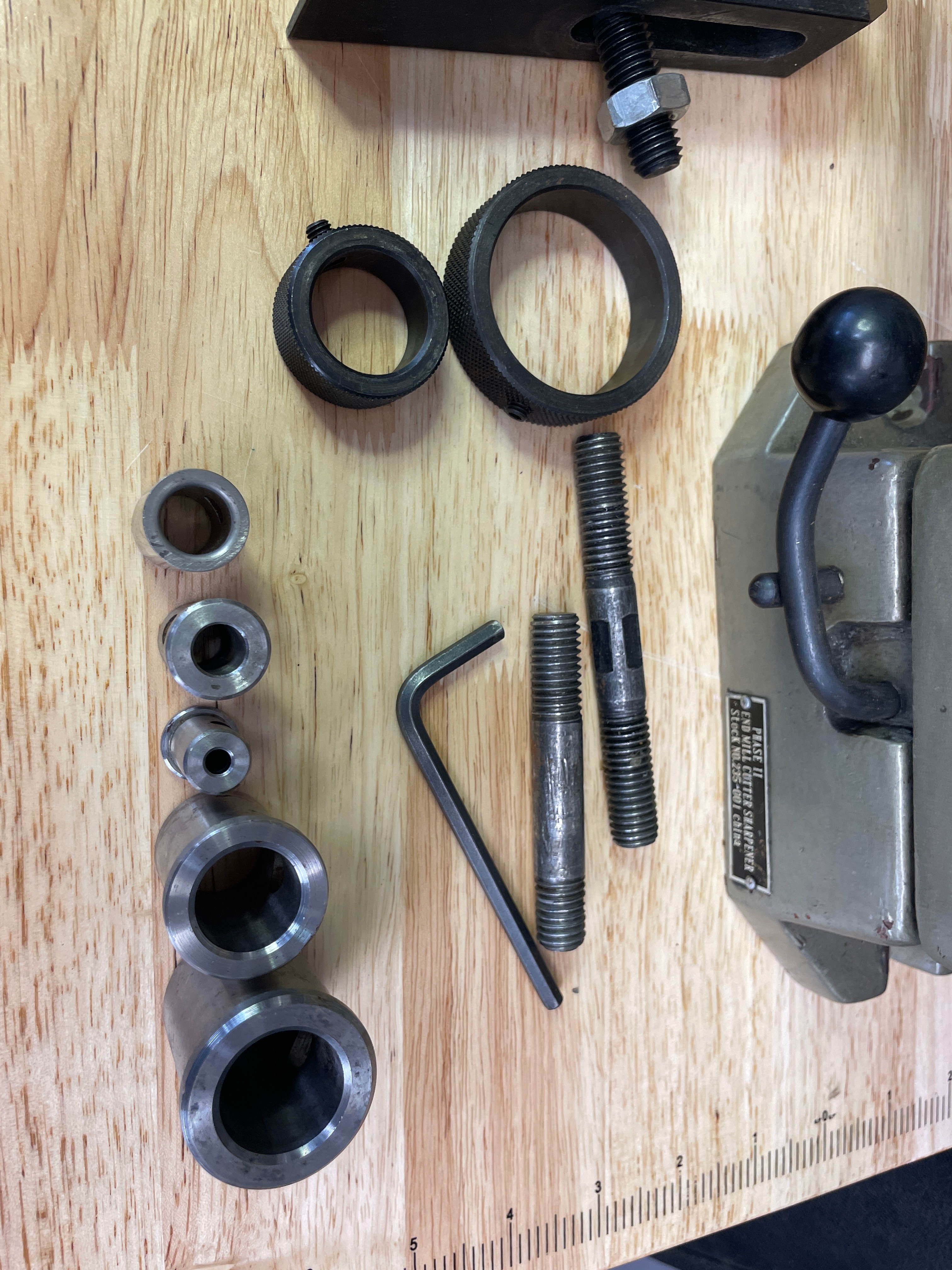 One olive green/grey and silver-tone metal Phase II End Mill Cutter Sharpener, marked “PHASE II END MILL CUTTER SHARPENER Stock NO. 235-001 china”, along with various black and silver-tone metal accessories, a natural brown wooden storage box, and its “OPERATION AND SERVICE MANUAL”.