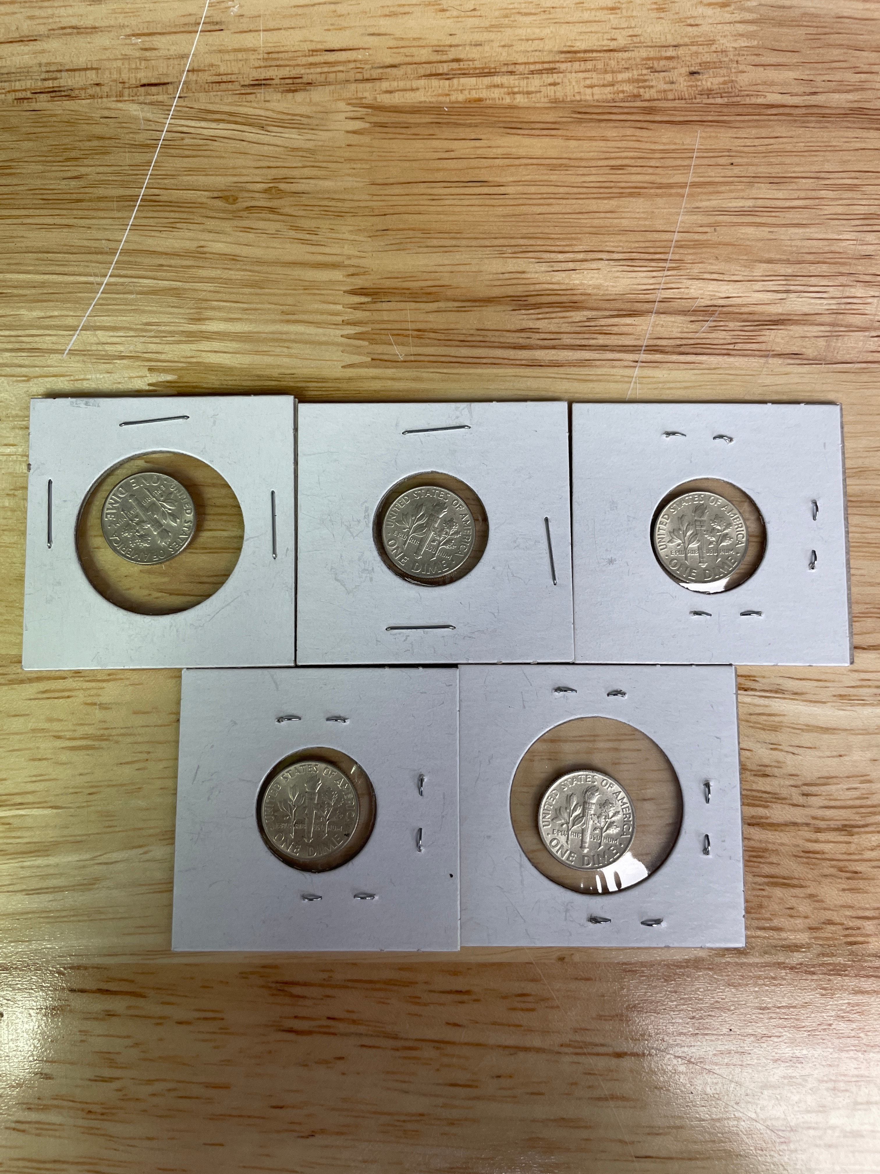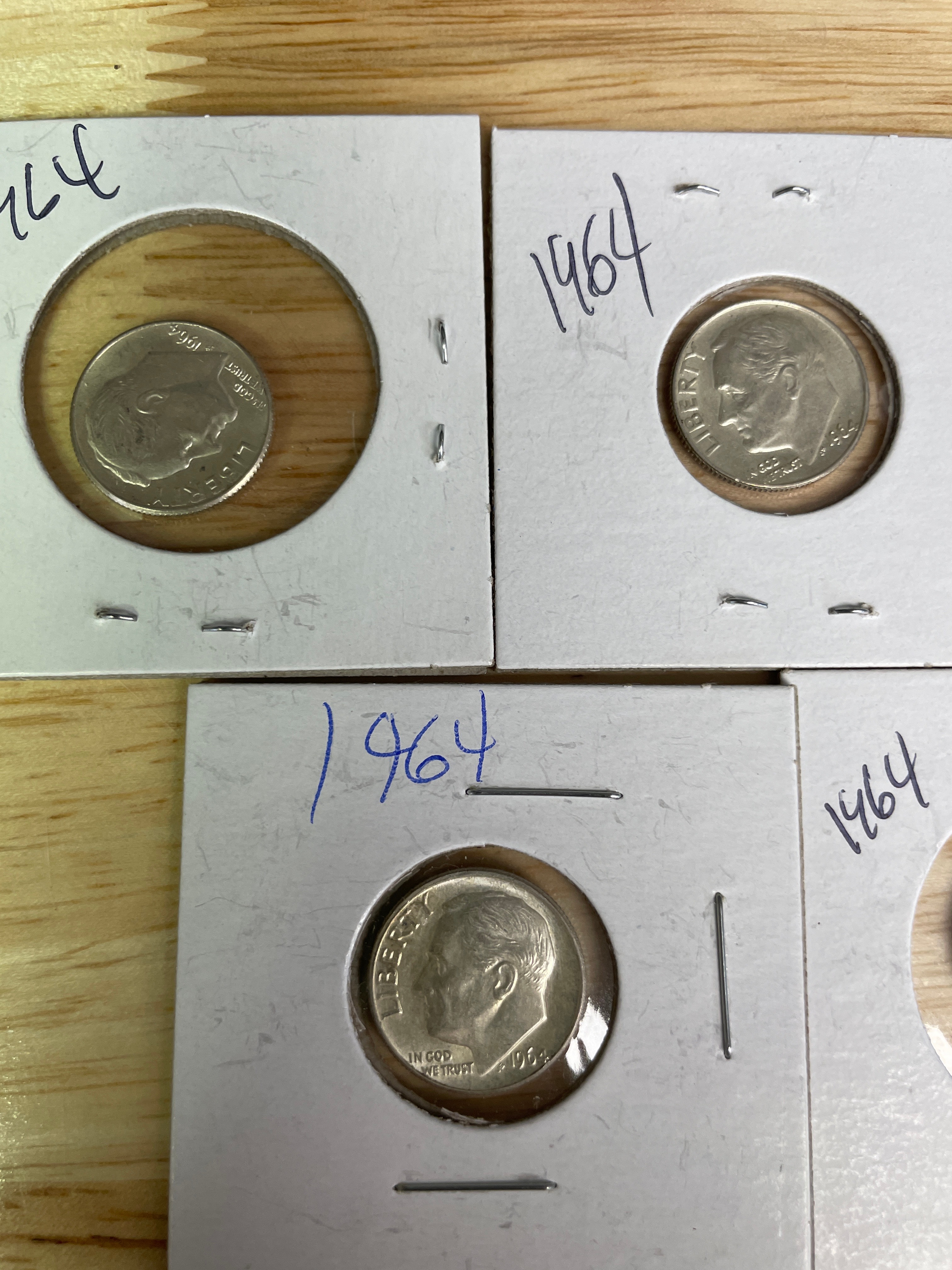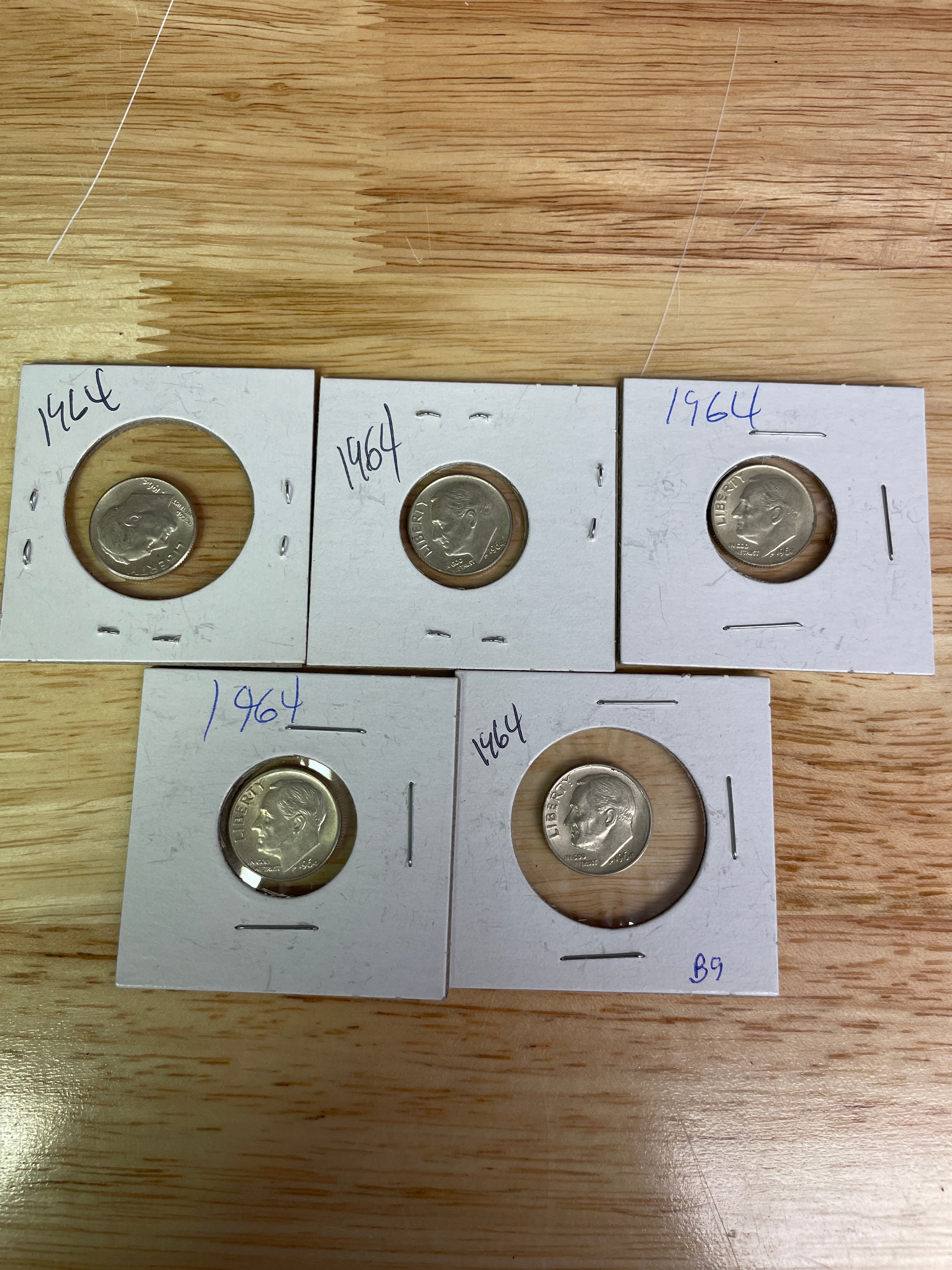 Five silver-colored Roosevelt dimes, each dated 1964, displaying “LIBERTY, ” “IN GOD WE TRUST, ” “1964” on the obverse and “UNITED STATES OF AMERICA, ” “E PLURIBUS UNUM, ” “ONE DIME” on the reverse, individually housed in white coin holders with “1964” handwritten in blue ink.