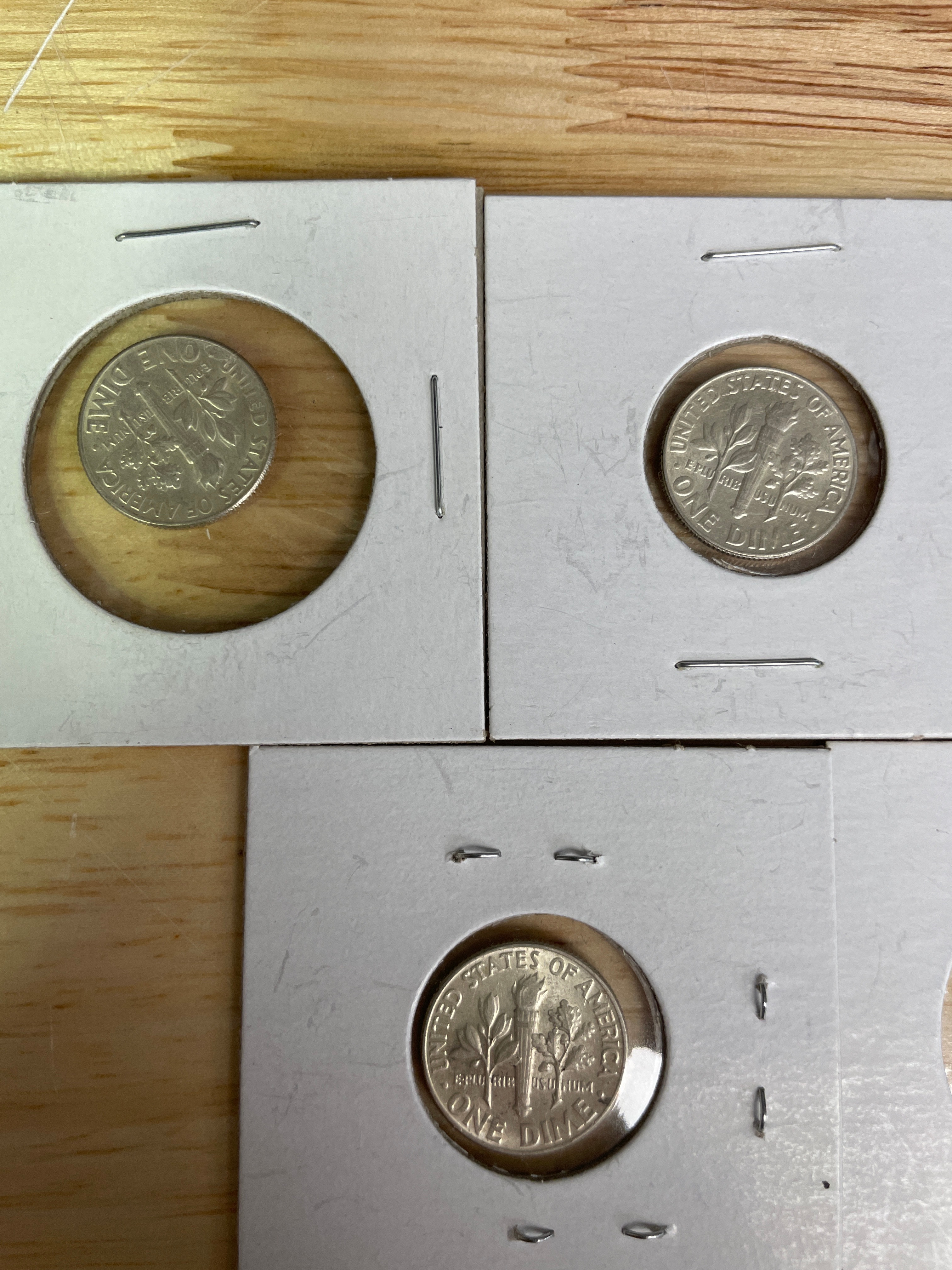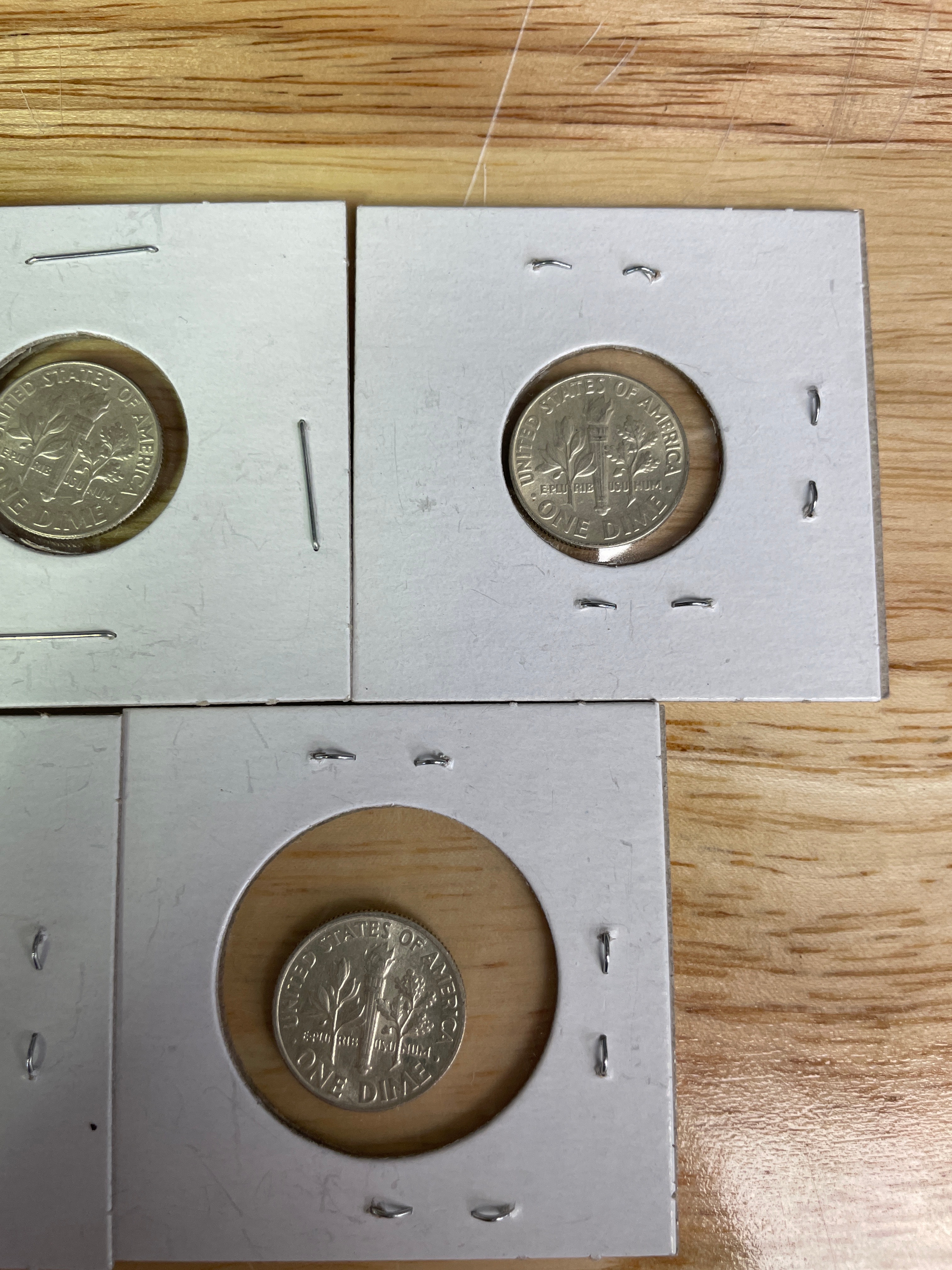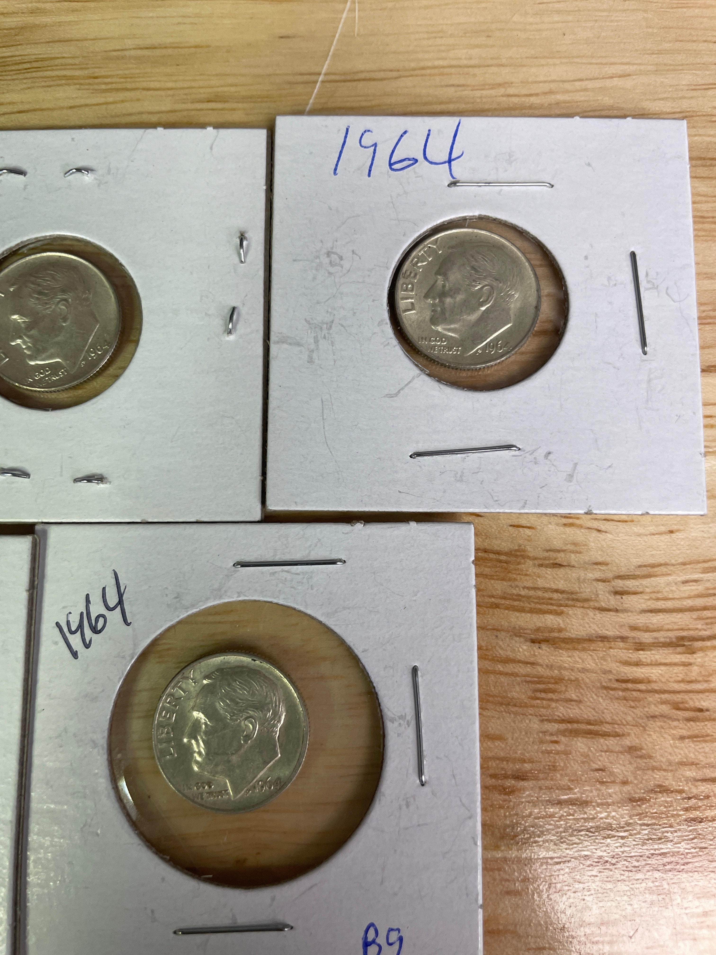 Five silver-colored Roosevelt dimes, each dated 1964, displaying “LIBERTY, ” “IN GOD WE TRUST, ” “1964” on the obverse and “UNITED STATES OF AMERICA, ” “E PLURIBUS UNUM, ” “ONE DIME” on the reverse, individually housed in white coin holders with “1964” handwritten in blue ink.