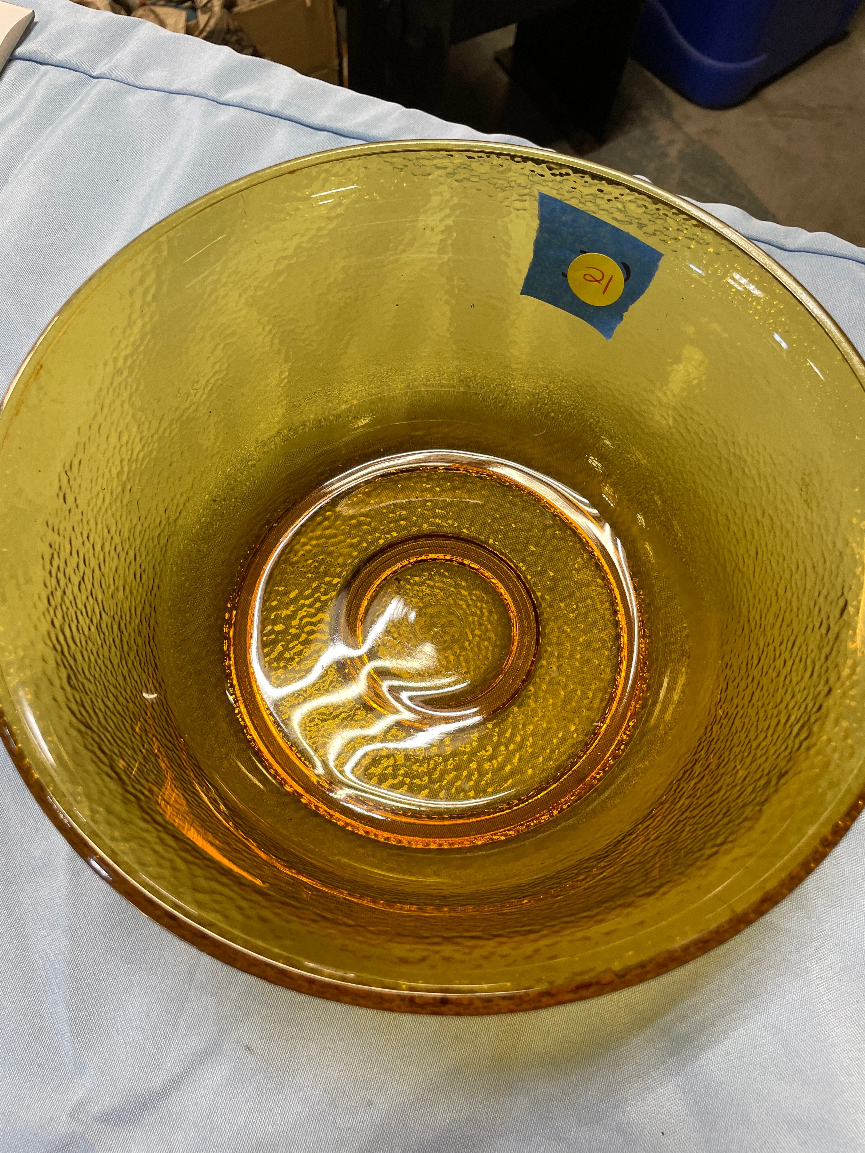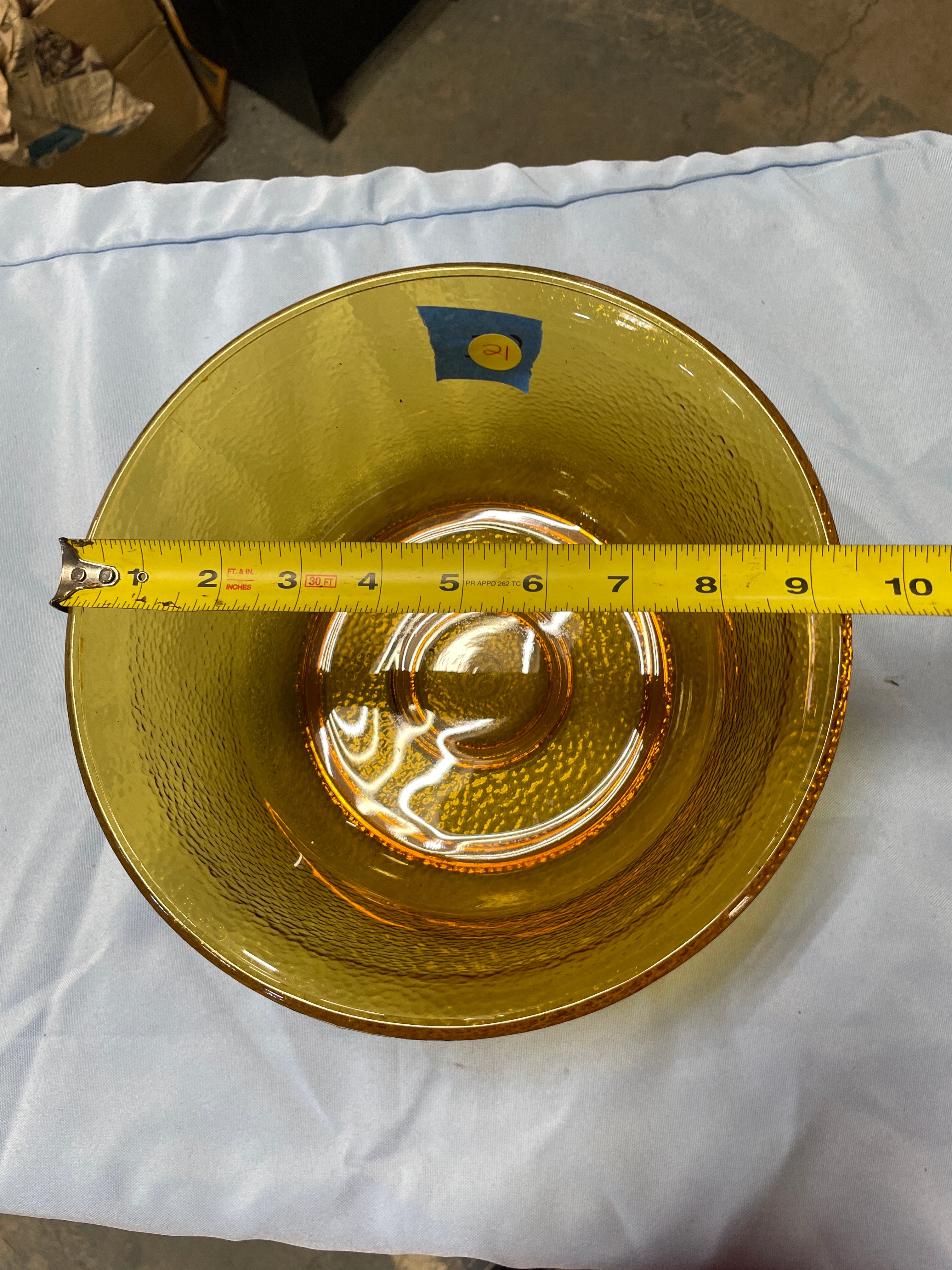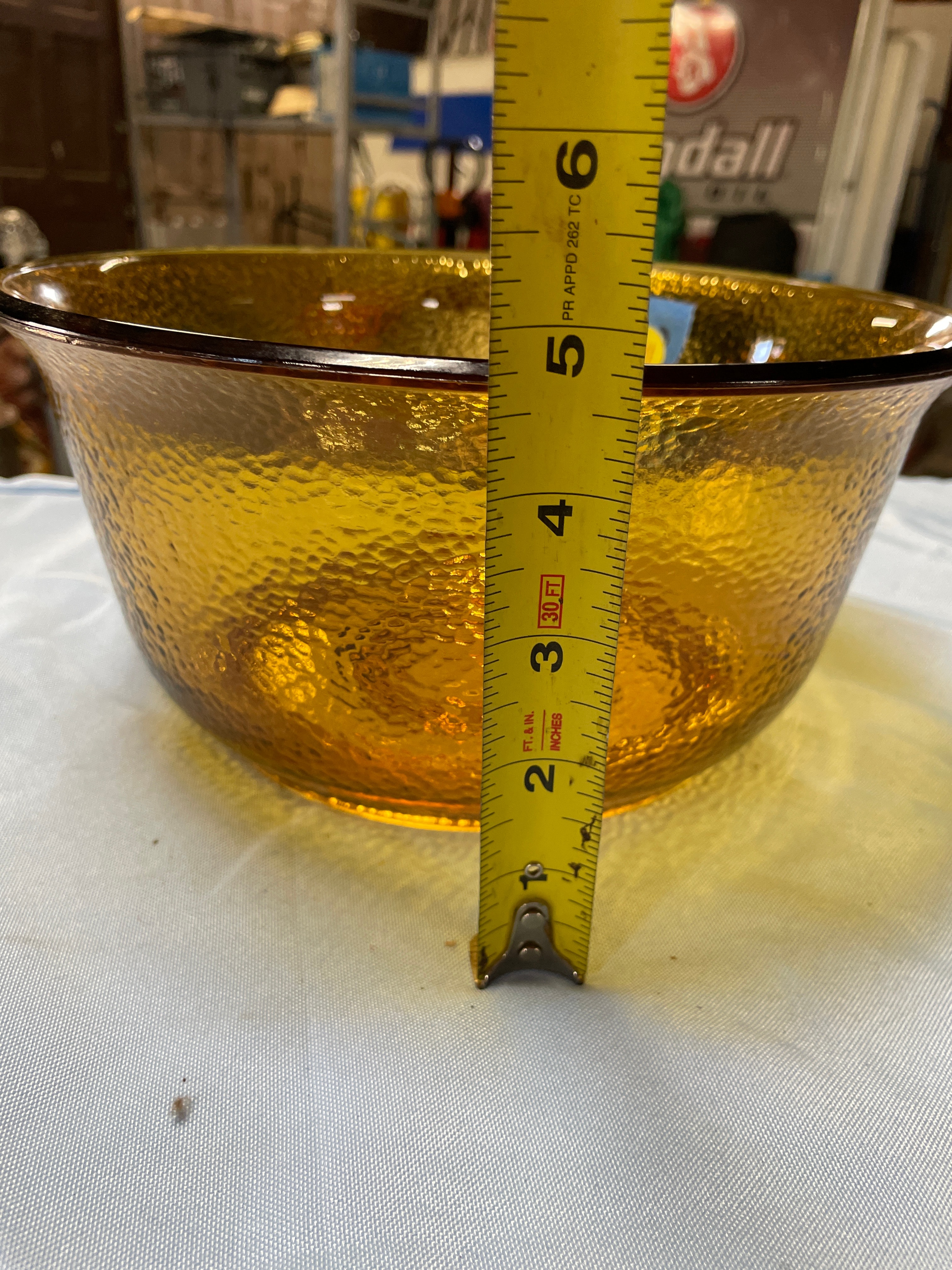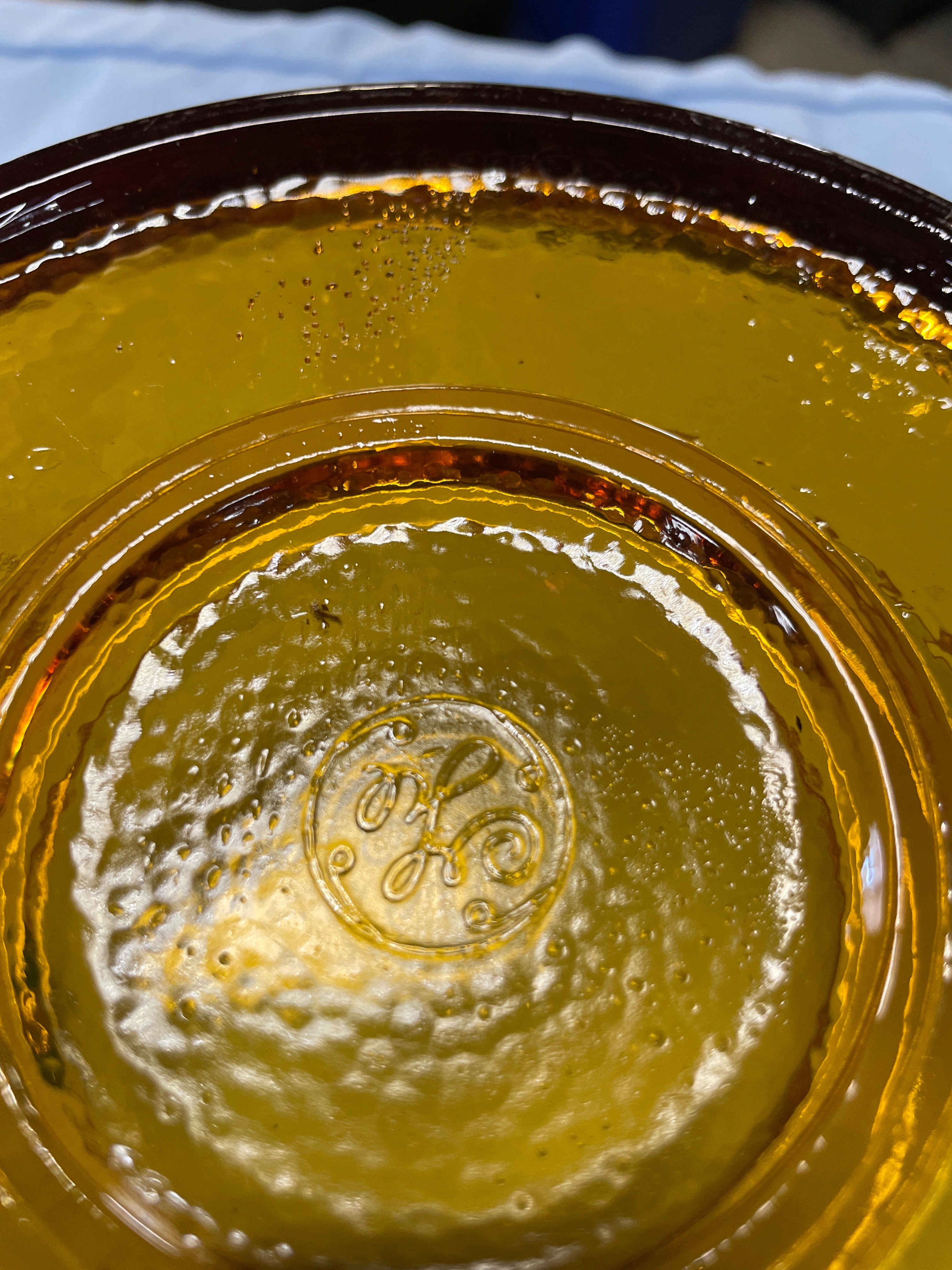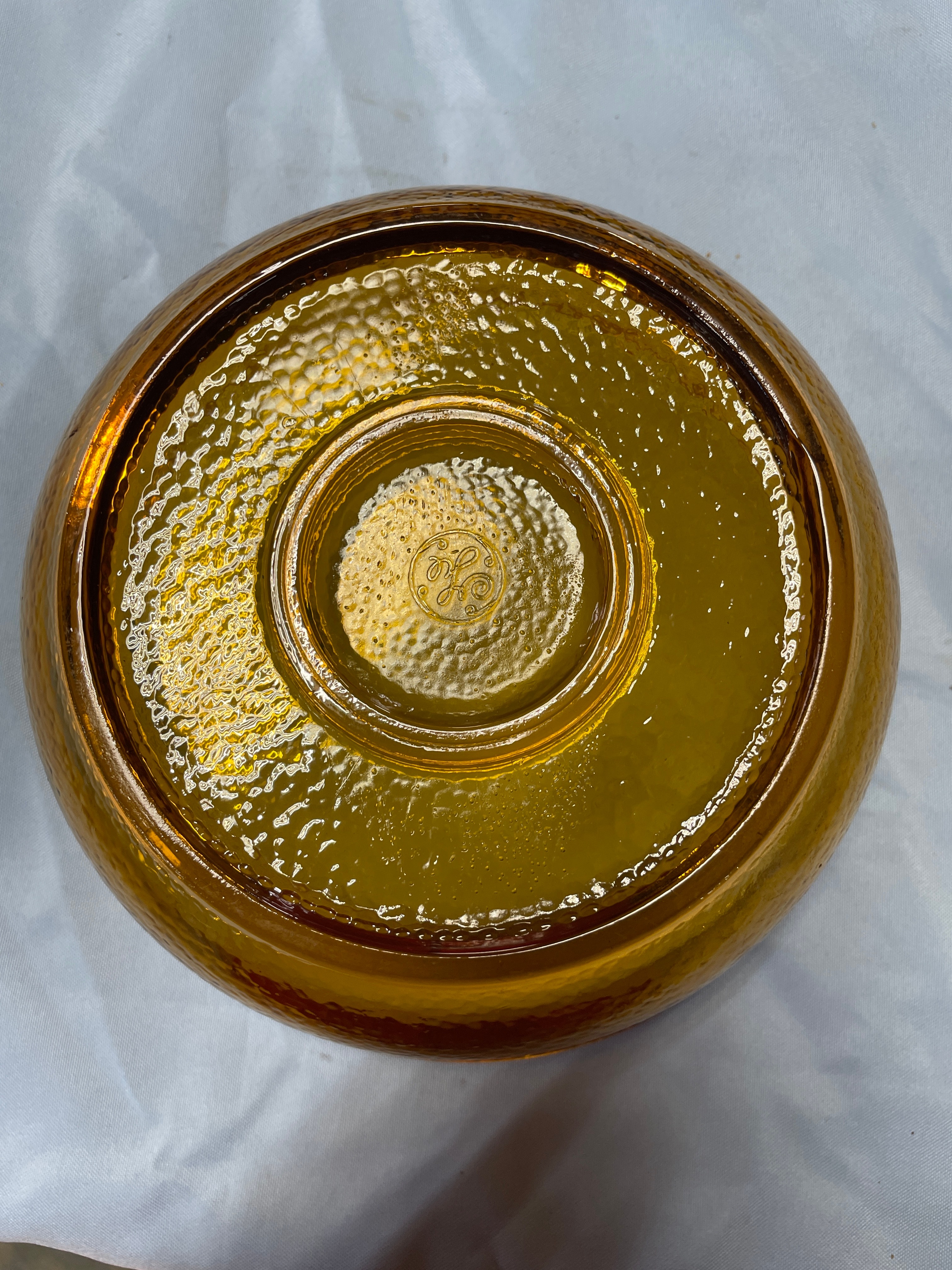 An amber-colored glass serving bowl with a dark brown rim and textured surface, featuring a raised ‘GE’ logo on its bottom, measuring approximately 9.5 inches wide and 4.5 inches tall.