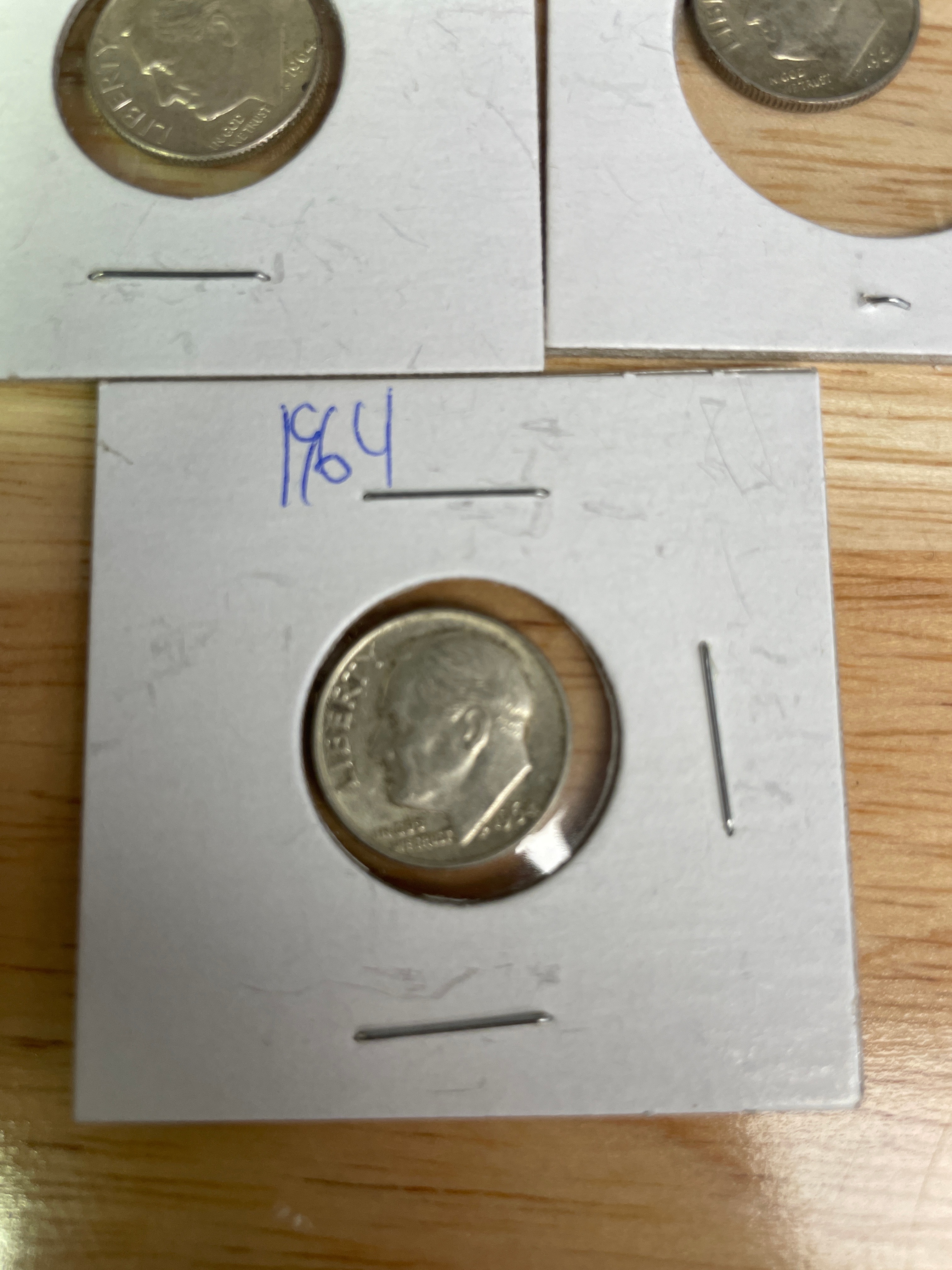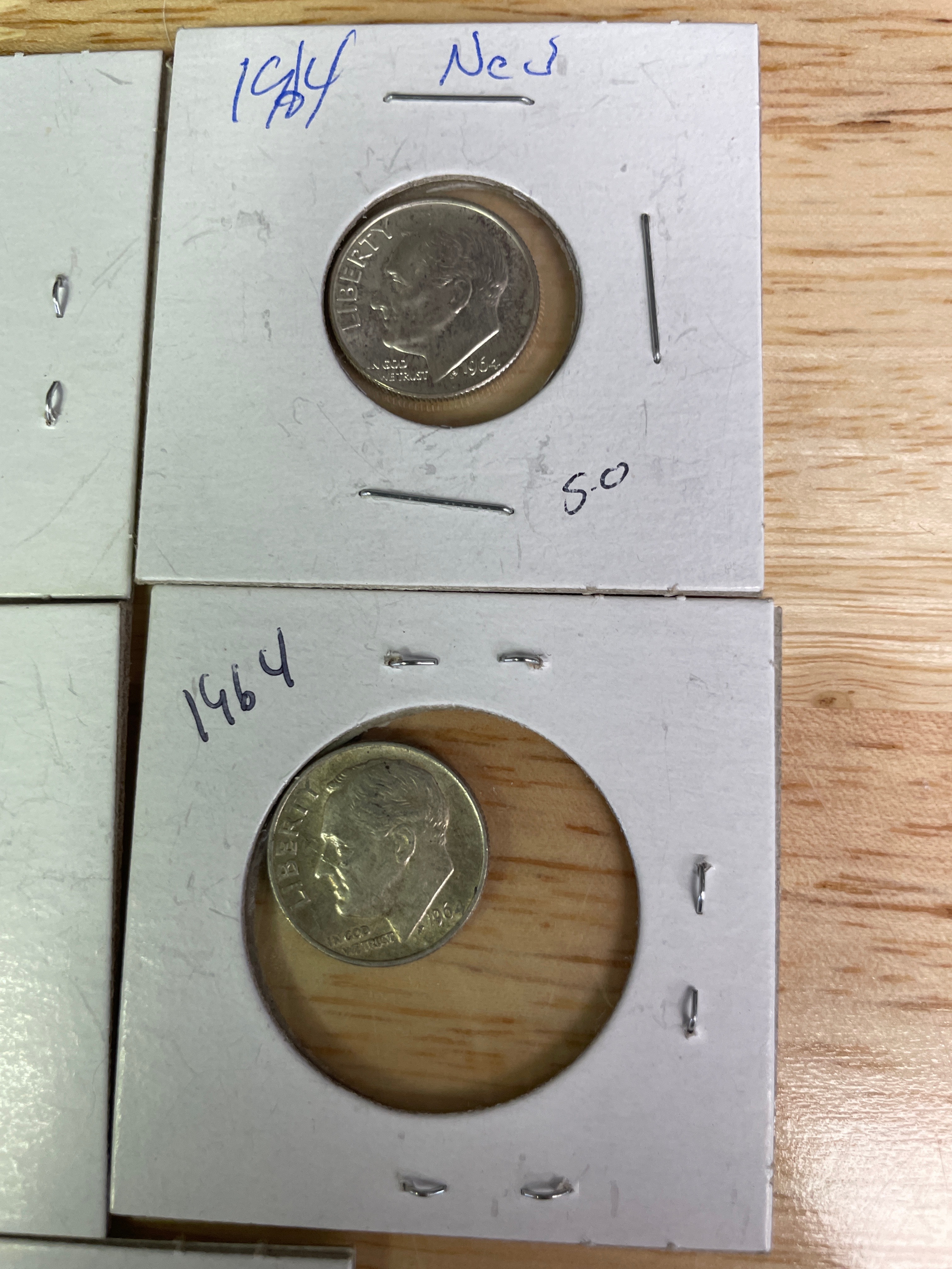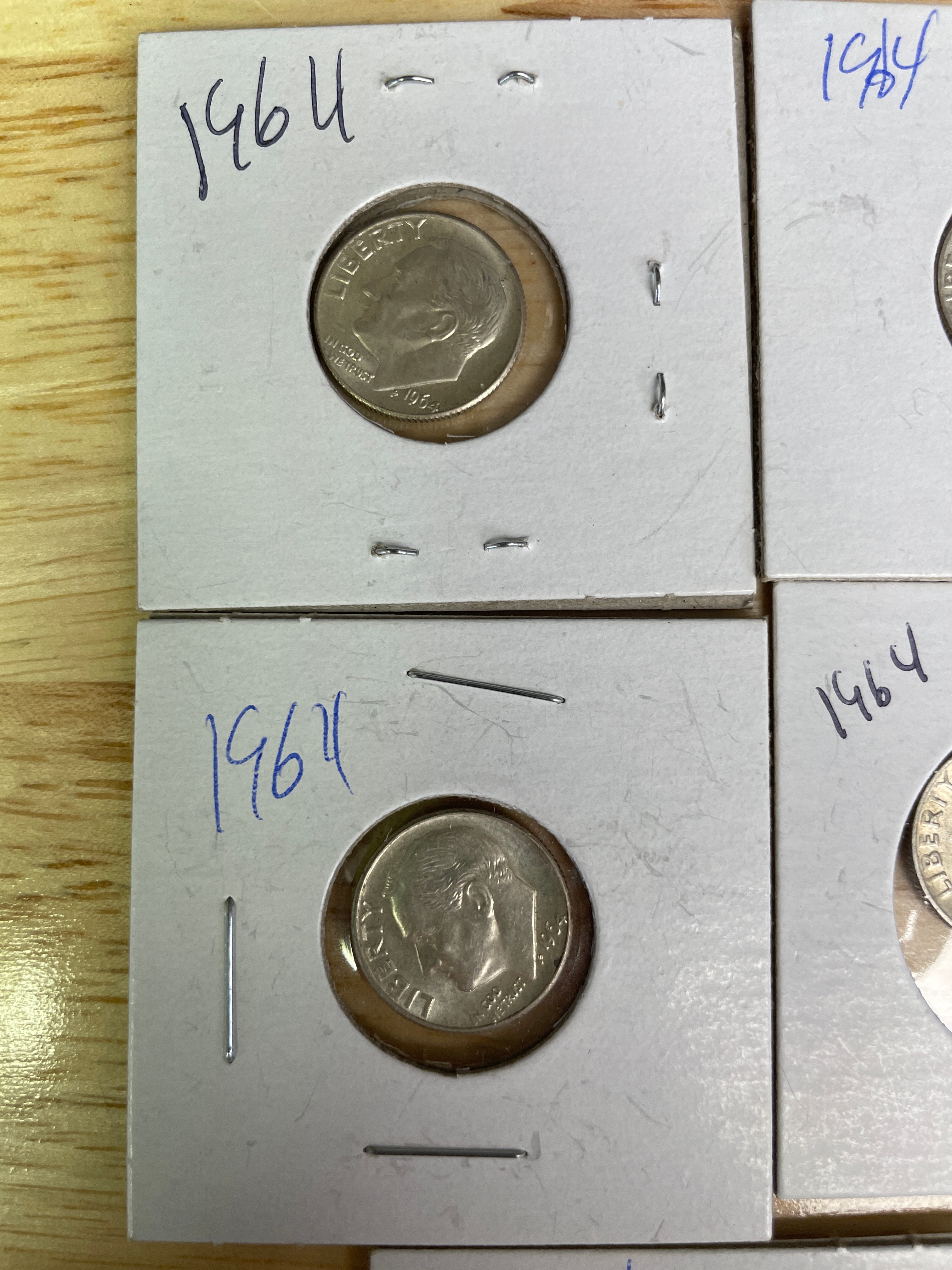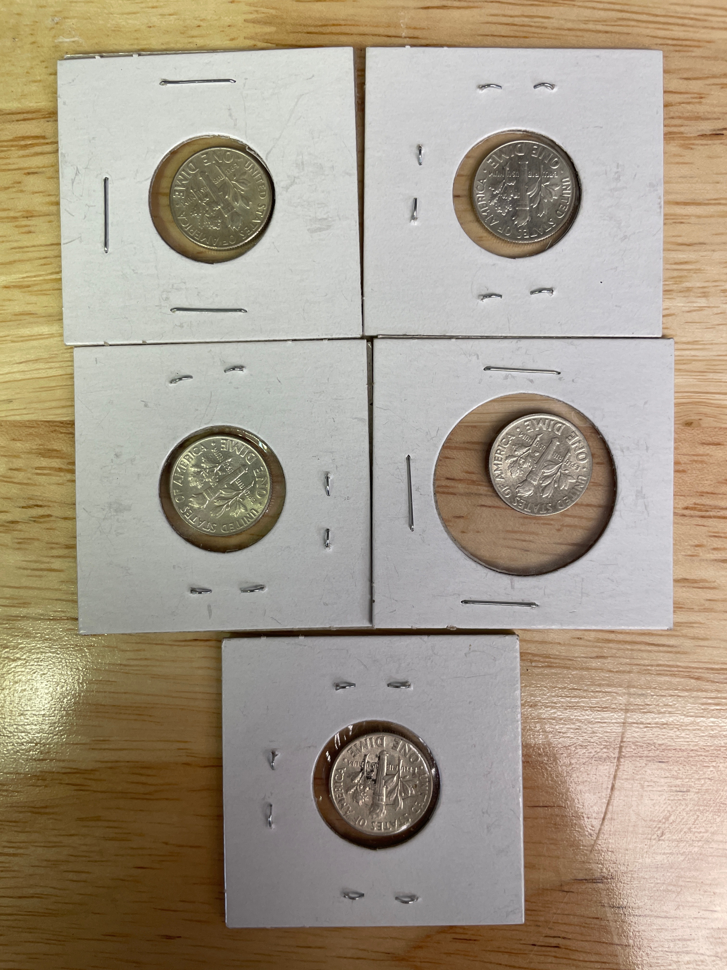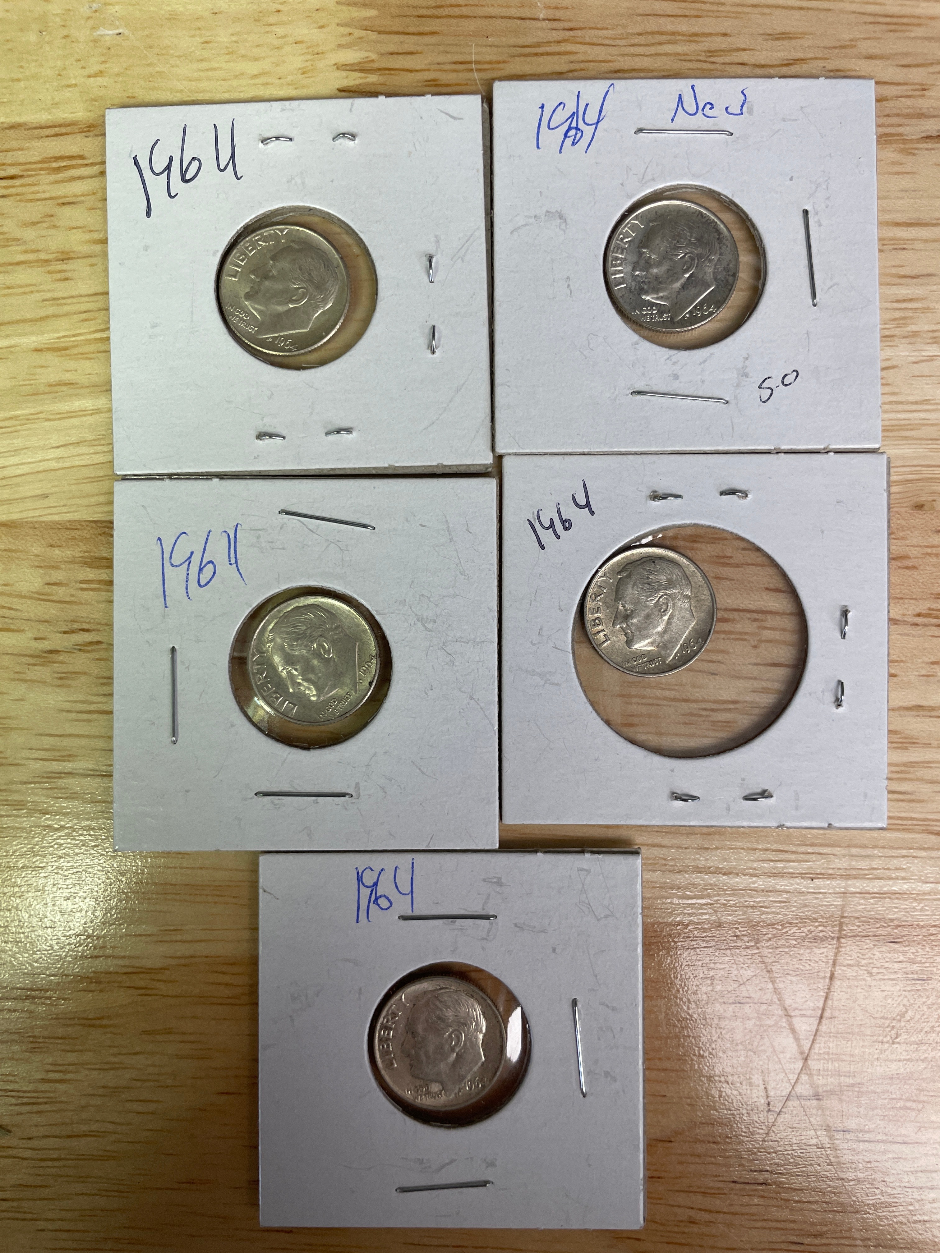 A collection of five silver-colored 1964 U.S. Roosevelt Dimes, each in a white cardboard holder; one holder is labeled ‘Ned’ and ‘5.0’.