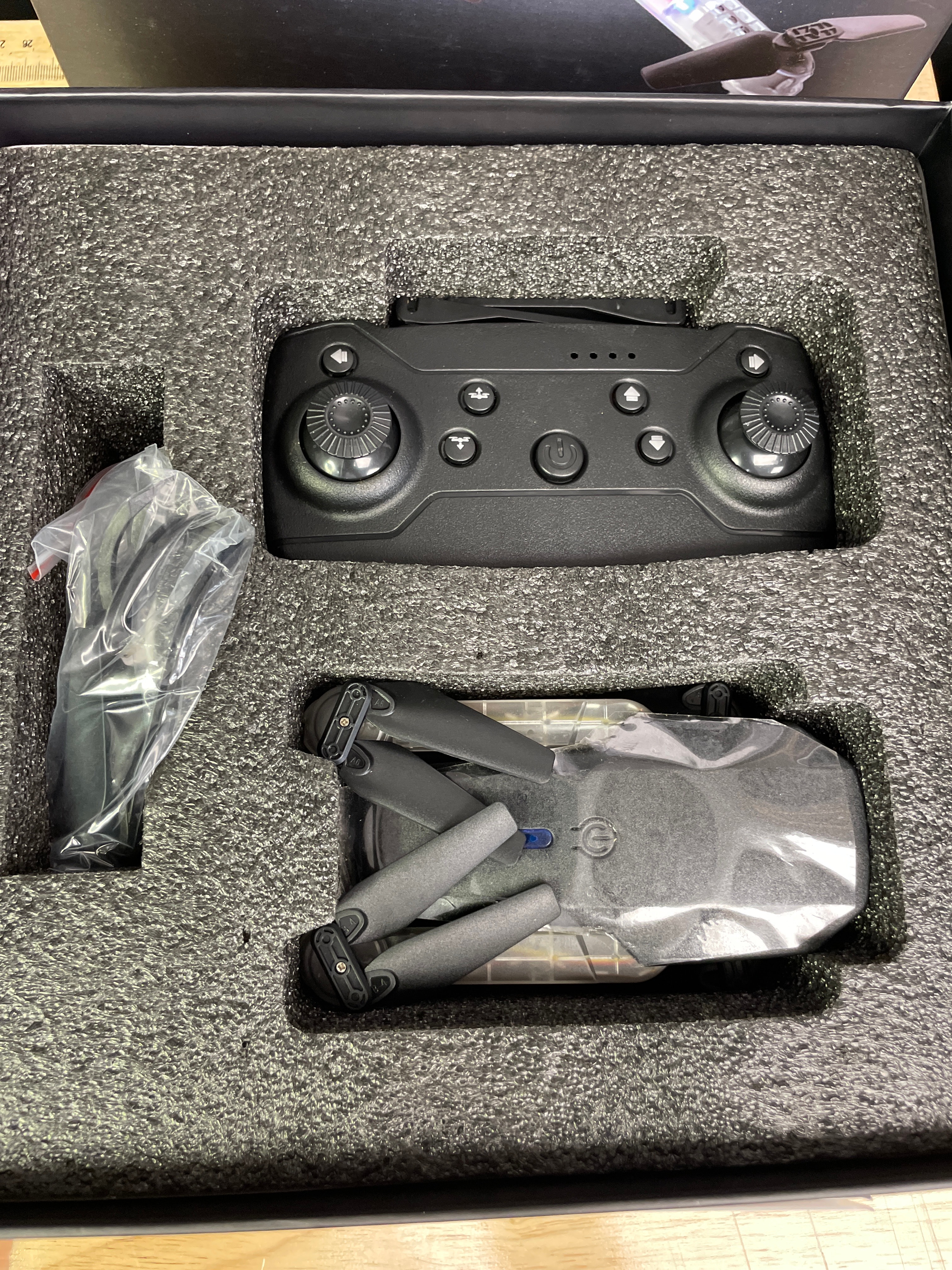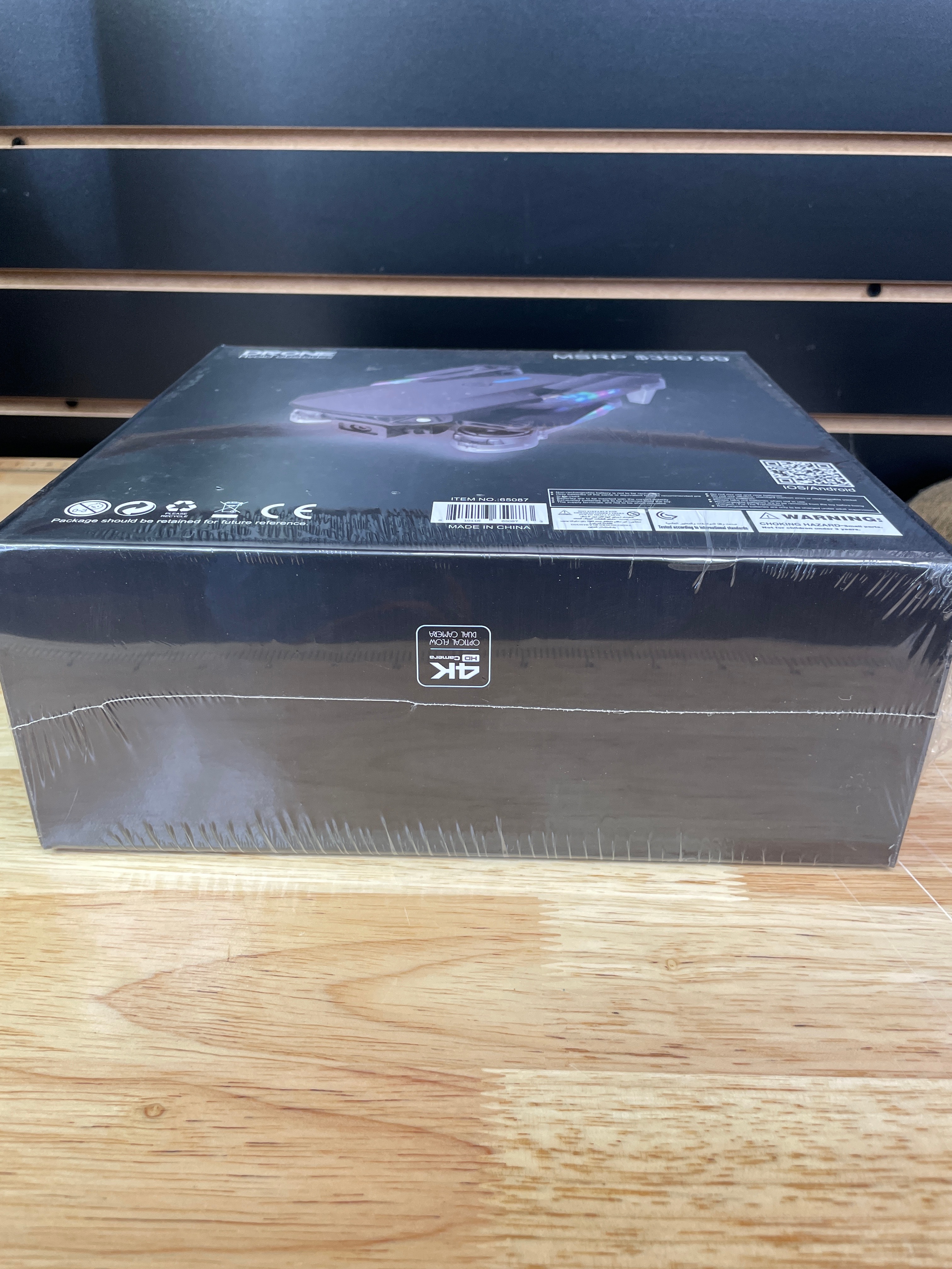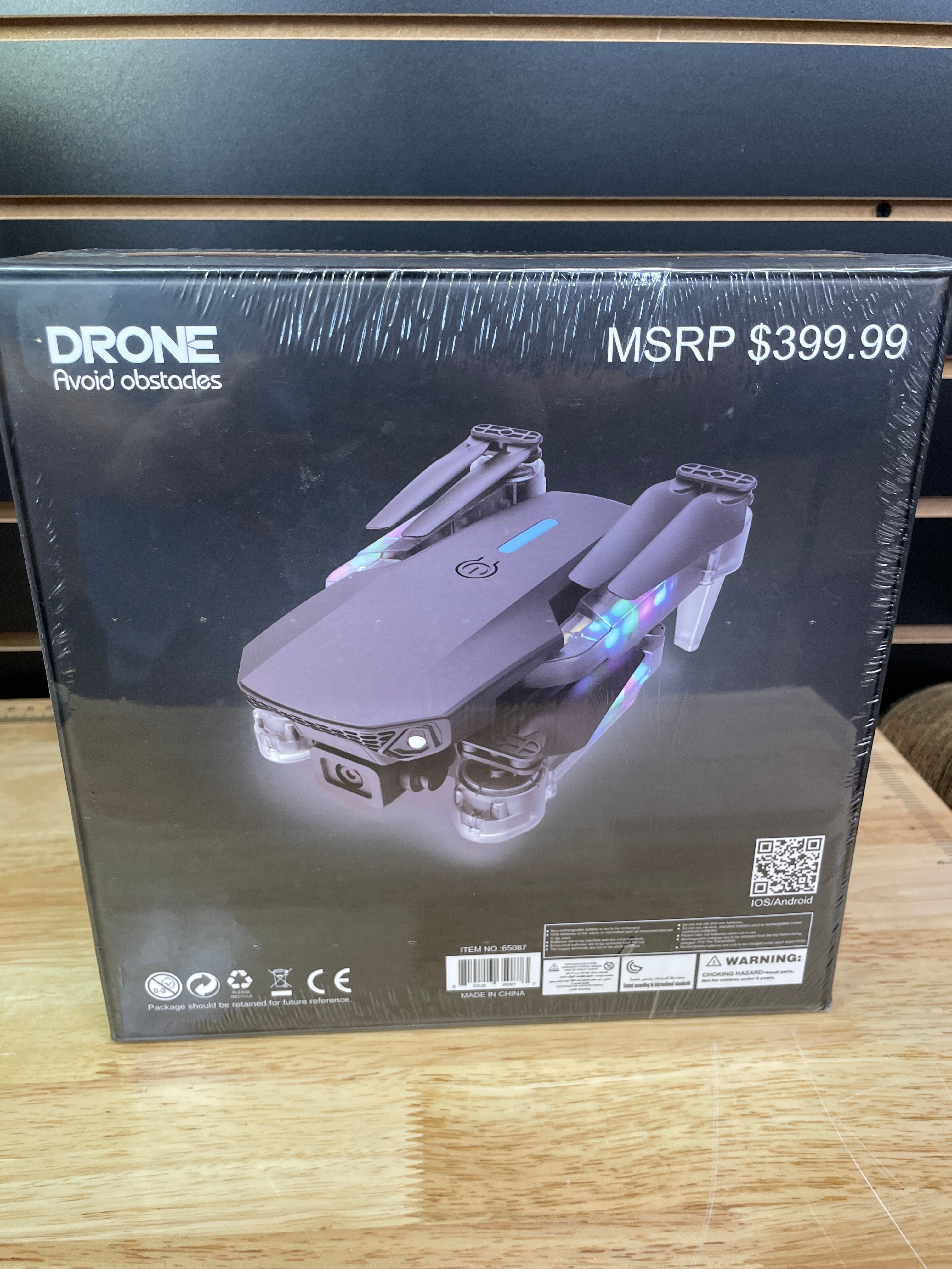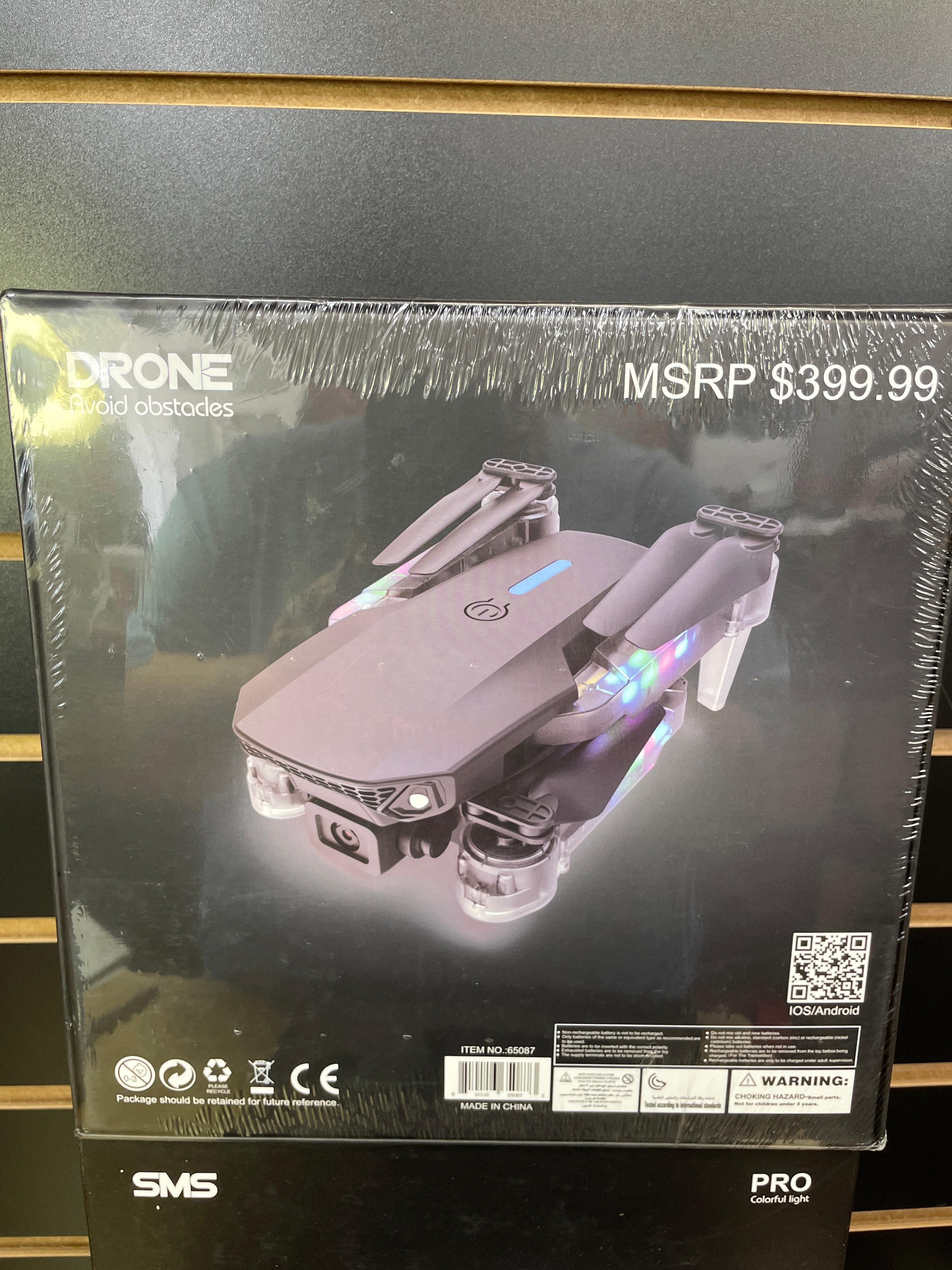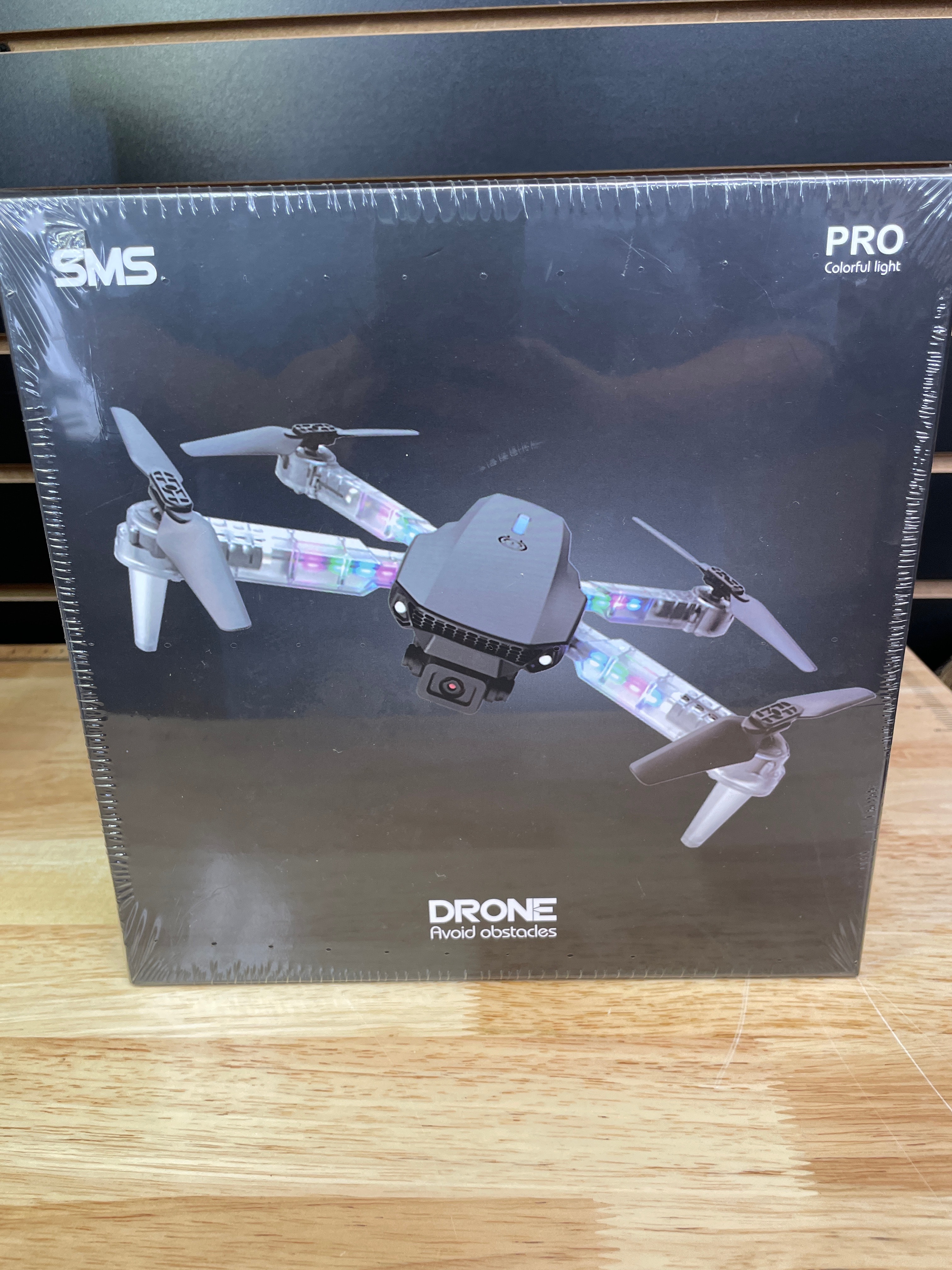 A black drone with colorful LED lights and its black remote control, packaged in a black box labeled “DRONE Avoid obstacles” and “SMS PRO Colorful light”, with an MSRP of $399.99.