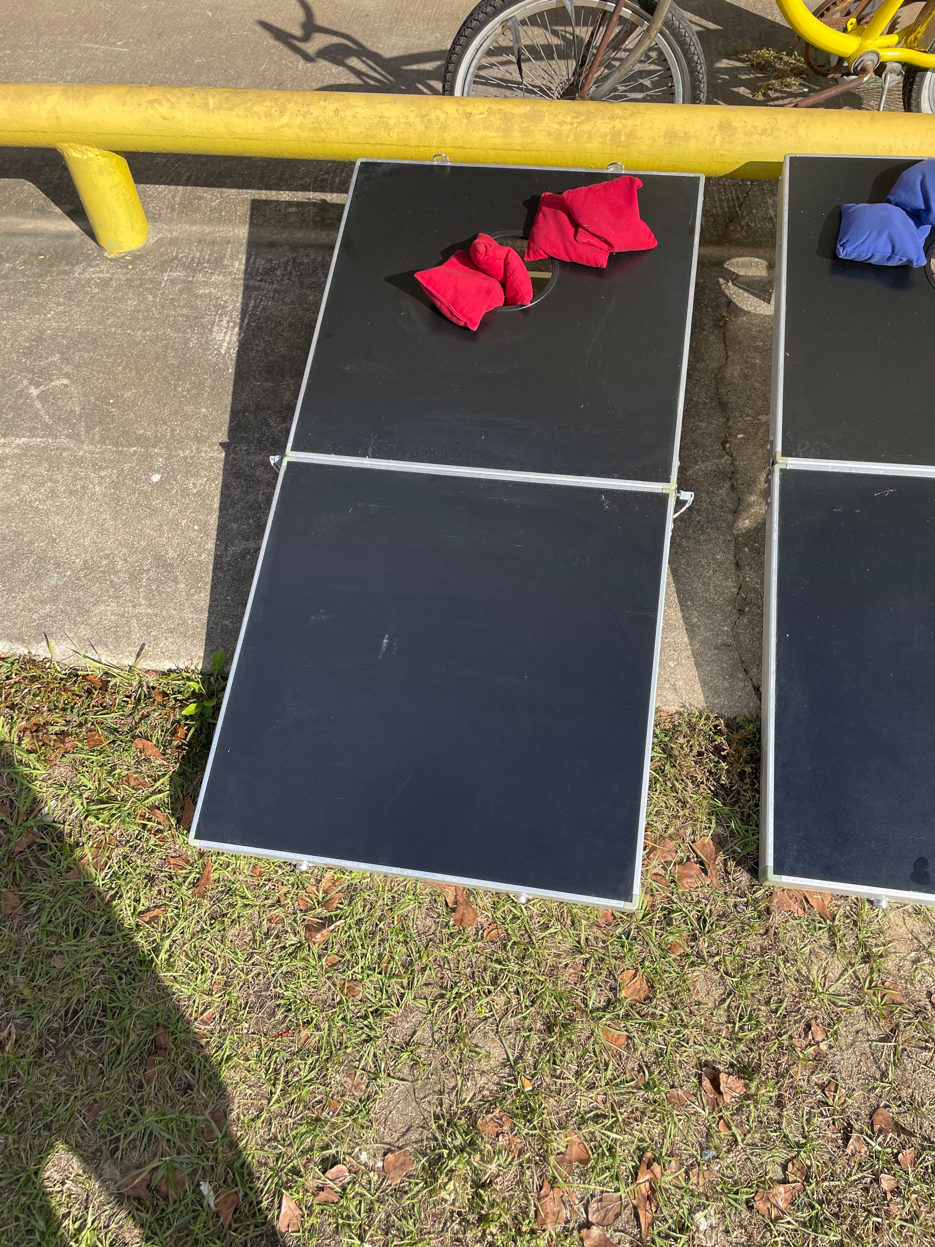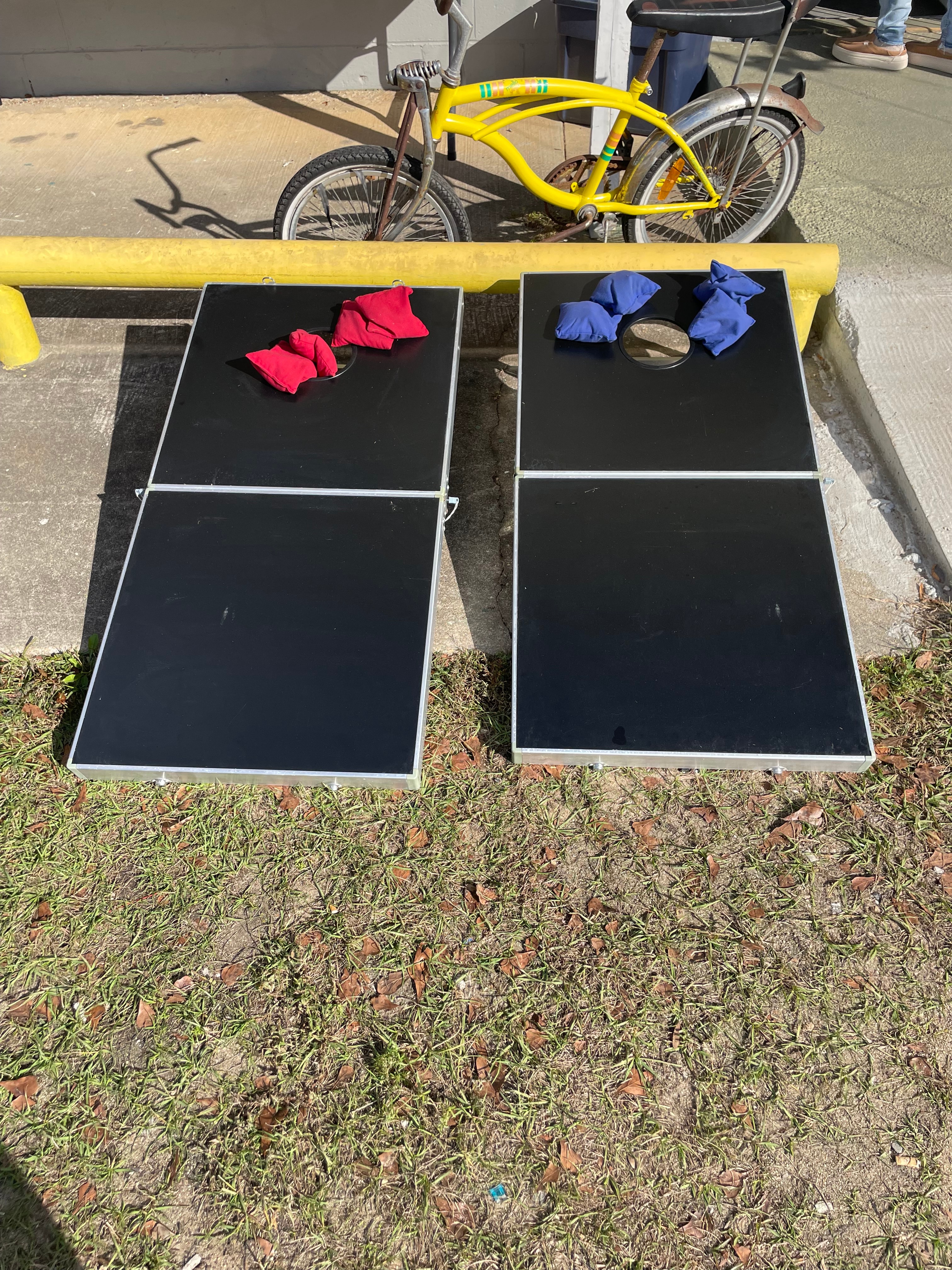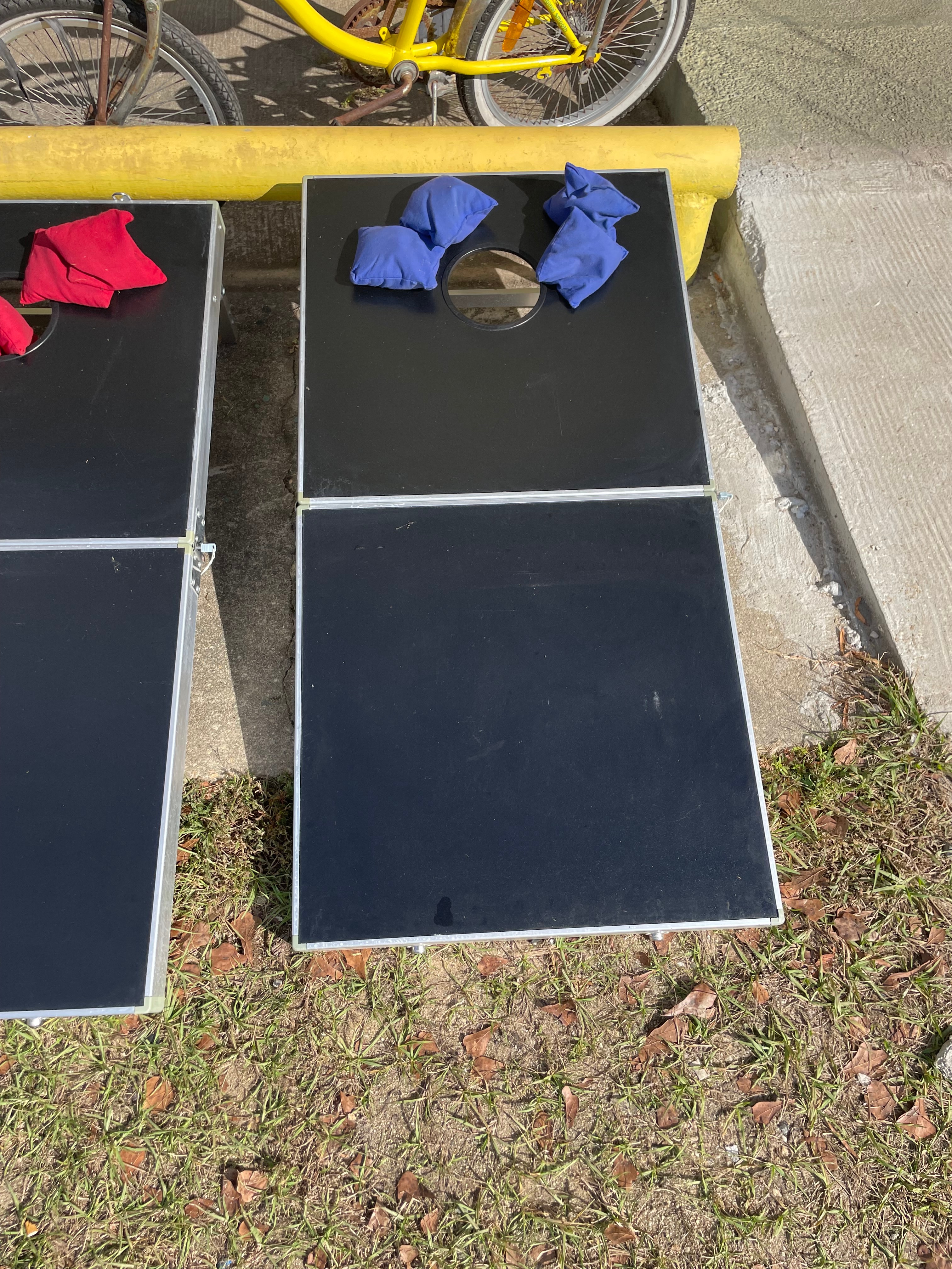 A ZENSTYLE Official Size Cornhole Game Set, comprising two rectangular, folding boards constructed from a dark, likely black, composite material or painted wood, accented with metallic framing and central hinges. Each board features a circular cut-out near one end. Accompanying the boards are eight fabric beanbags, four in red and four in blue. No discernible text or manufacturer markings are visible.