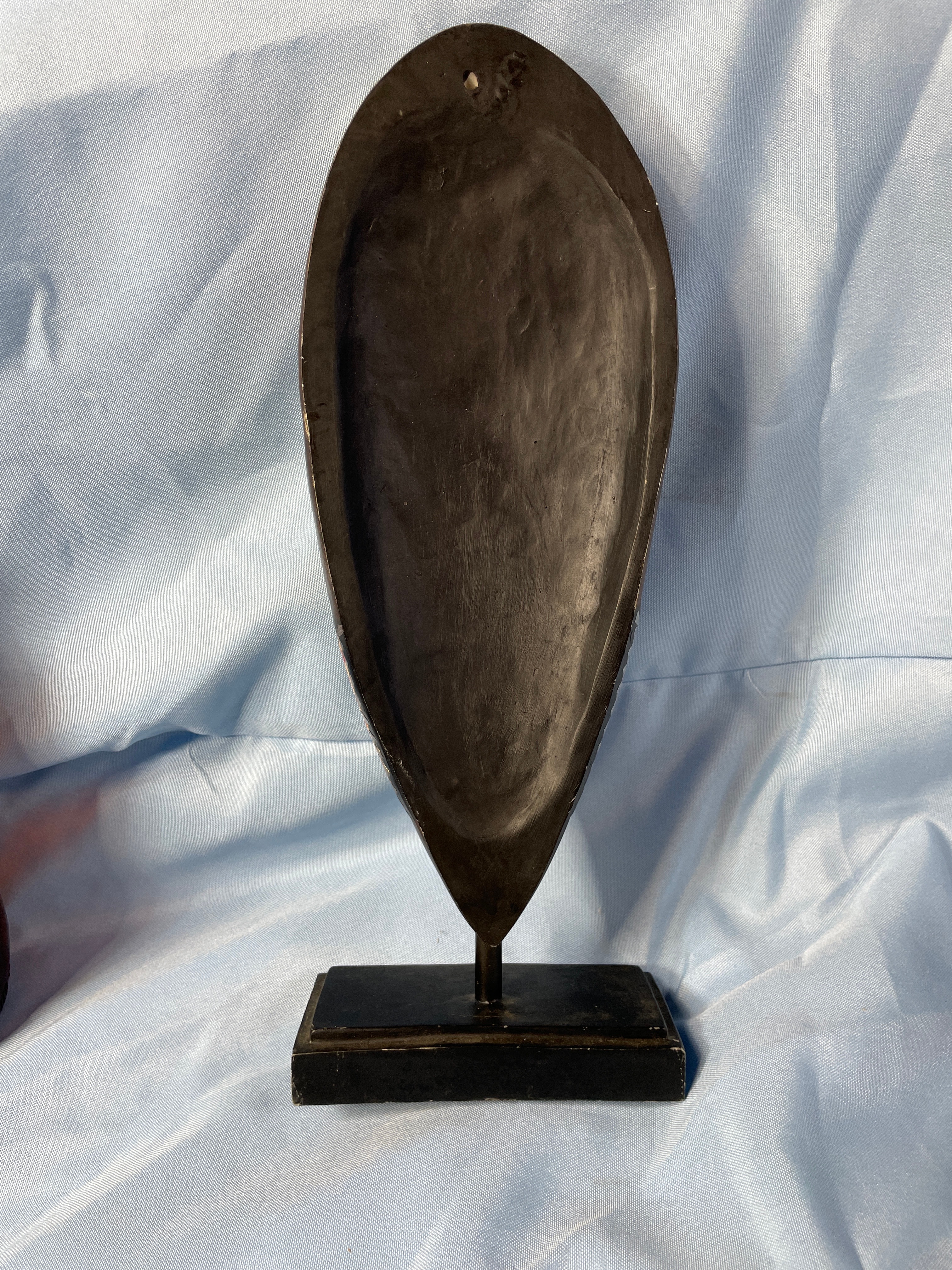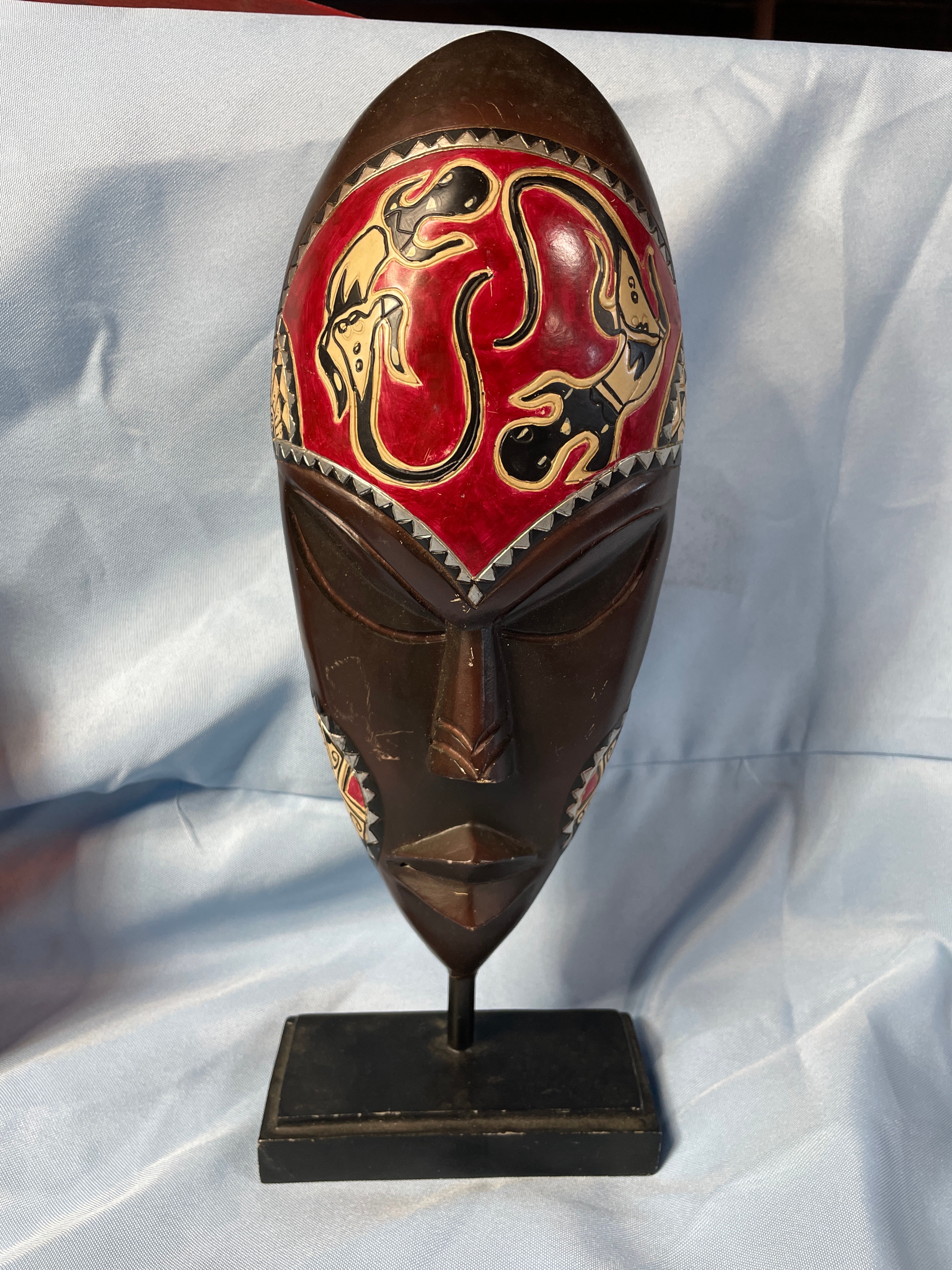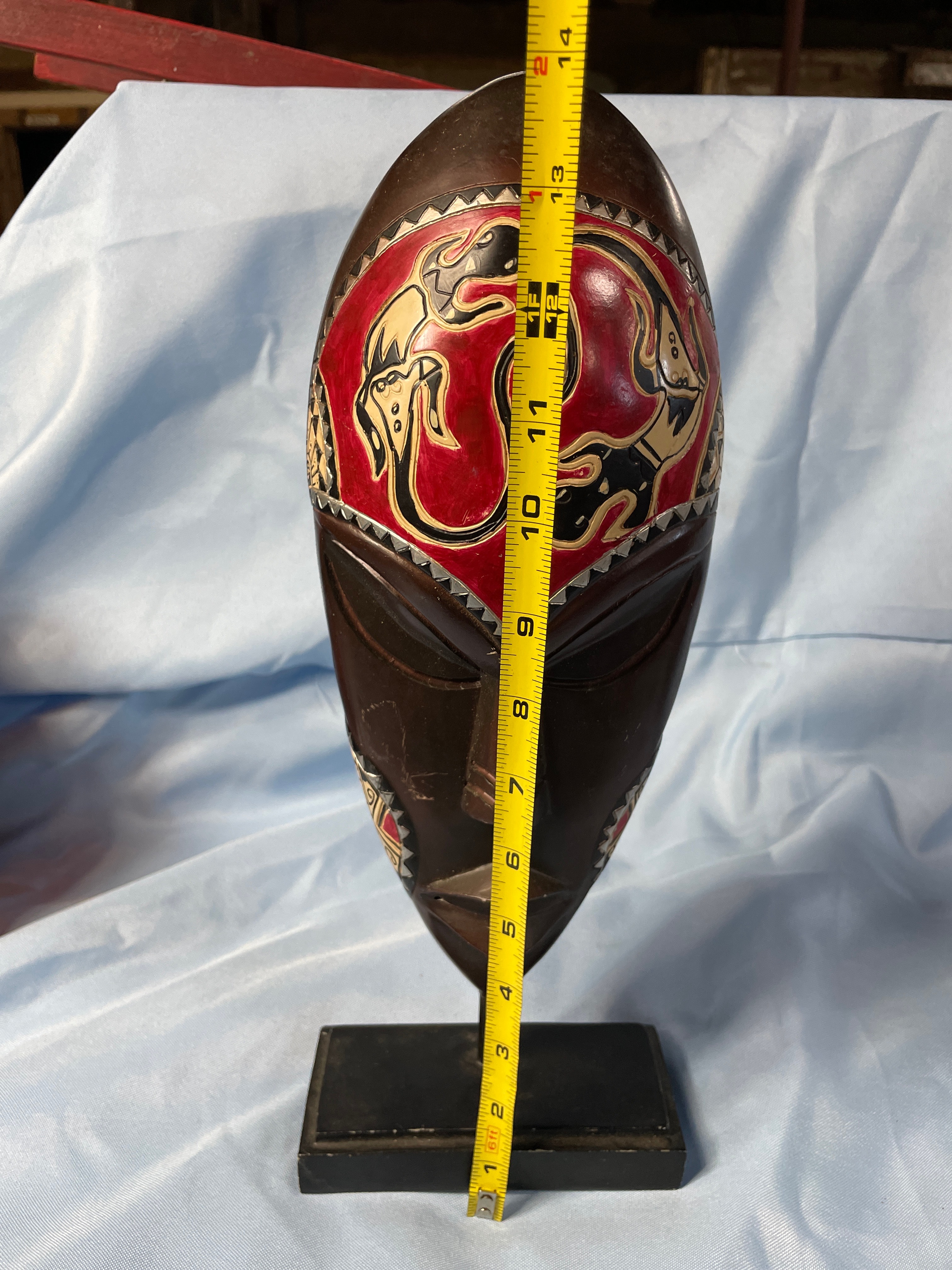 A dark brown wooden mask with red, black, and cream/tan painted patterns on its forehead, presented on a black stand, measuring approximately 13.5 inches tall.