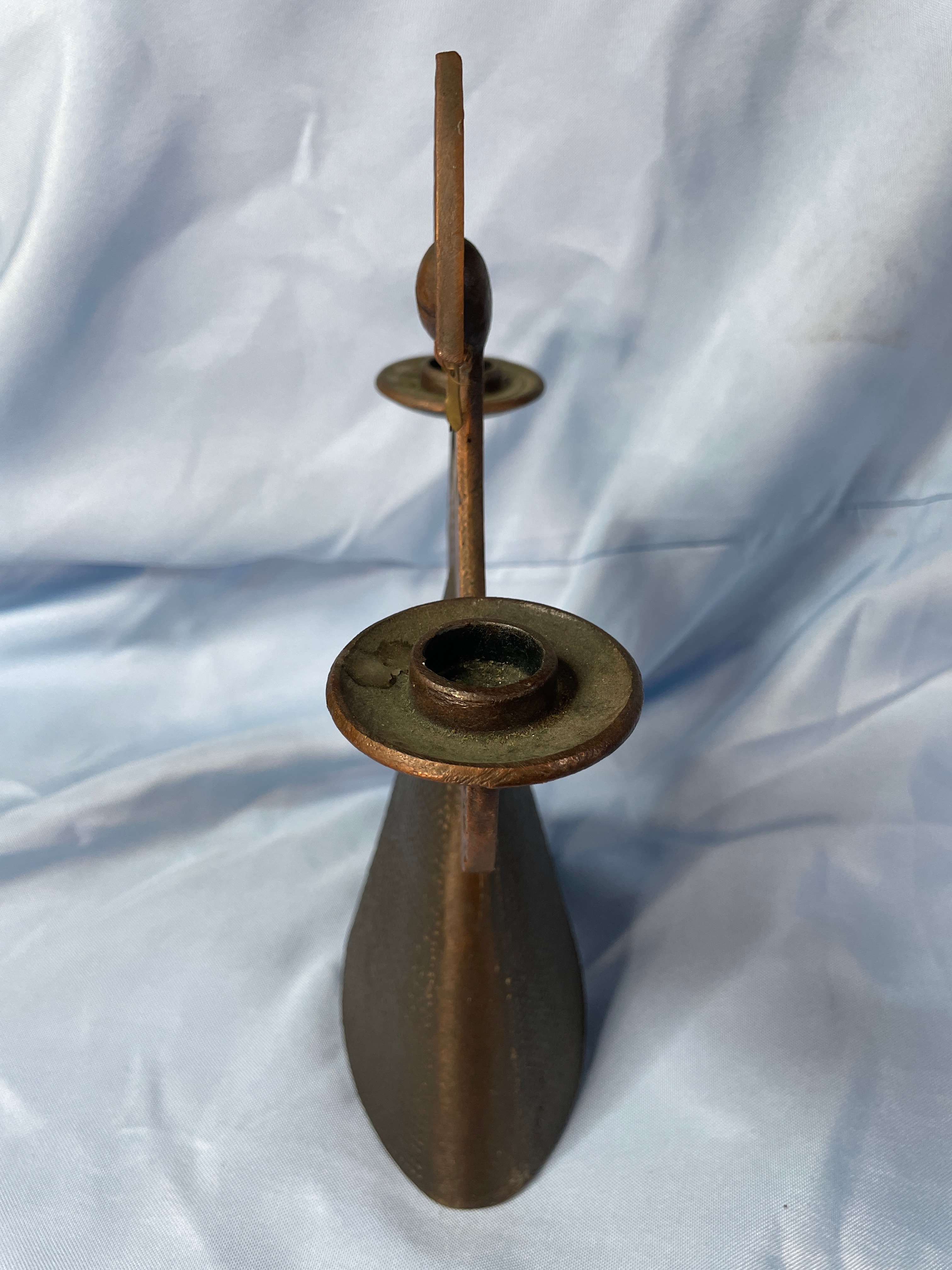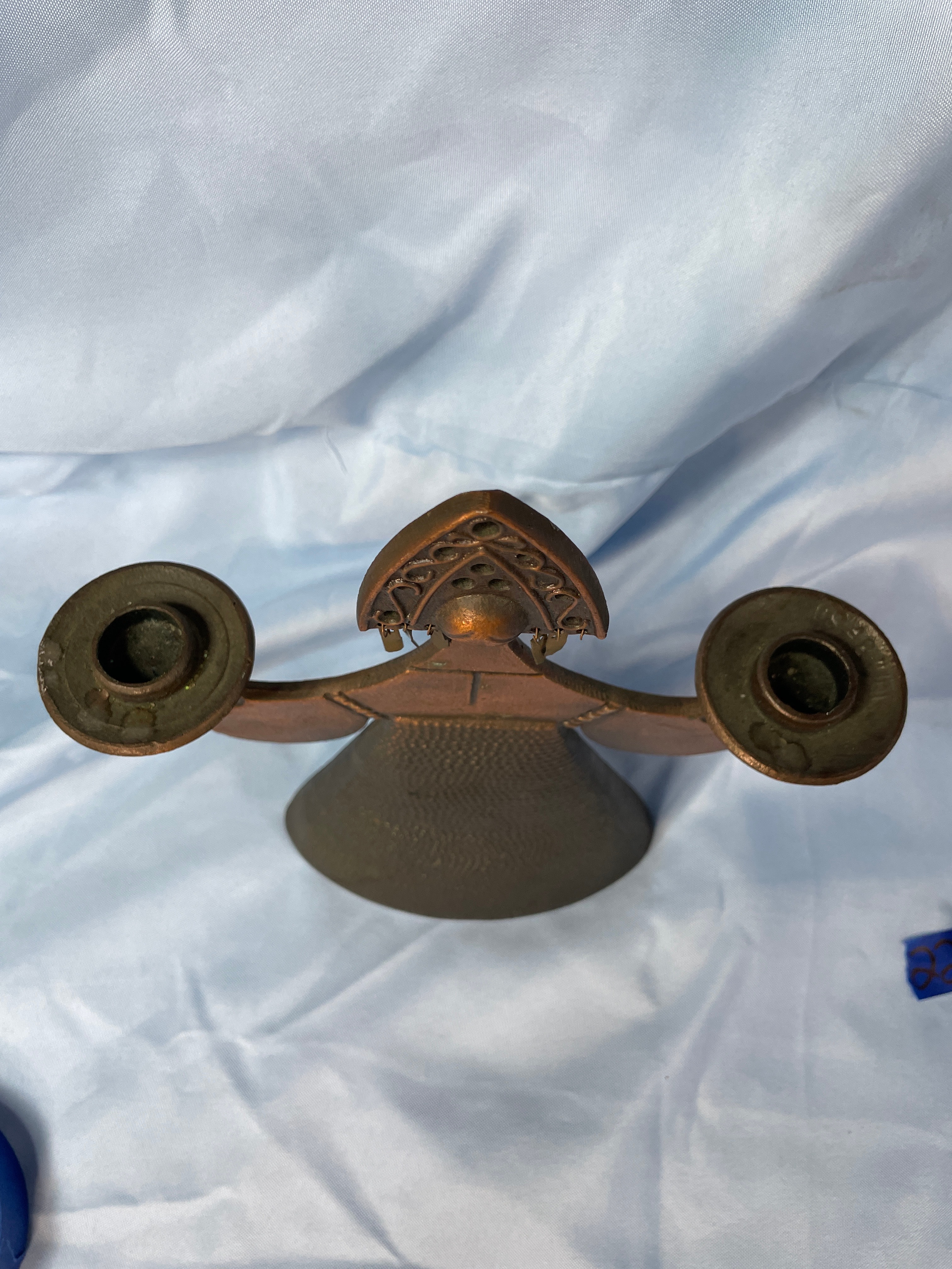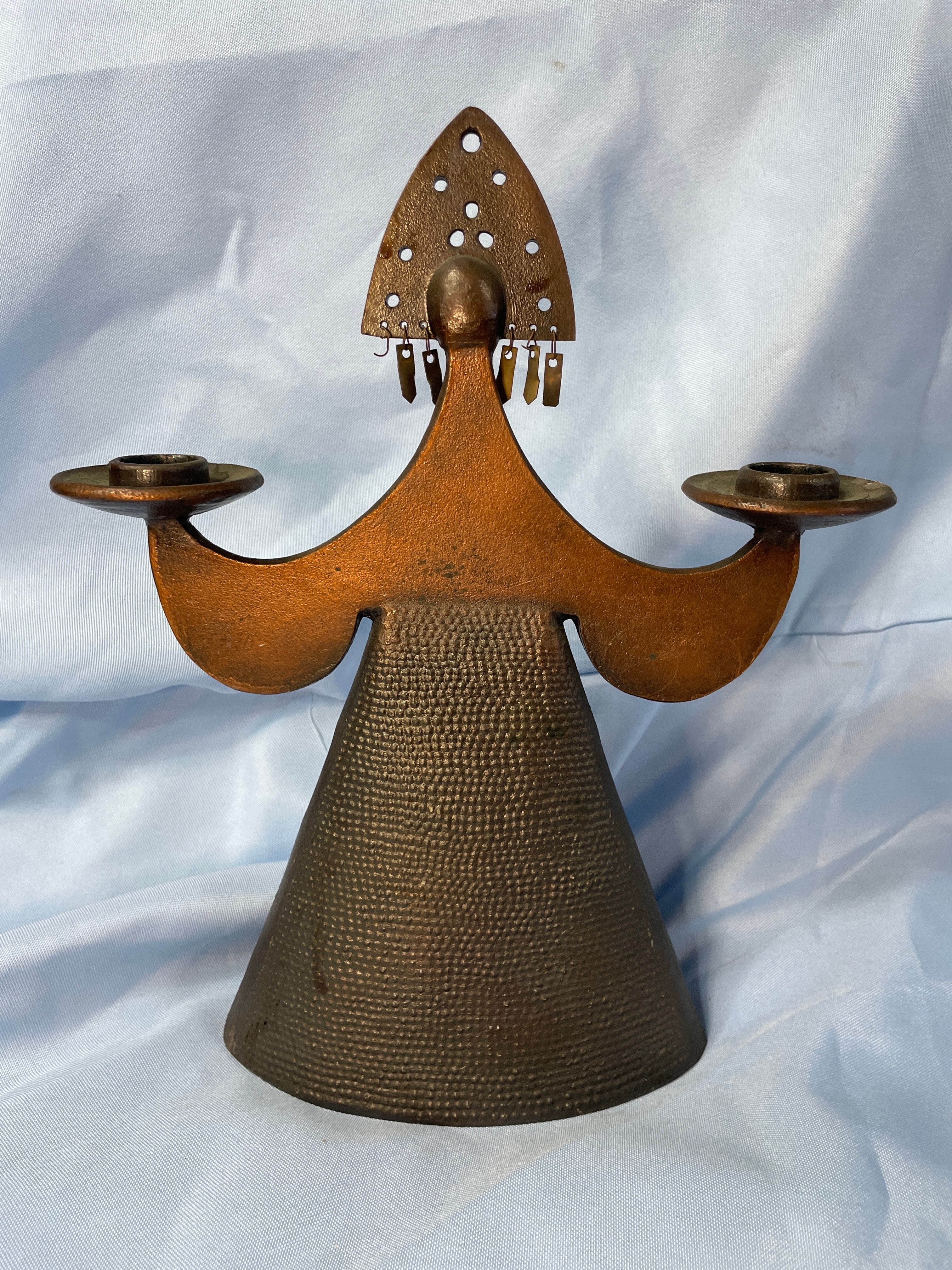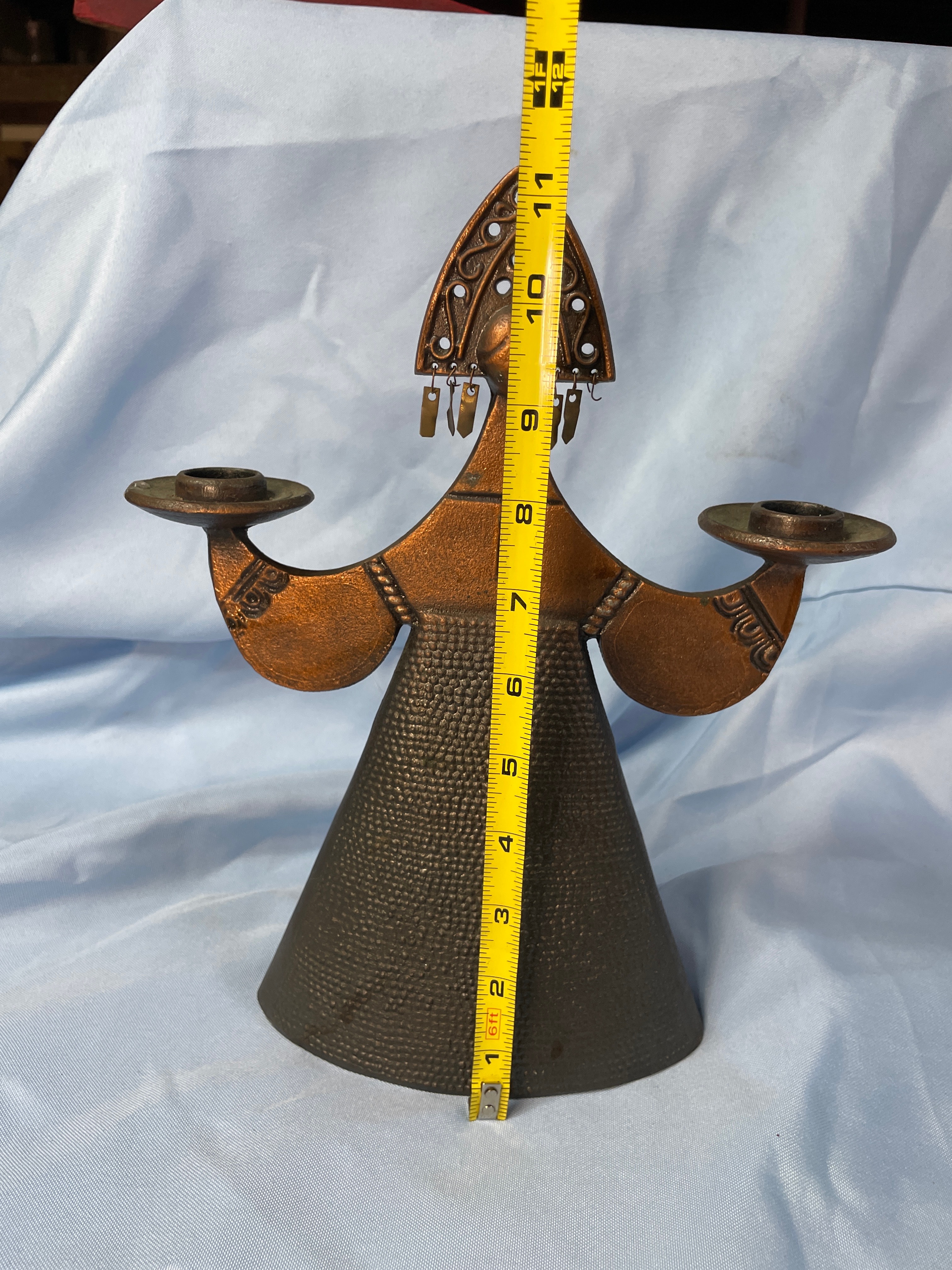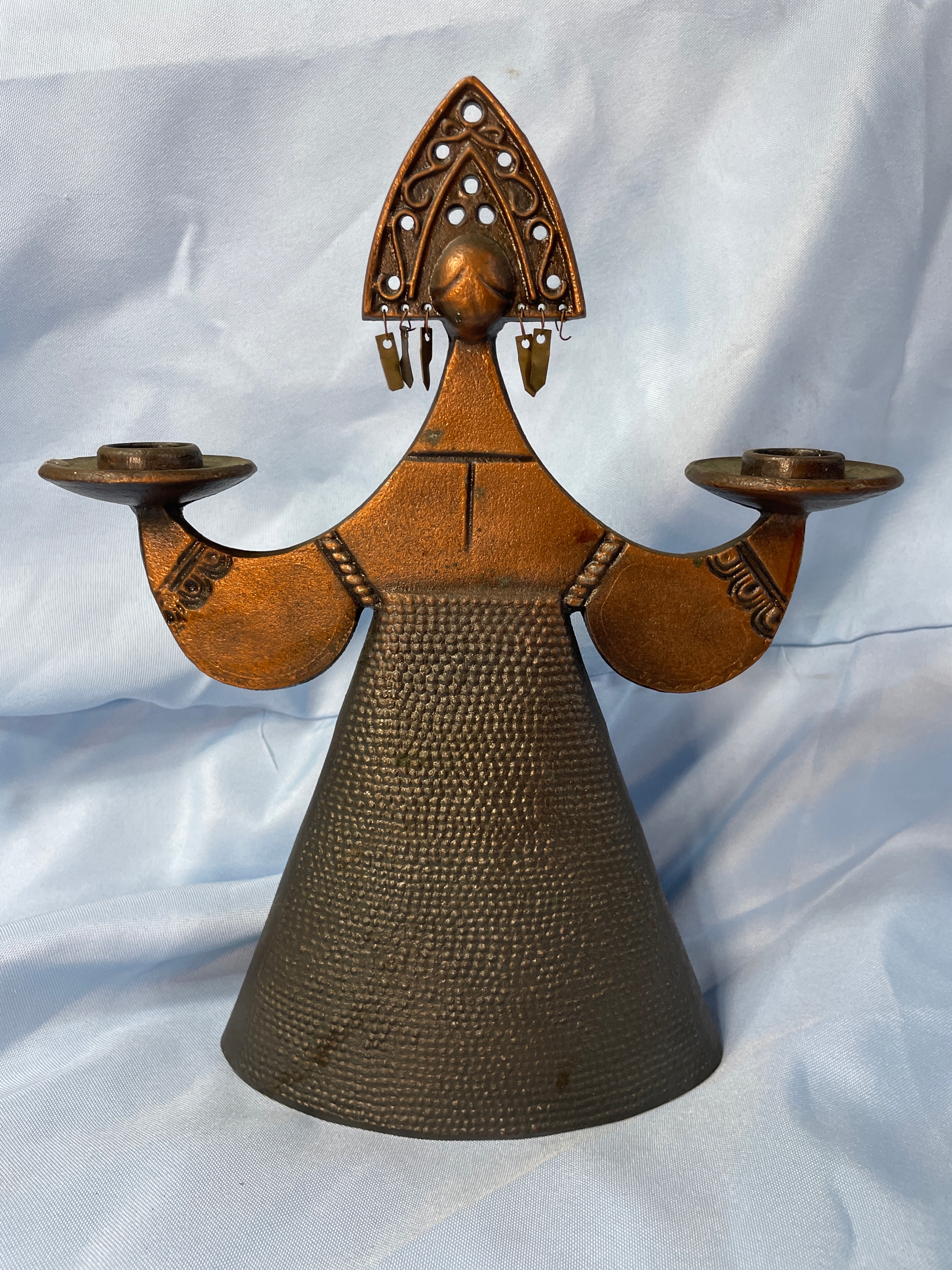 A bronzy-brown metal candlestick holder shaped like a stylized Russian woman wearing an ornate kokoshnik headpiece, designed to hold two candles, measuring approximately 10.5 inches tall.