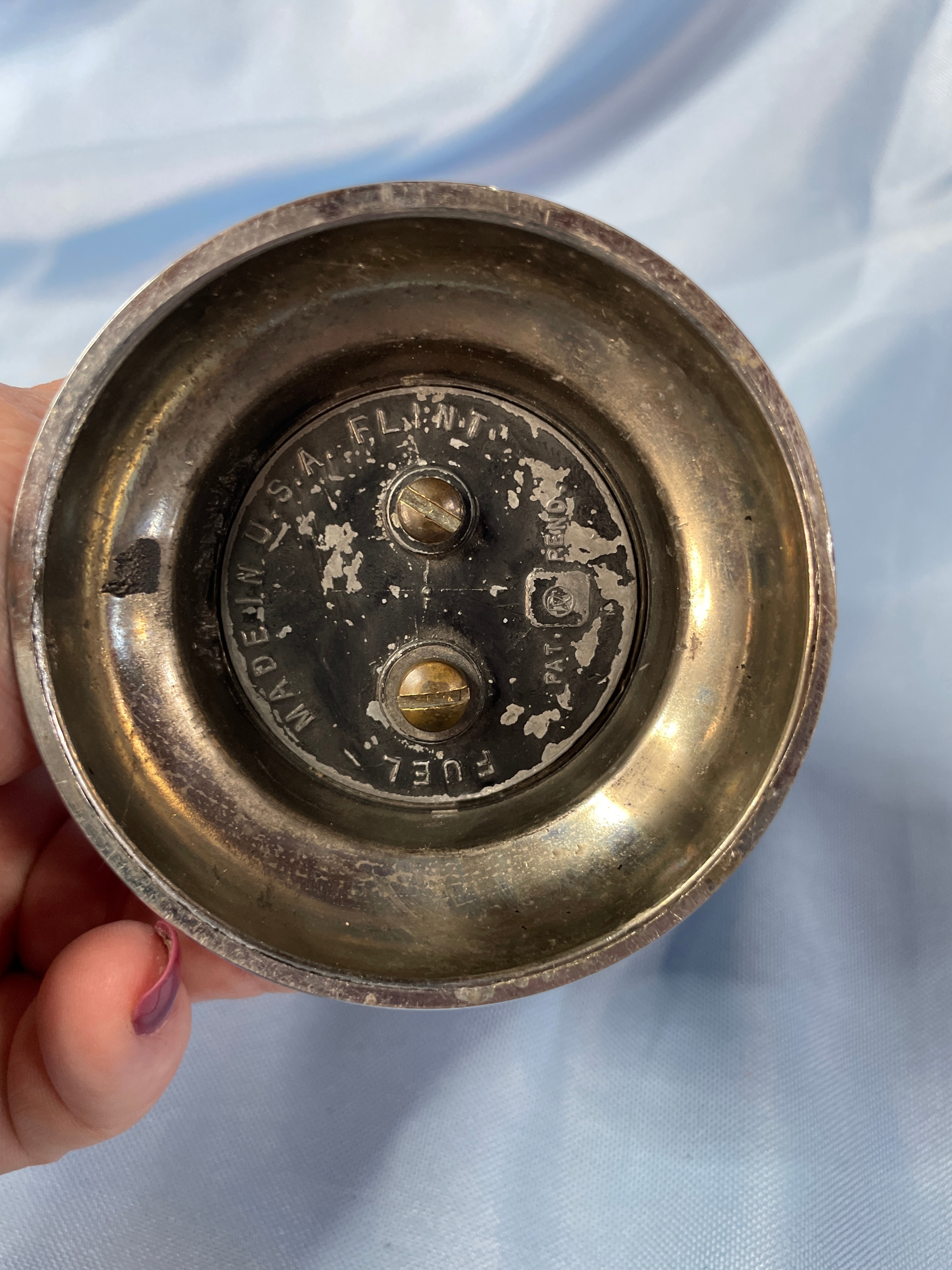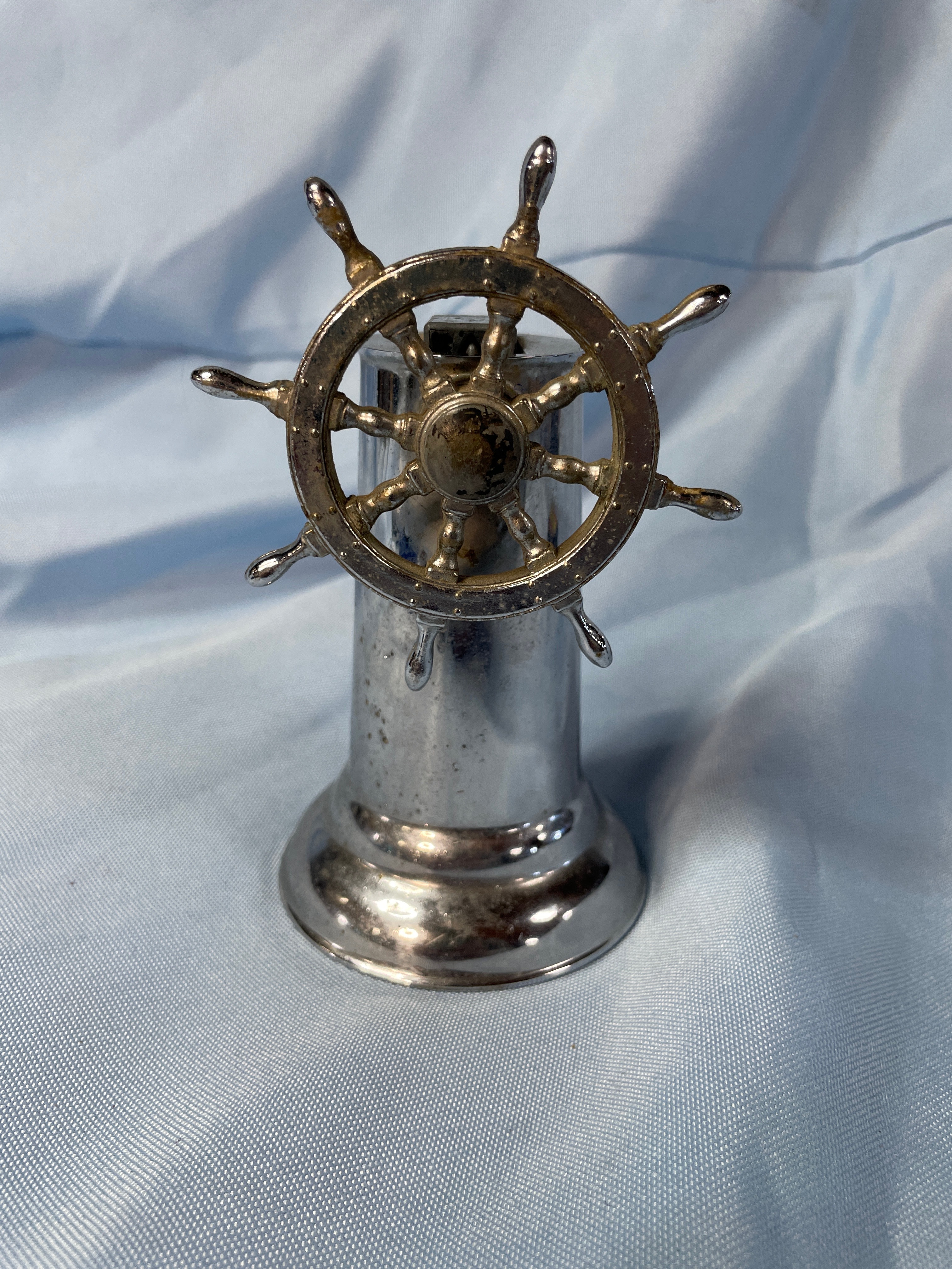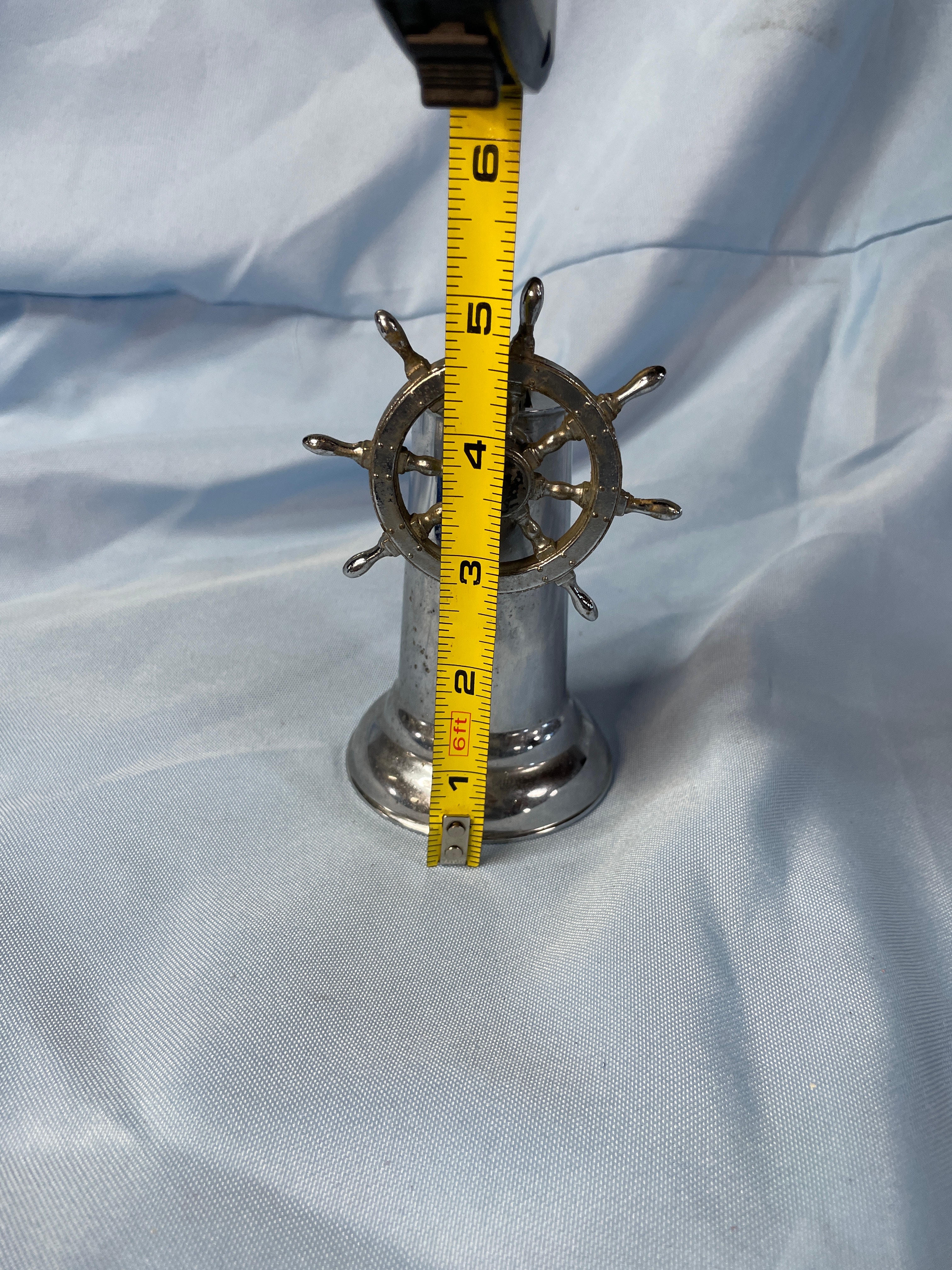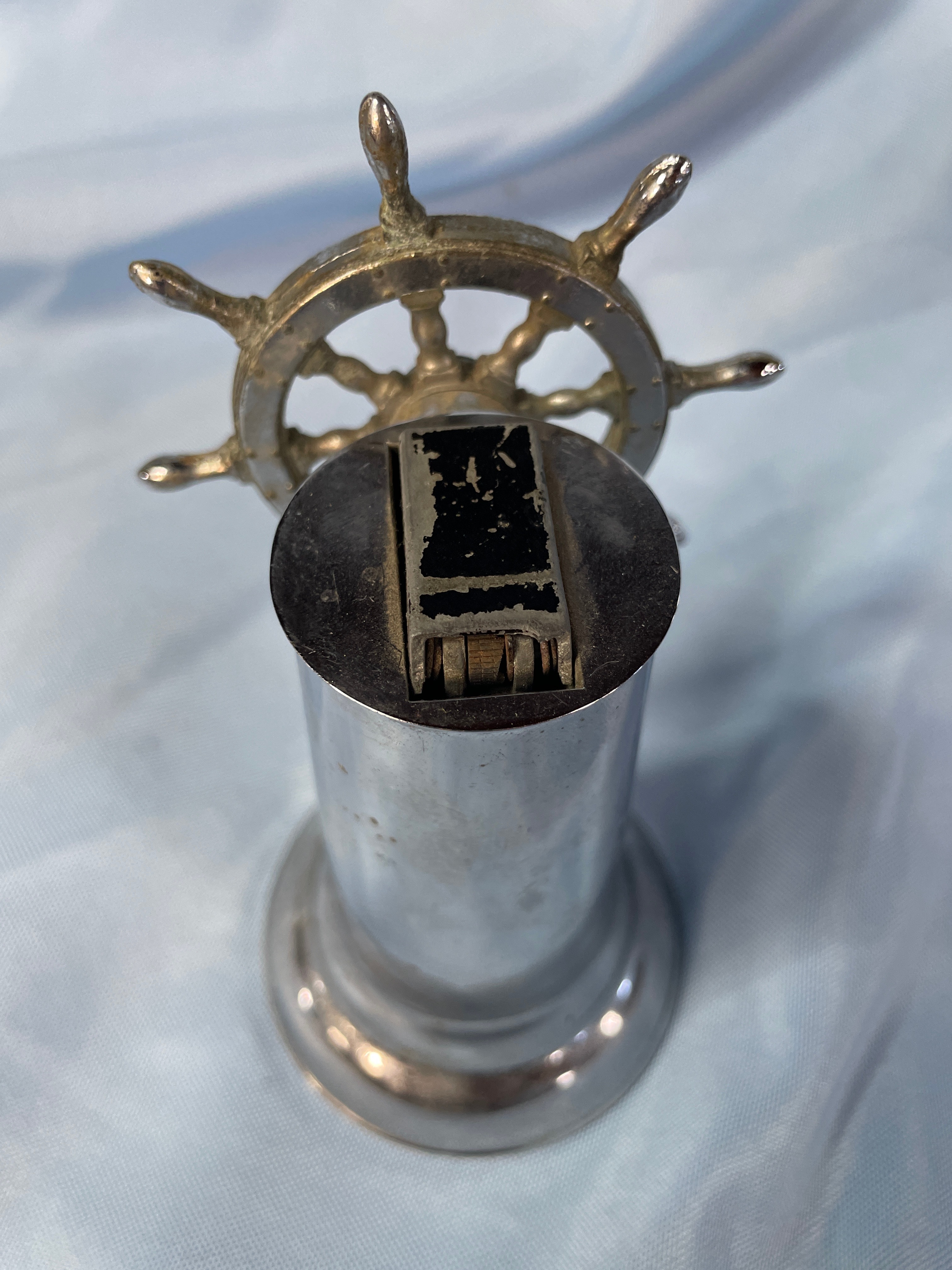 A silver-tone metal table lighter with a ship’s wheel design, inscribed ‘MADE IN U.S.A. FLINT’, ‘FUEL’, and ‘PAT’D’ on its base, measuring approximately 4.5 inches tall.
