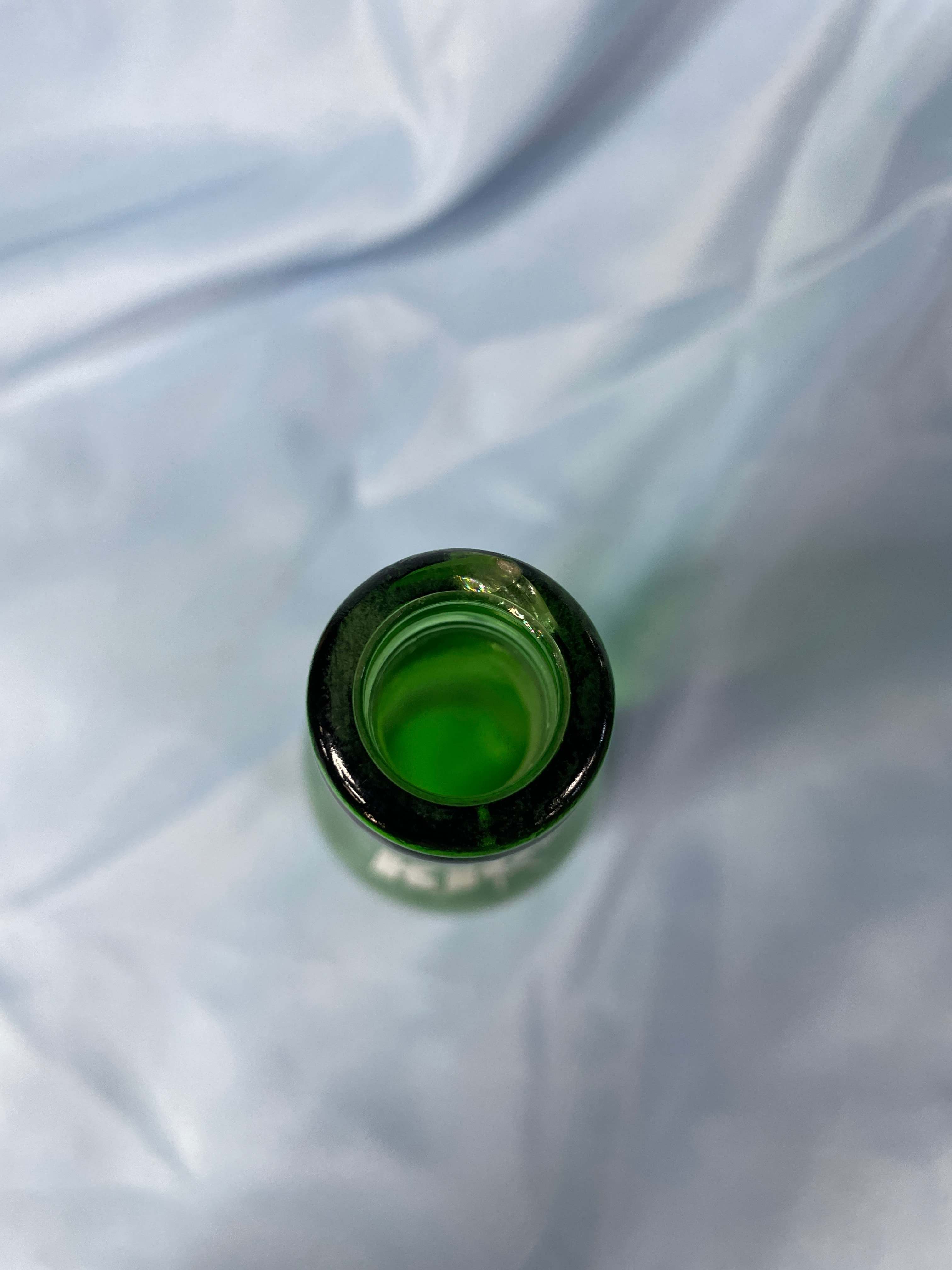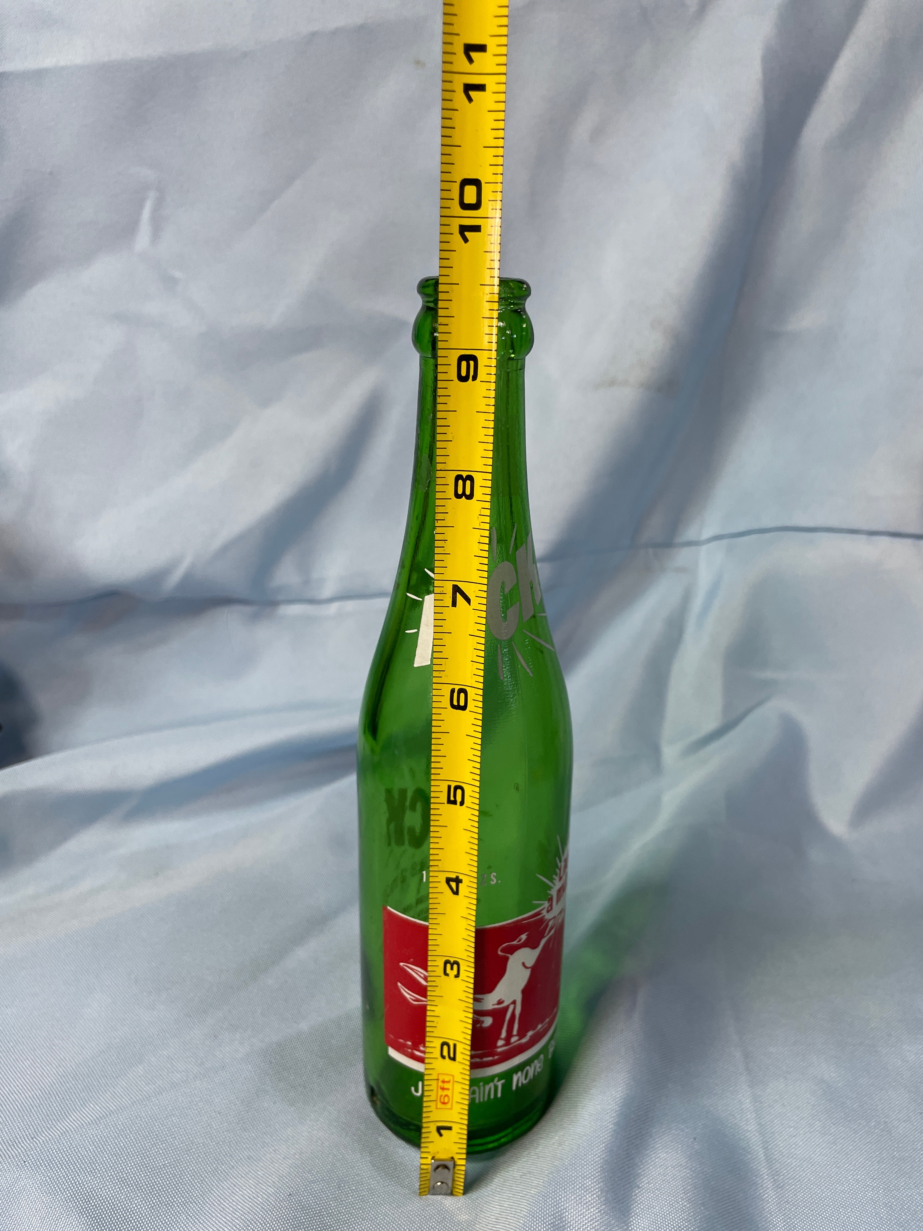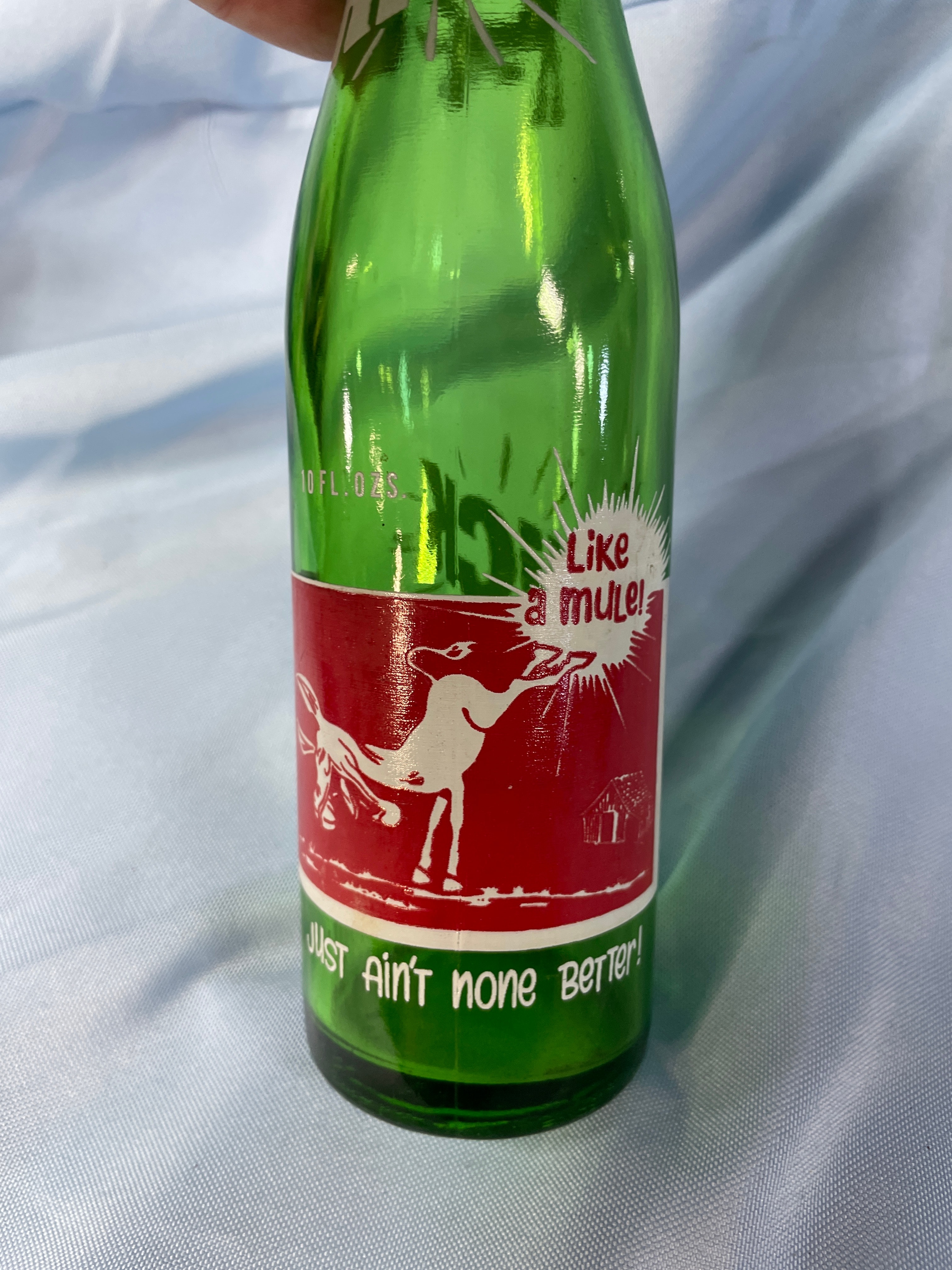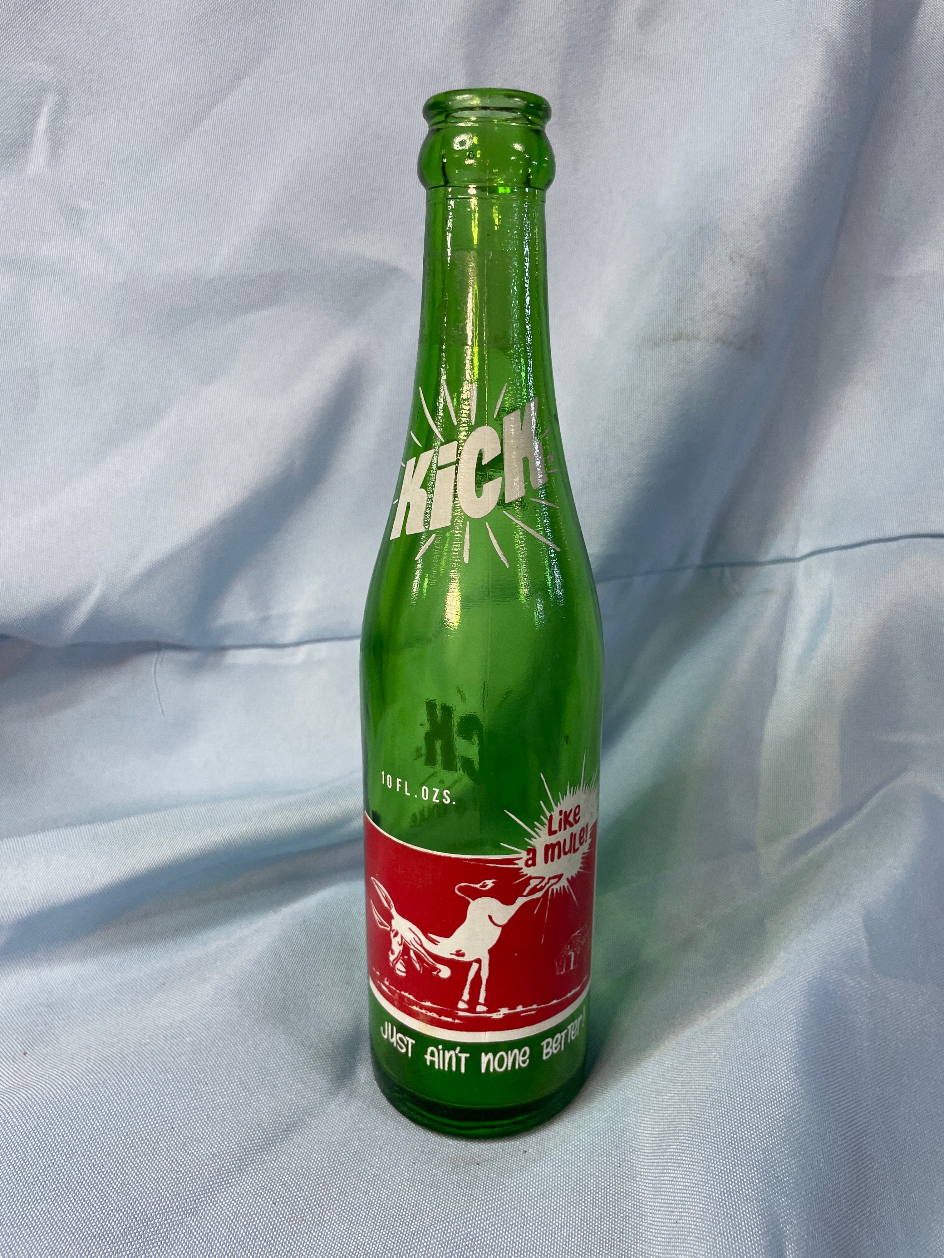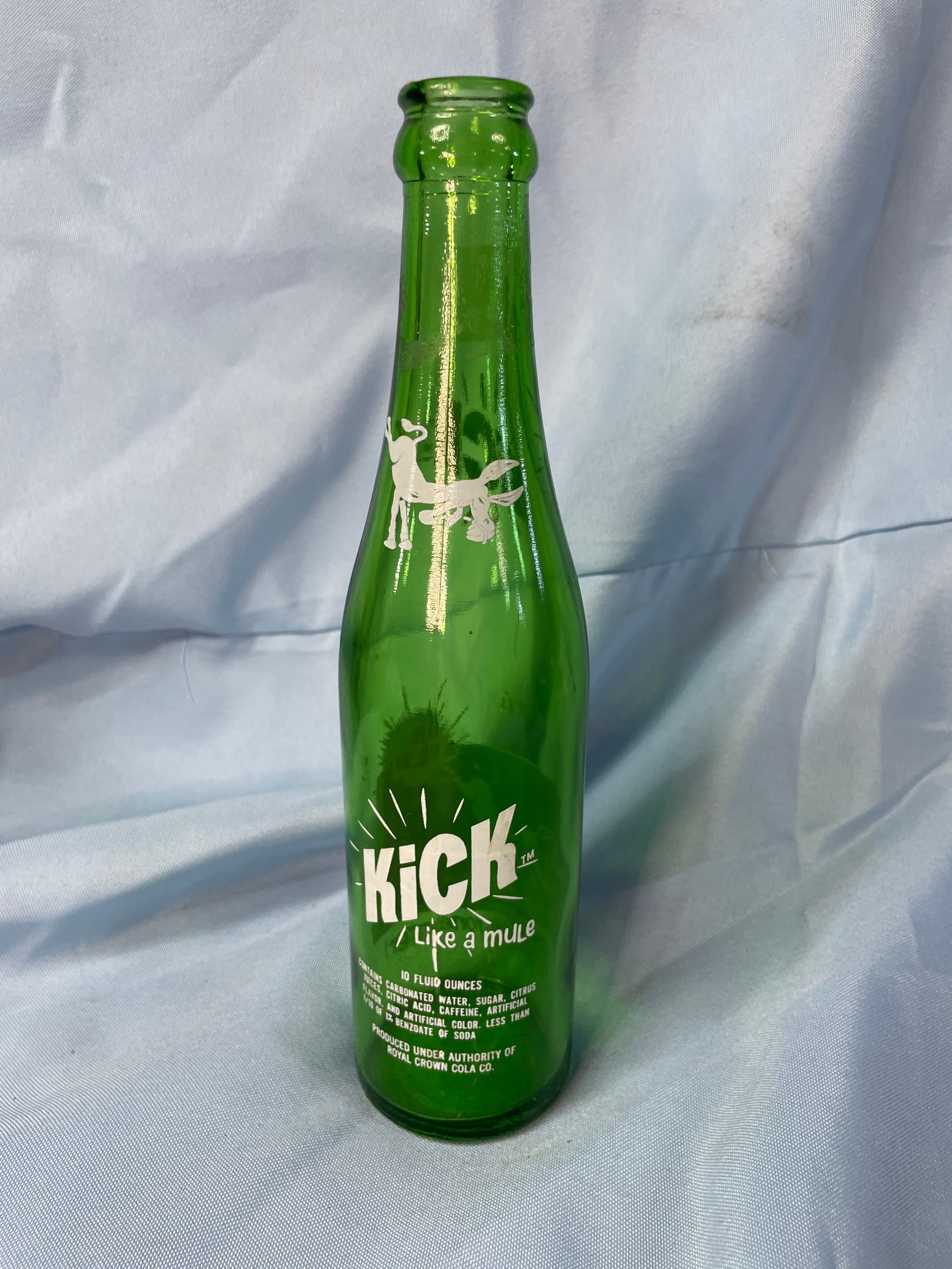 A green glass Kick soda bottle, approximately 9.5 inches tall, features a white mule graphic, ‘KICK™’, ‘ROYAL CROWN COLA CO.’, ’10 FL. OZS.’, ‘Like a mule!’, ‘Just ain’t none Better!’, and ingredient information.