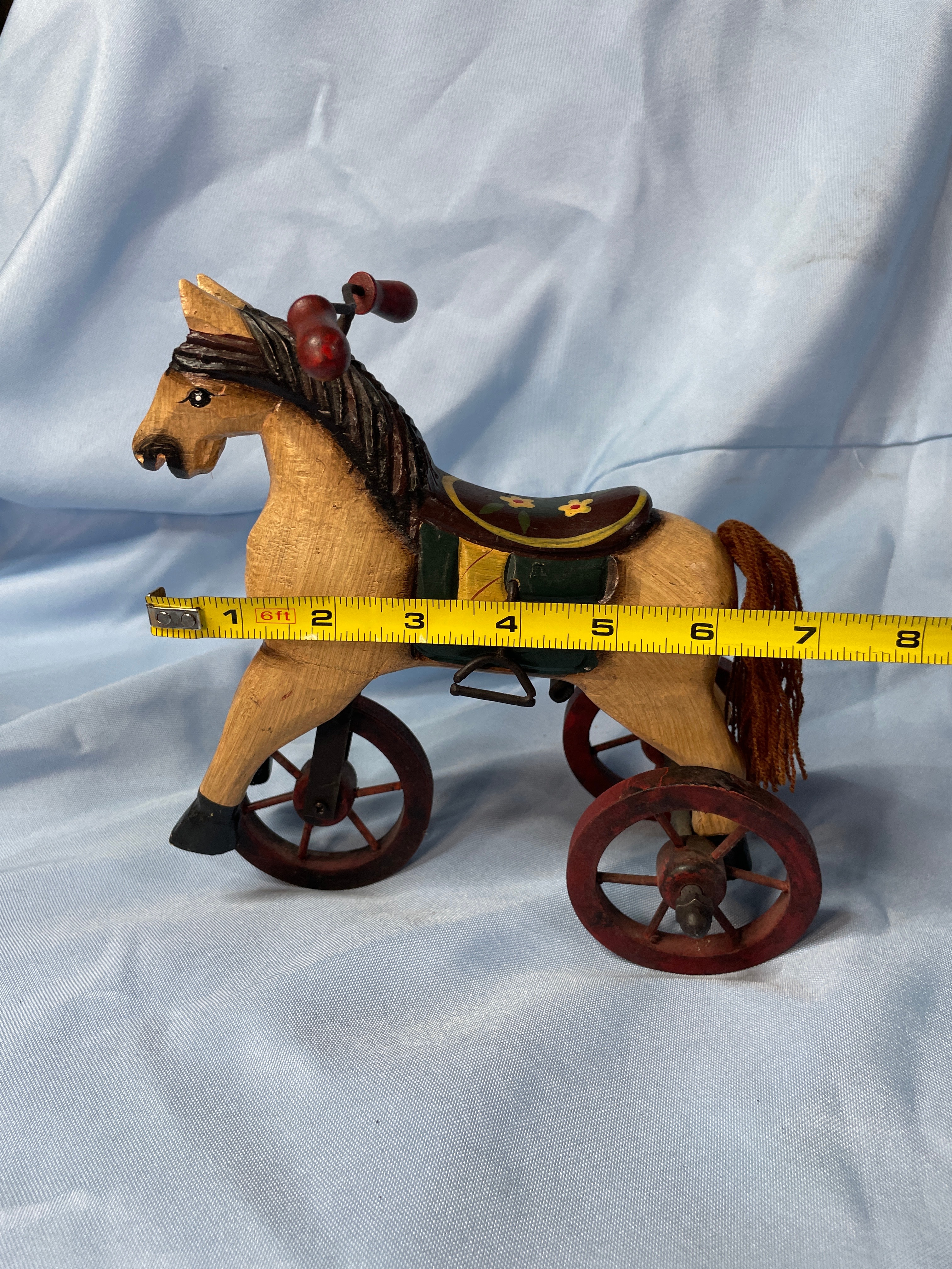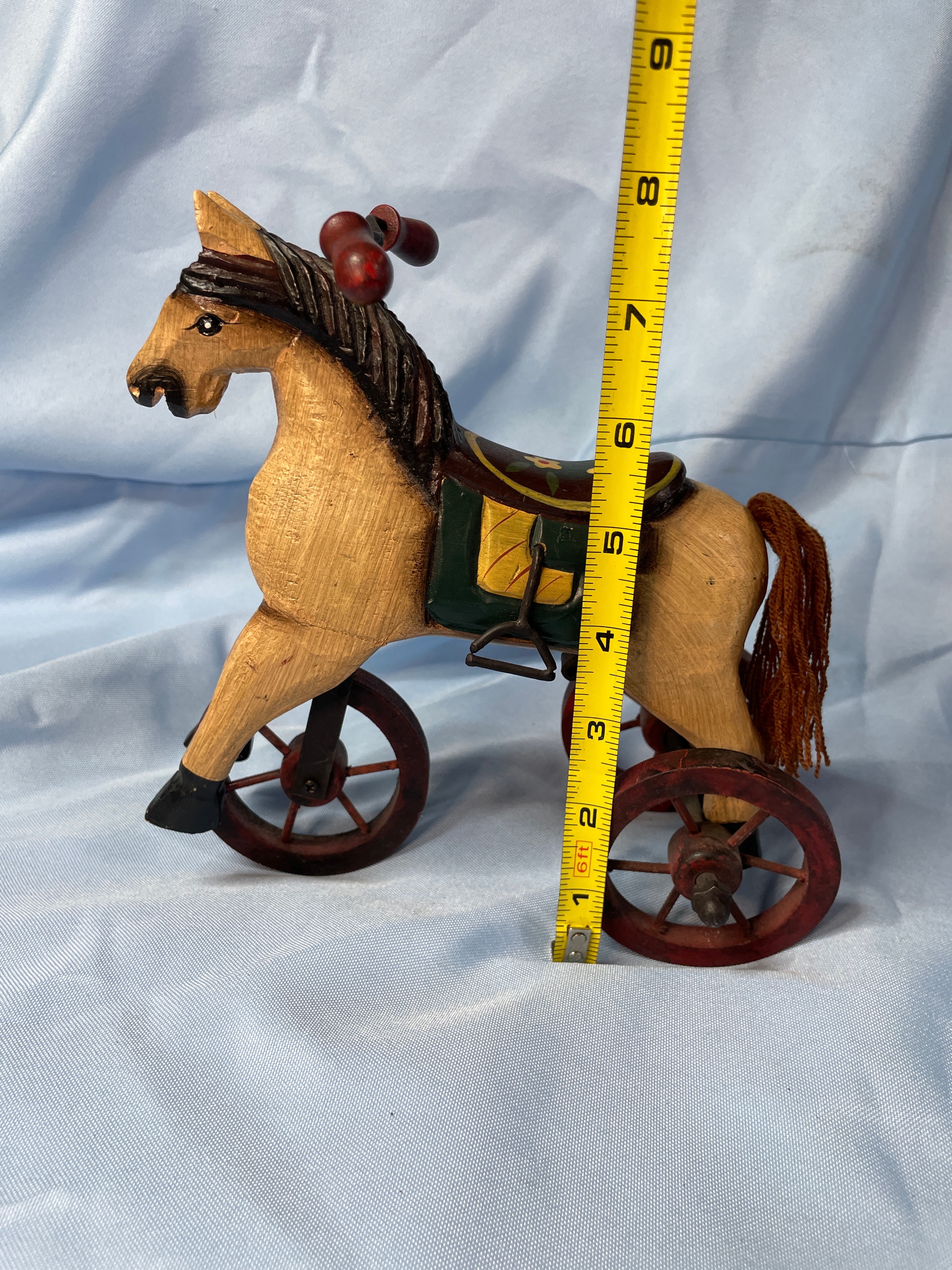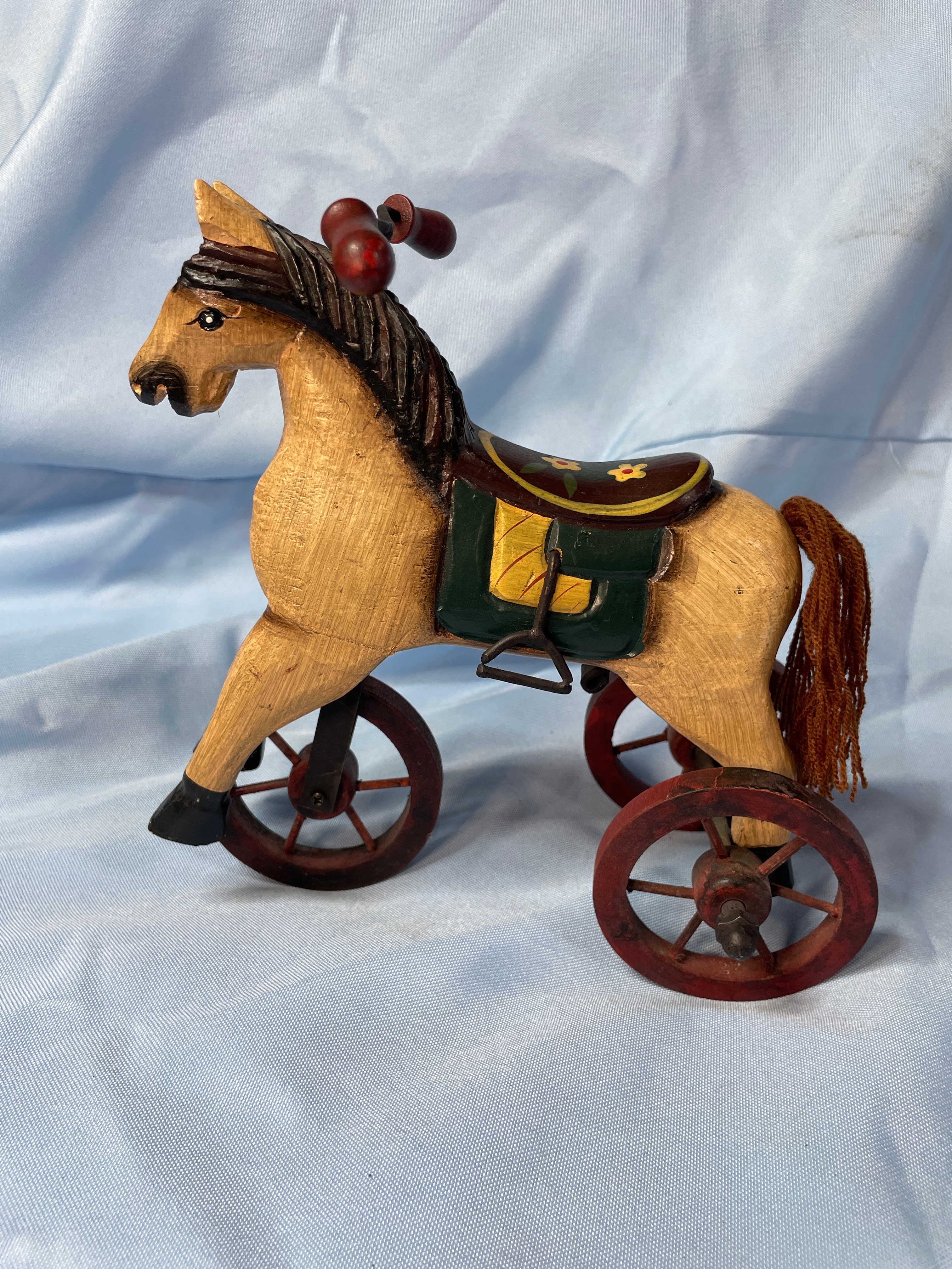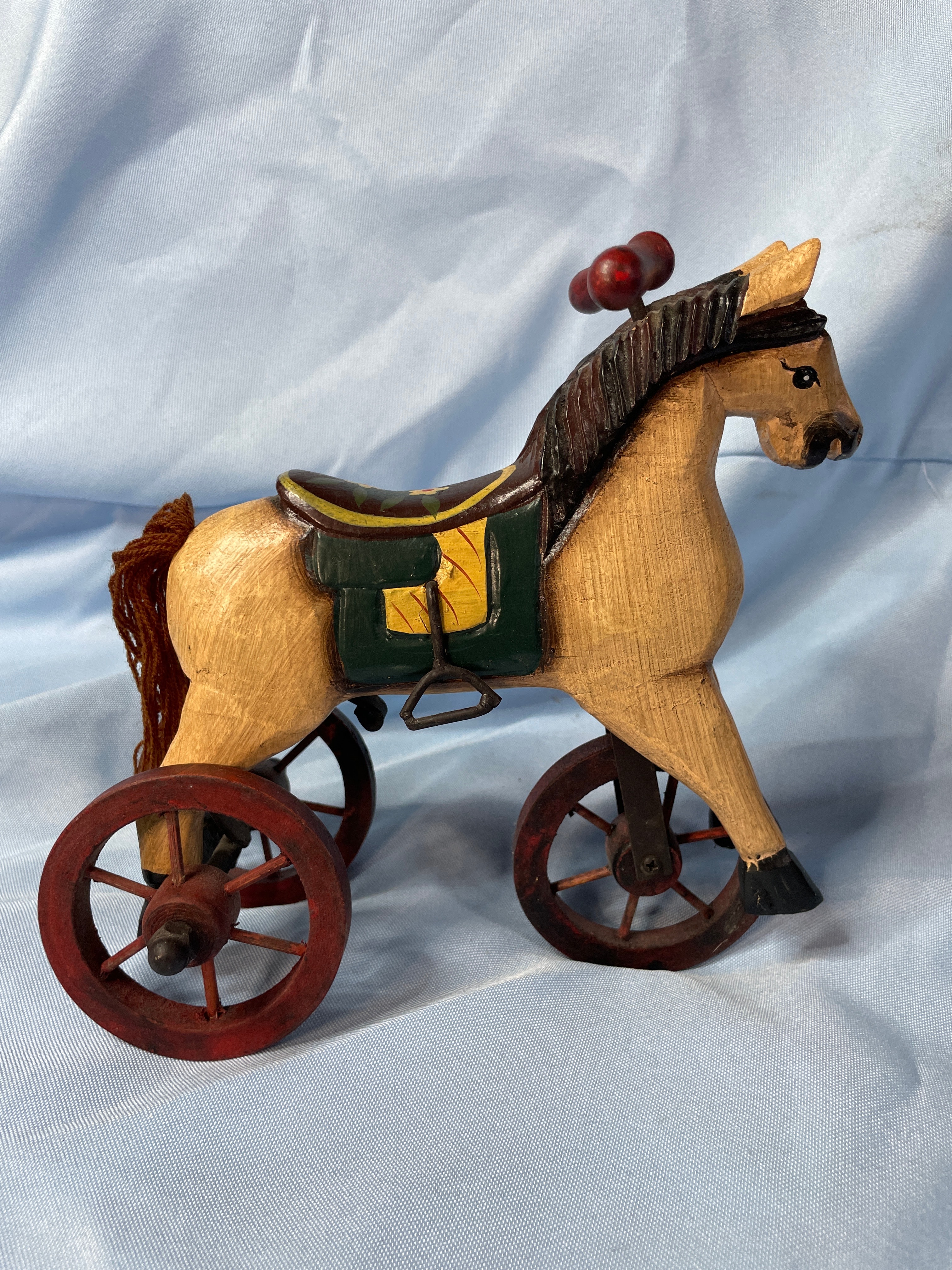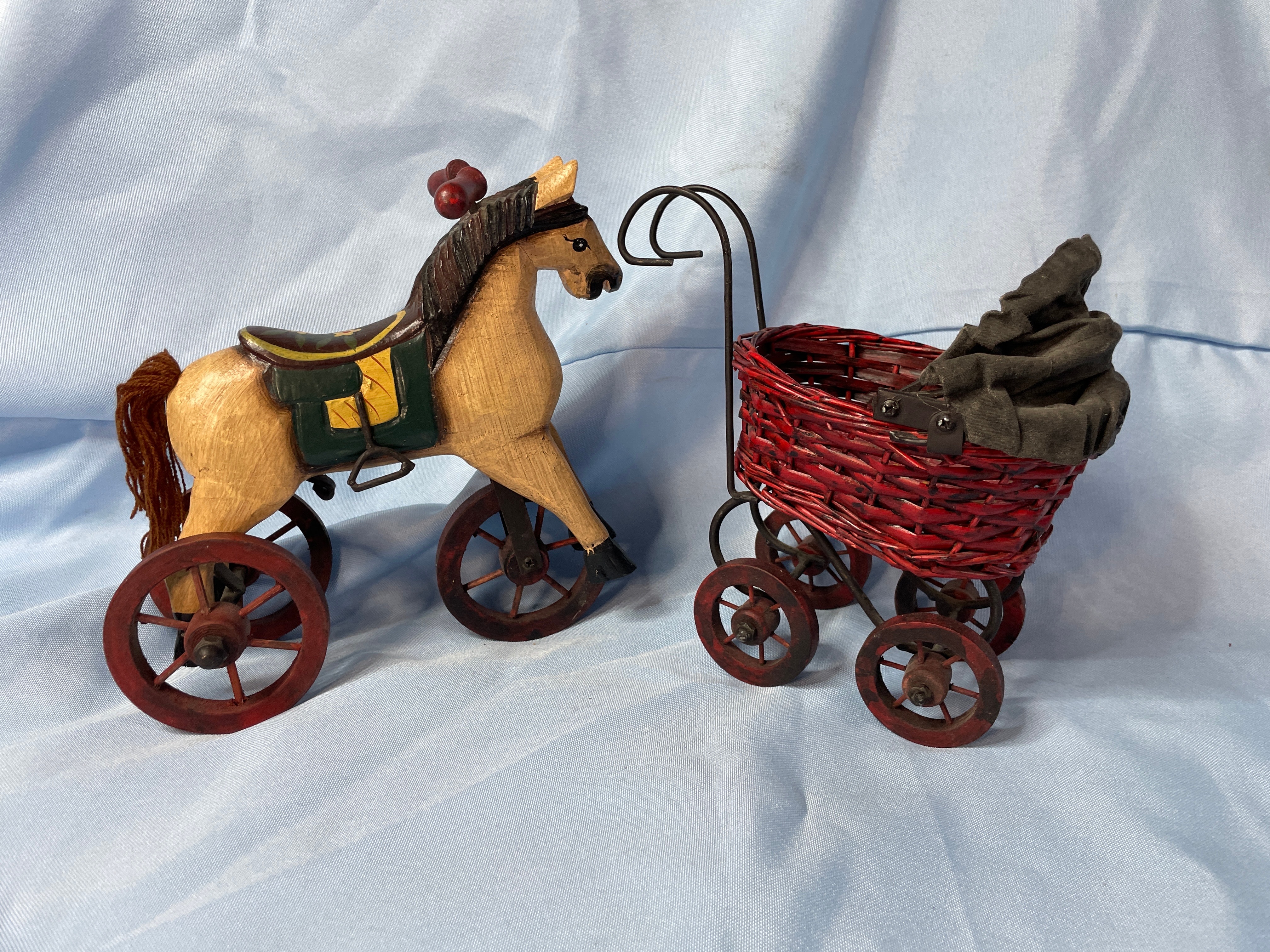 A light brown carved wooden horse on red wheels with a green and yellow saddle decorated with small painted yellow flowers (approx. 7″ L, 6.5″ H) and a miniature red wicker baby carriage with a dark grey hood and red wheels (approx. 6″ L, 7.5″ H).