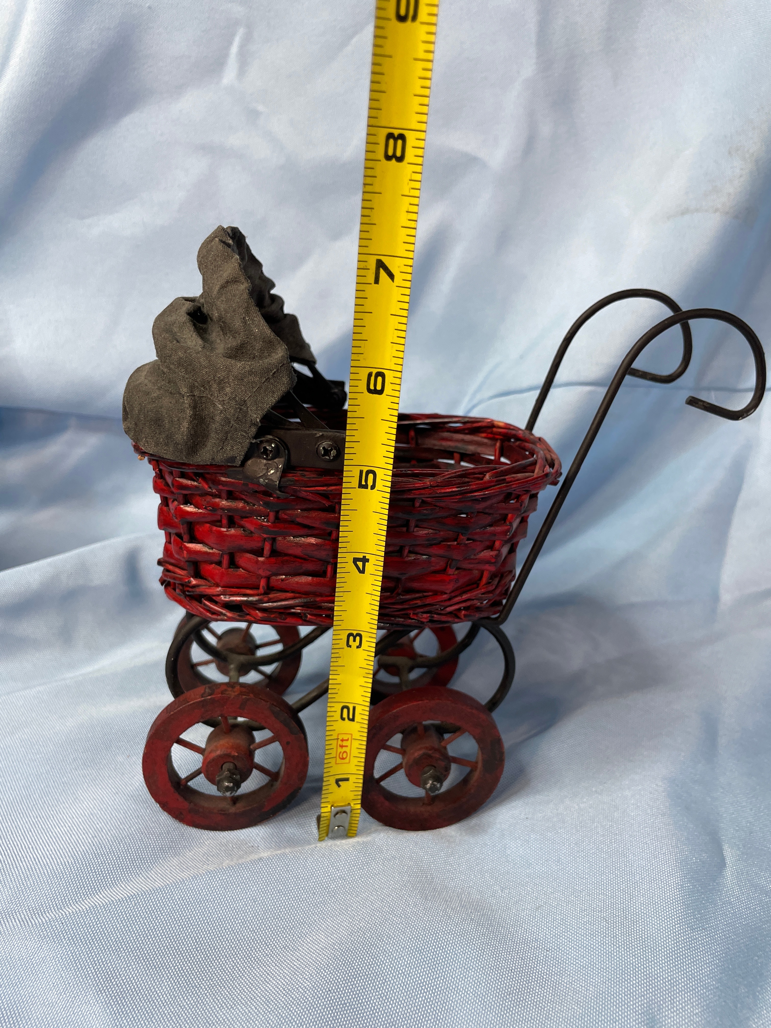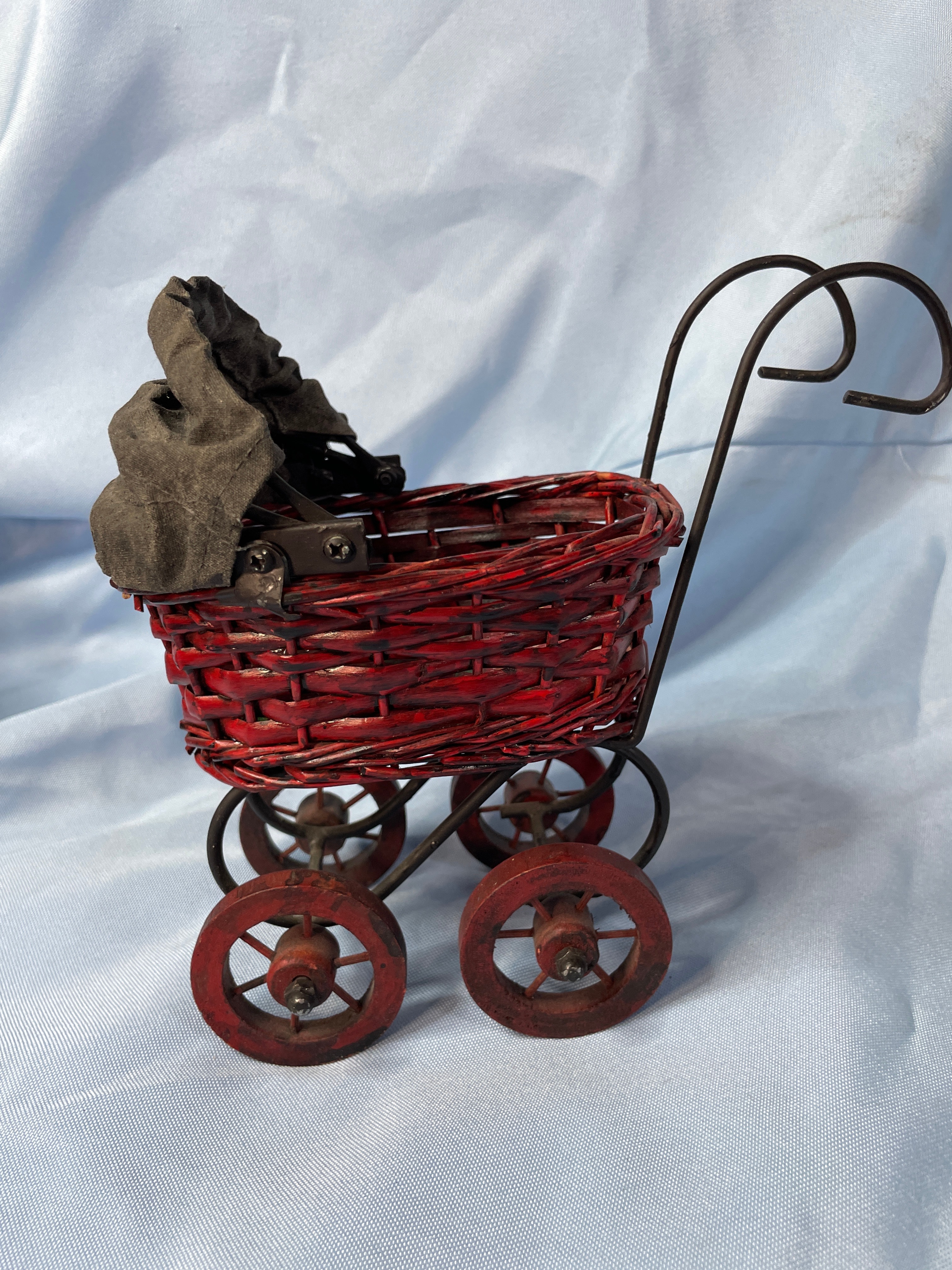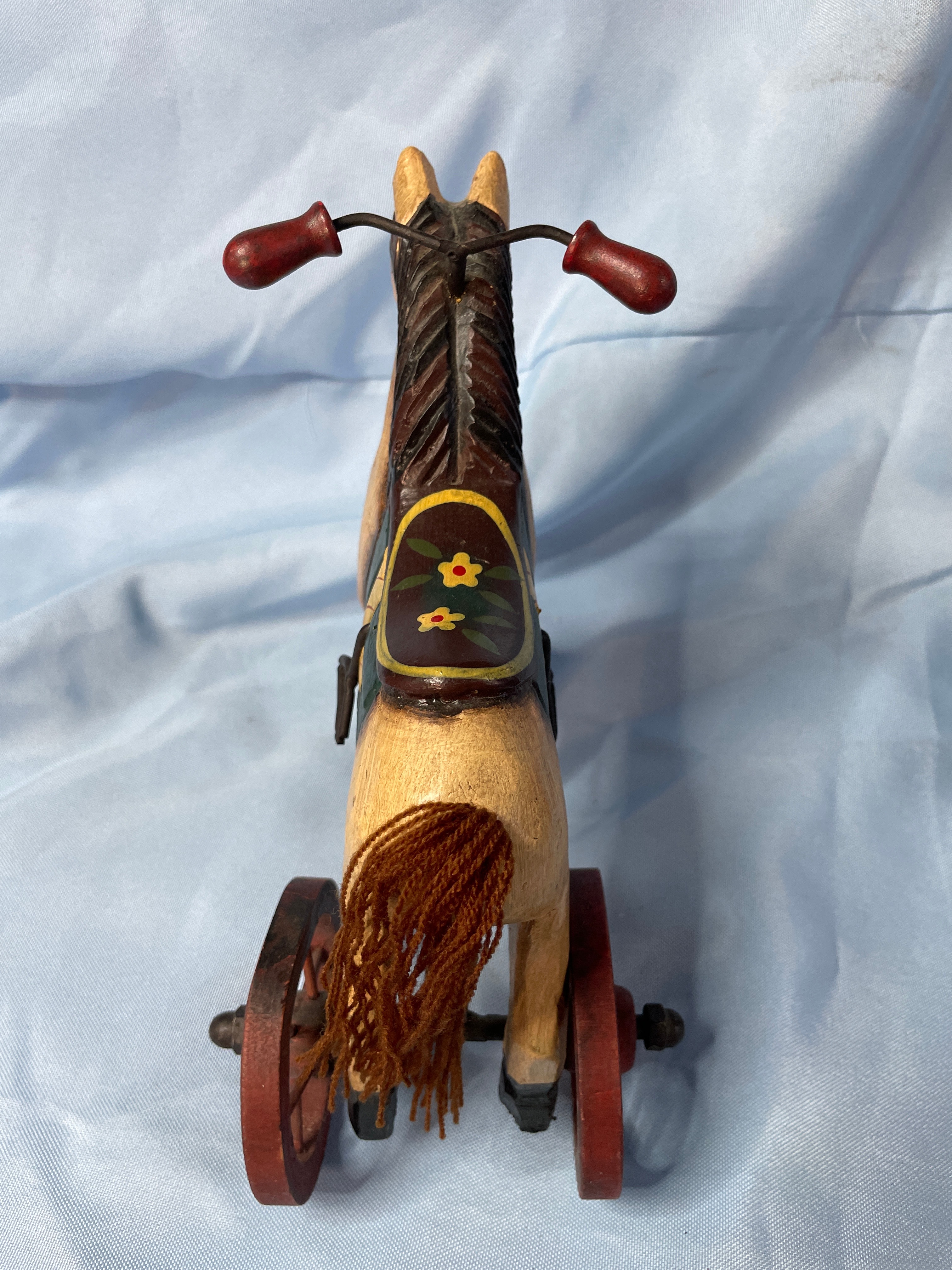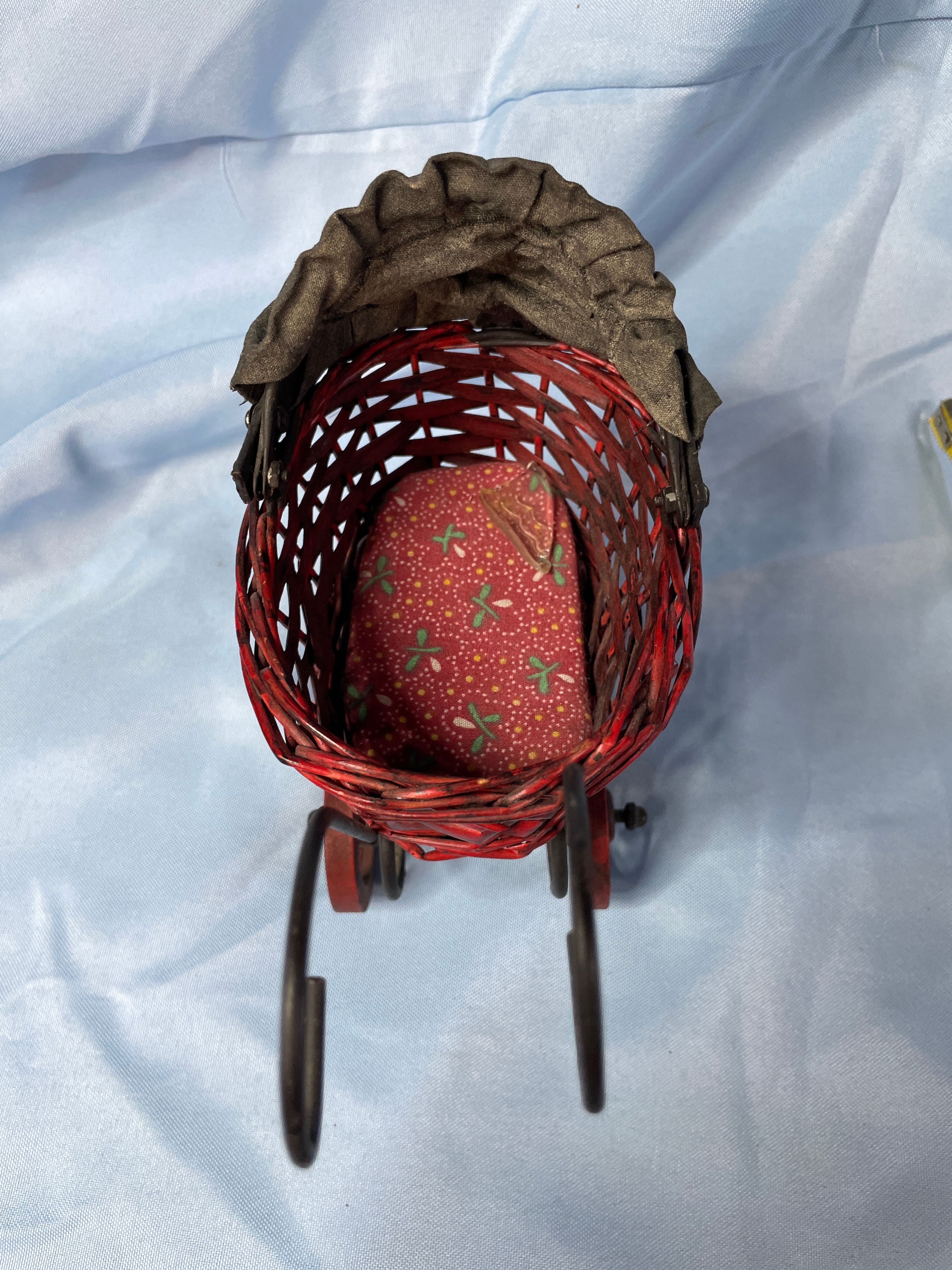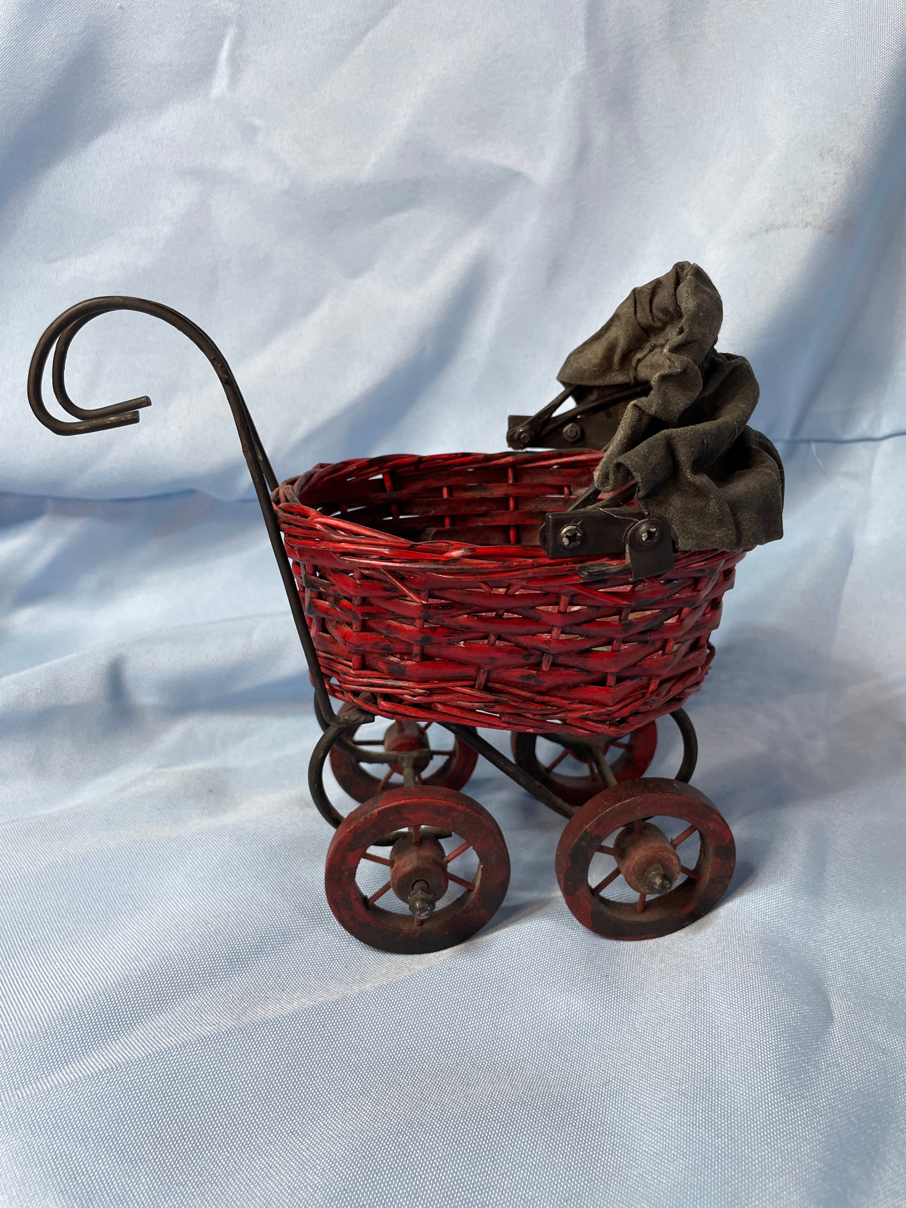 A light brown carved wooden horse on red wheels with a green and yellow saddle decorated with small painted yellow flowers (approx. 7″ L, 6.5″ H) and a miniature red wicker baby carriage with a dark grey hood and red wheels (approx. 6″ L, 7.5″ H).