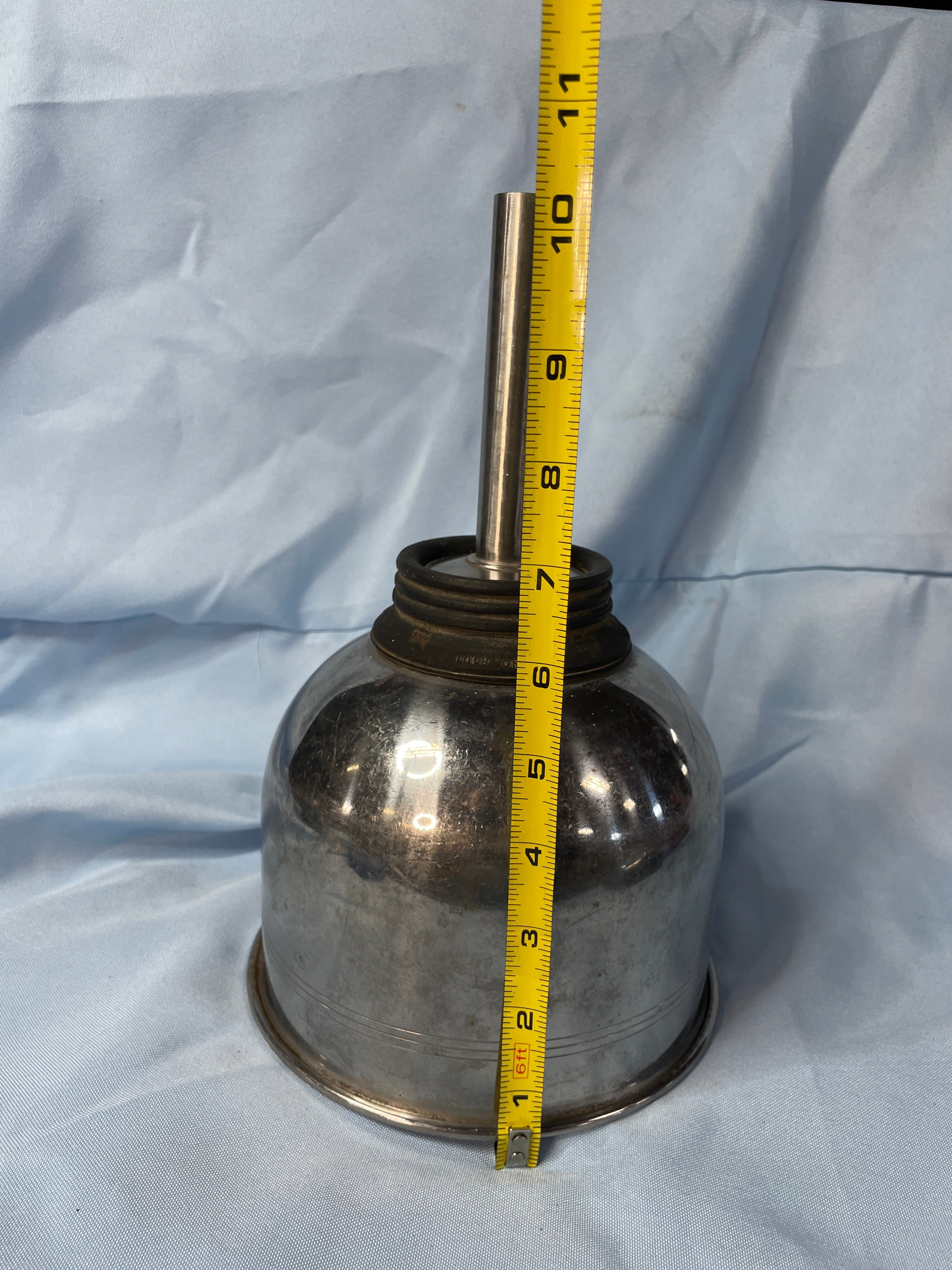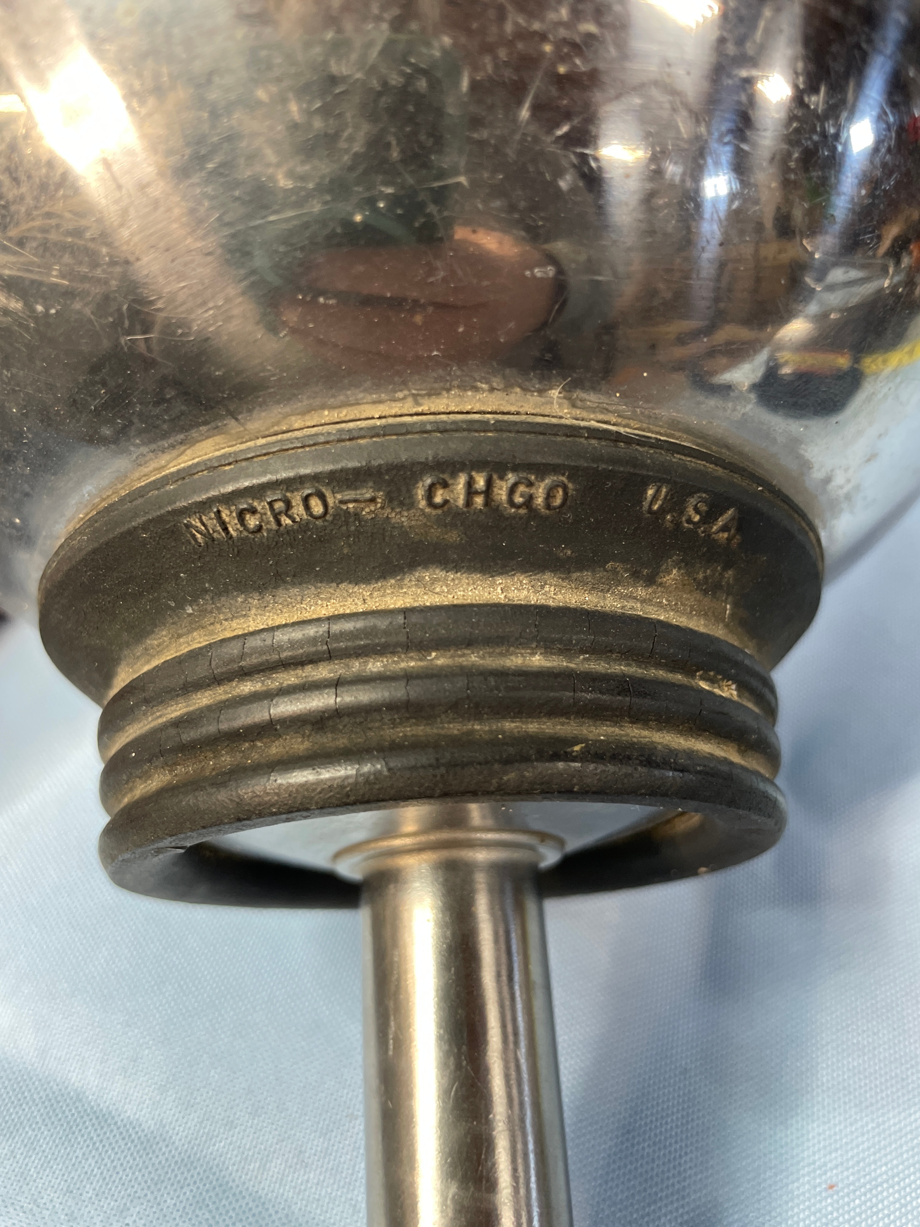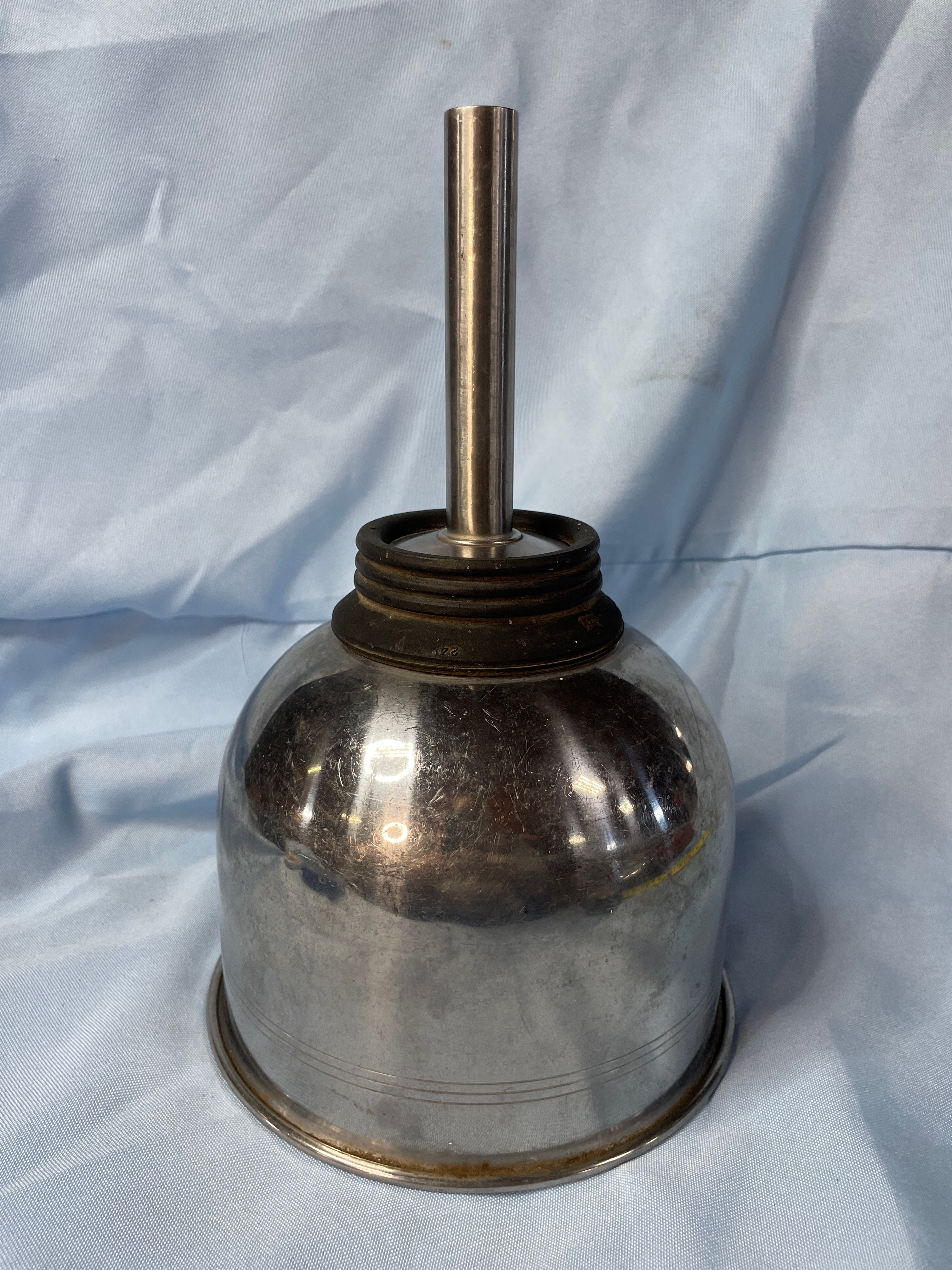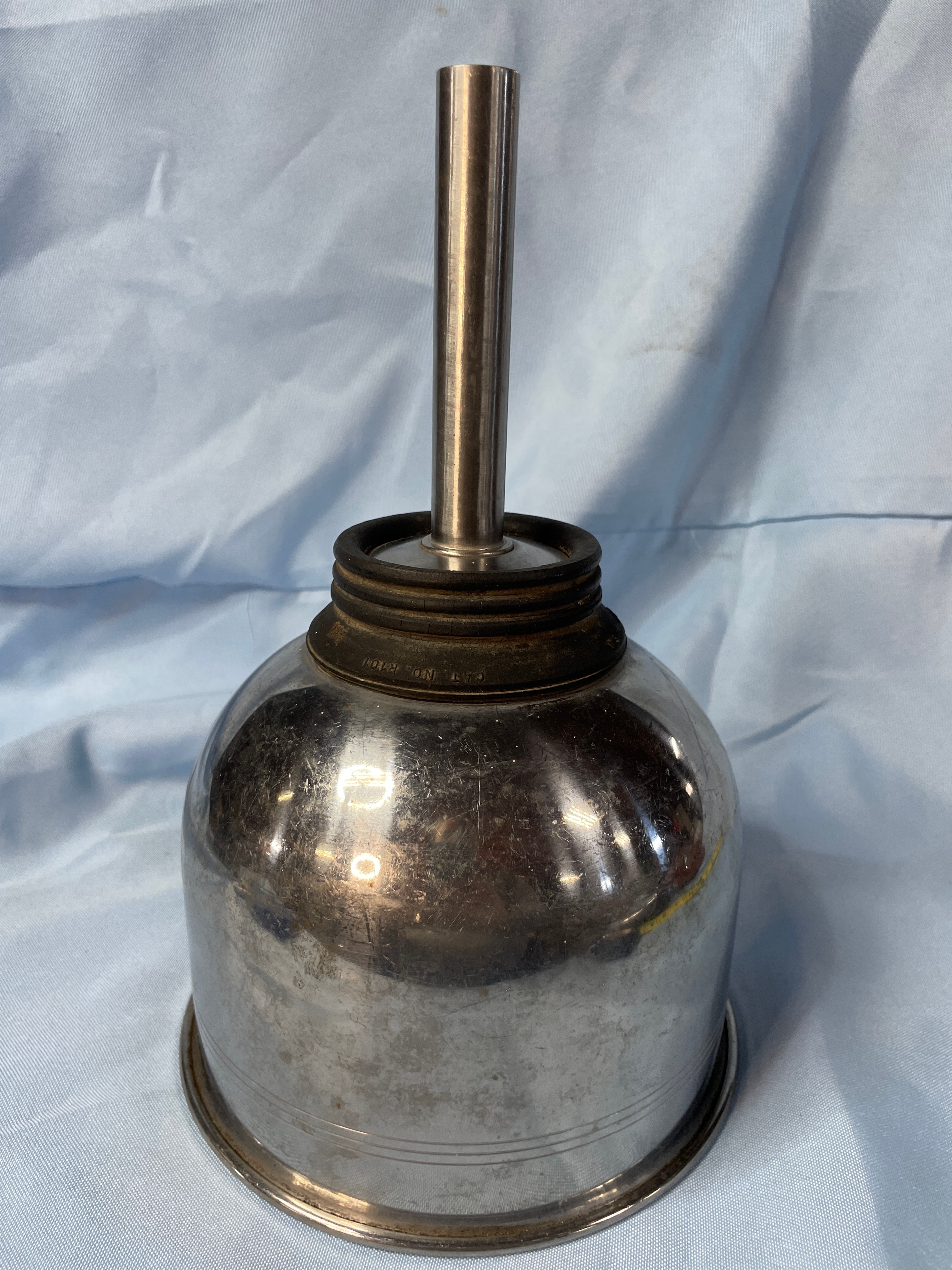 A silver metallic funnel with a black rubber base, marked ‘MICRO-CHGO U.S.A.’, ‘CAT. NO. R101′, and ’24’, measuring approximately 10 inches tall.