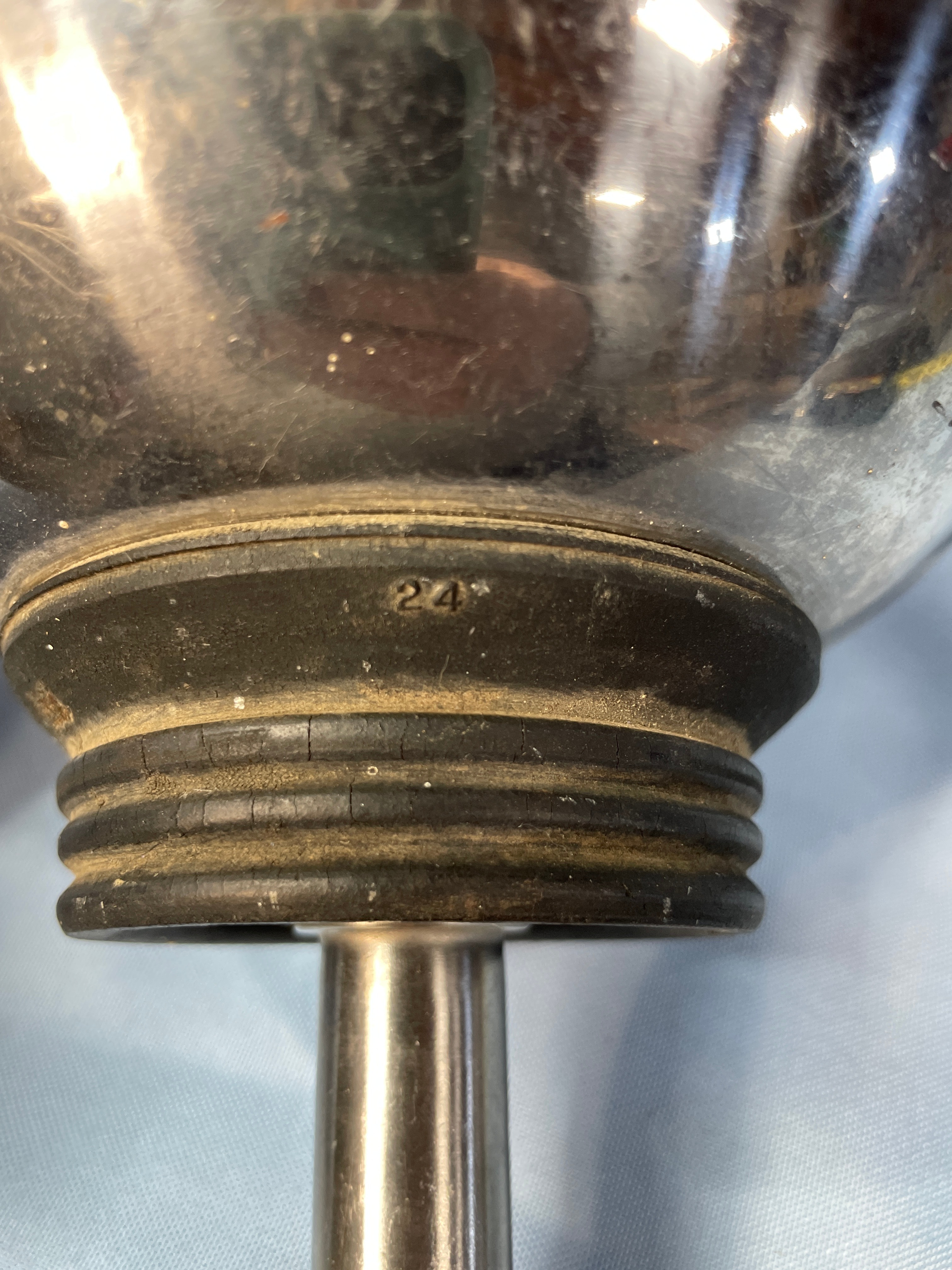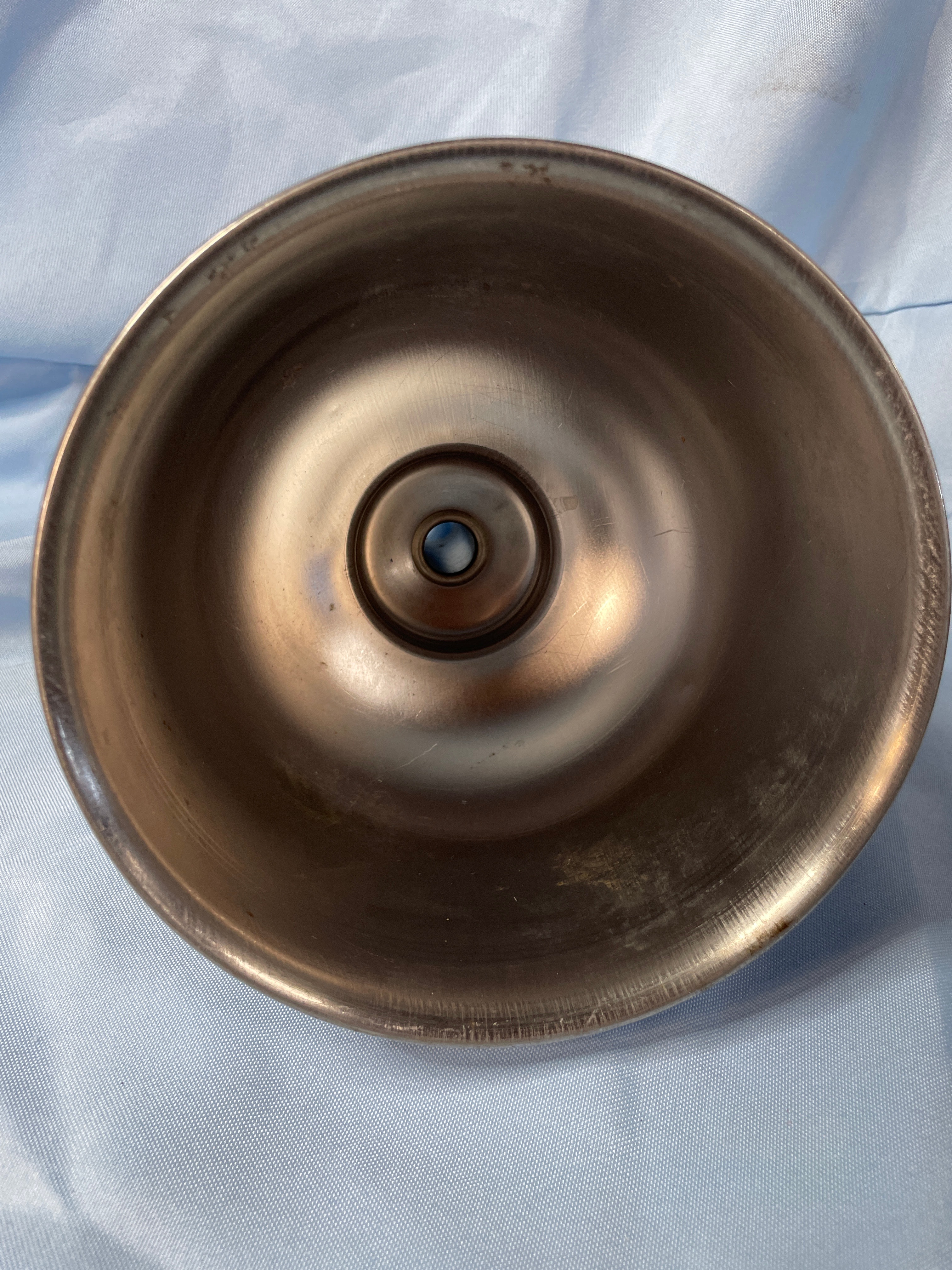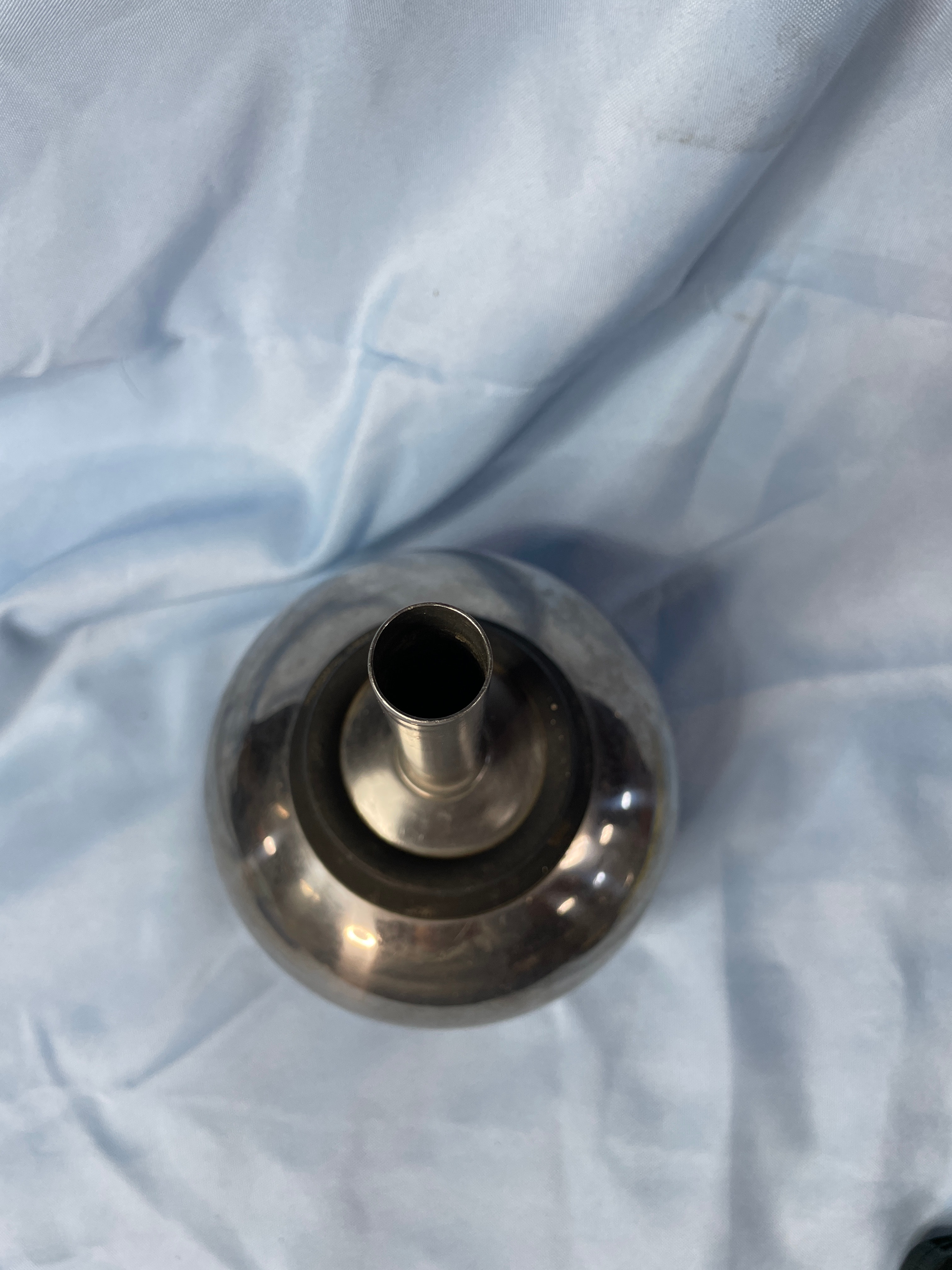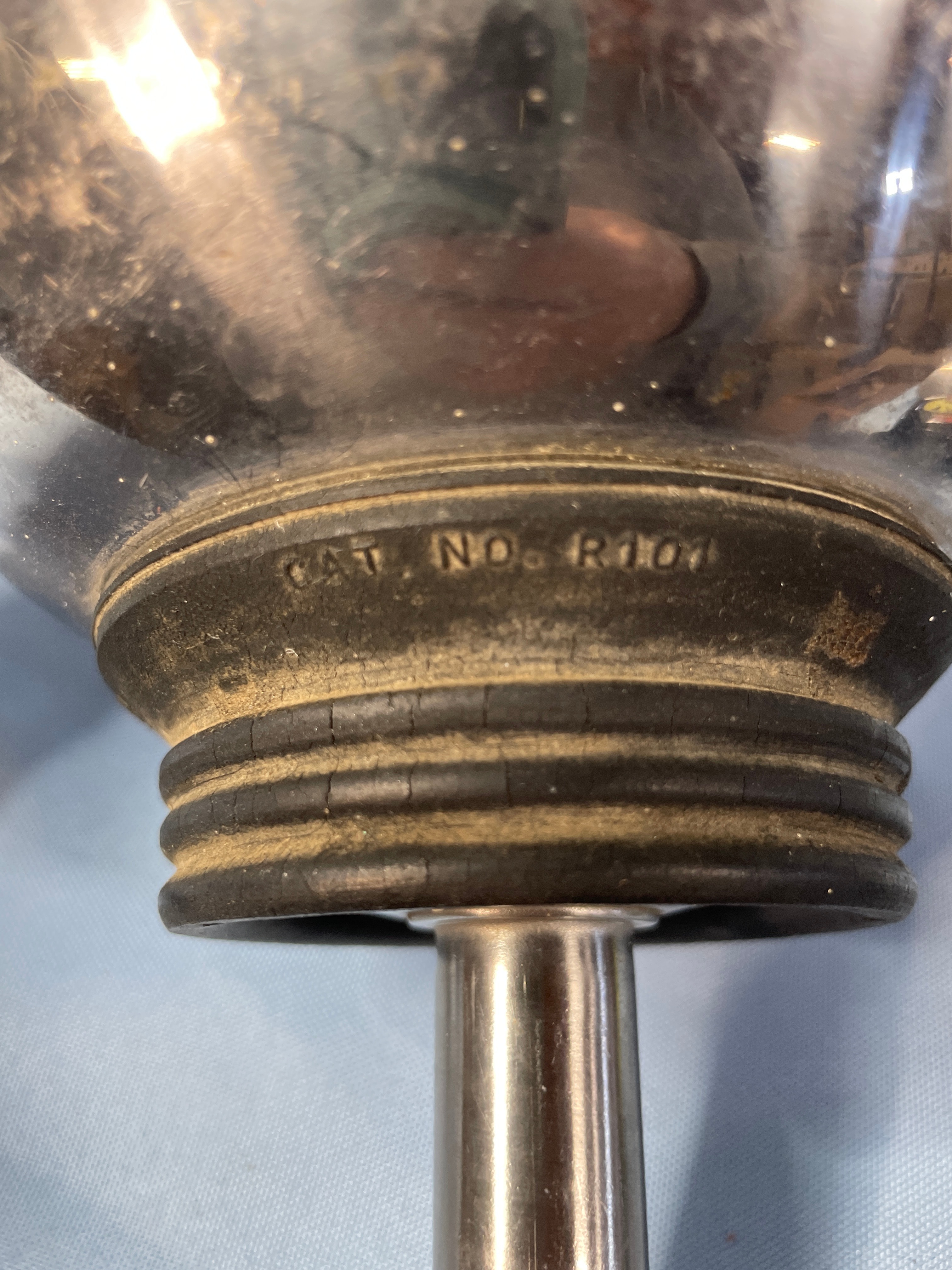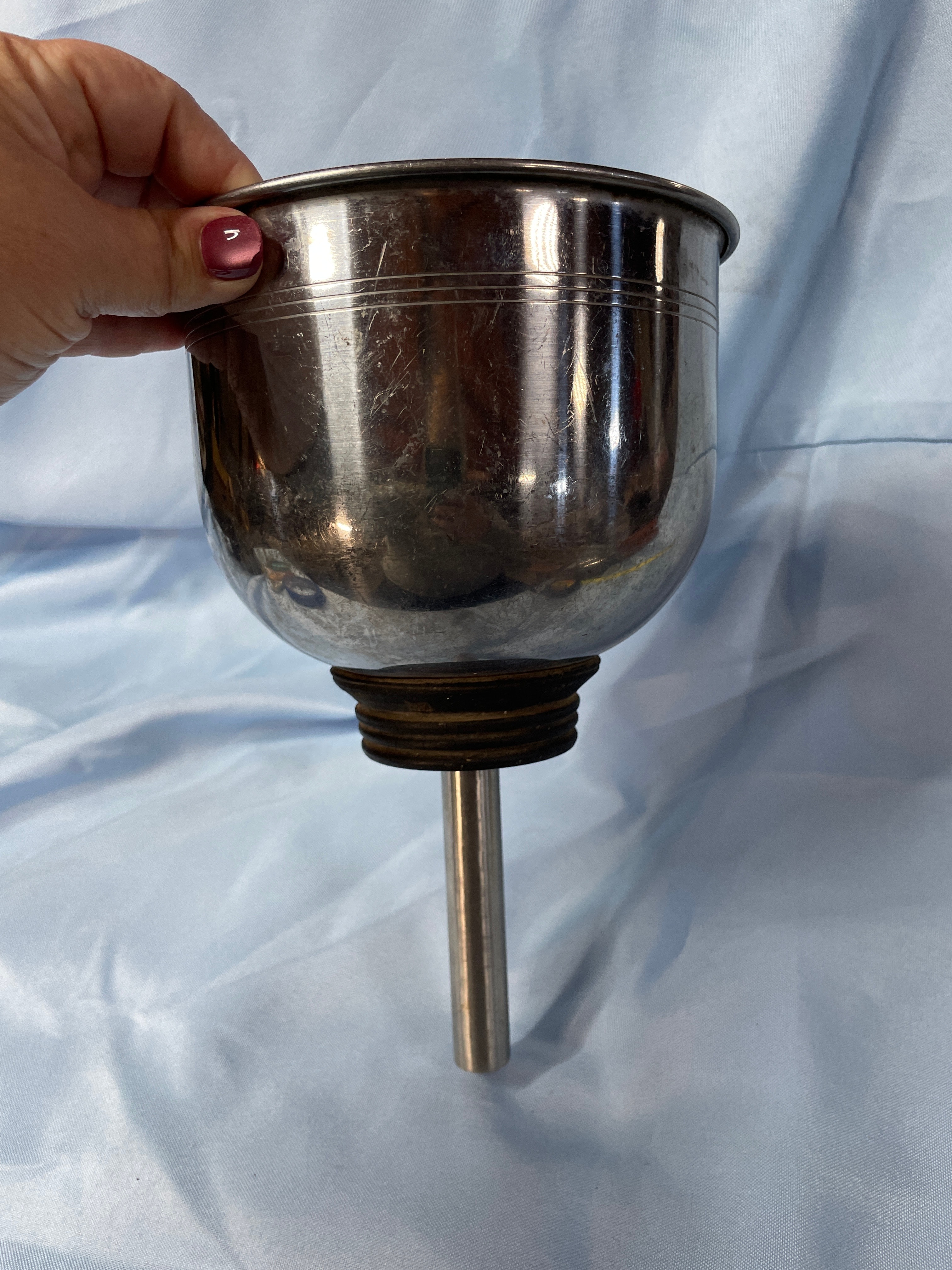 A silver metallic funnel with a black rubber base, marked ‘MICRO-CHGO U.S.A.’, ‘CAT. NO. R101′, and ’24’, measuring approximately 10 inches tall.