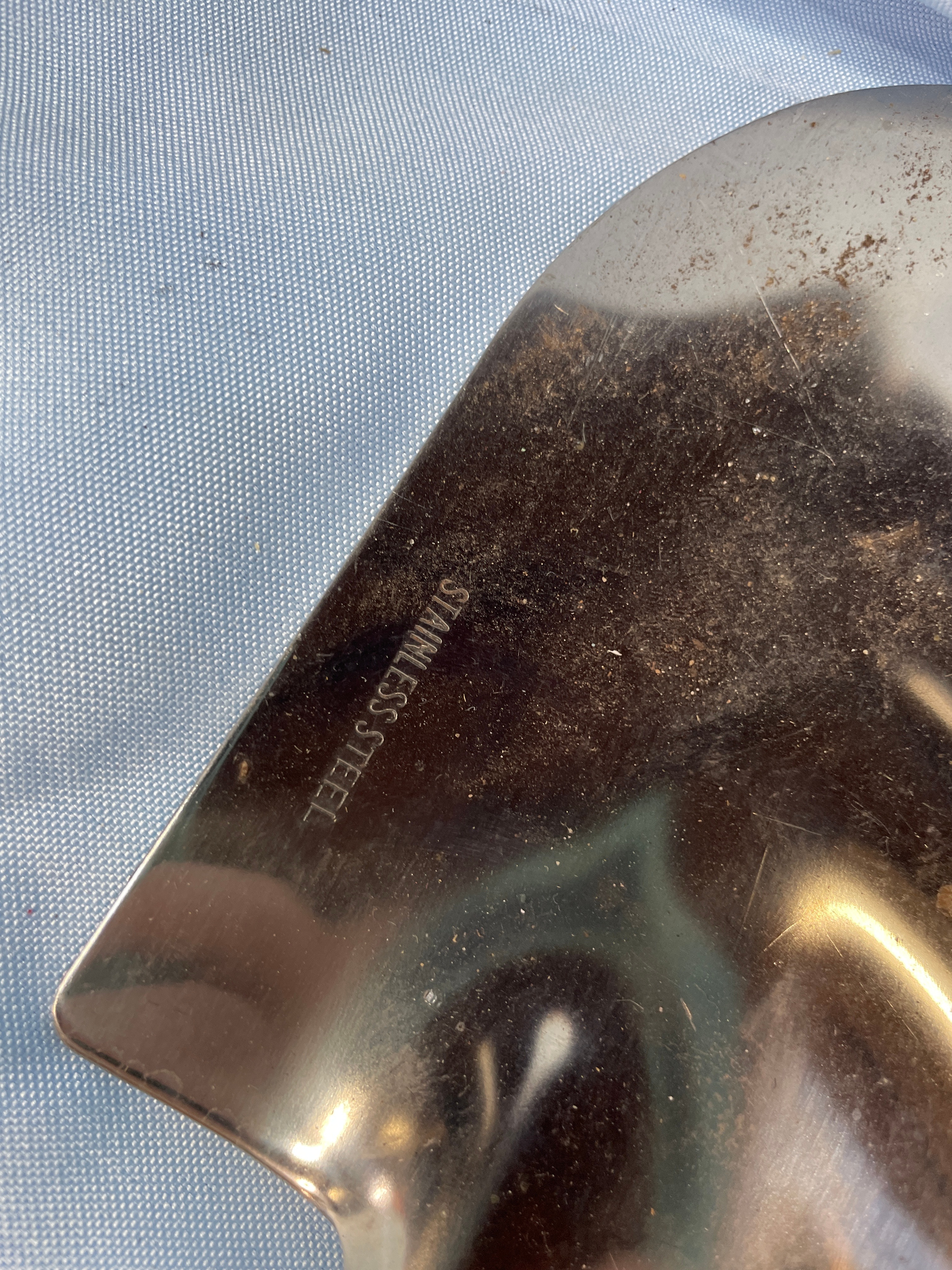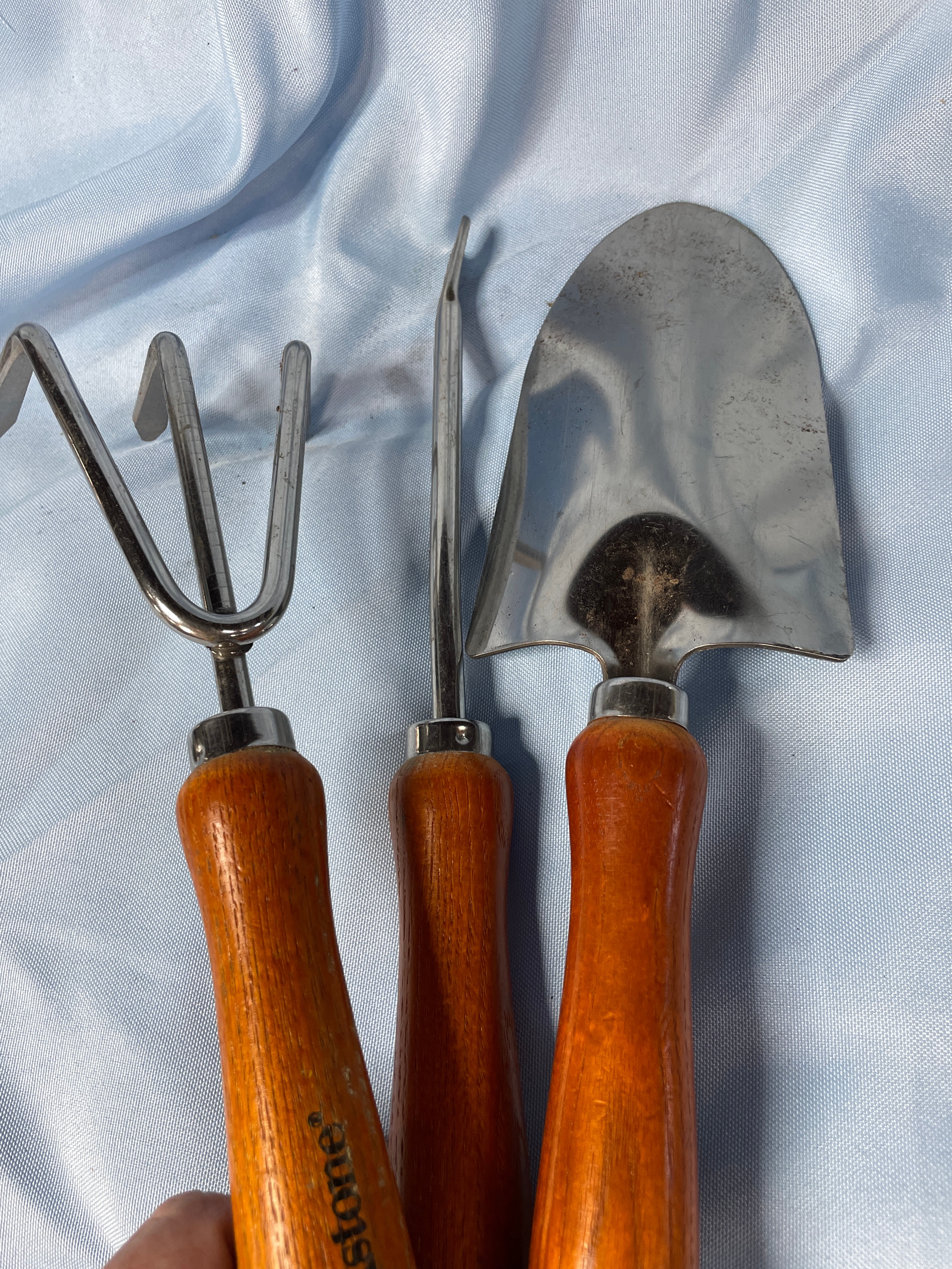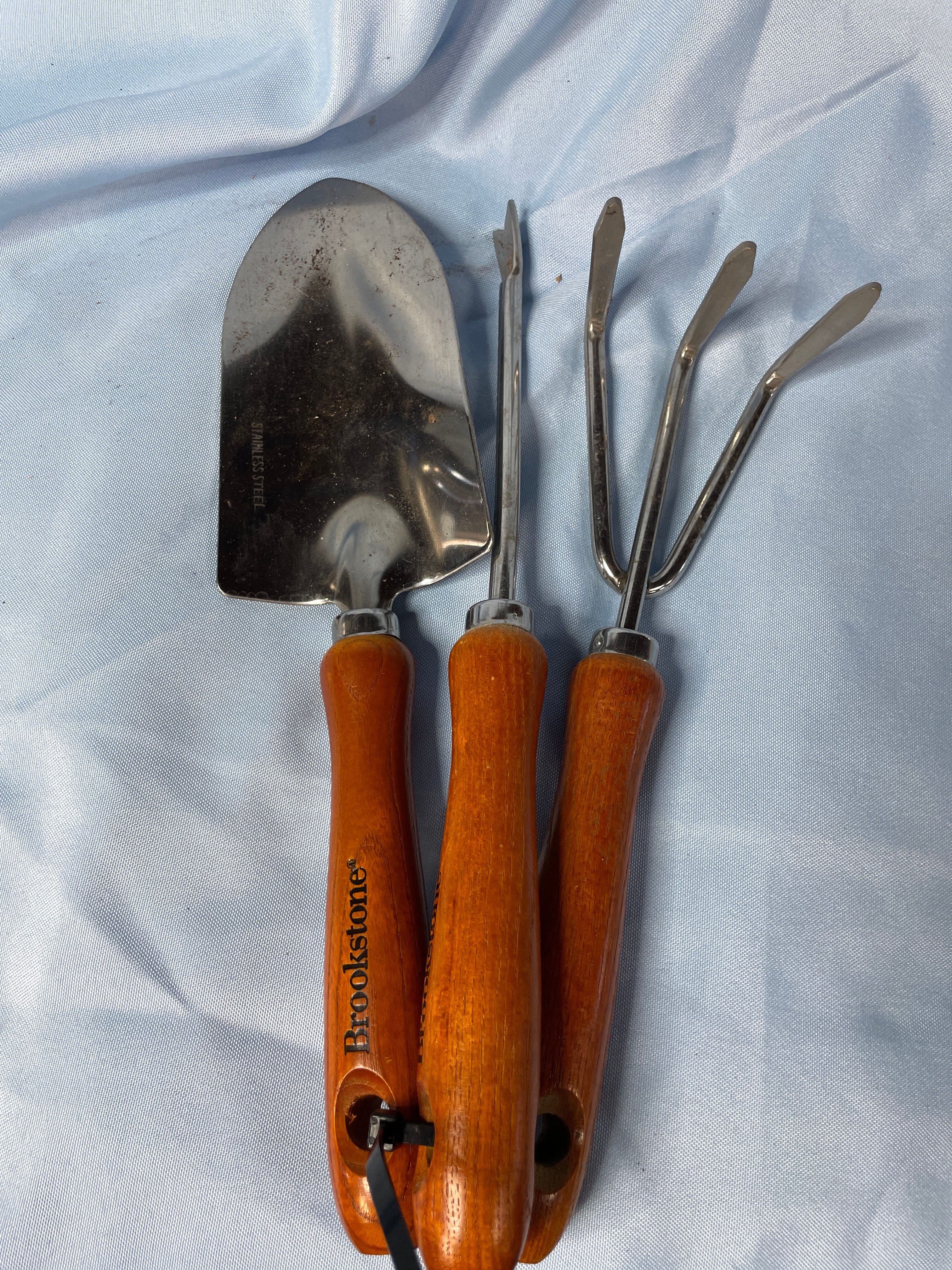 Three silver stainless steel gardening tools, including a trowel, a weeder, and a cultivator, all featuring brown wooden handles inscribed with “Brookstone” and the trowel blade marked “STAINLESS STEEL”.