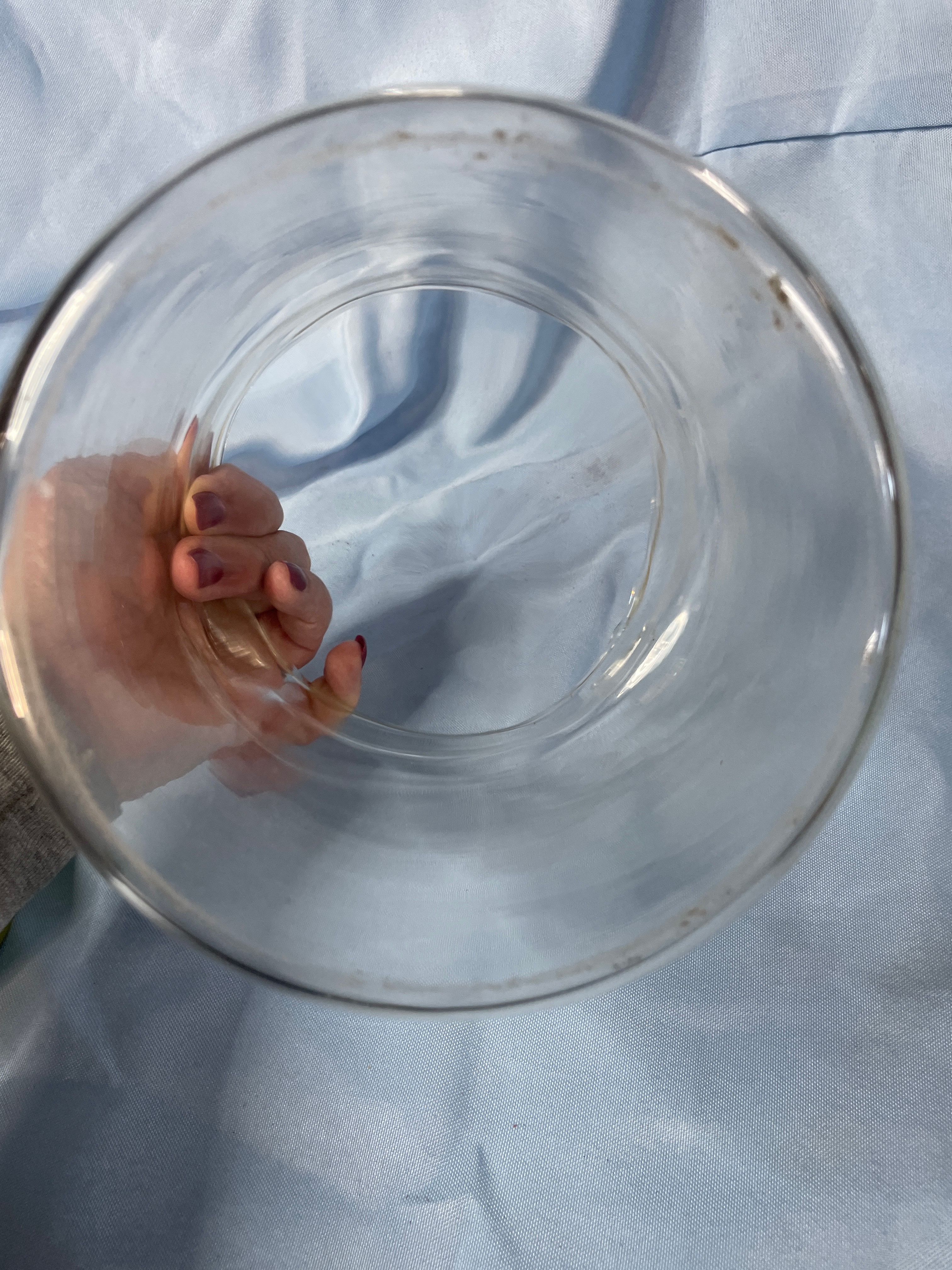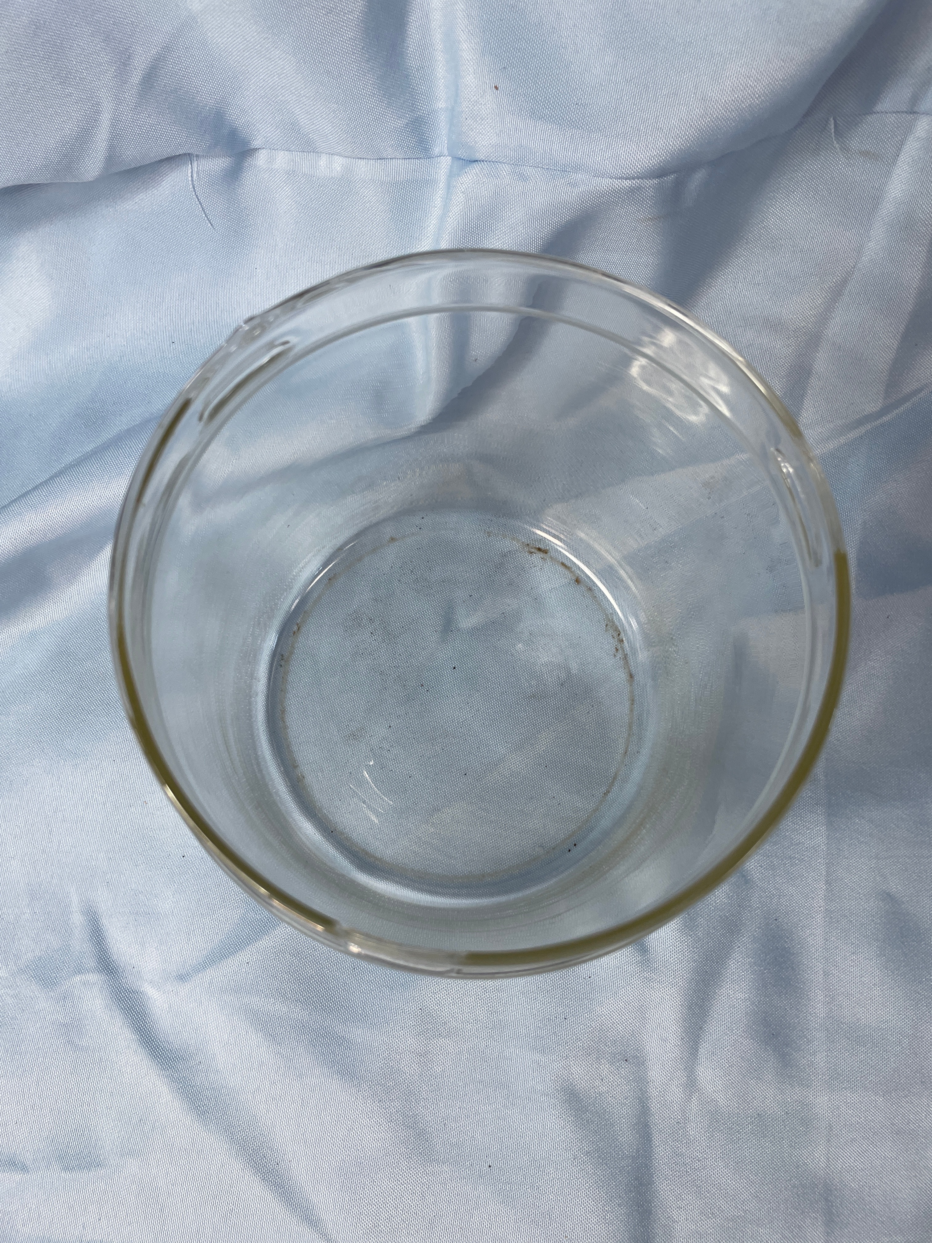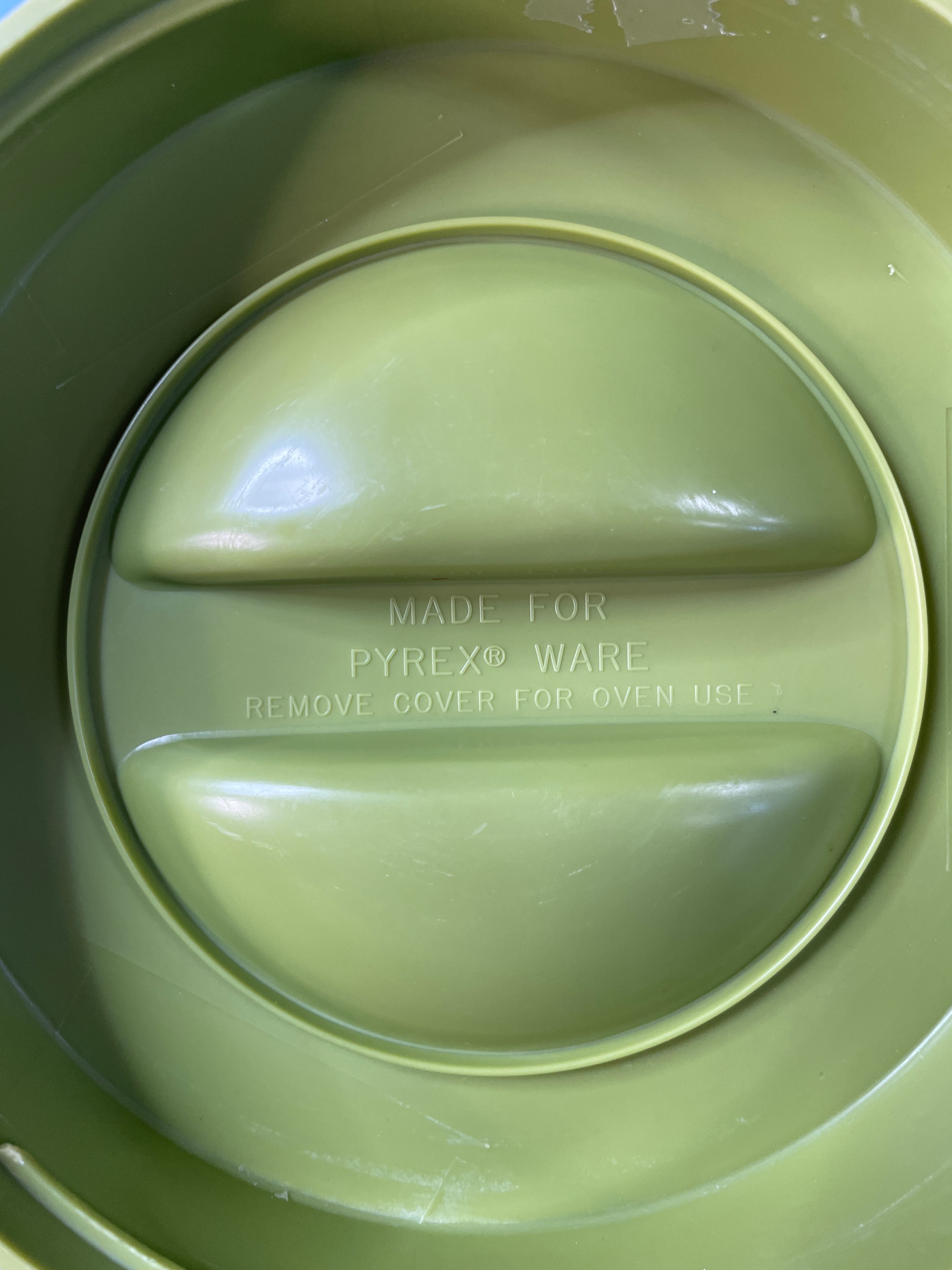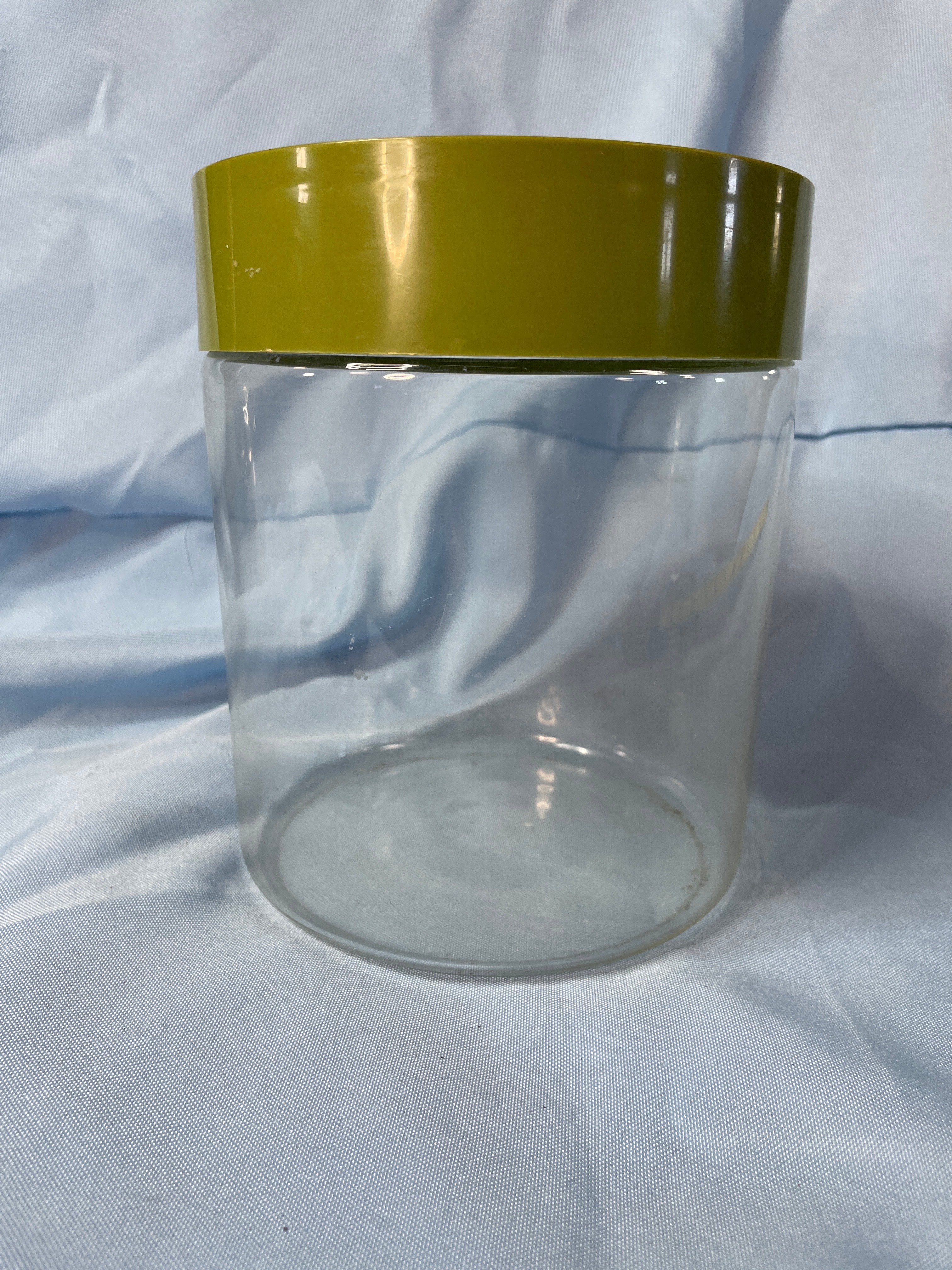 A clear glass Pyrex Ware canister with an olive green plastic lid, approximately 7.5 inches tall, inscribed “MADE FOR PYREX® WARE” on the inside.