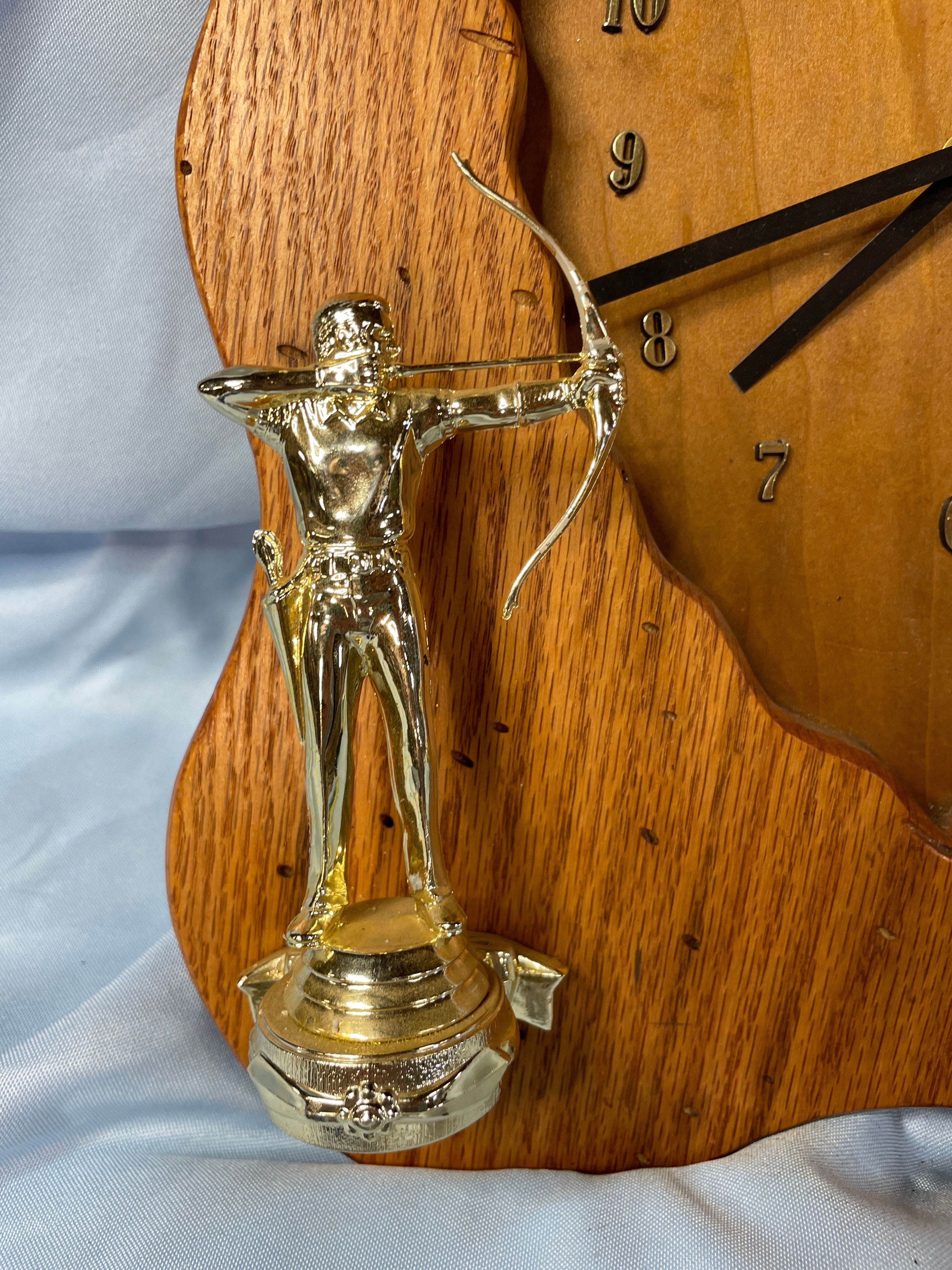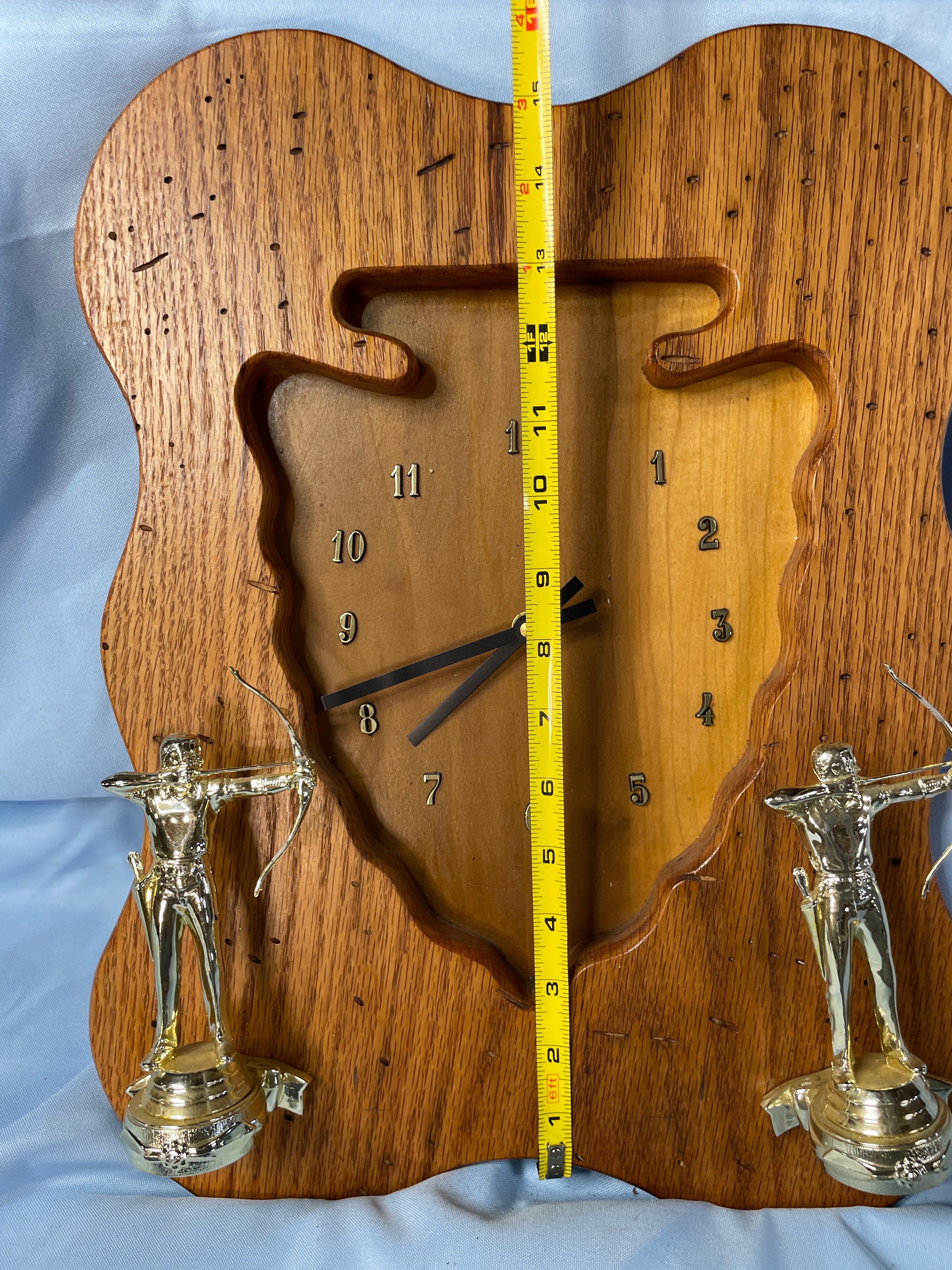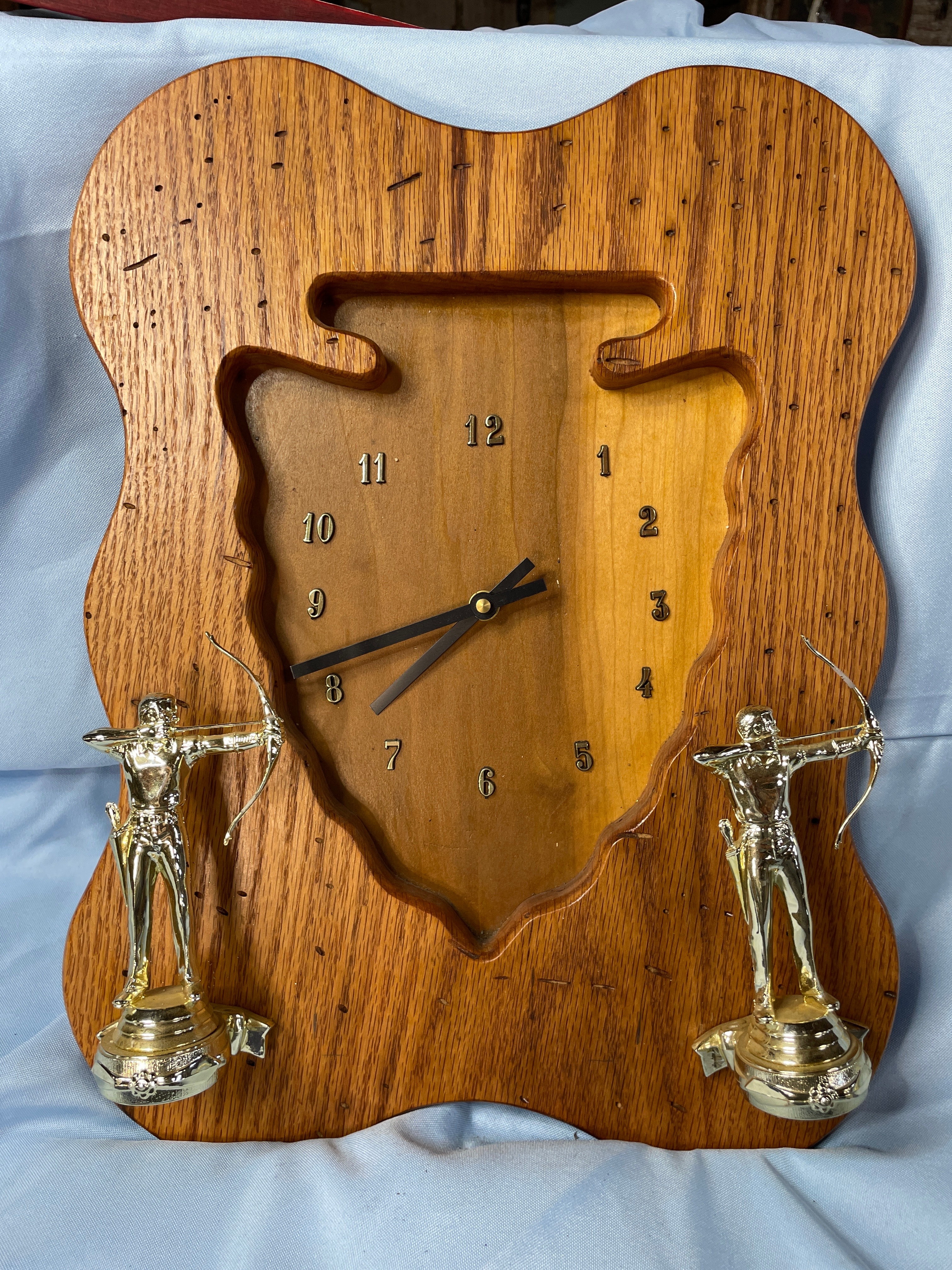 A wooden wall clock, approximately 13.5 inches tall, shaped like an arrowhead with a wavy frame in light and dark wood tones, featuring two golden archer trophies and a TAZANI MADE IN USA Quartz movement.