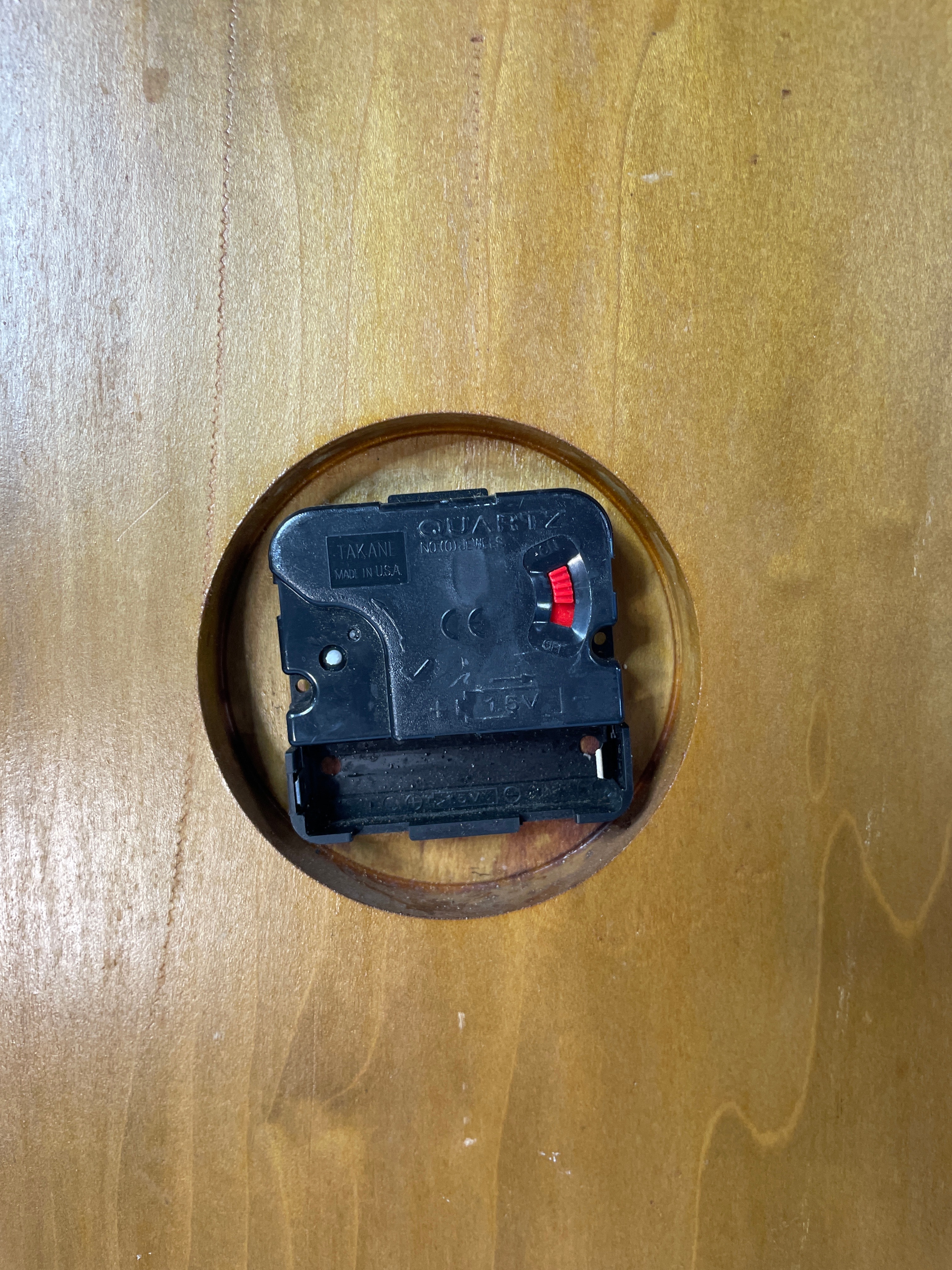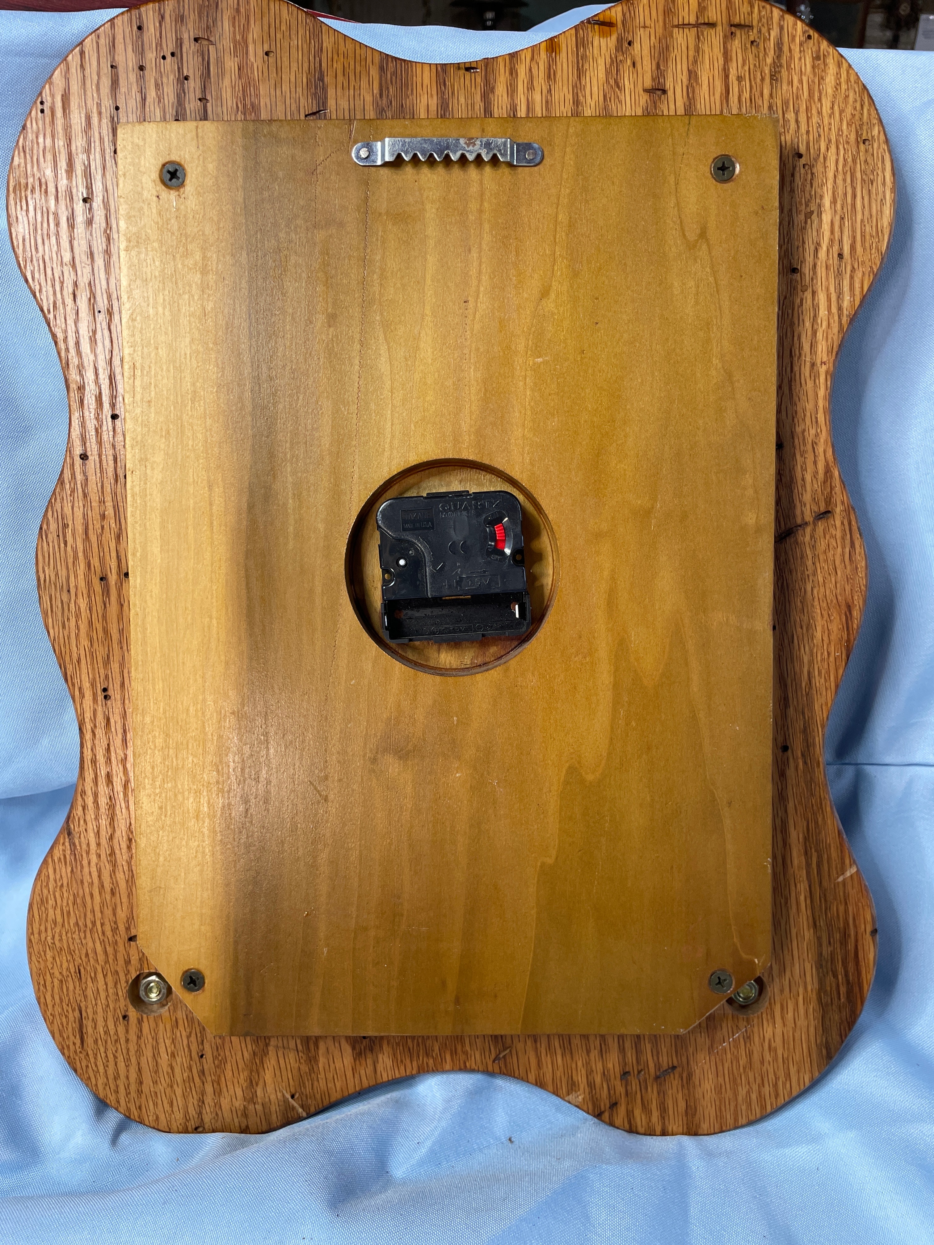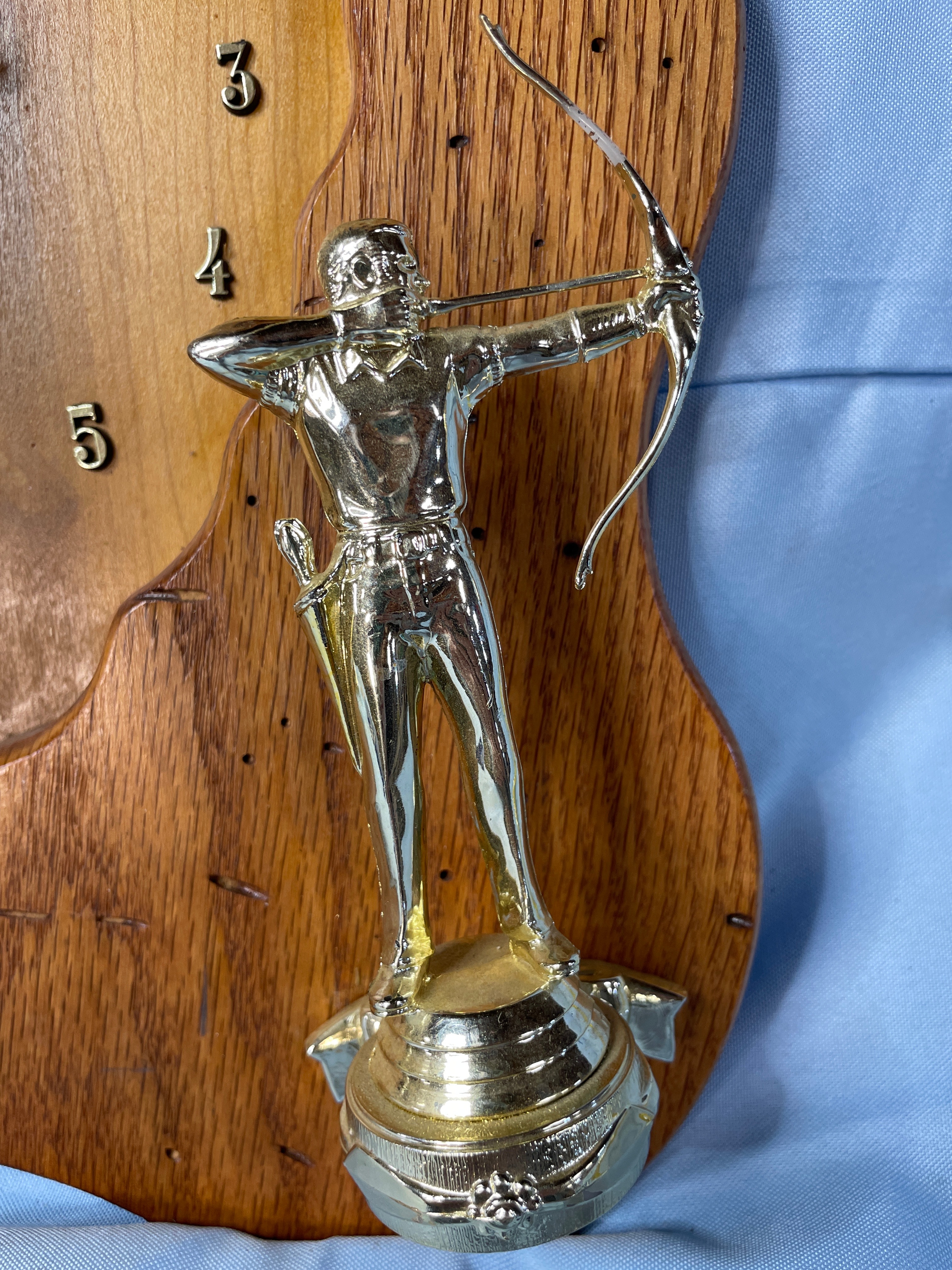 A wooden wall clock, approximately 13.5 inches tall, shaped like an arrowhead with a wavy frame in light and dark wood tones, featuring two golden archer trophies and a TAZANI MADE IN USA Quartz movement.