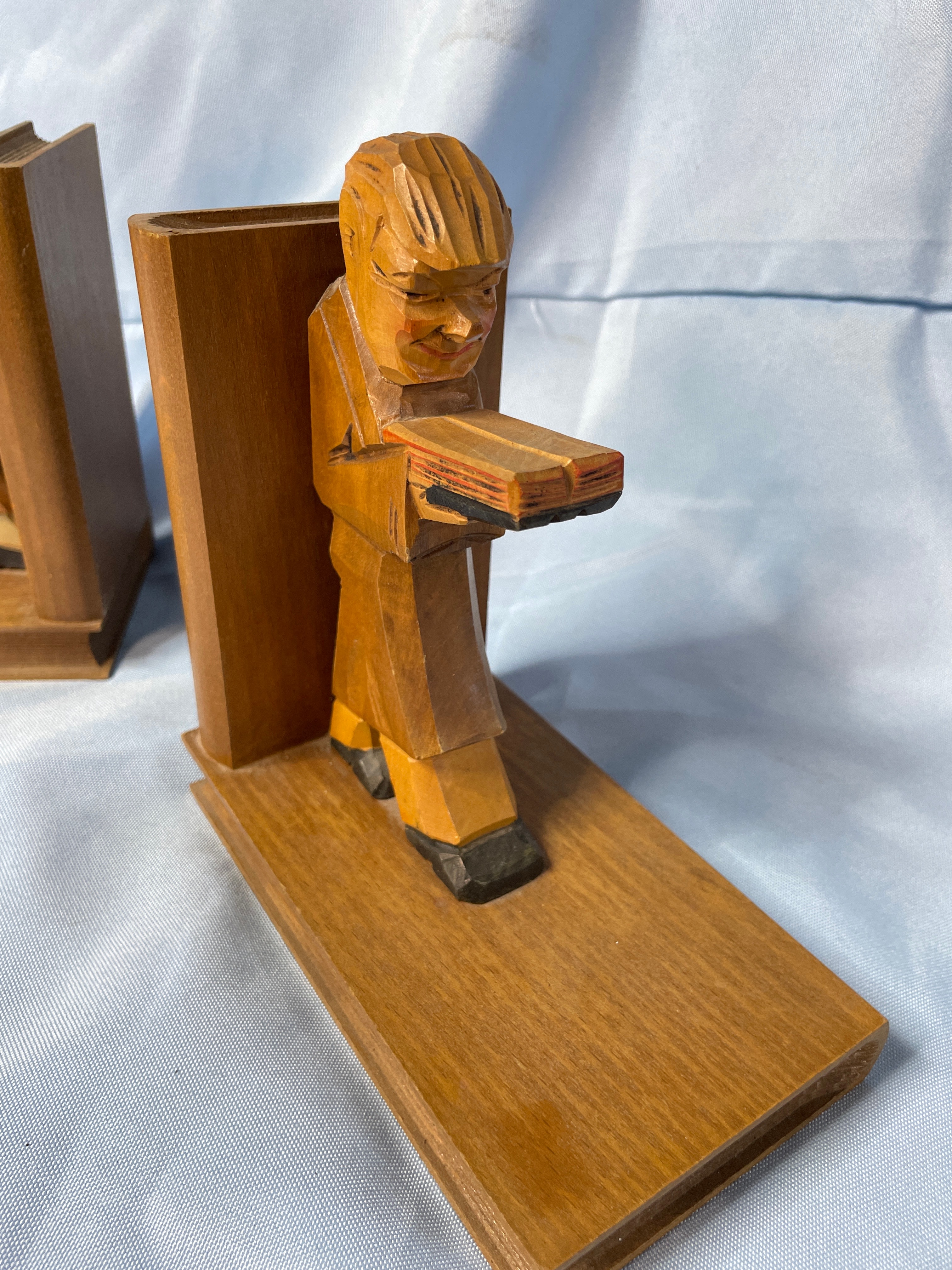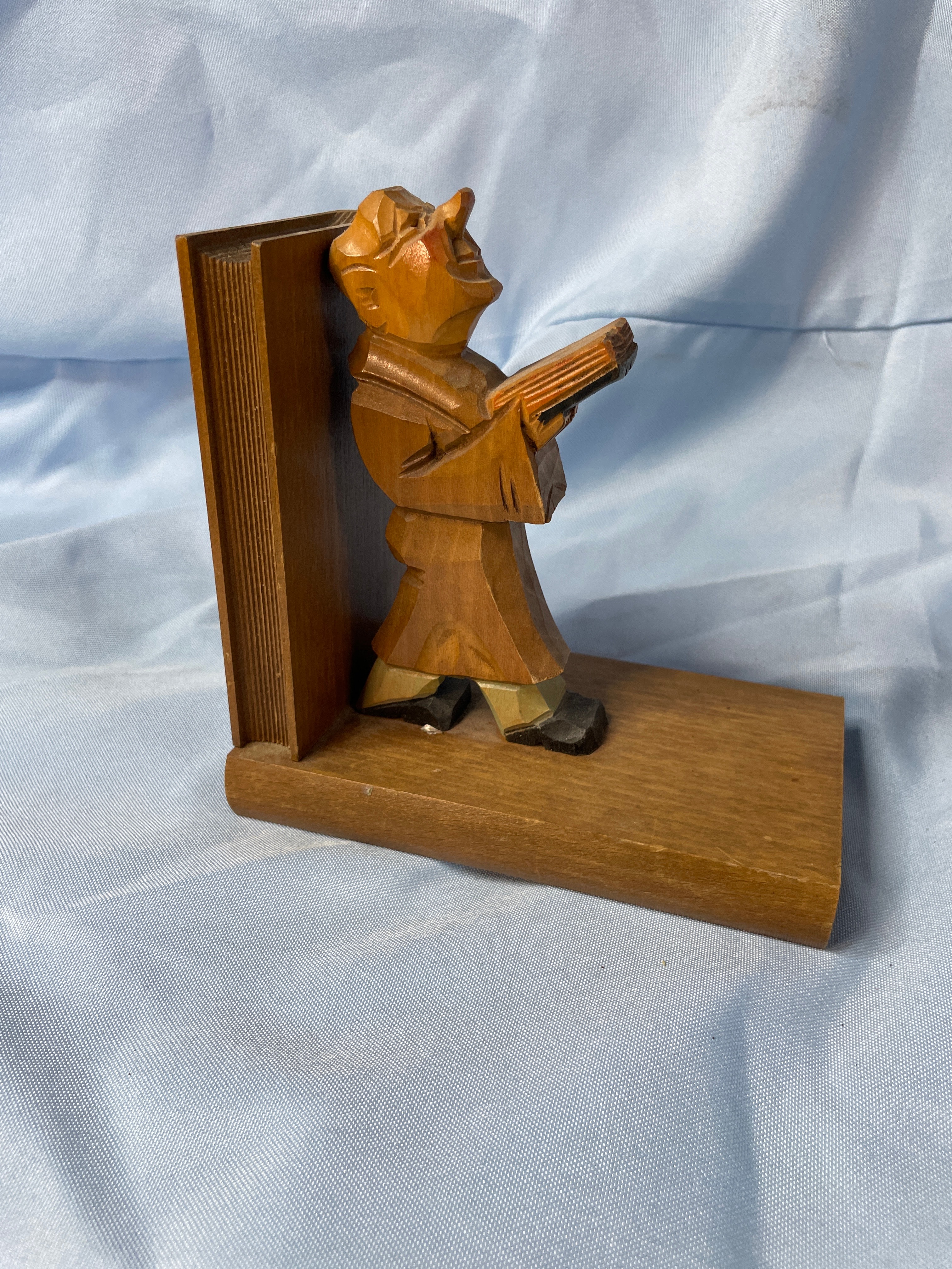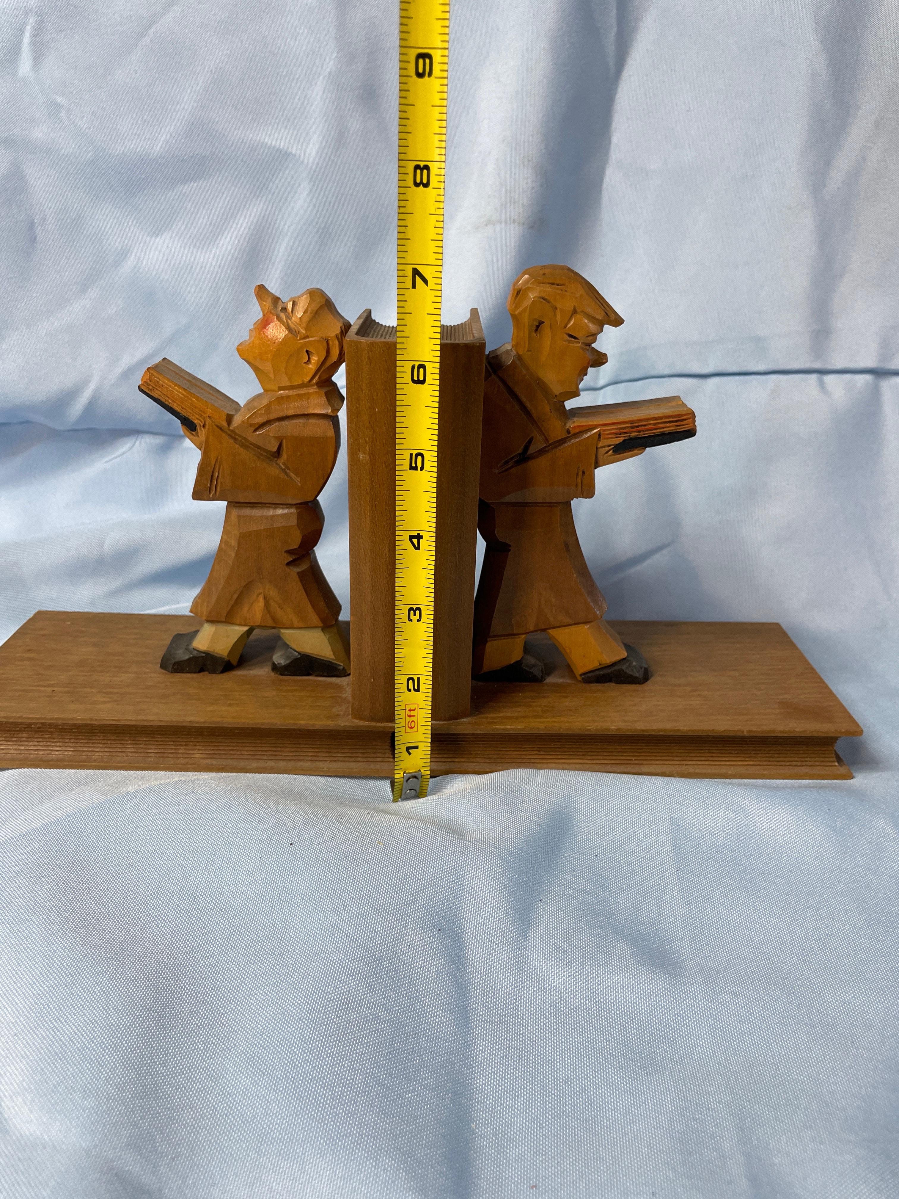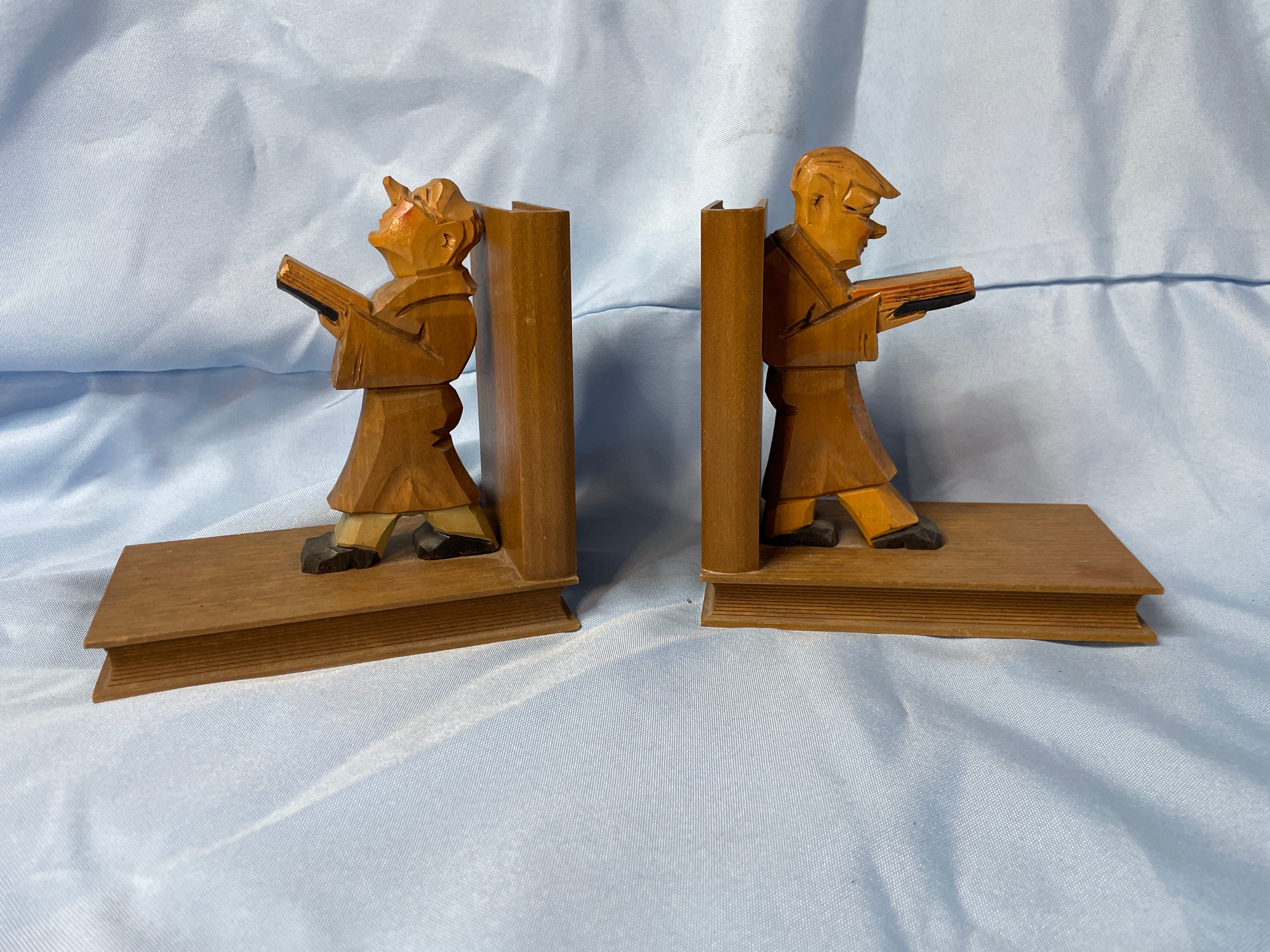 A pair of carved wooden bookends, each approximately 7 inches tall, featuring a brown-robed figure (likely a monk or scholar) holding a book, with accents of black, tan, and reddish-orange on their faces and shoes.