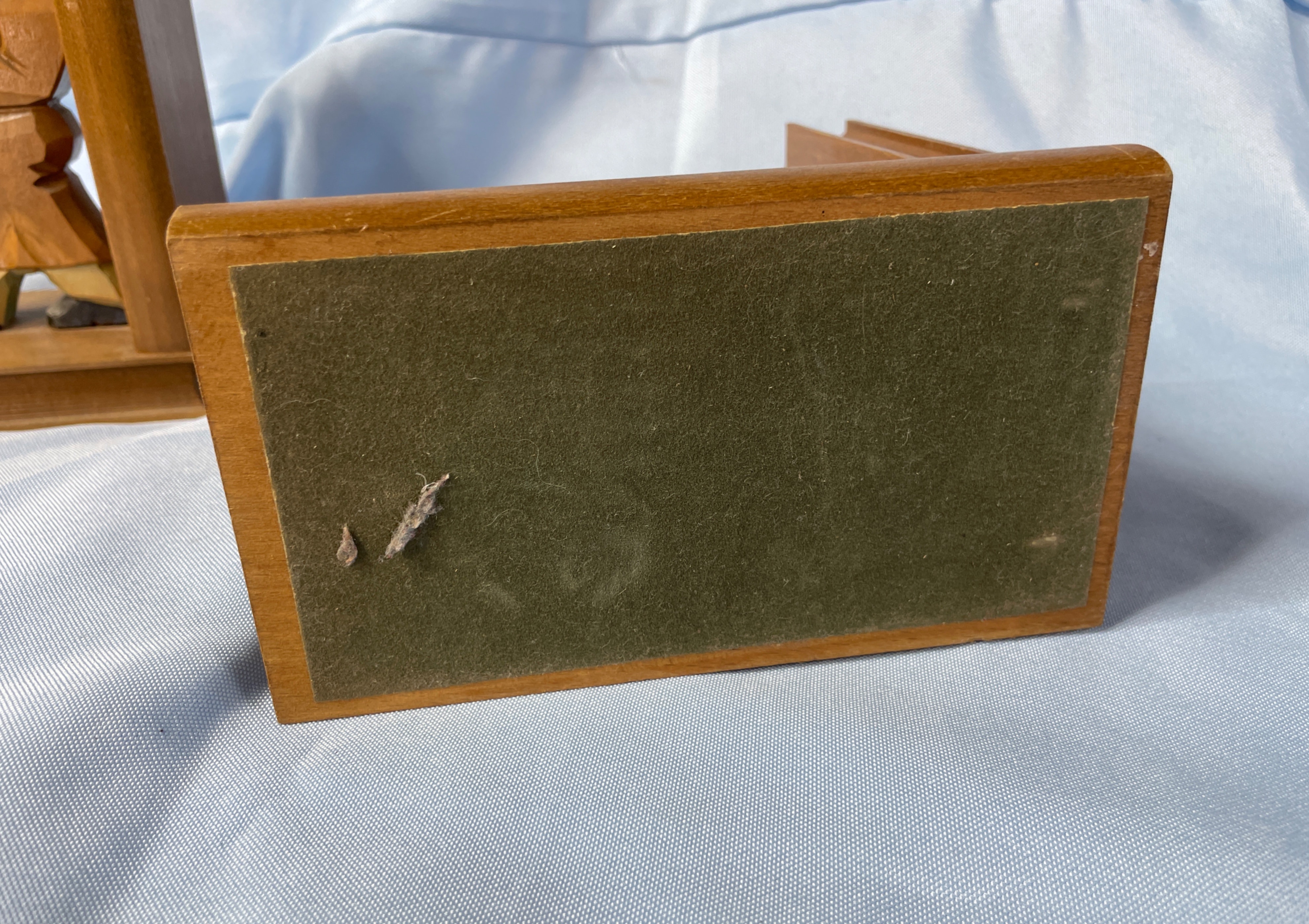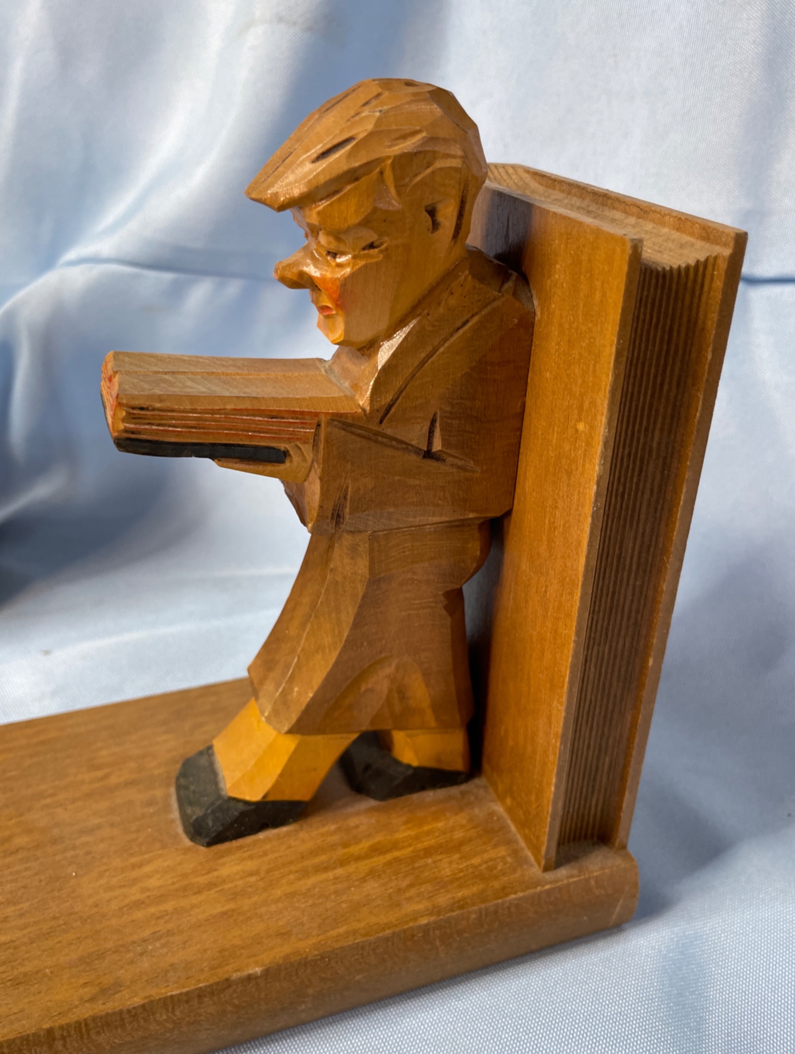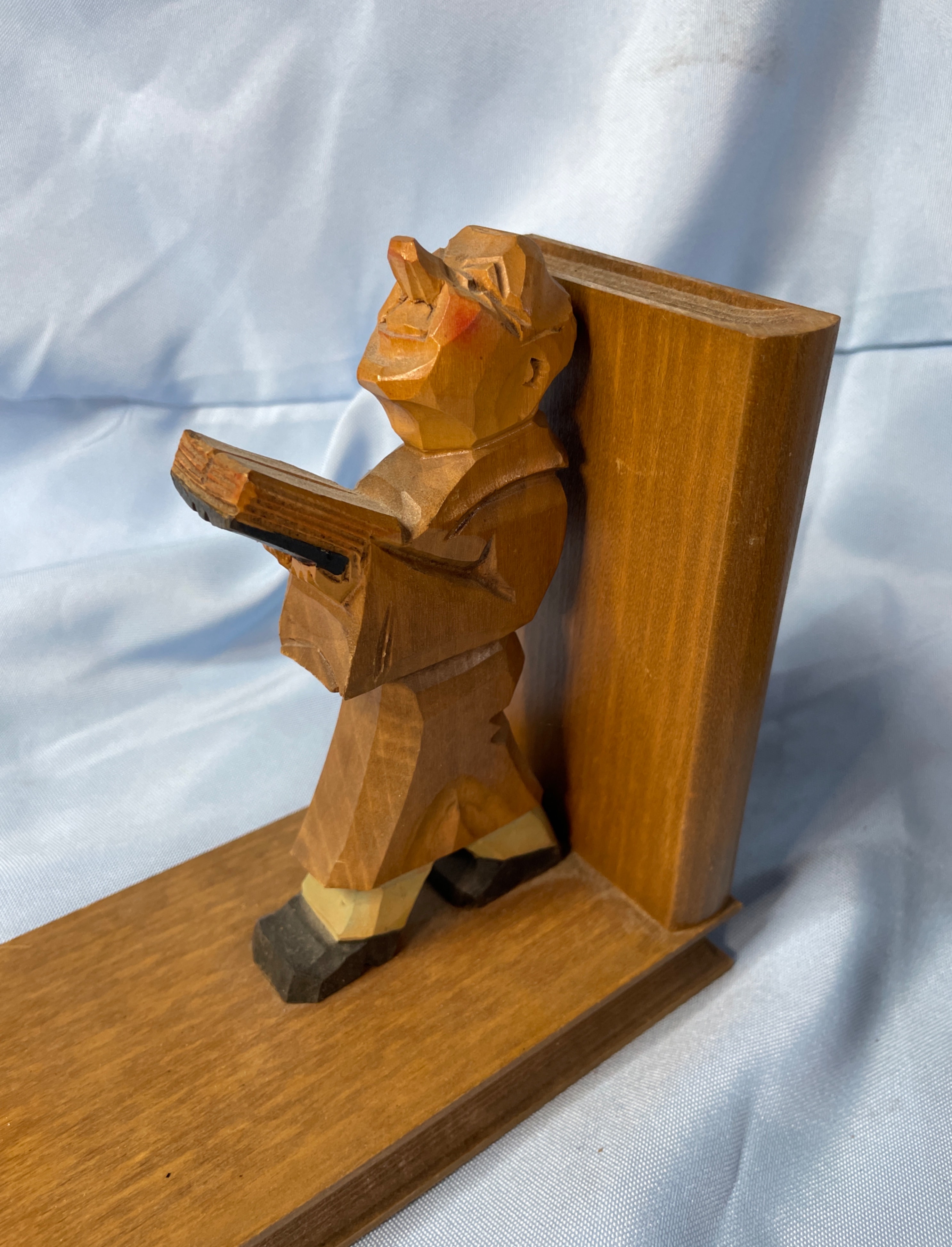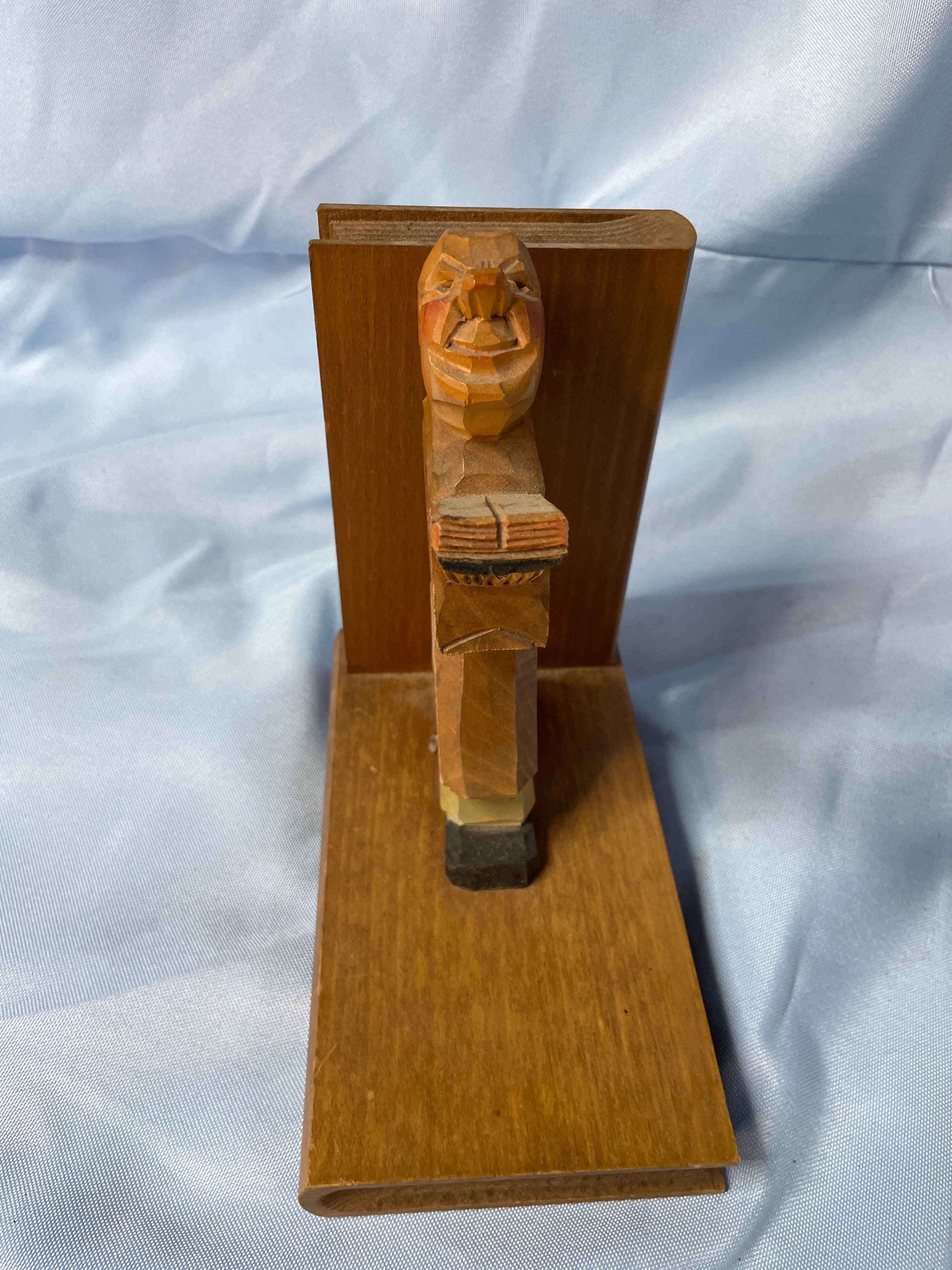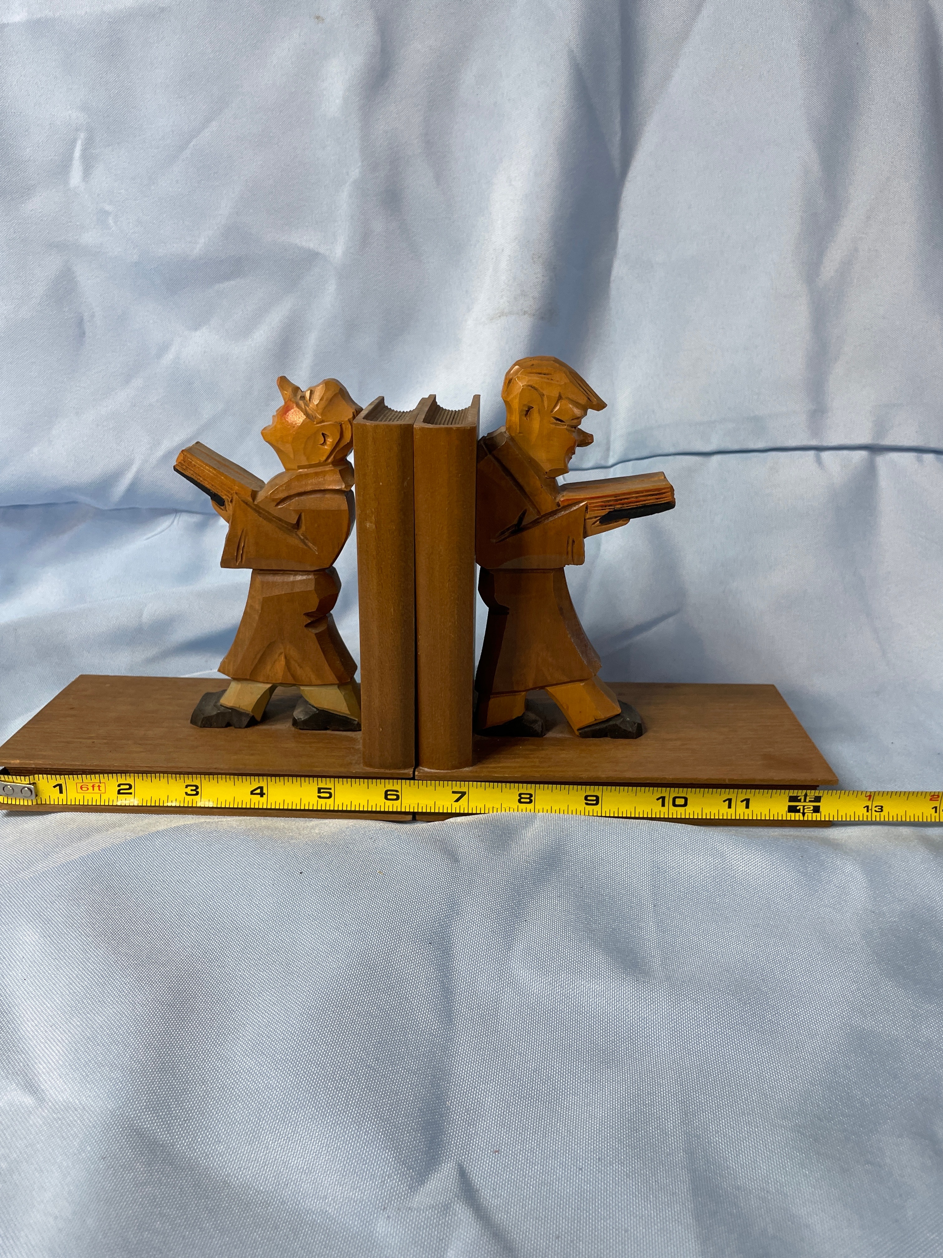 A pair of carved wooden bookends, each approximately 7 inches tall, featuring a brown-robed figure (likely a monk or scholar) holding a book, with accents of black, tan, and reddish-orange on their faces and shoes.