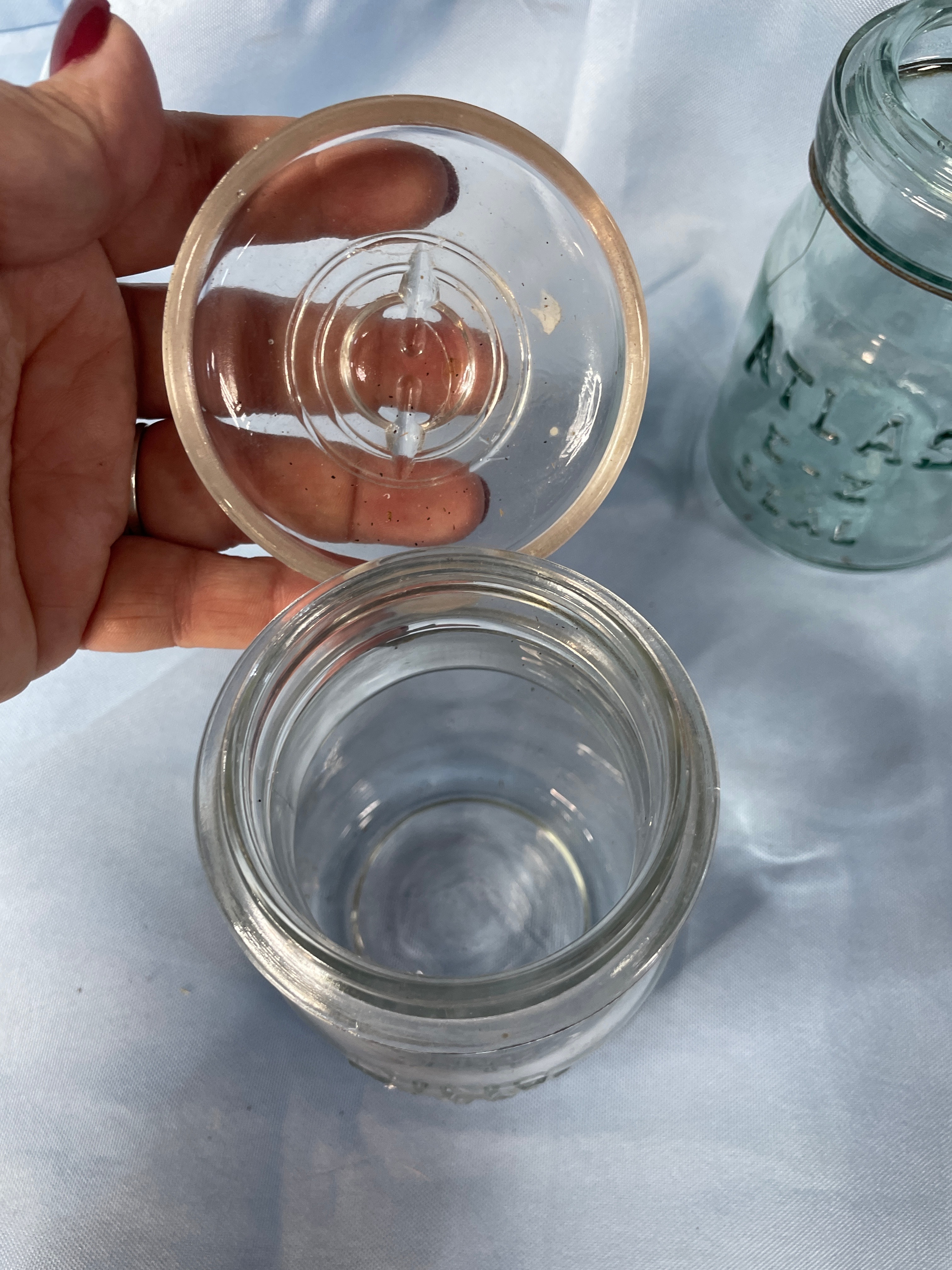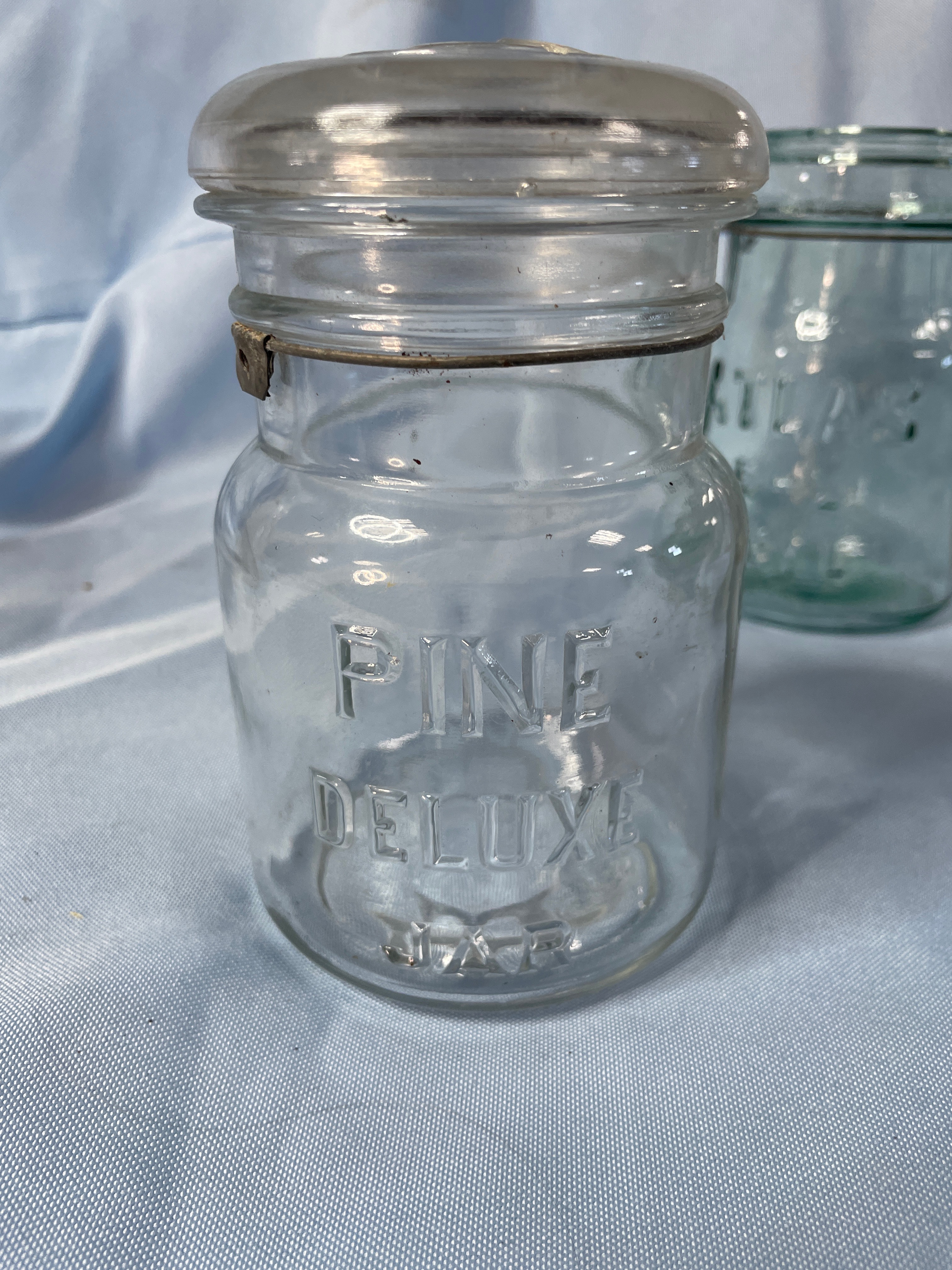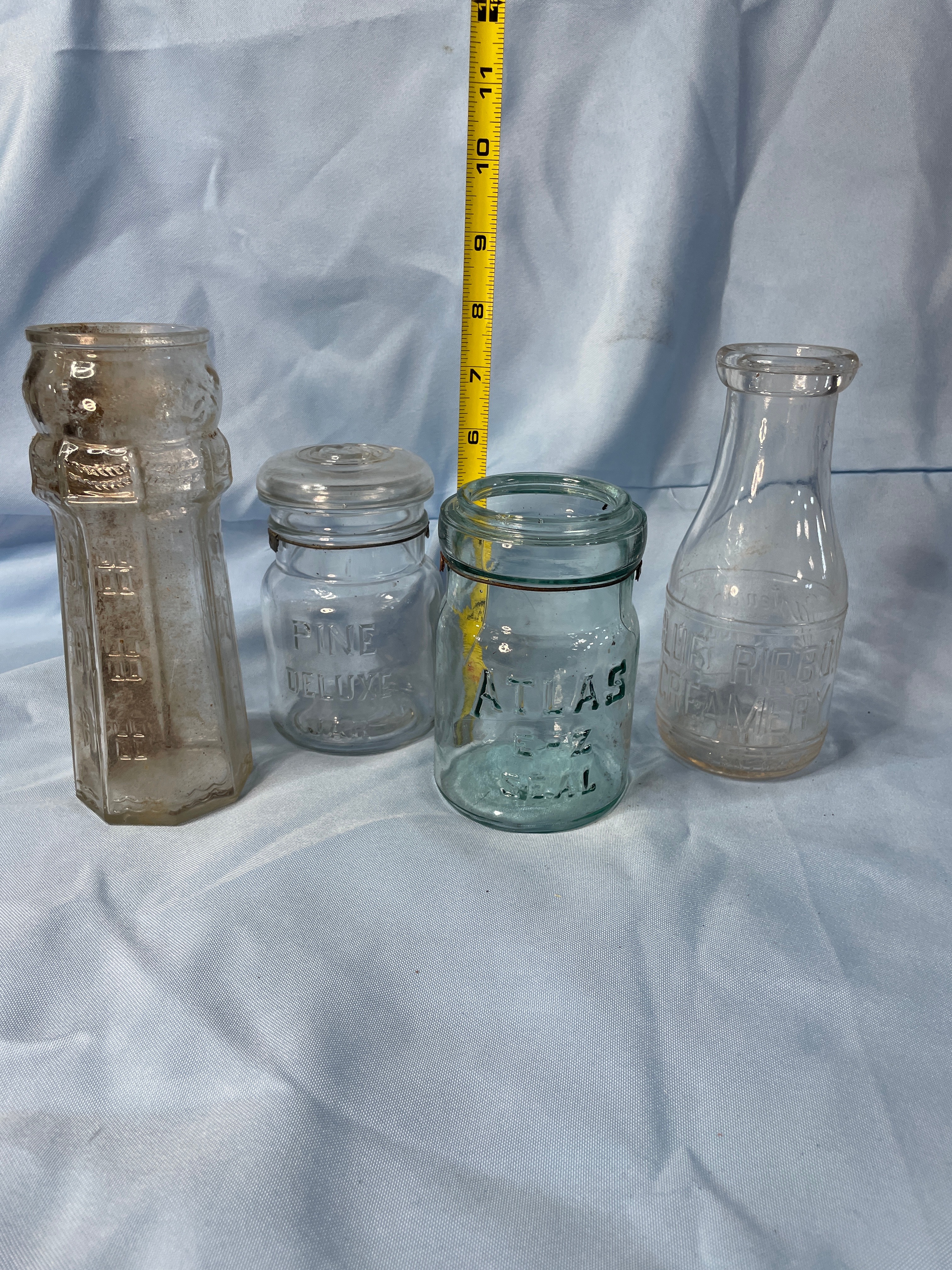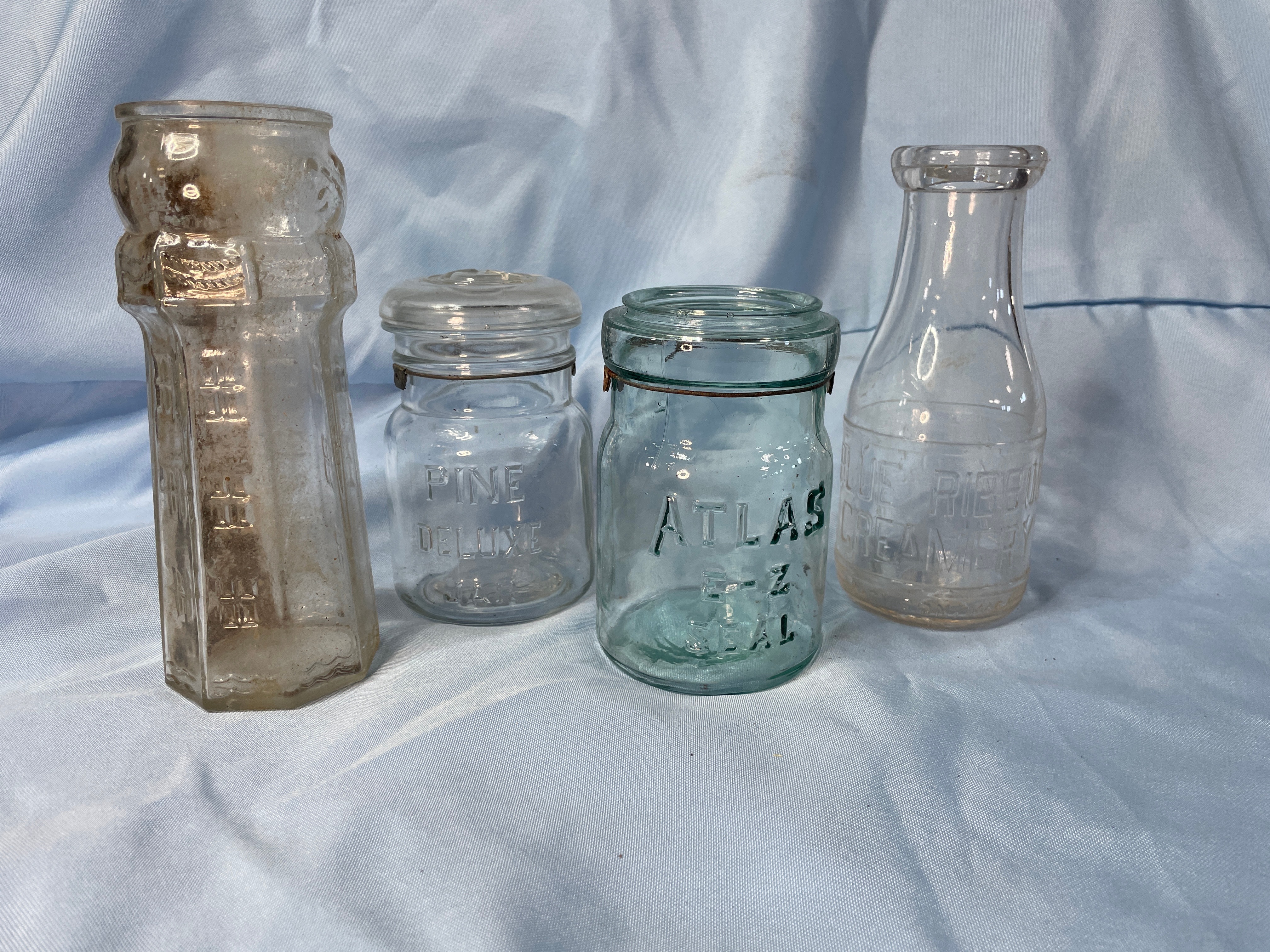 A group of four vintage clear and aqua glass jars and bottles, including Planters Peanut Butter, Pine Deluxe, Atlas E-Z Seal, and Blue Ribbon Creamery.