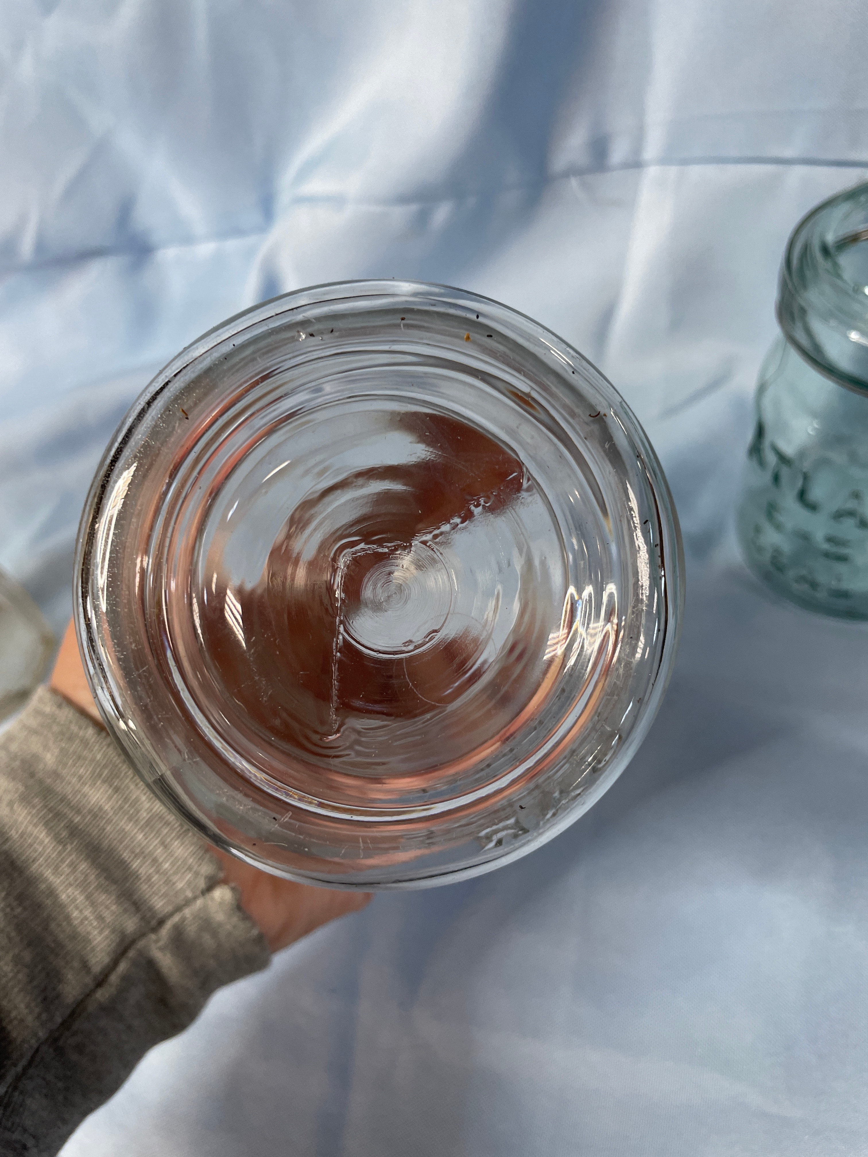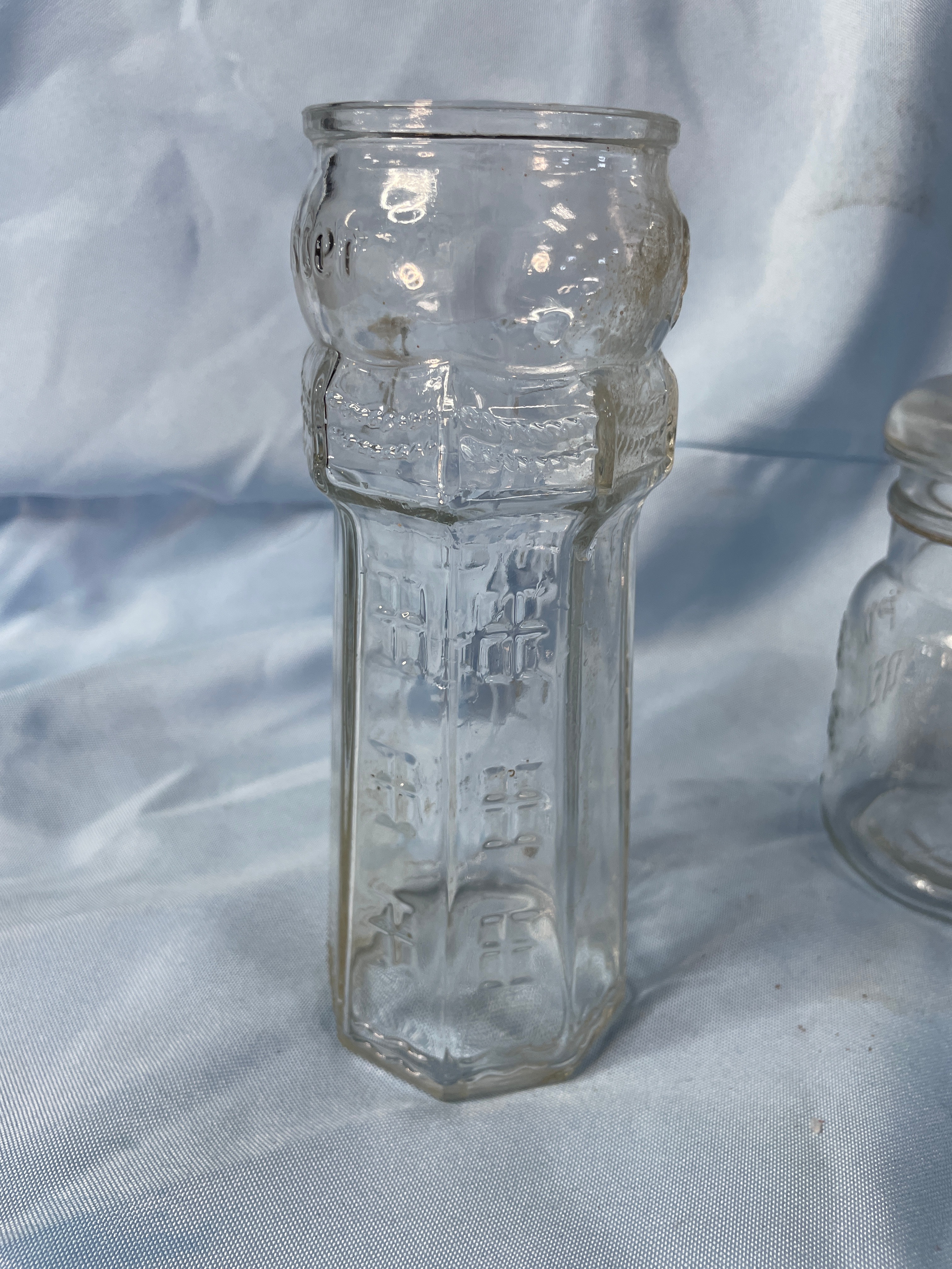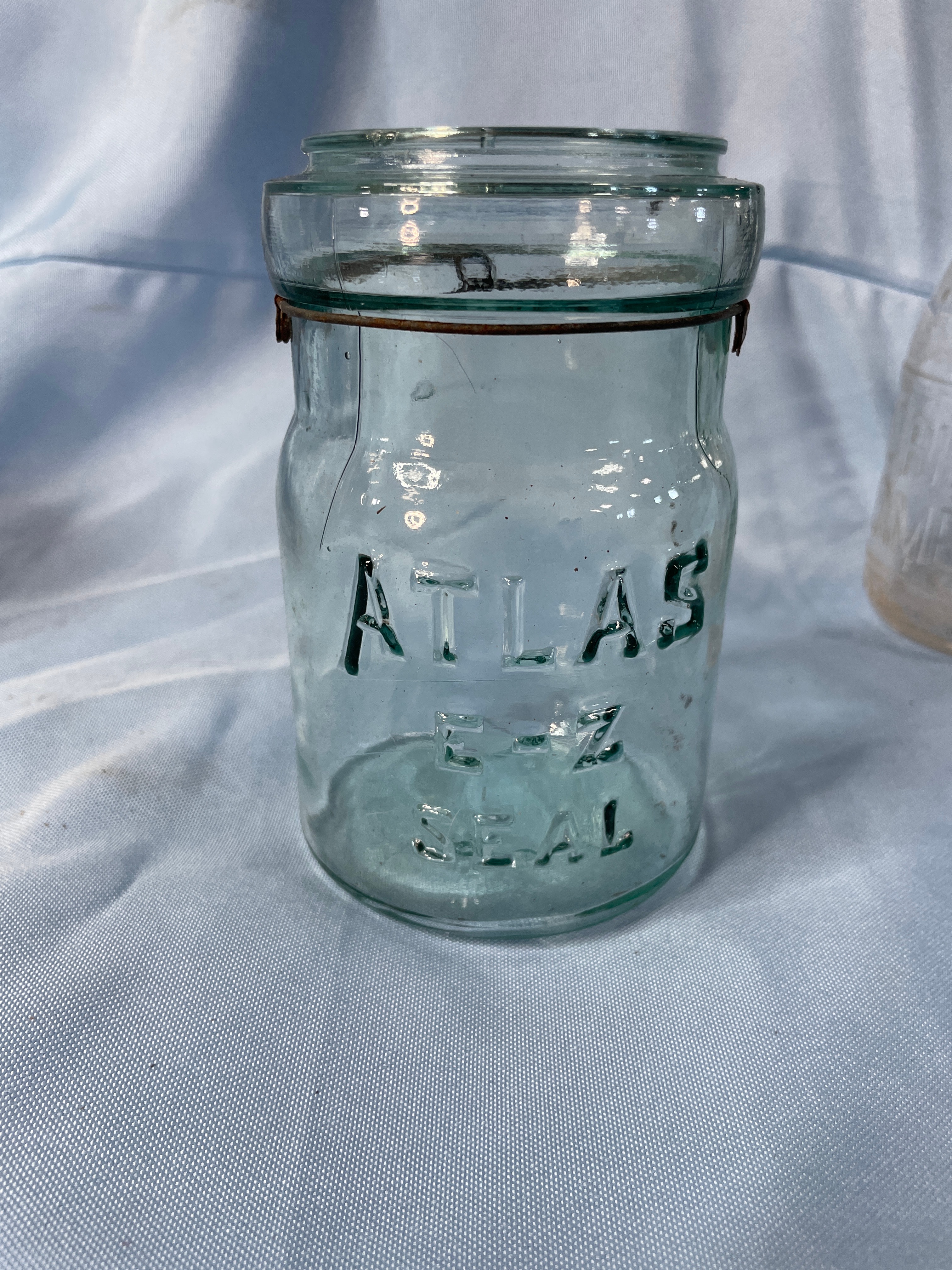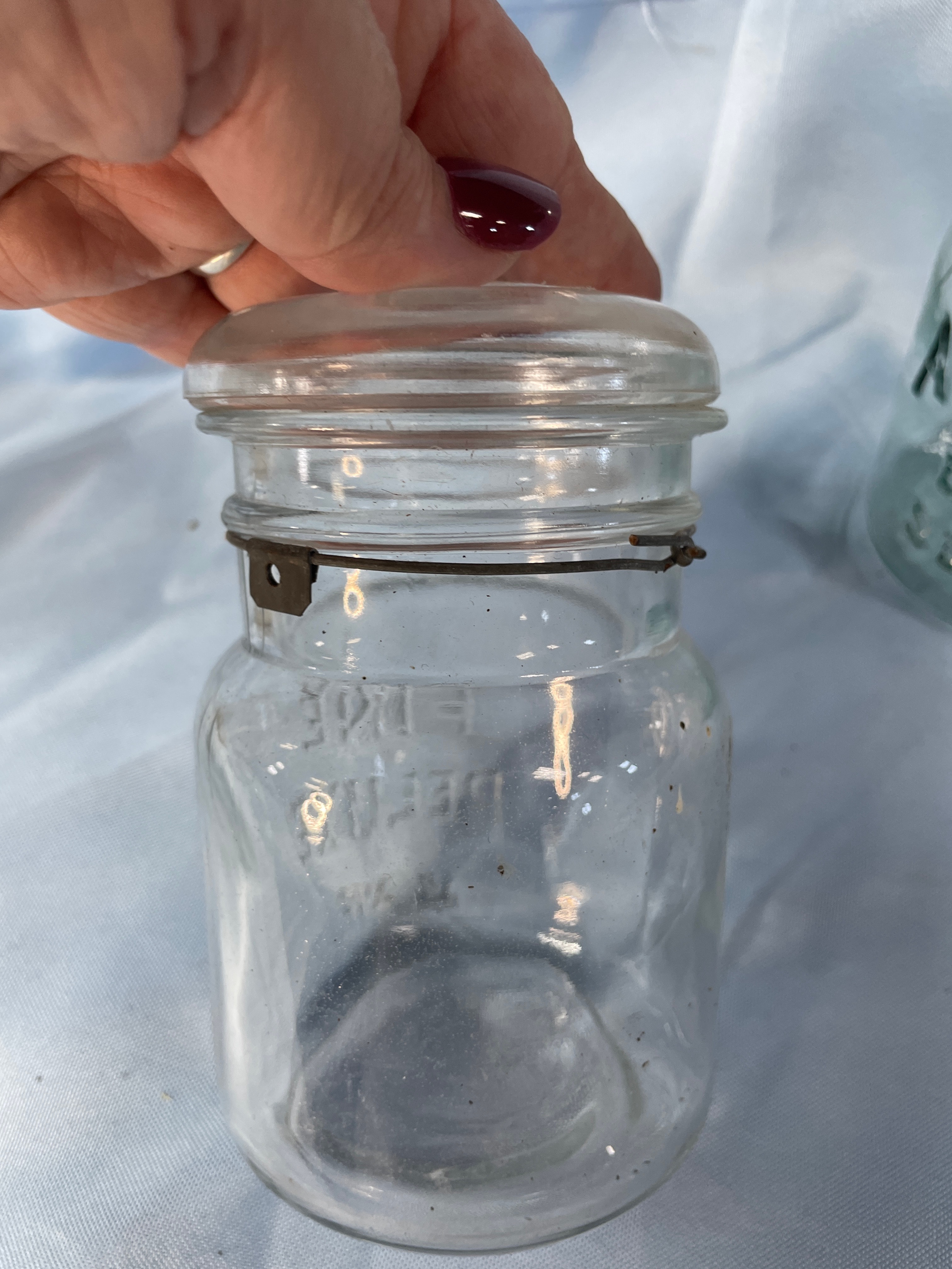 A group of four vintage clear and aqua glass jars and bottles, including Planters Peanut Butter, Pine Deluxe, Atlas E-Z Seal, and Blue Ribbon Creamery.