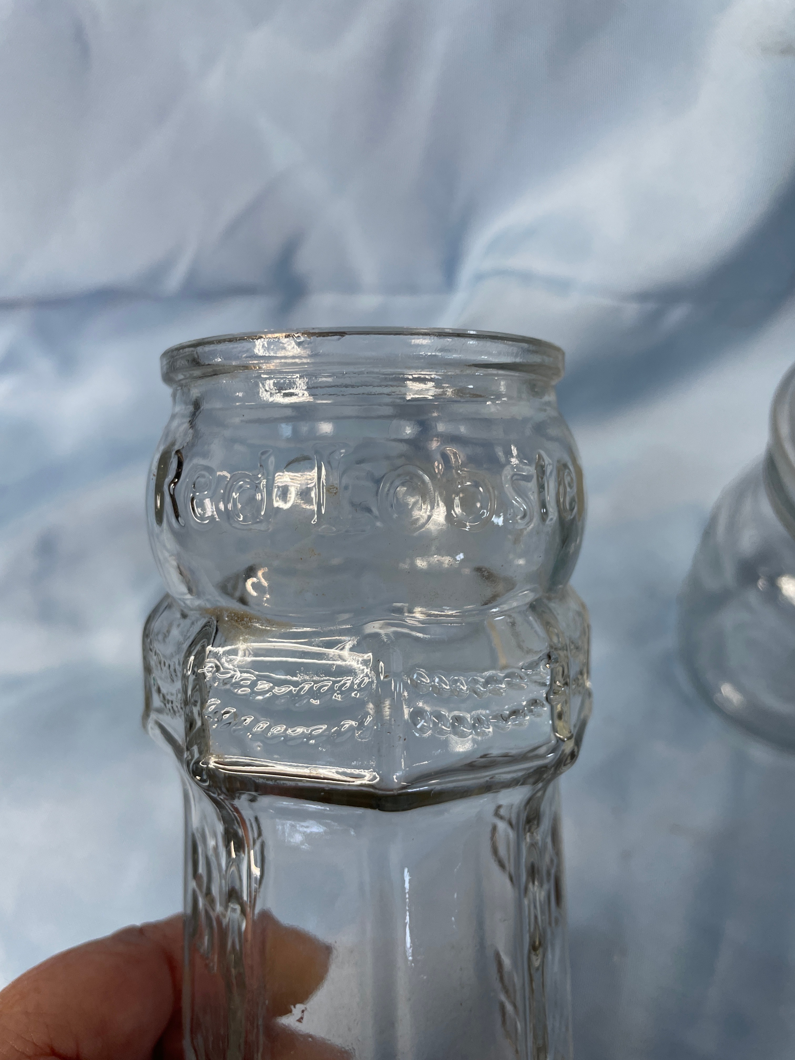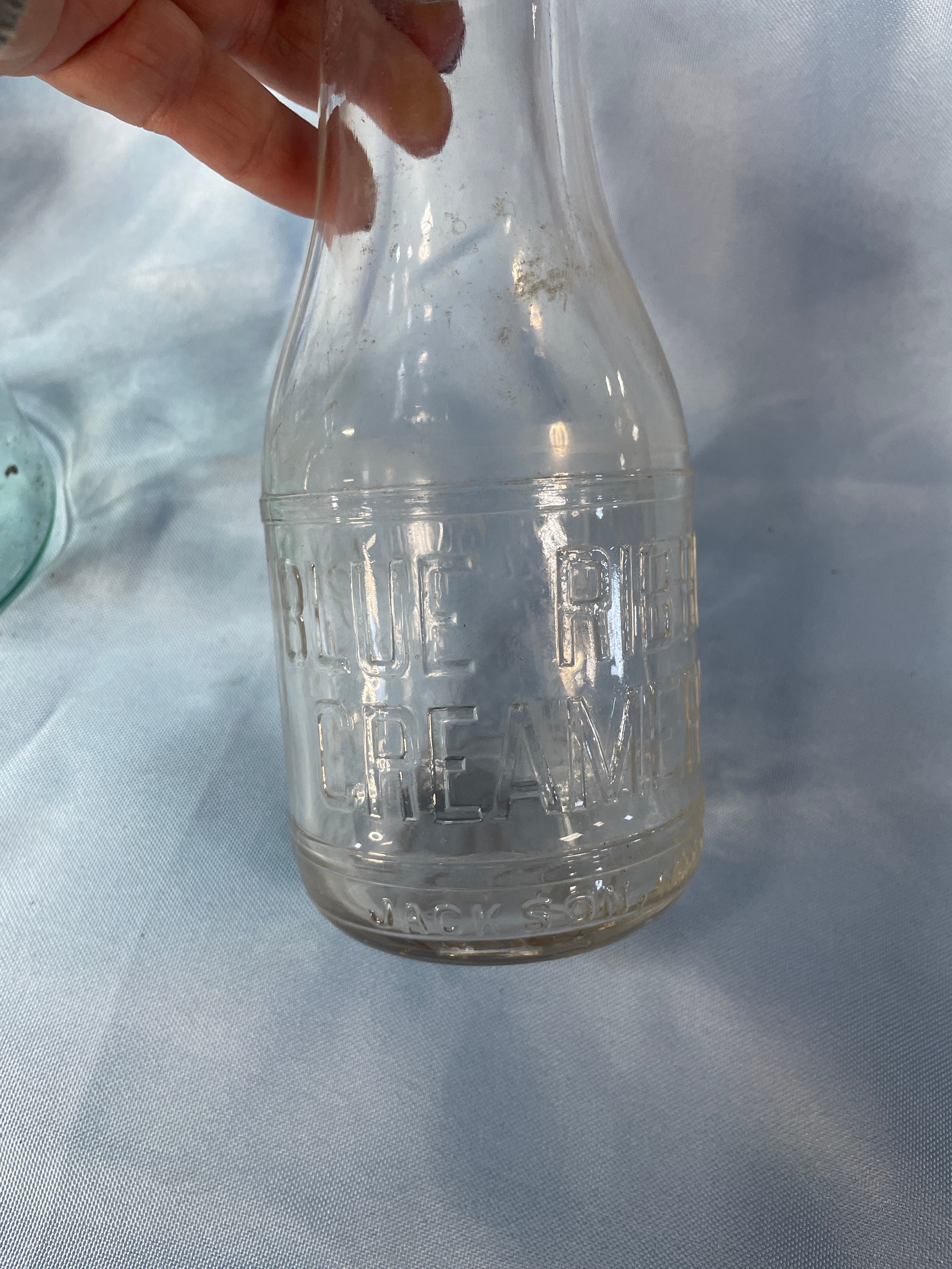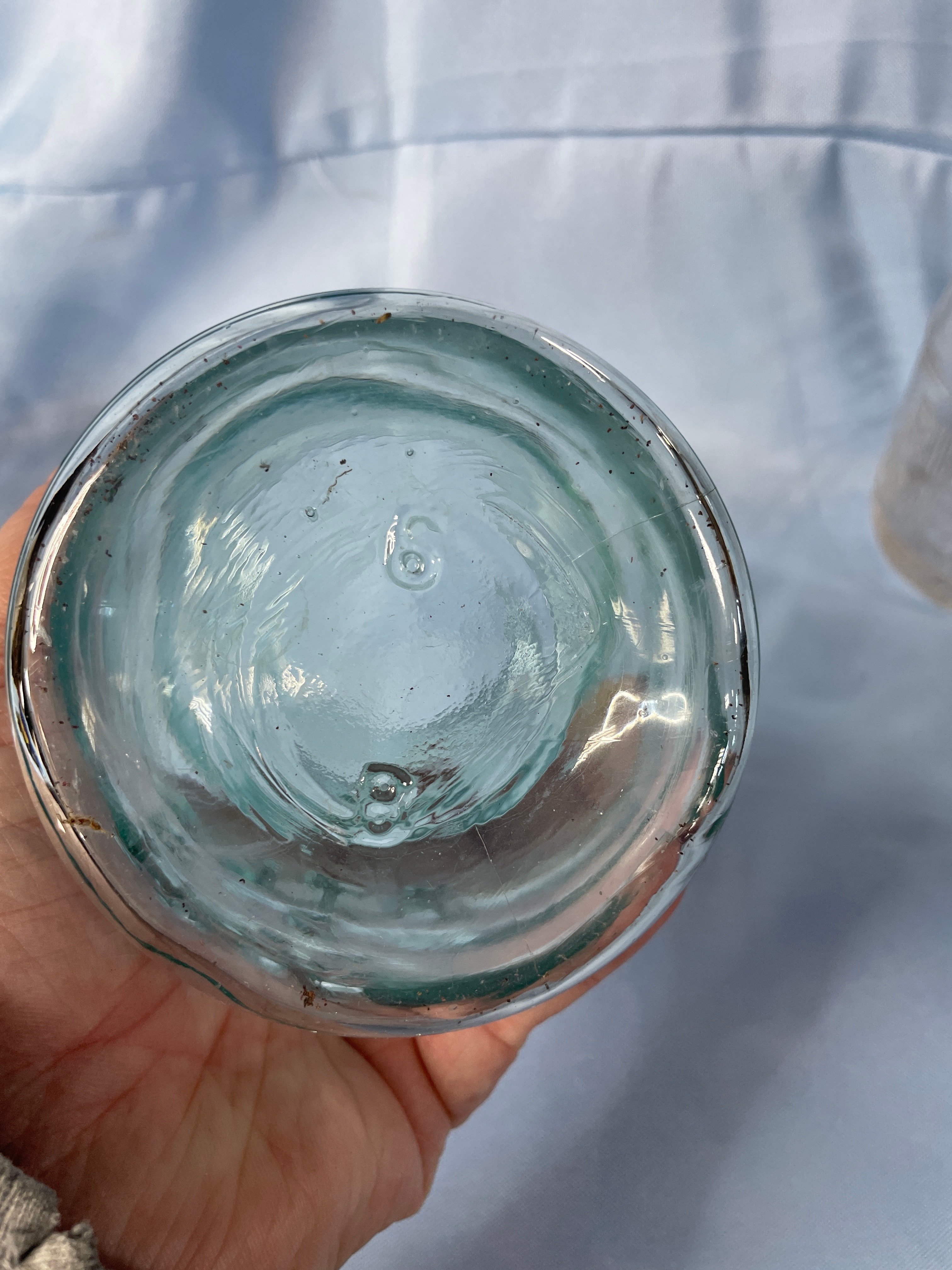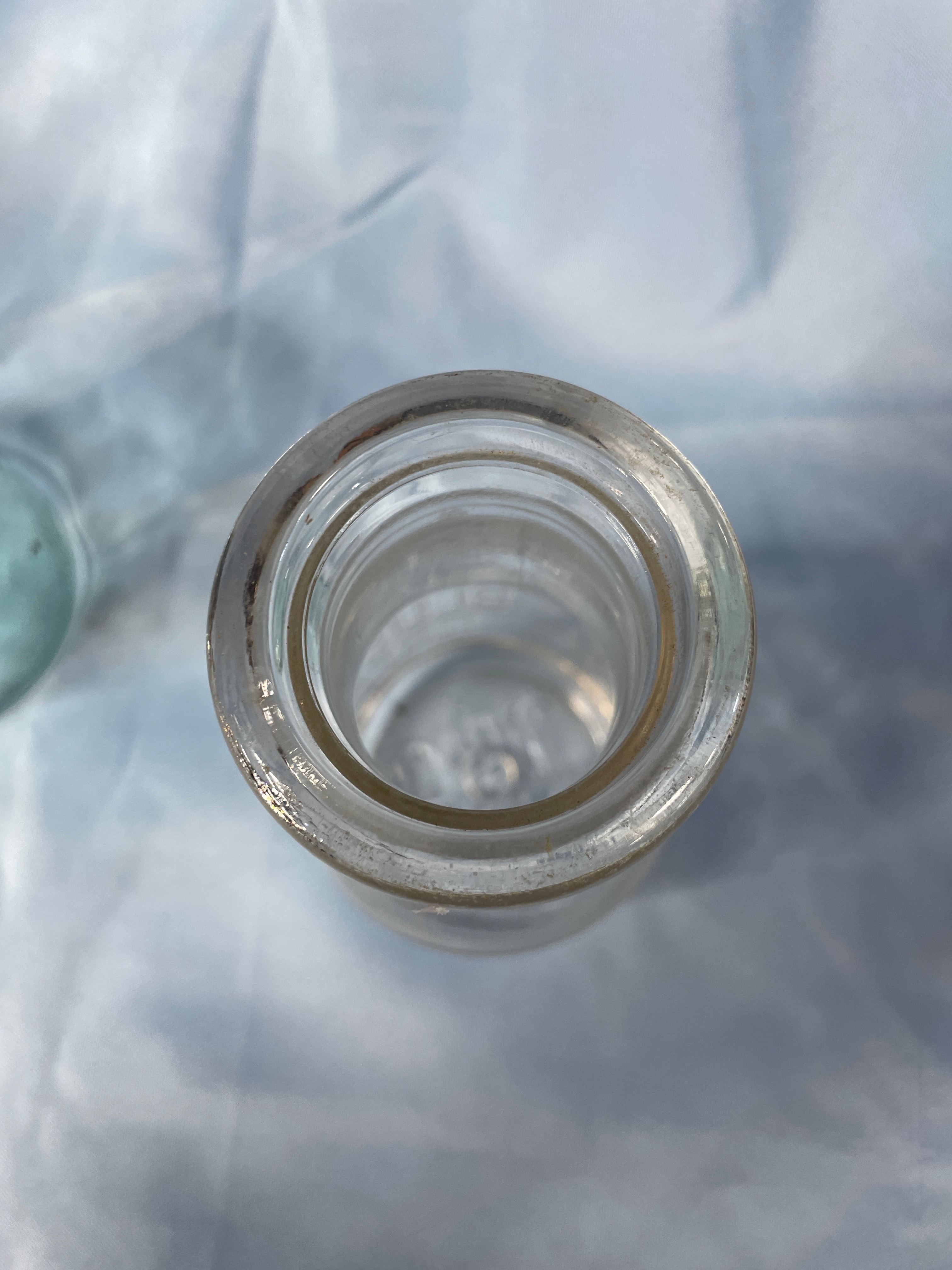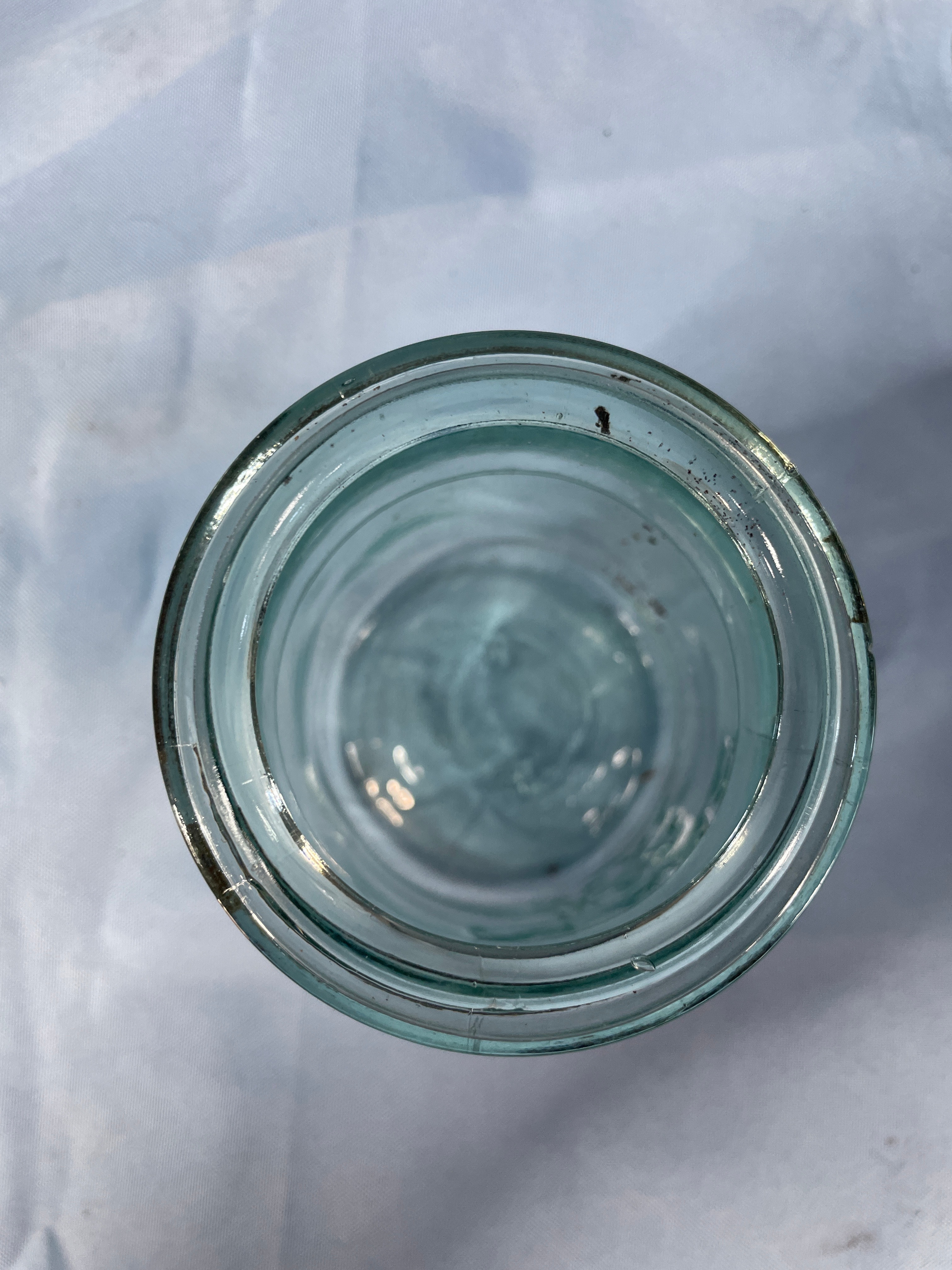 A group of four vintage clear and aqua glass jars and bottles, including Planters Peanut Butter, Pine Deluxe, Atlas E-Z Seal, and Blue Ribbon Creamery.