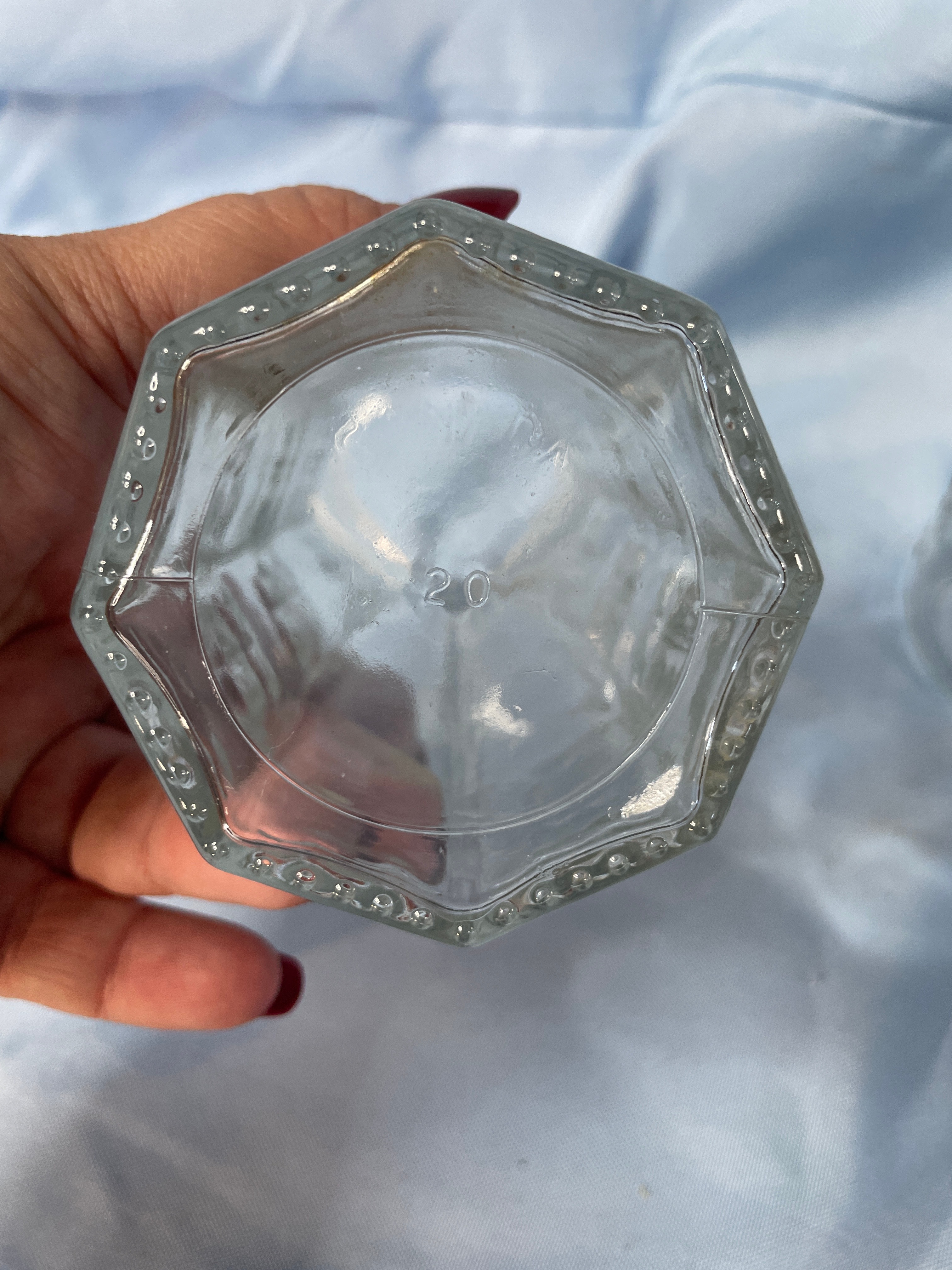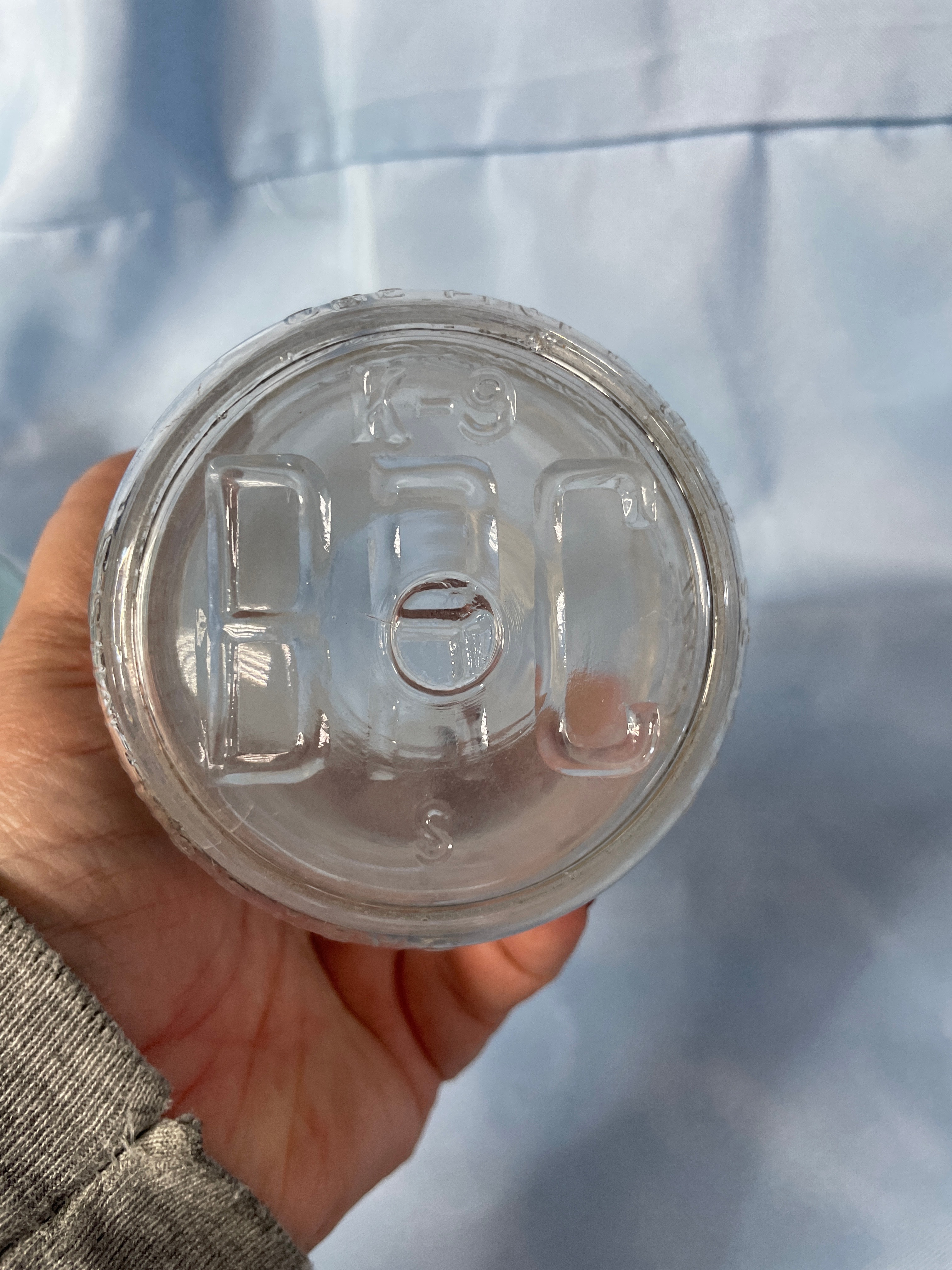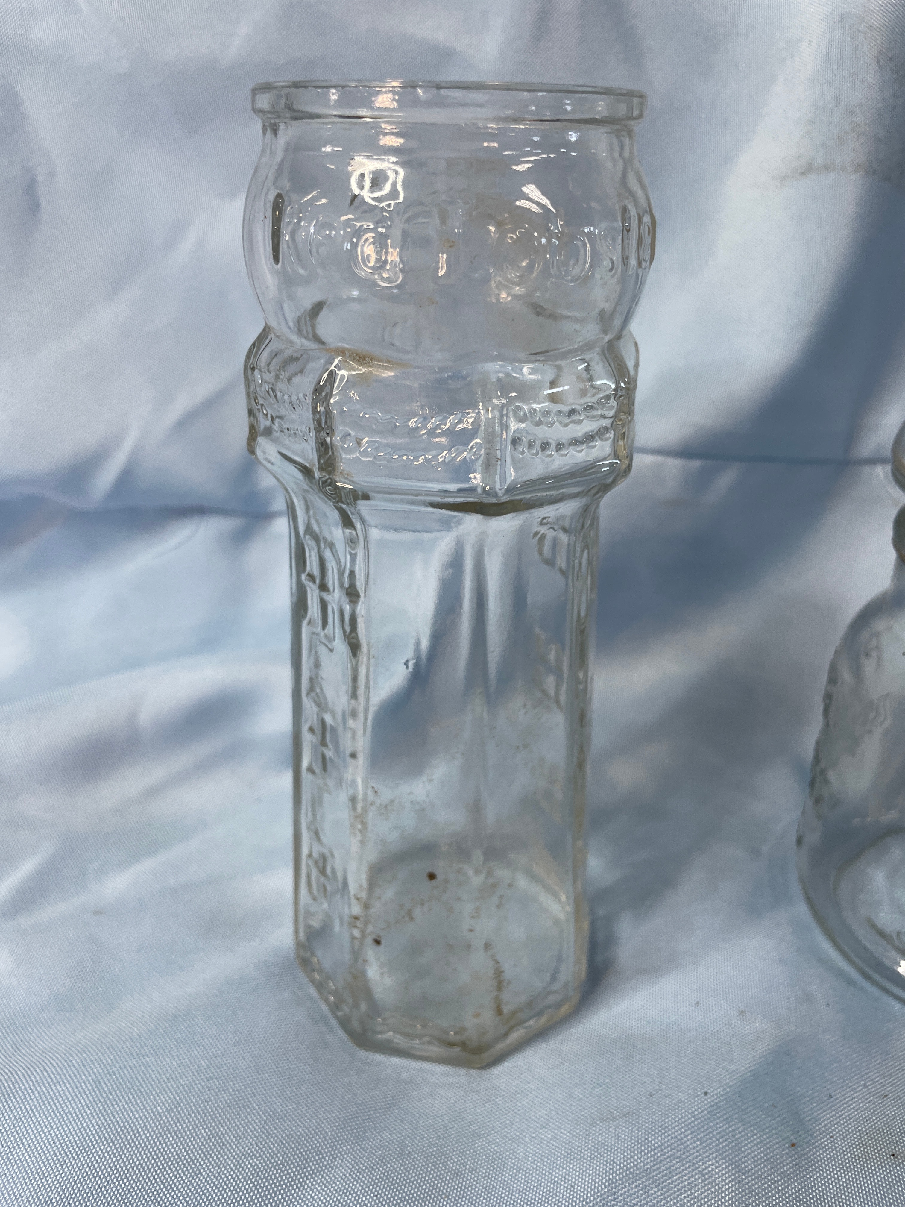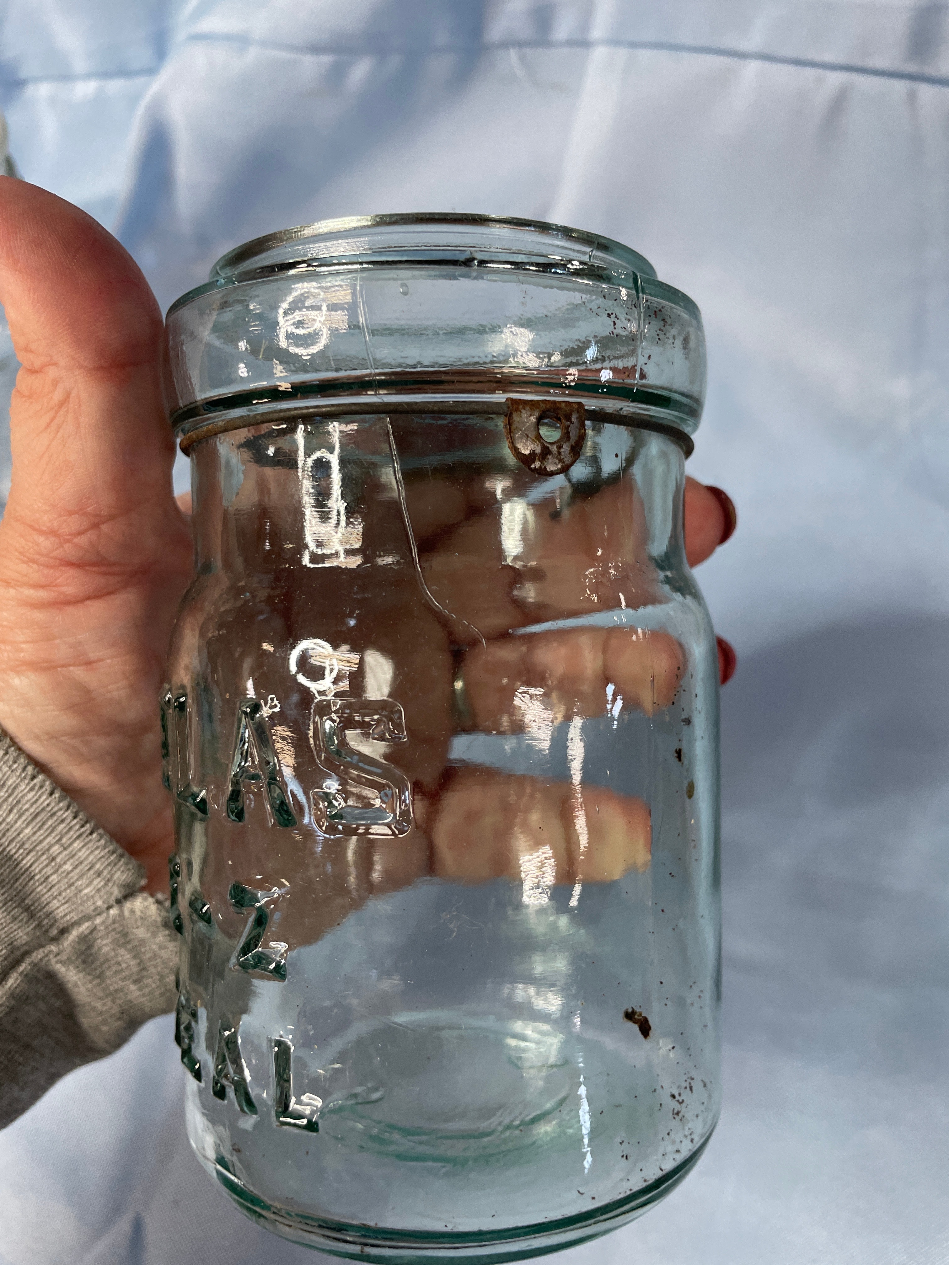 A group of four vintage clear and aqua glass jars and bottles, including Planters Peanut Butter, Pine Deluxe, Atlas E-Z Seal, and Blue Ribbon Creamery.