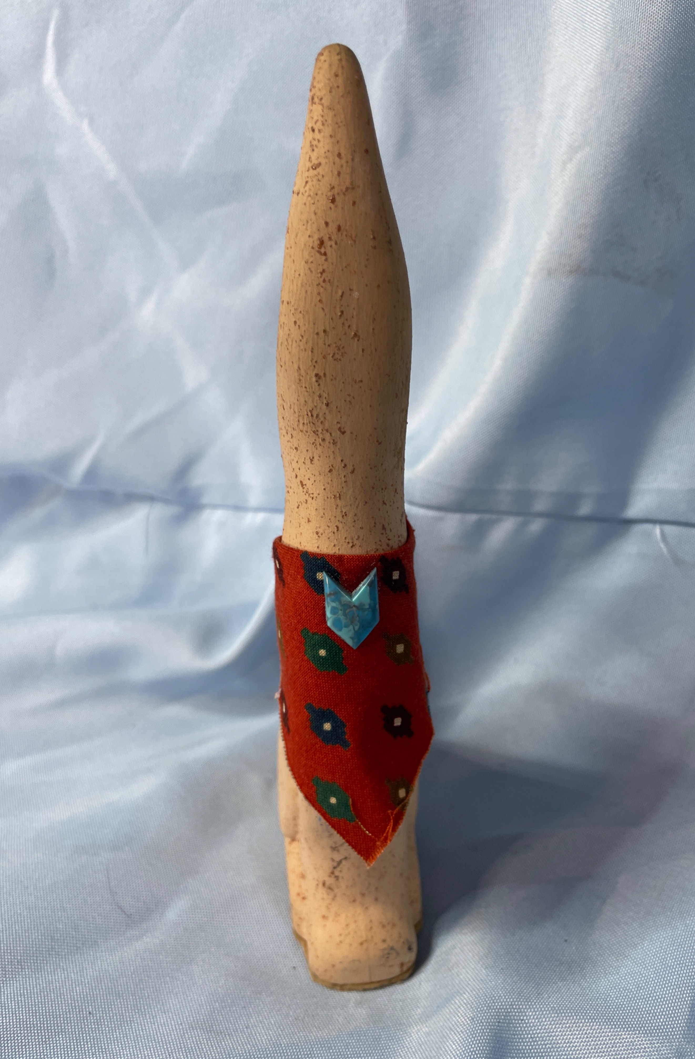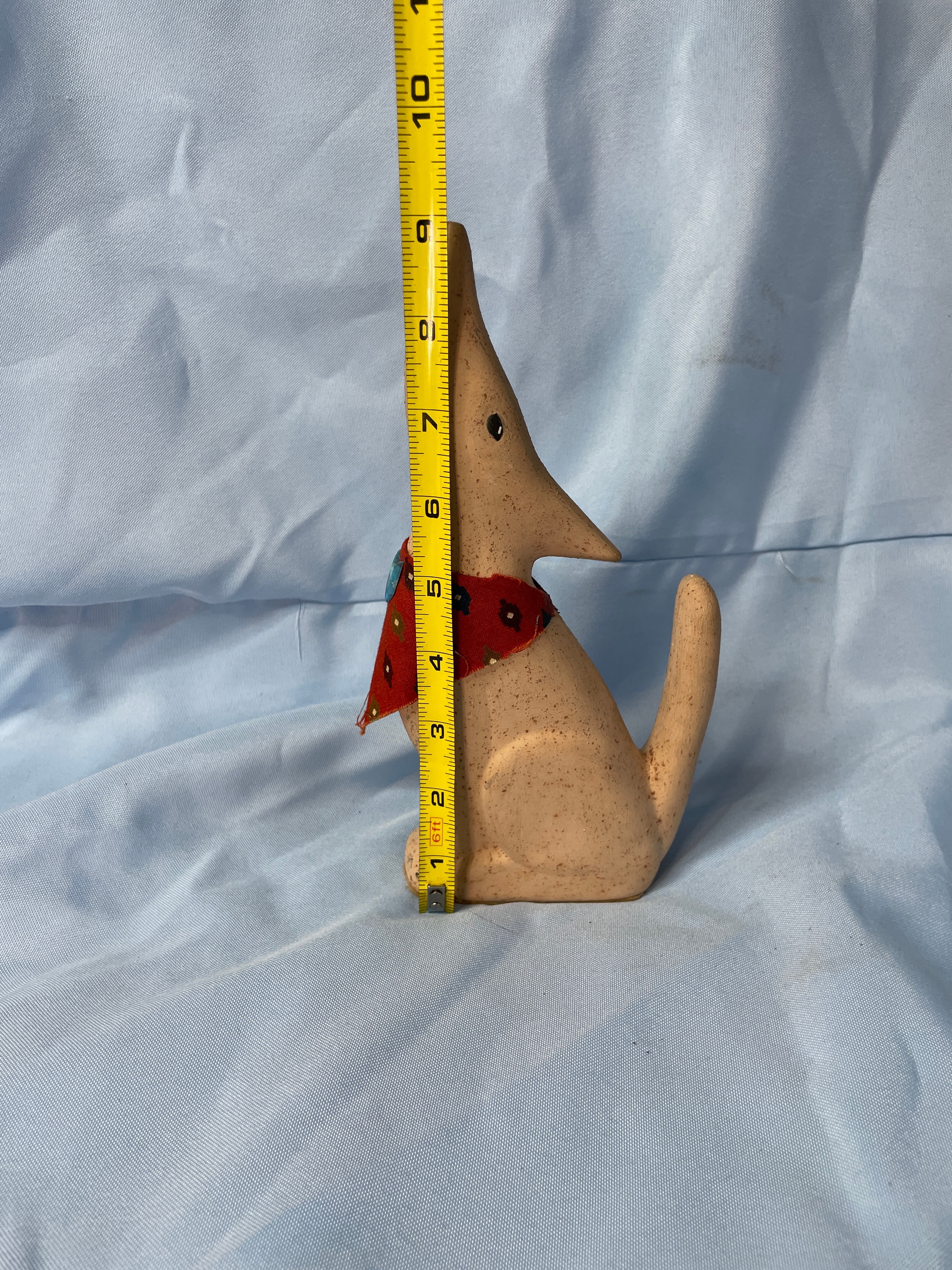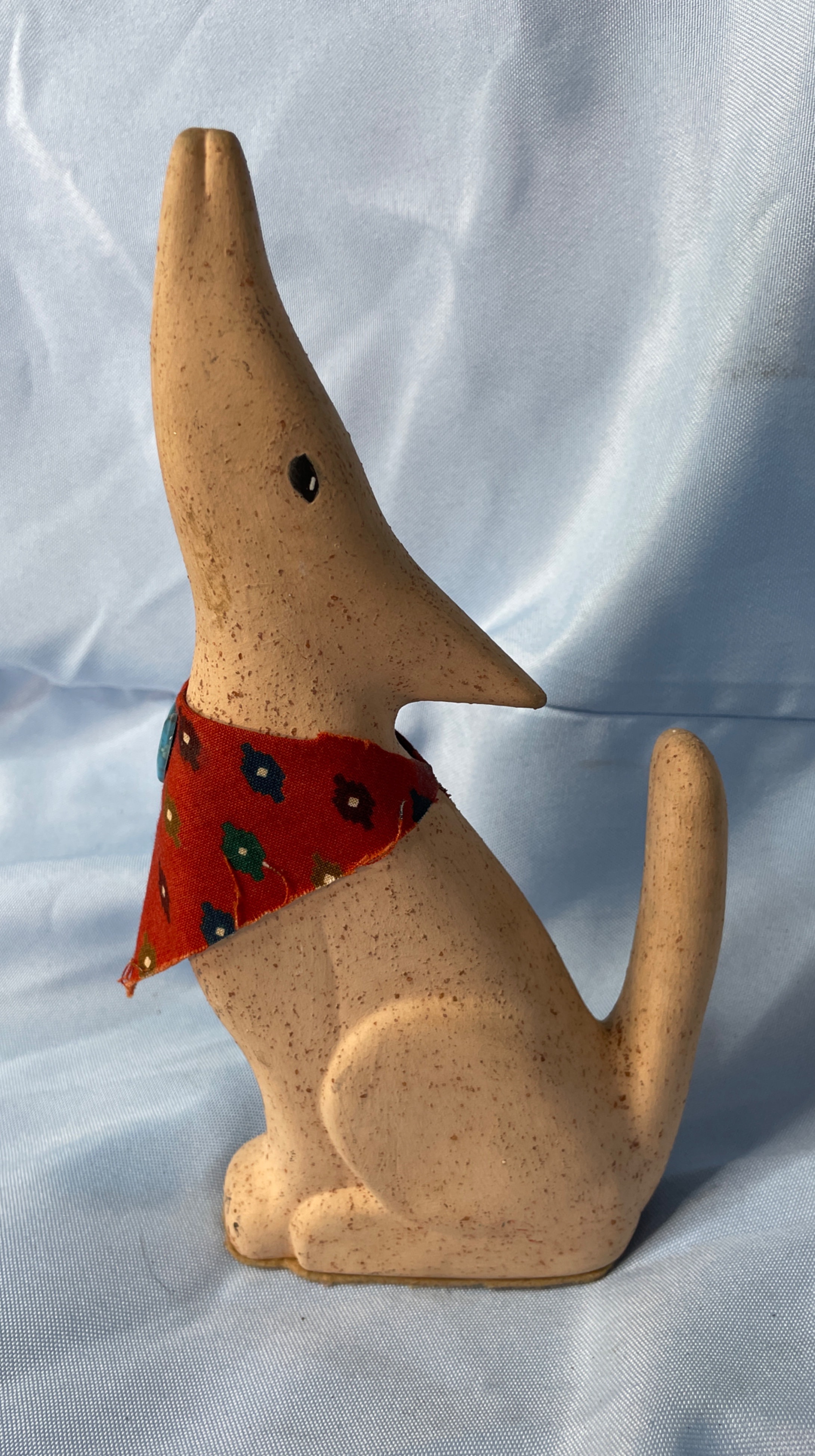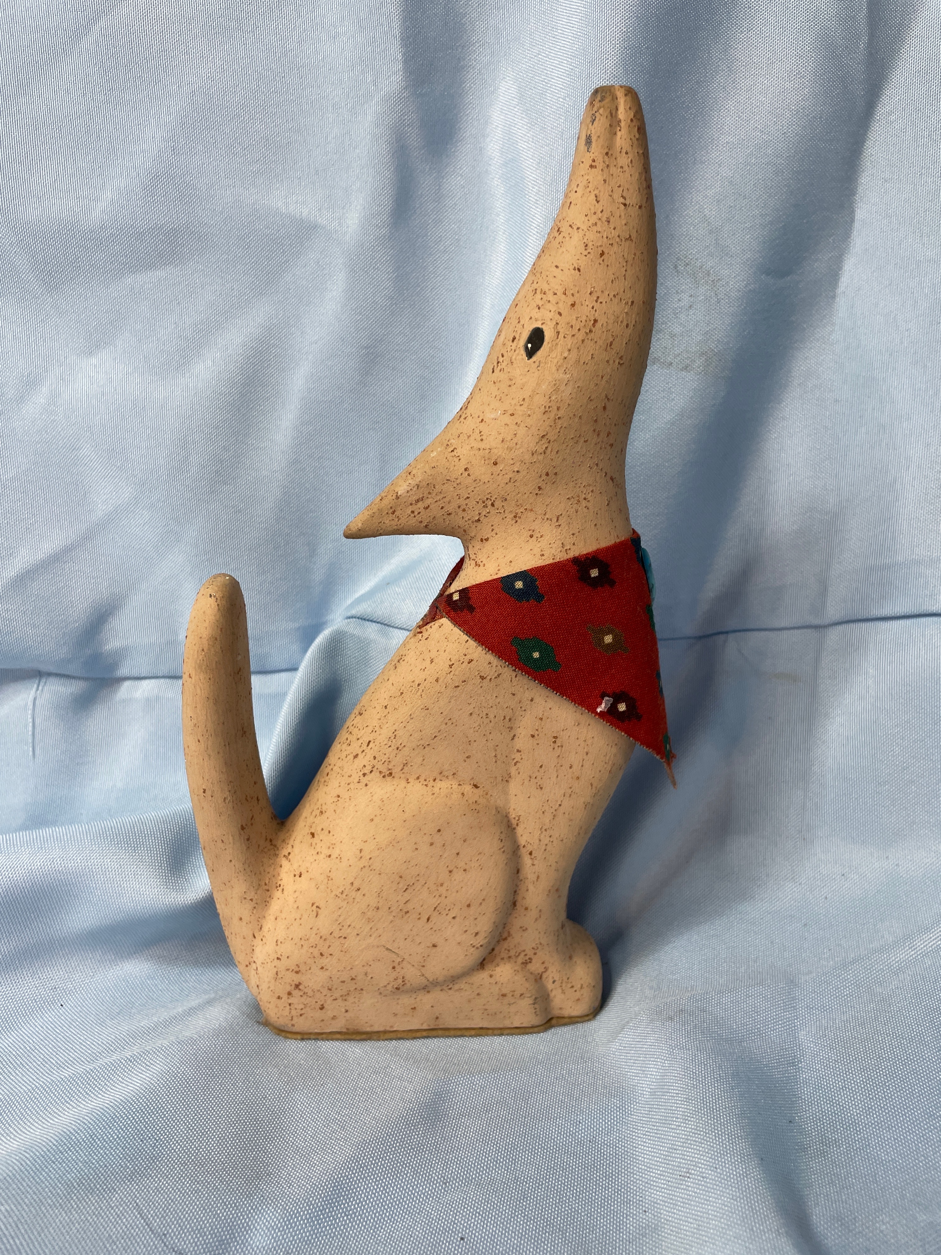 A light beige/tan speckled ceramic howling dog/coyote figurine, approximately 8.5 inches tall, with a red bandana featuring green and blue patterns and a small blue embellishment.