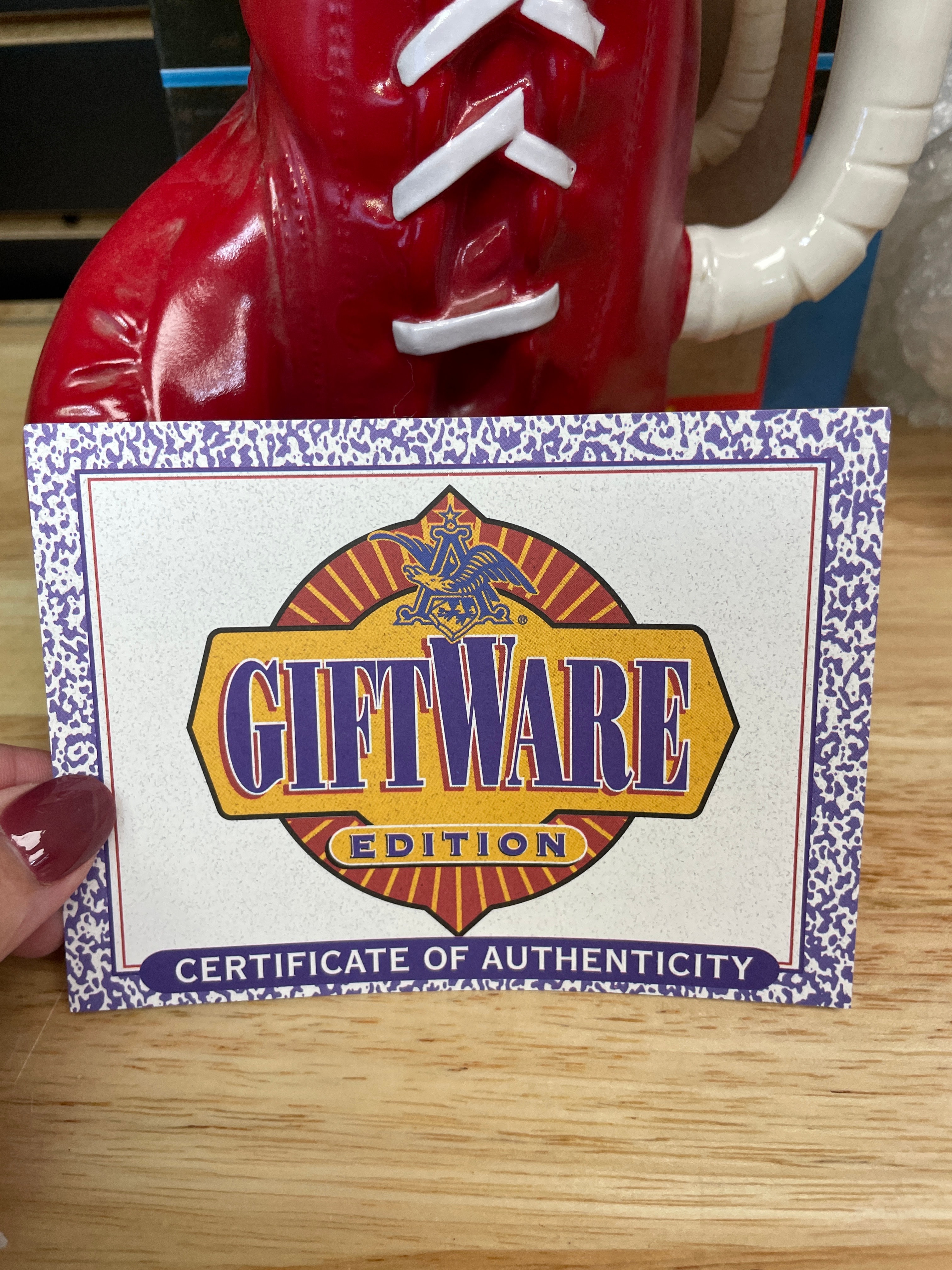 A red and white ceramic Budweiser “BOXING GLOVE STEIN” mug, featuring “Budweiser KING OF BEERS” on its side, comes with its original box and a “GIFTWARE EDITION CERTIFICATE OF AUTHENTICITY”.