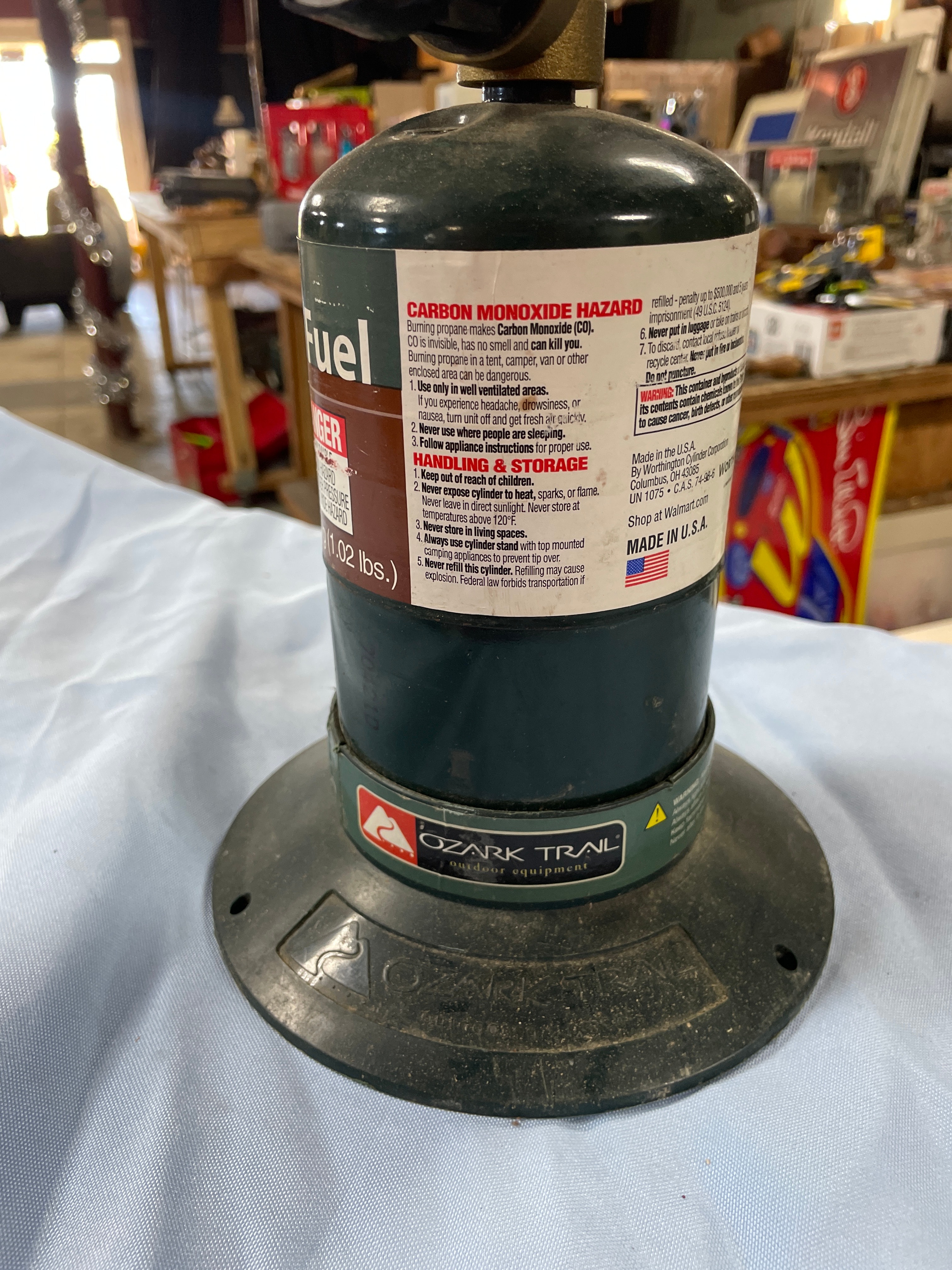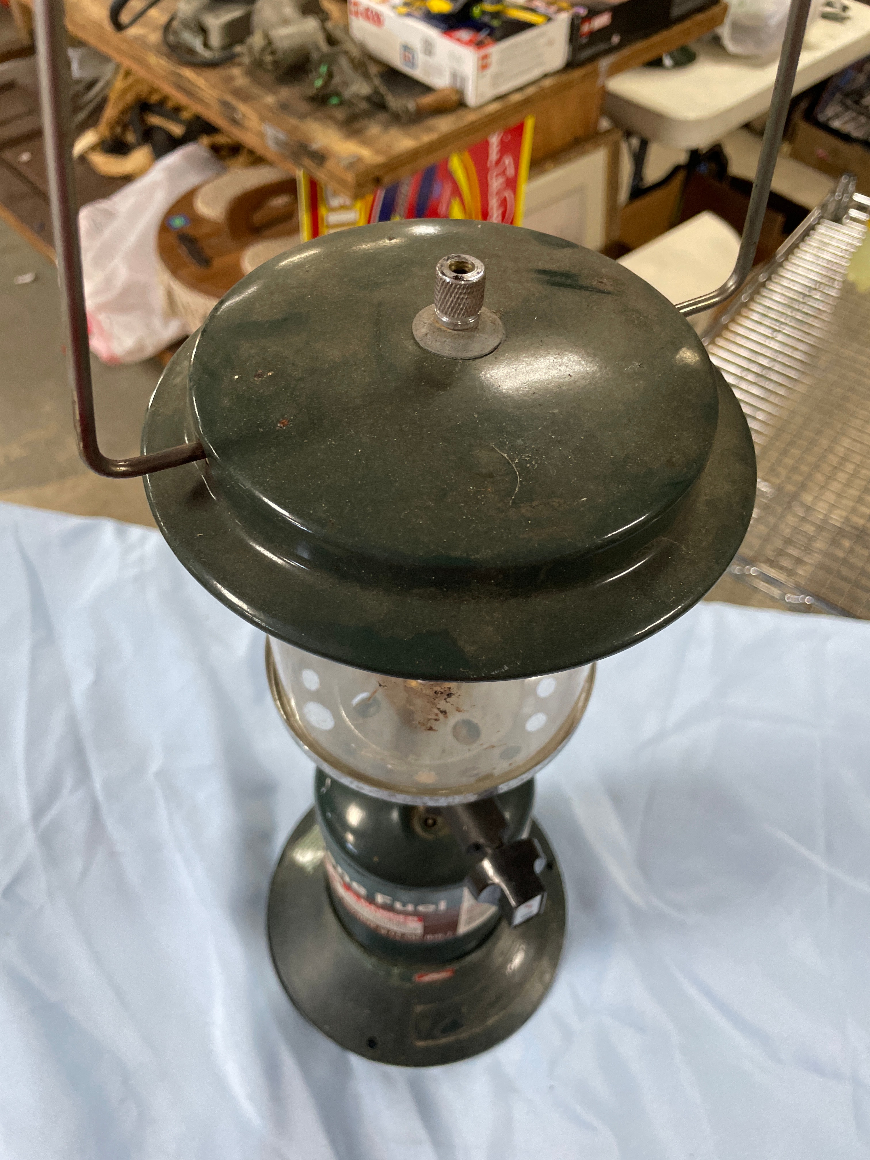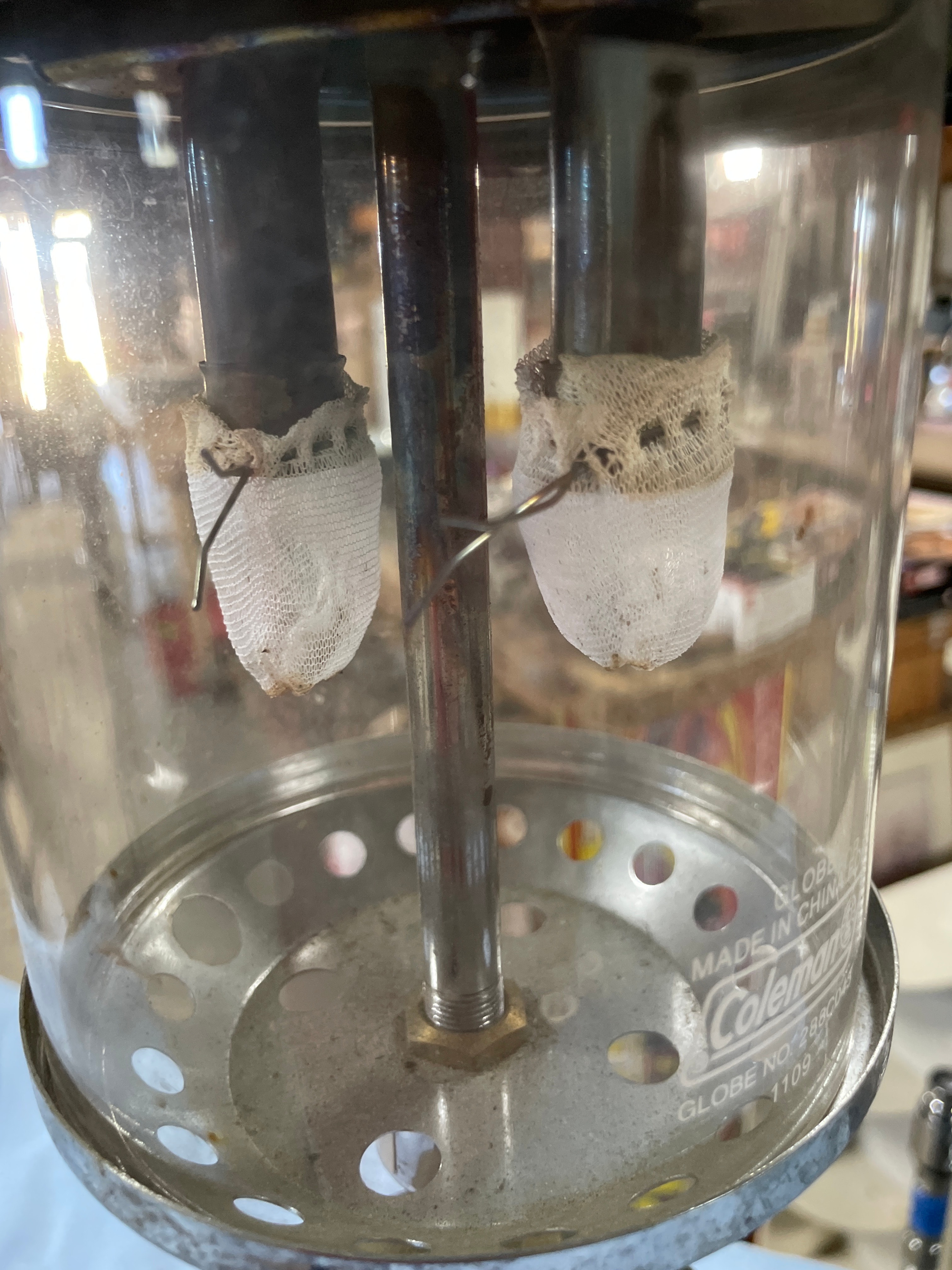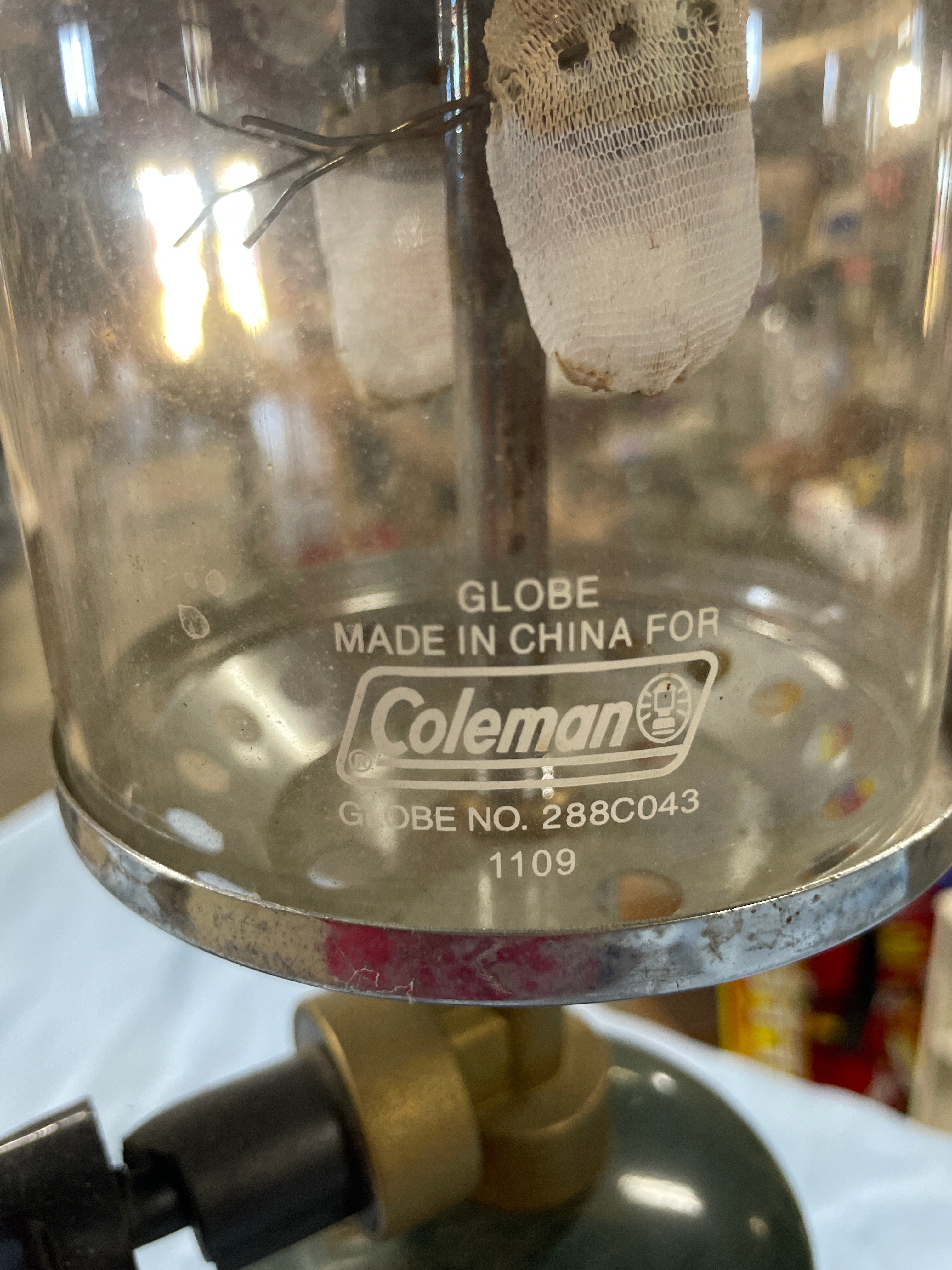 A dark green and metallic Coleman camping lantern with a clear glass globe labeled ‘GLOBE NO. 288C043’, featuring two mantles and attached to an Ozark Trail propane fuel cylinder labeled ‘018011-00’.