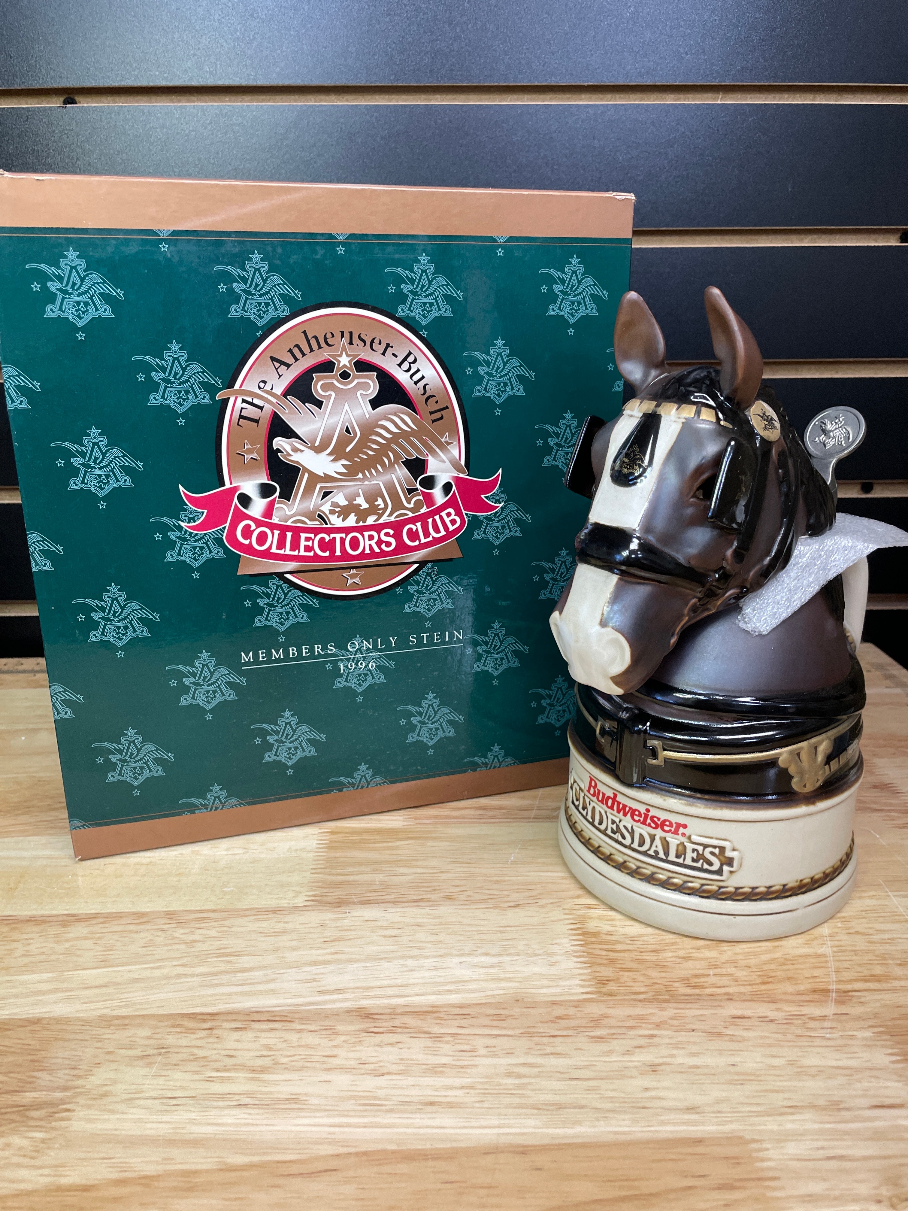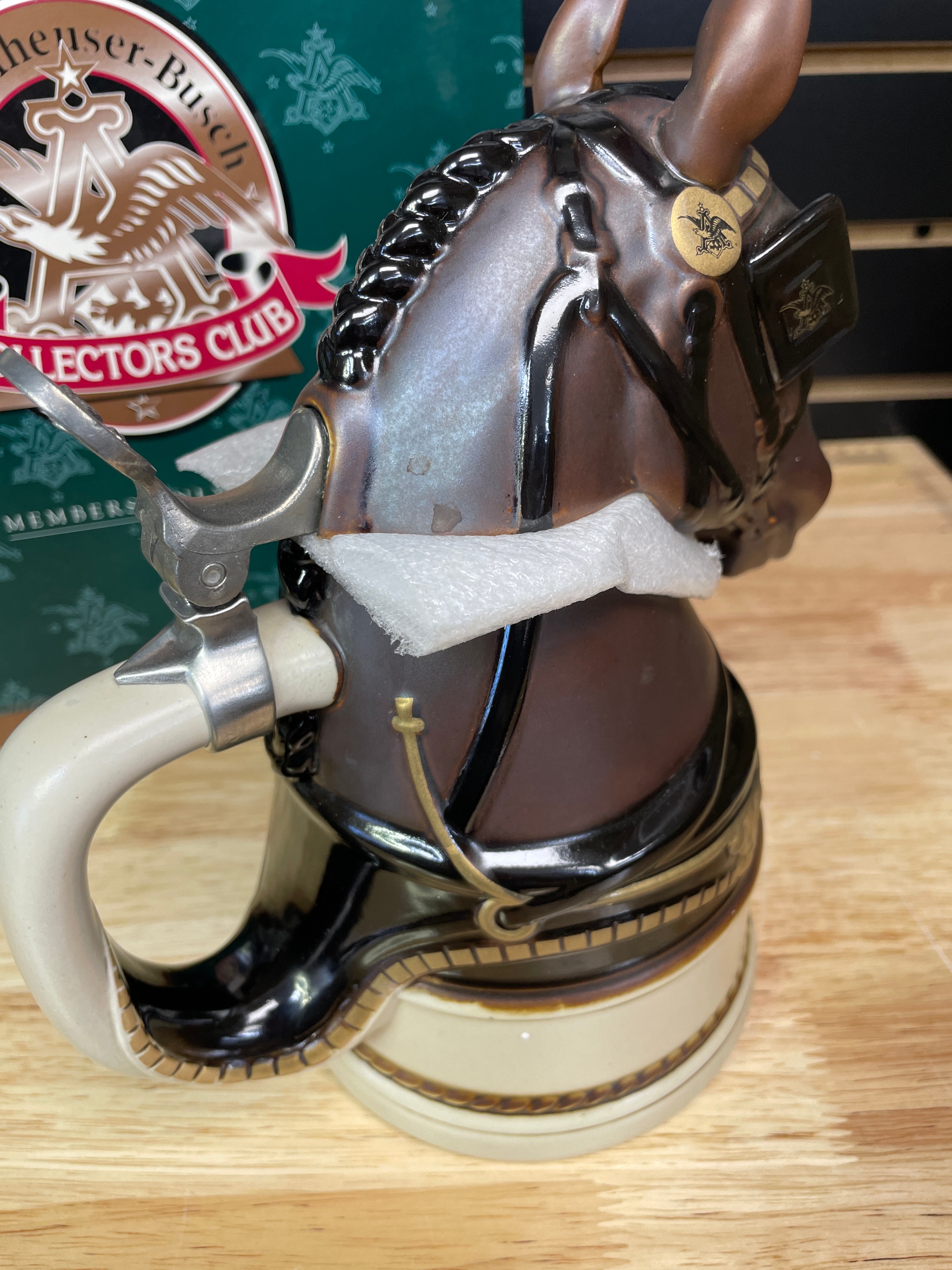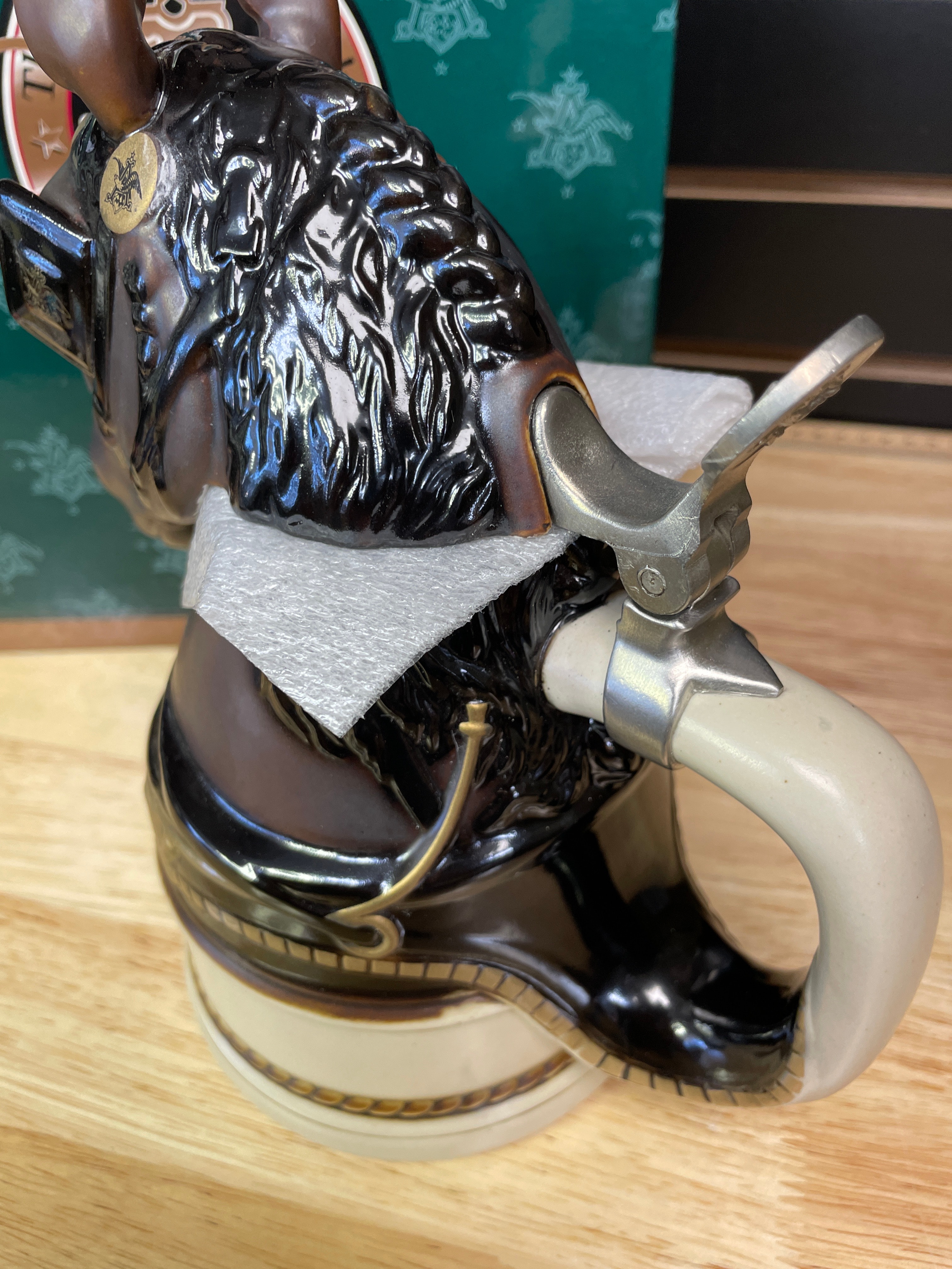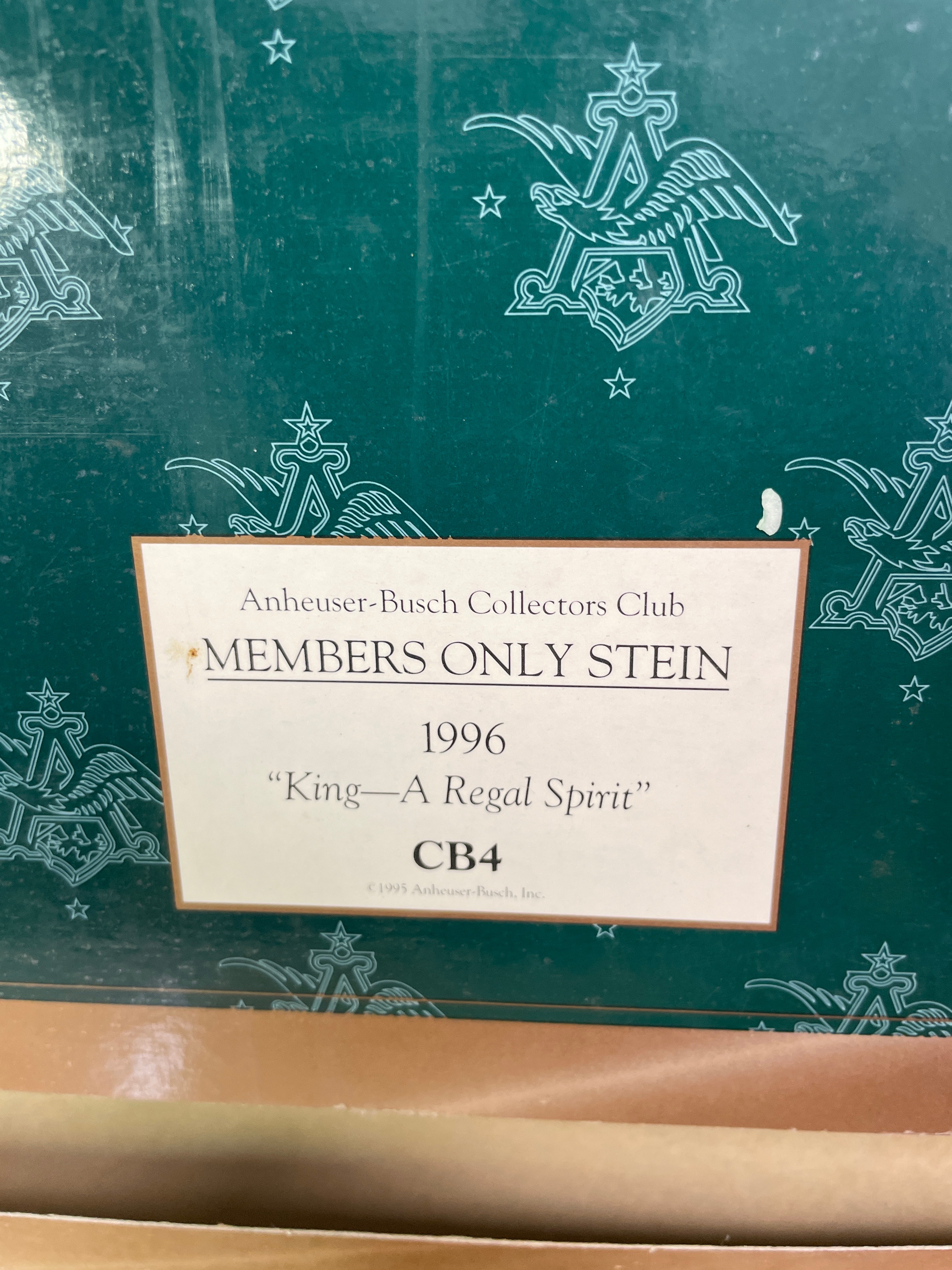 One brown, black, and cream ceramic Budweiser Clydesdales stein with a silver-tone metal lid, labeled “King—A Regal Spirit” 1996 Anheuser-Busch Collectors Club, accompanied by its original green box.
