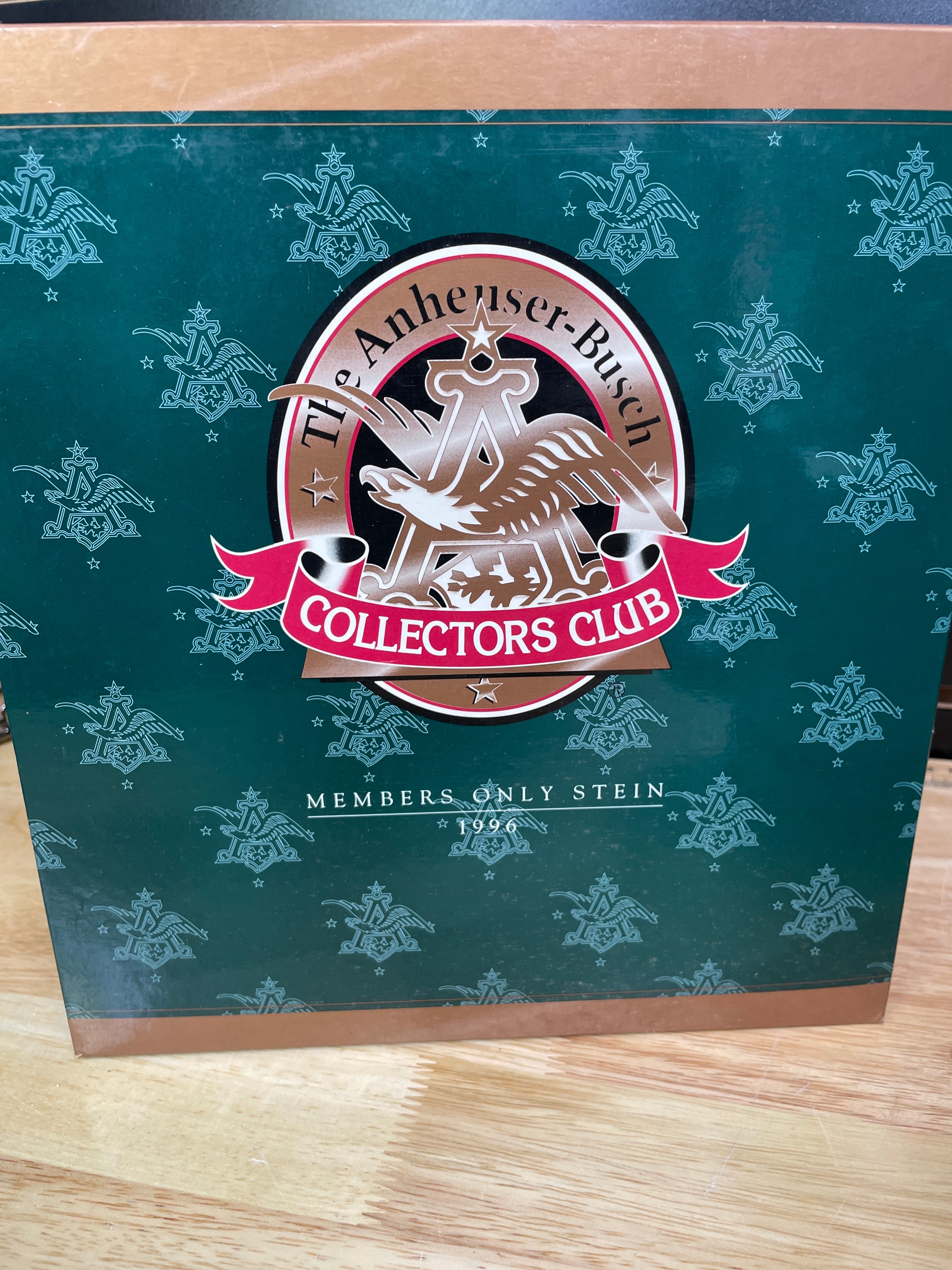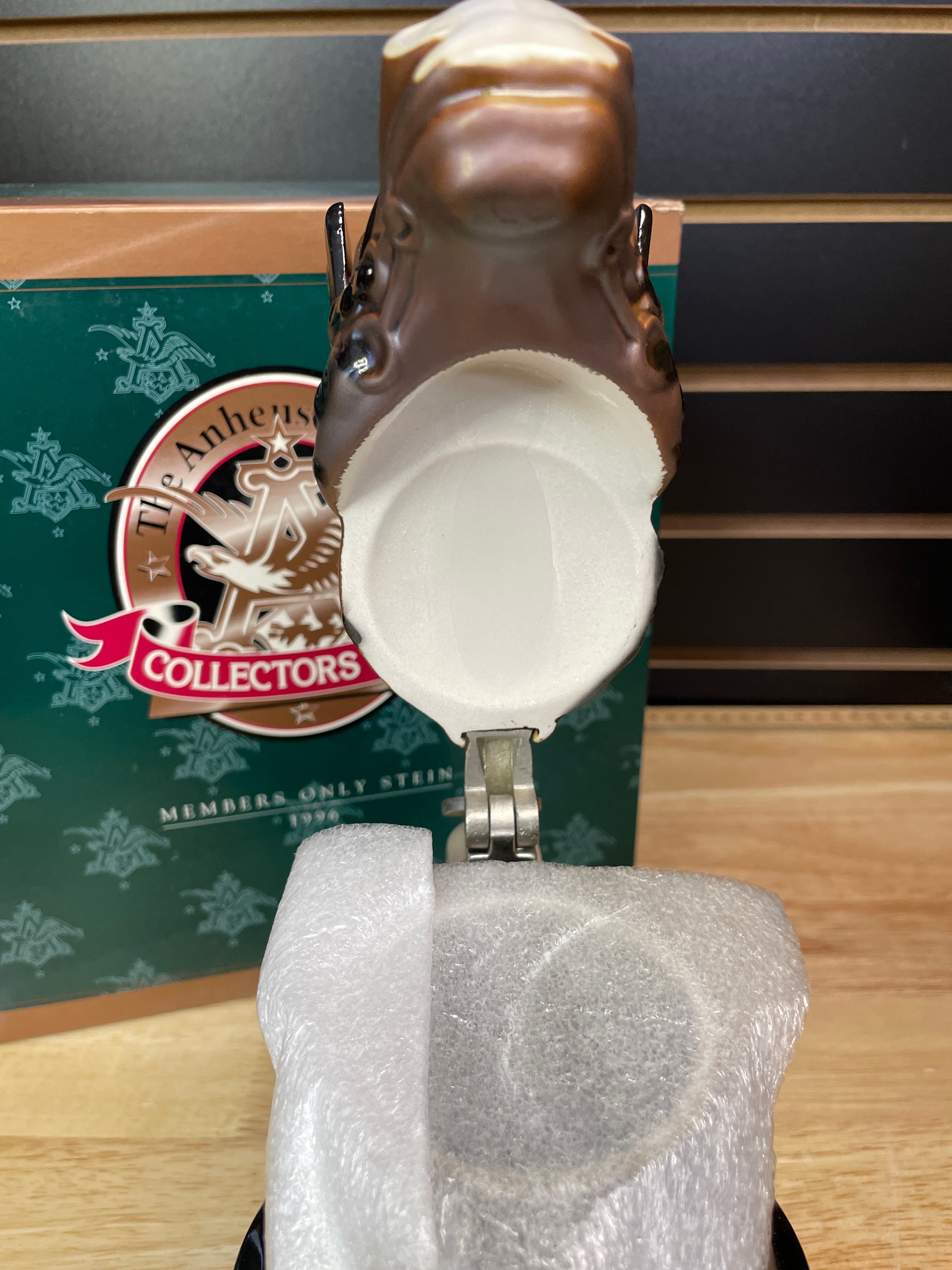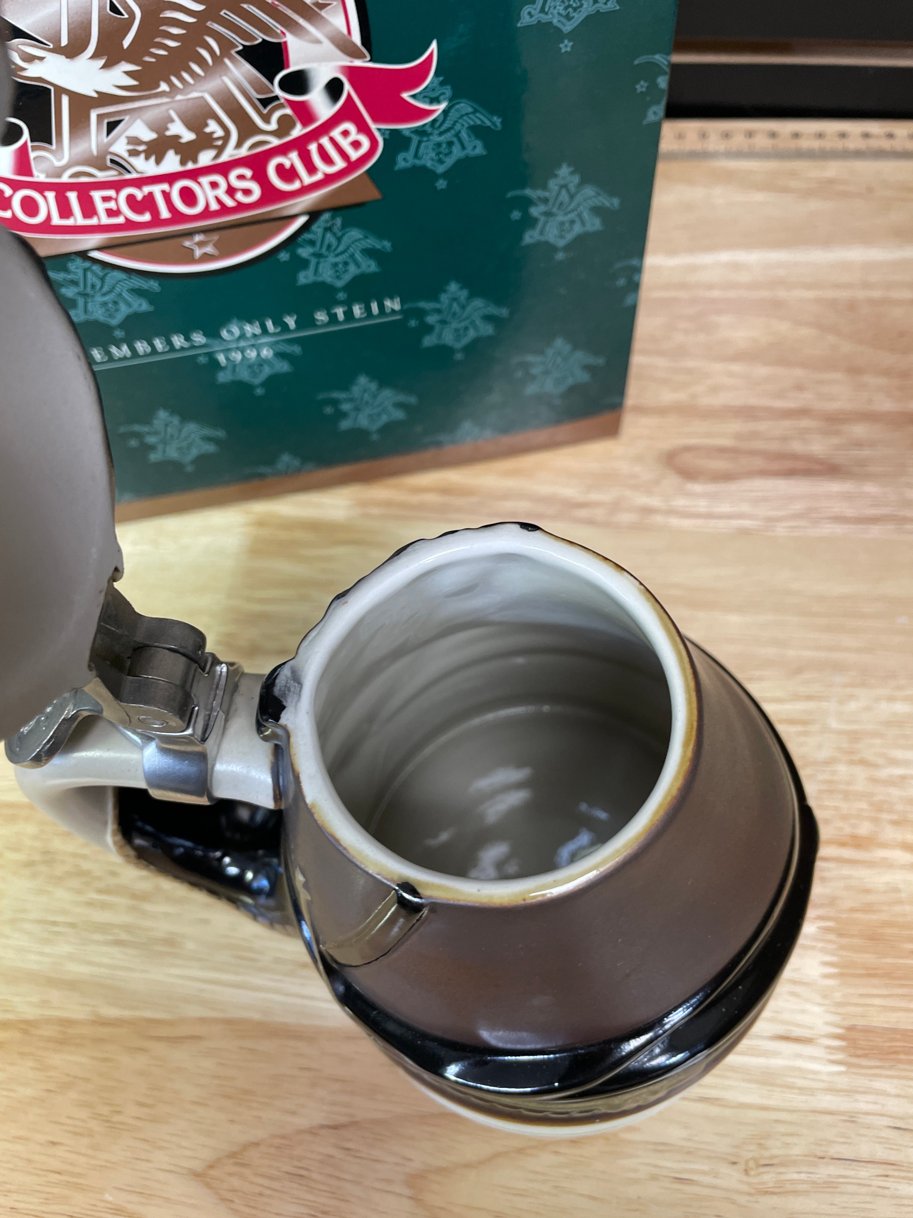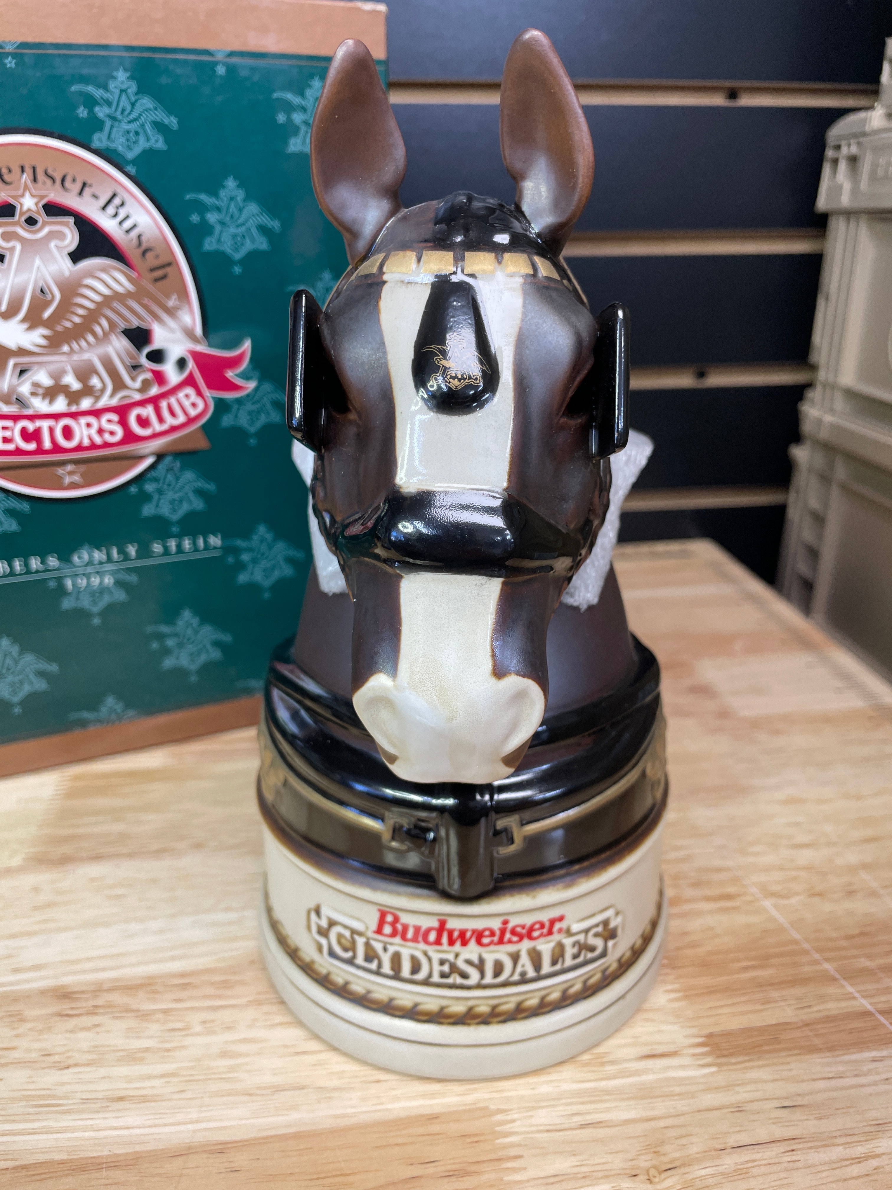 One brown, black, and cream ceramic Budweiser Clydesdales stein with a silver-tone metal lid, labeled “King—A Regal Spirit” 1996 Anheuser-Busch Collectors Club, accompanied by its original green box.