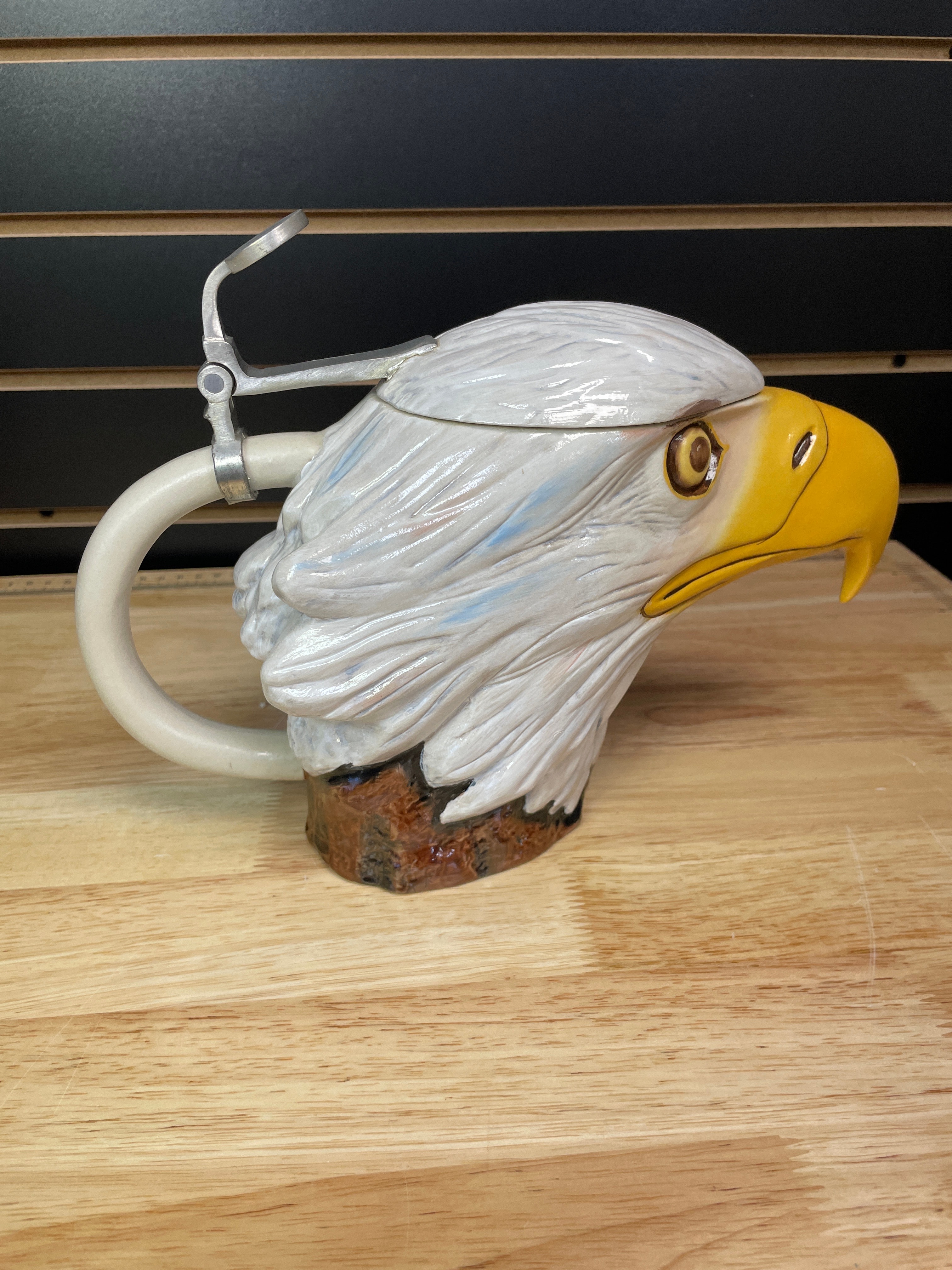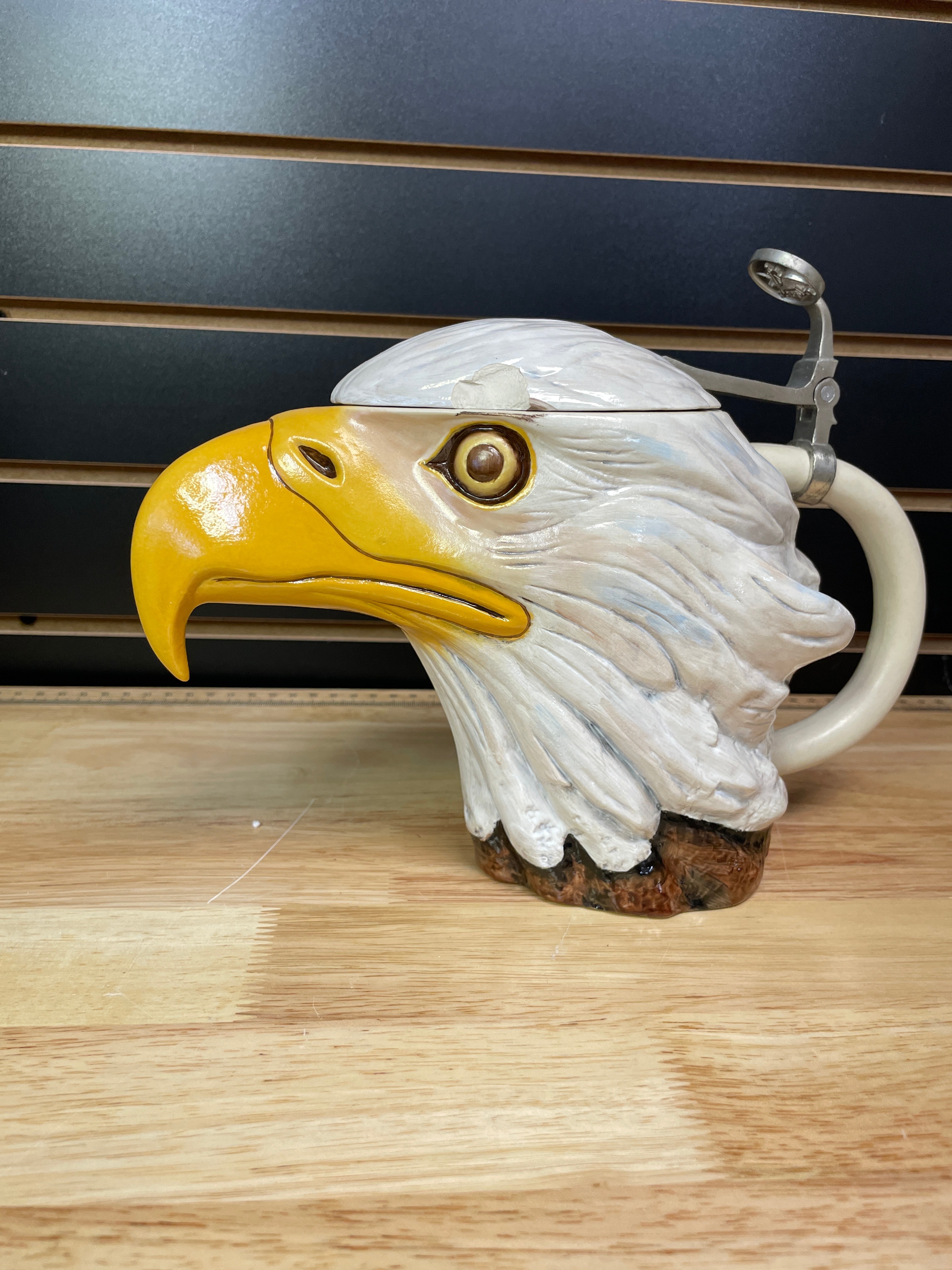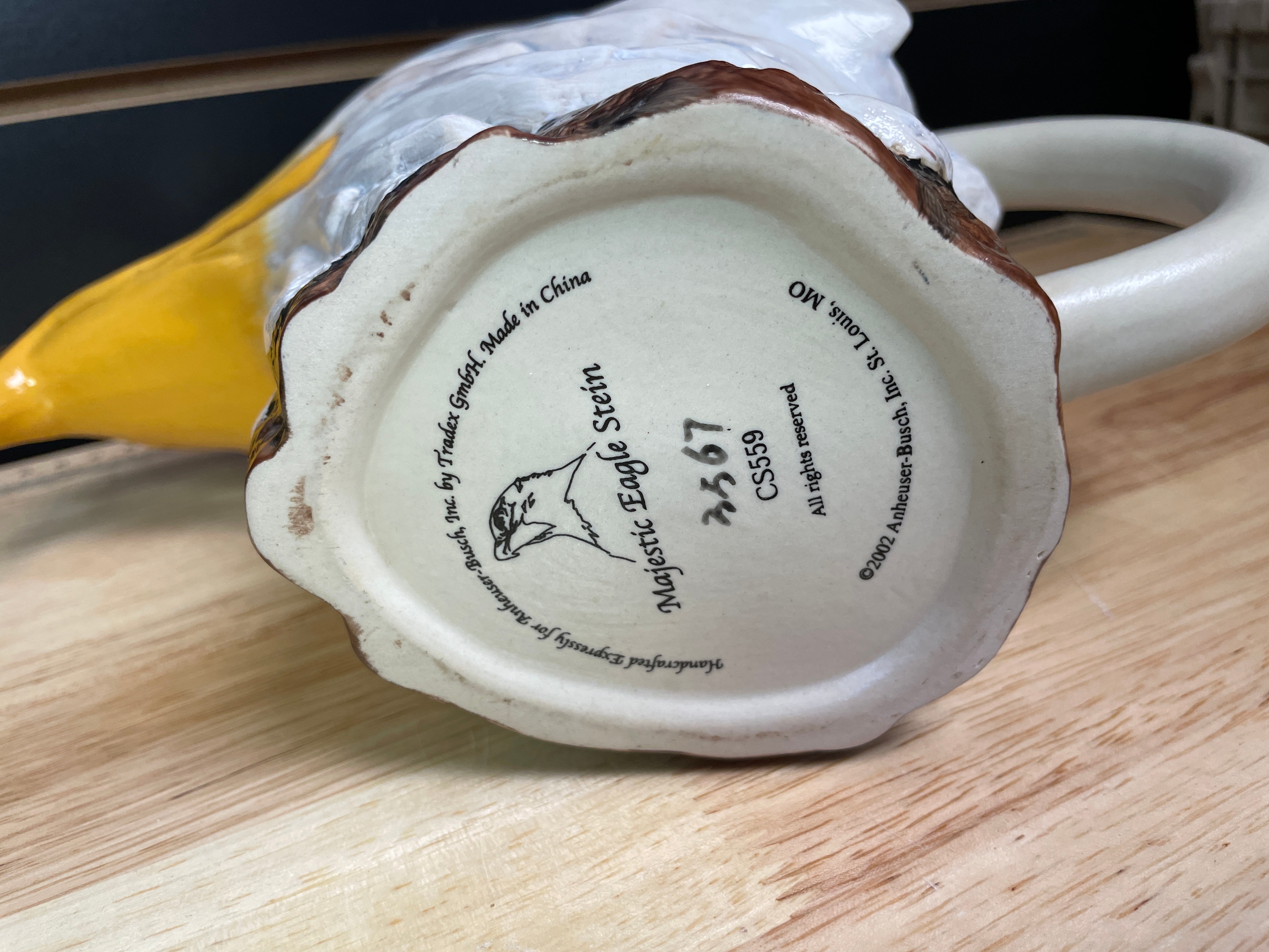 A white, yellow, and brown bald eagle head stein with a silver hinged lid, marked “Majestic Eagle Stein” and “CS559”, handcrafted for Anheuser-Busch, Inc. in 2002.
