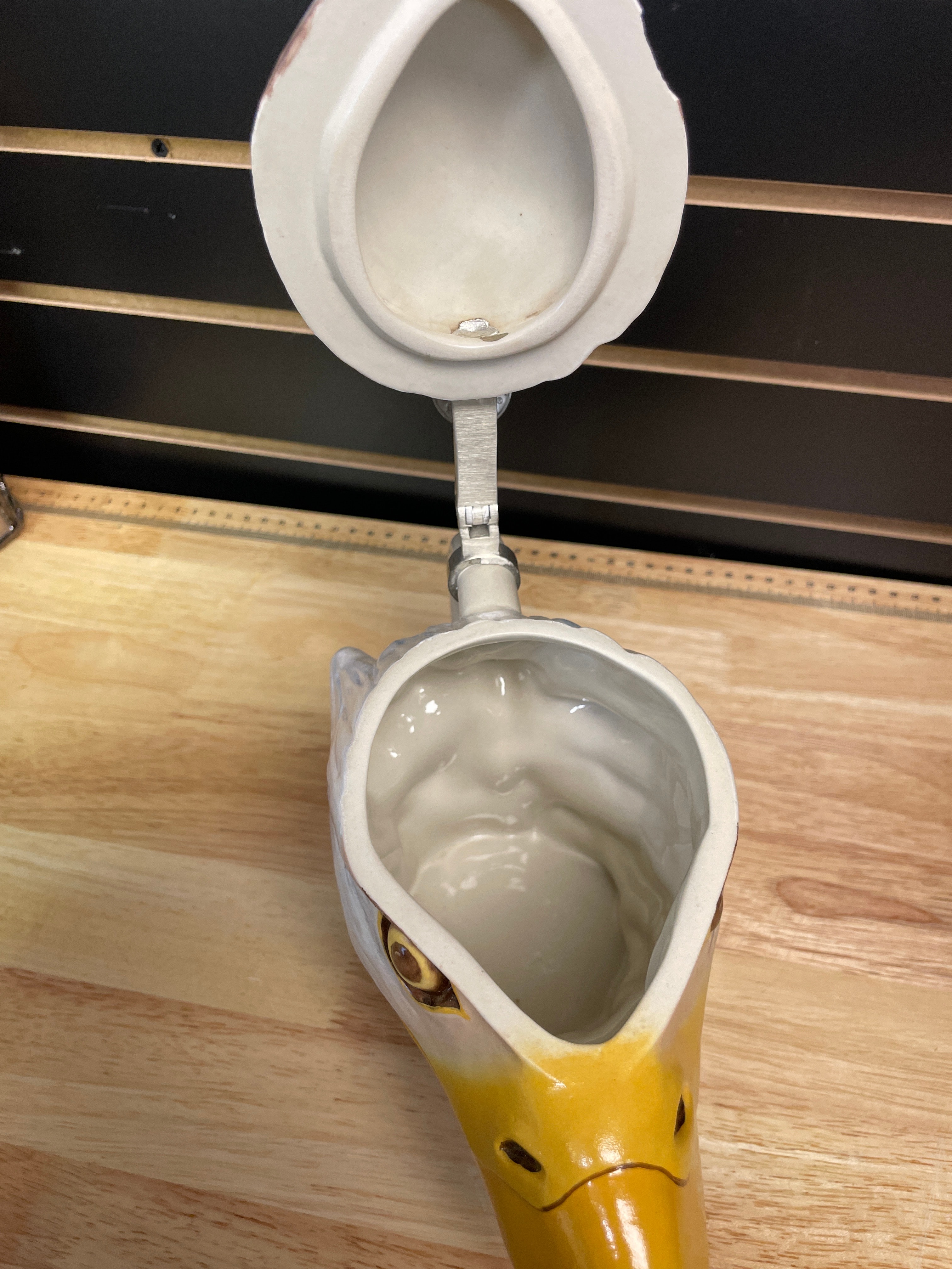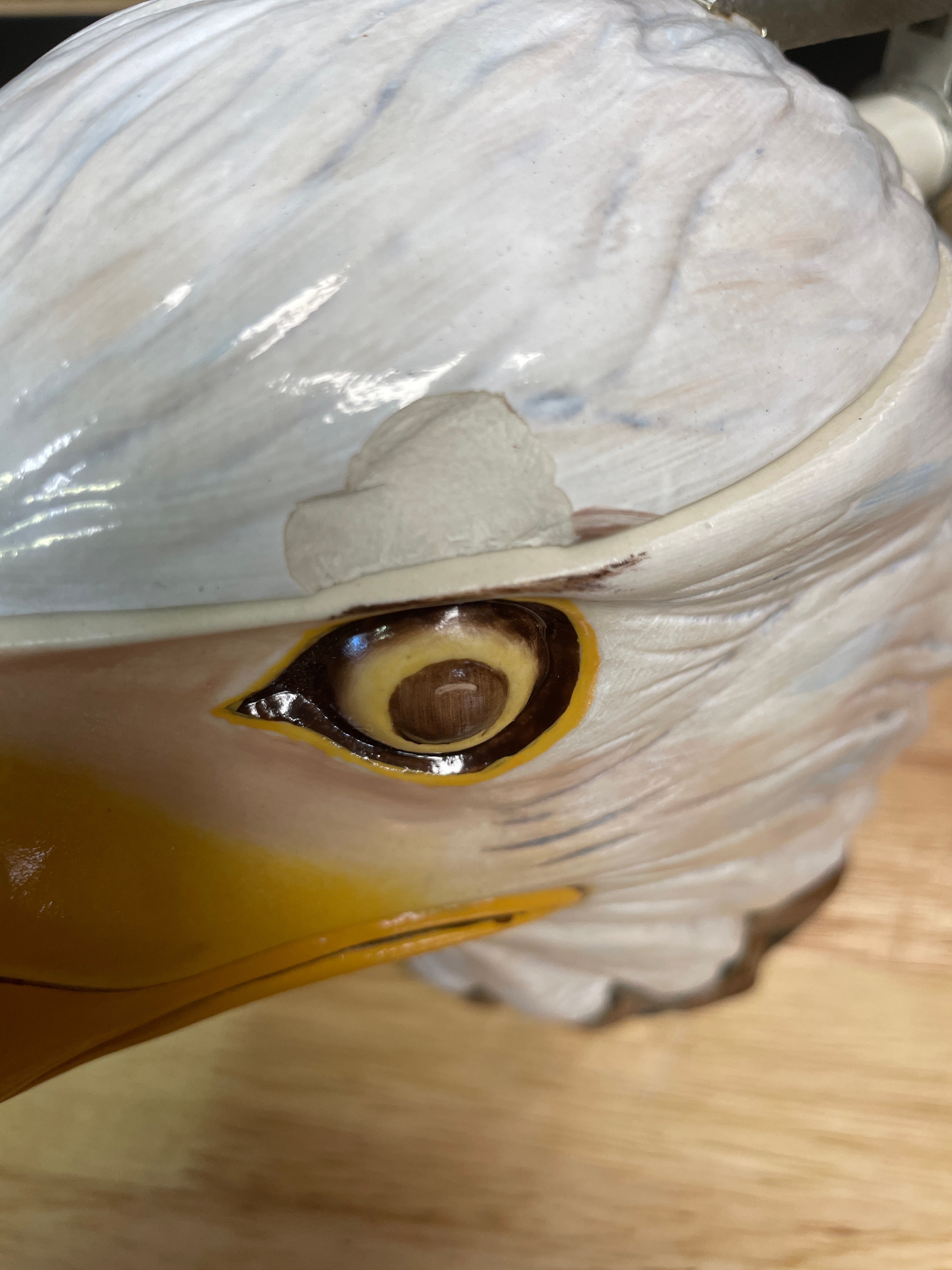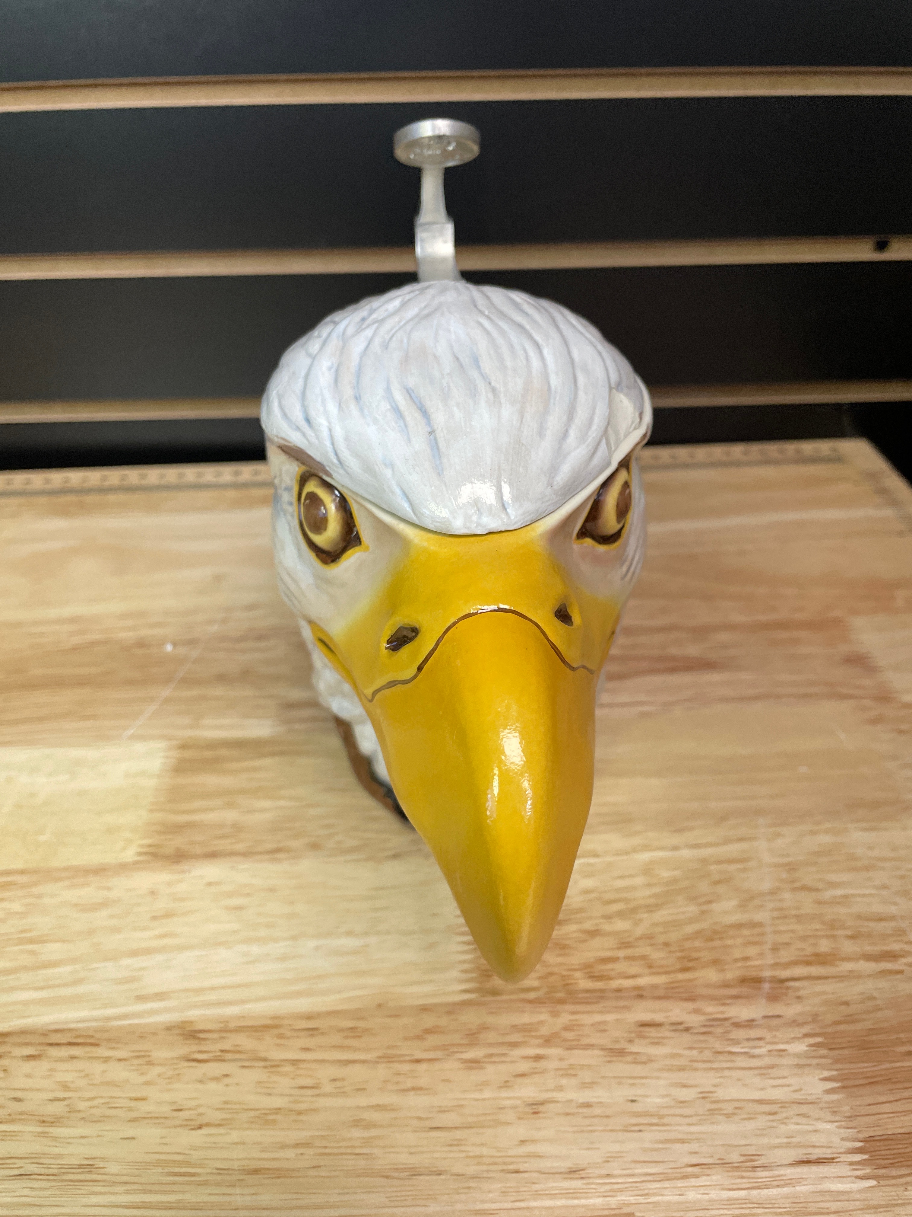 A white, yellow, and brown bald eagle head stein with a silver hinged lid, marked “Majestic Eagle Stein” and “CS559”, handcrafted for Anheuser-Busch, Inc. in 2002.