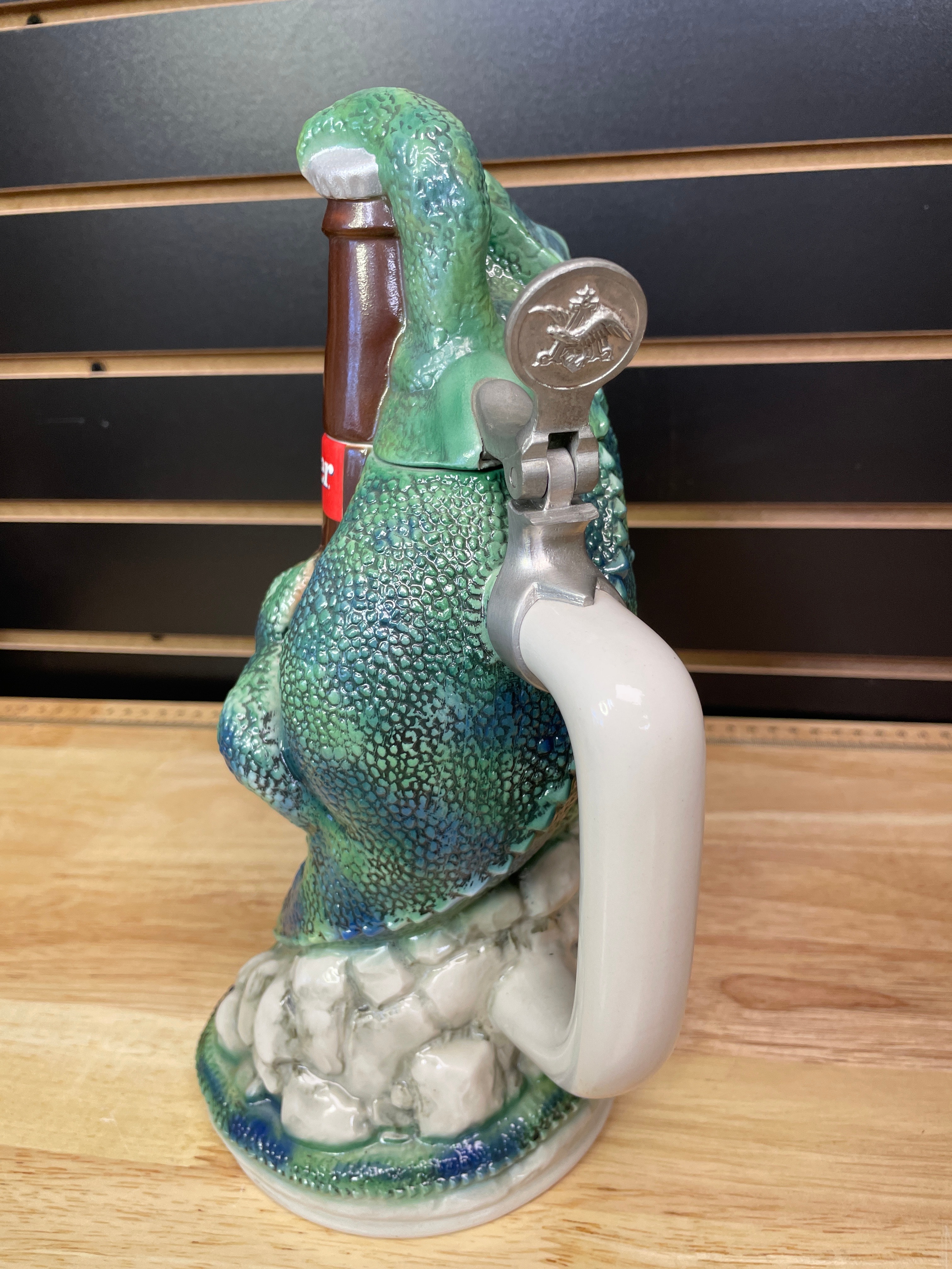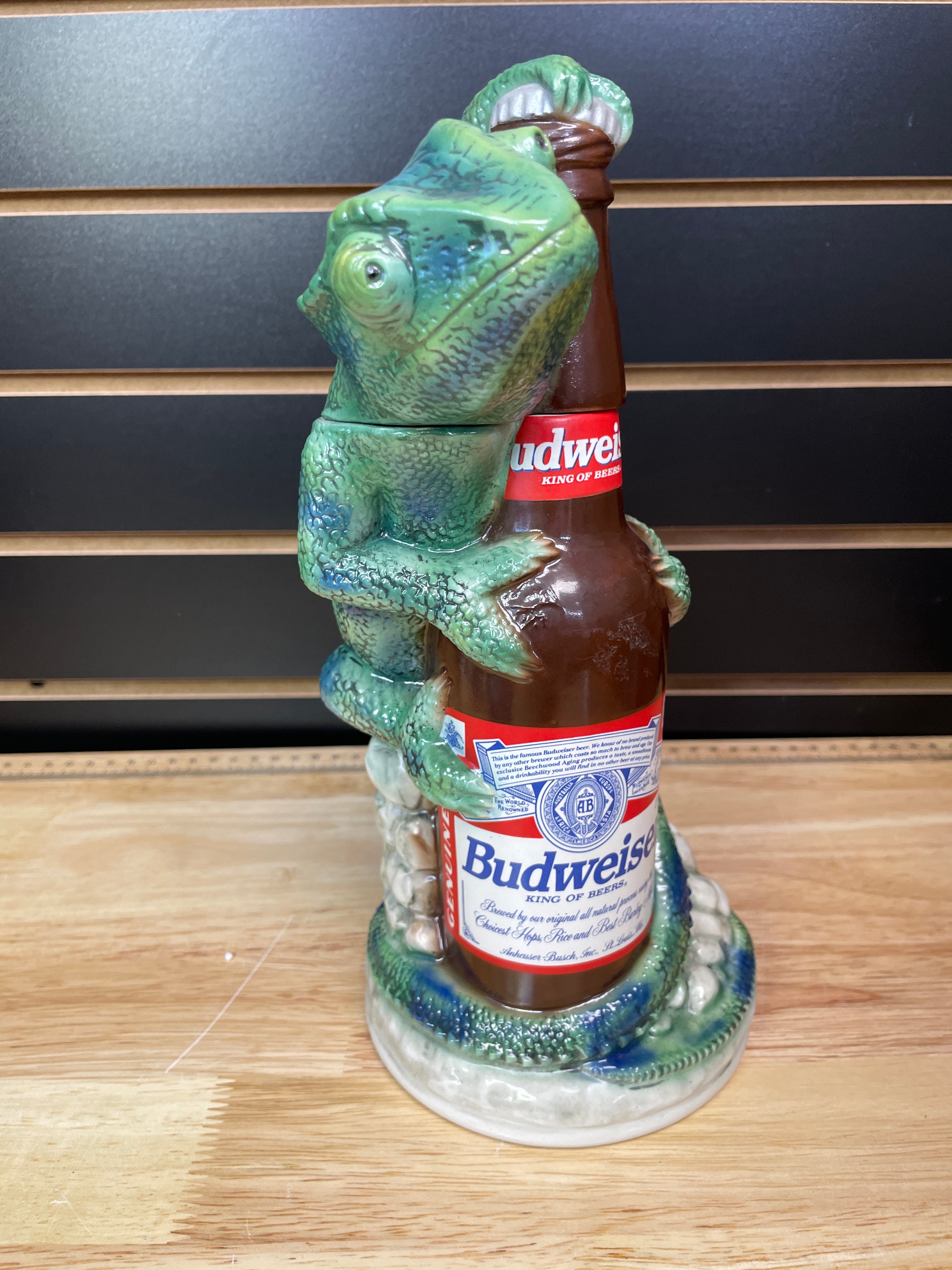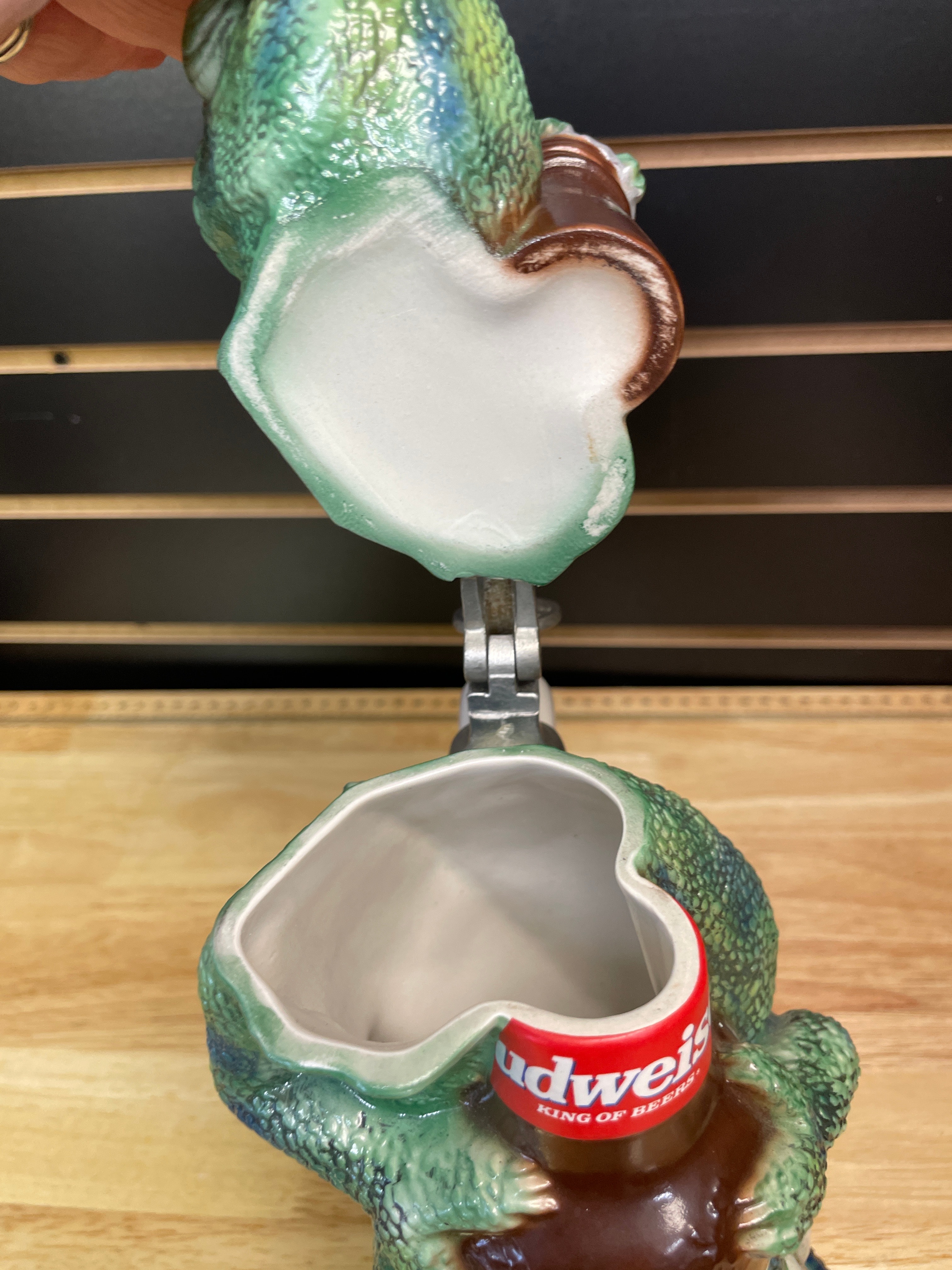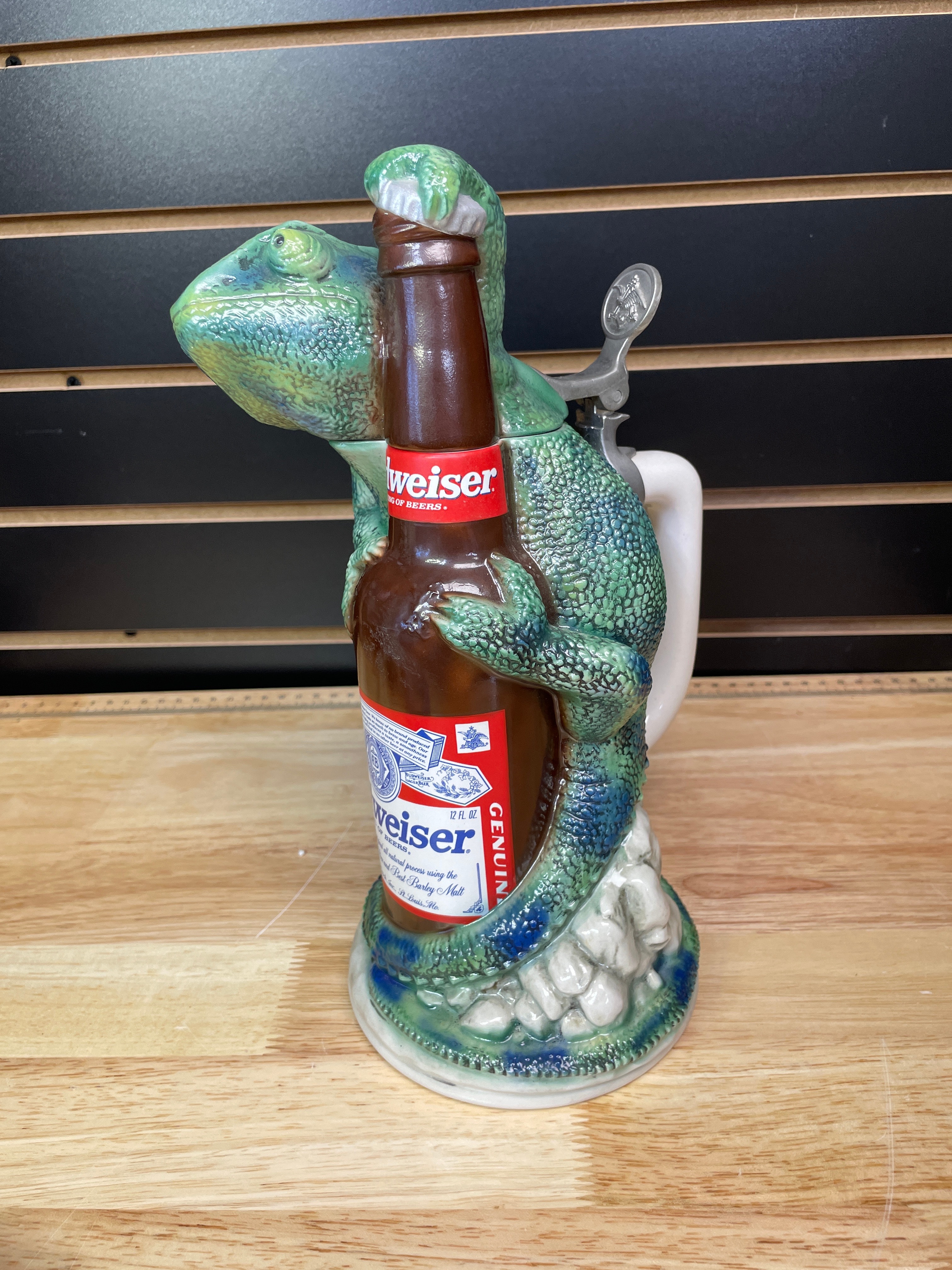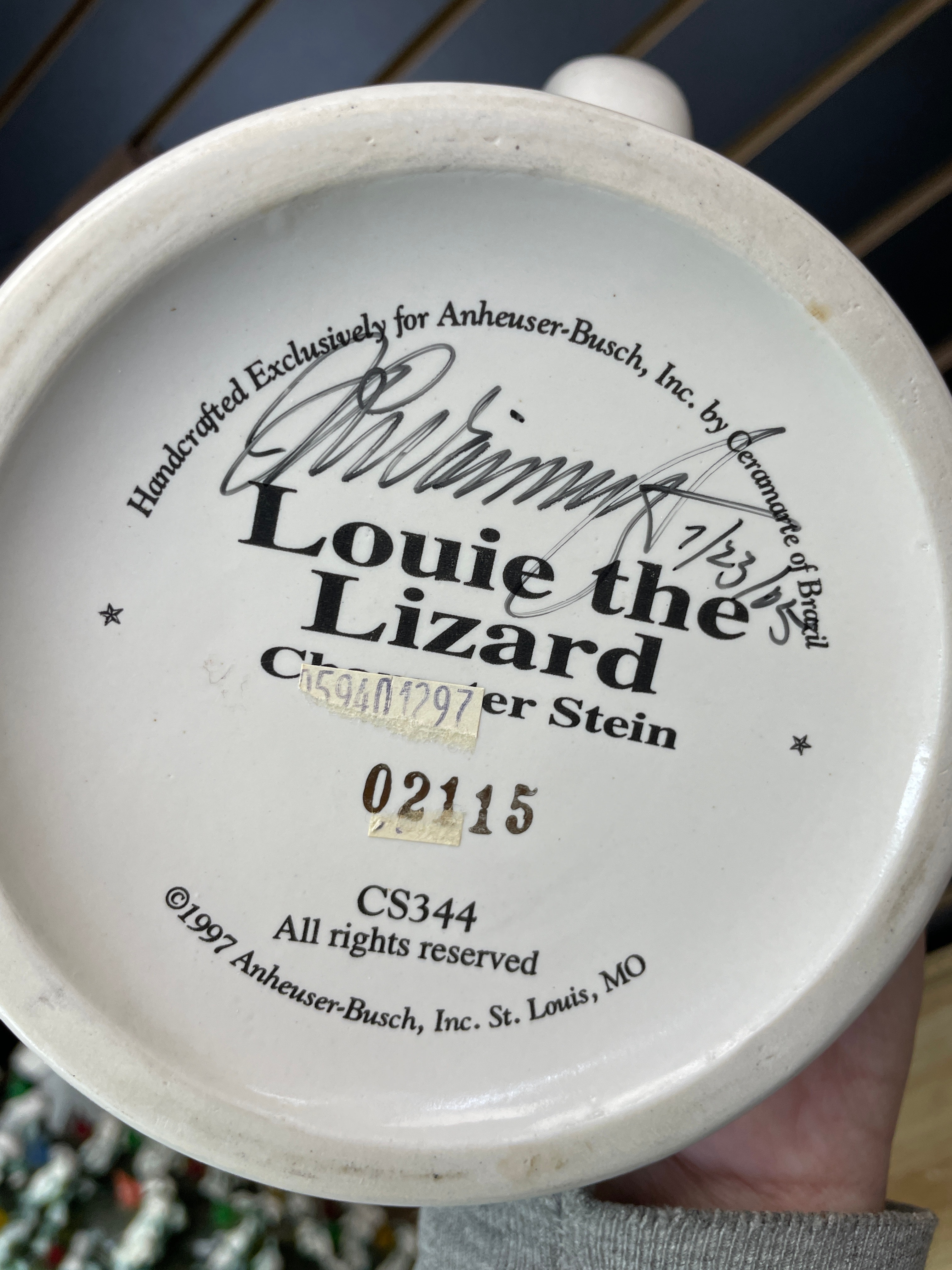 A green and blue ceramic beer stein shaped like a chameleon lizard hugging a Budweiser bottle, featuring a white handle, silver-colored metal lid, and marked ‘Louie the Lizard Ceramic Beer Stein’ by Ceramarte of Brazil for Anheuser-Busch, Inc. ©1997.