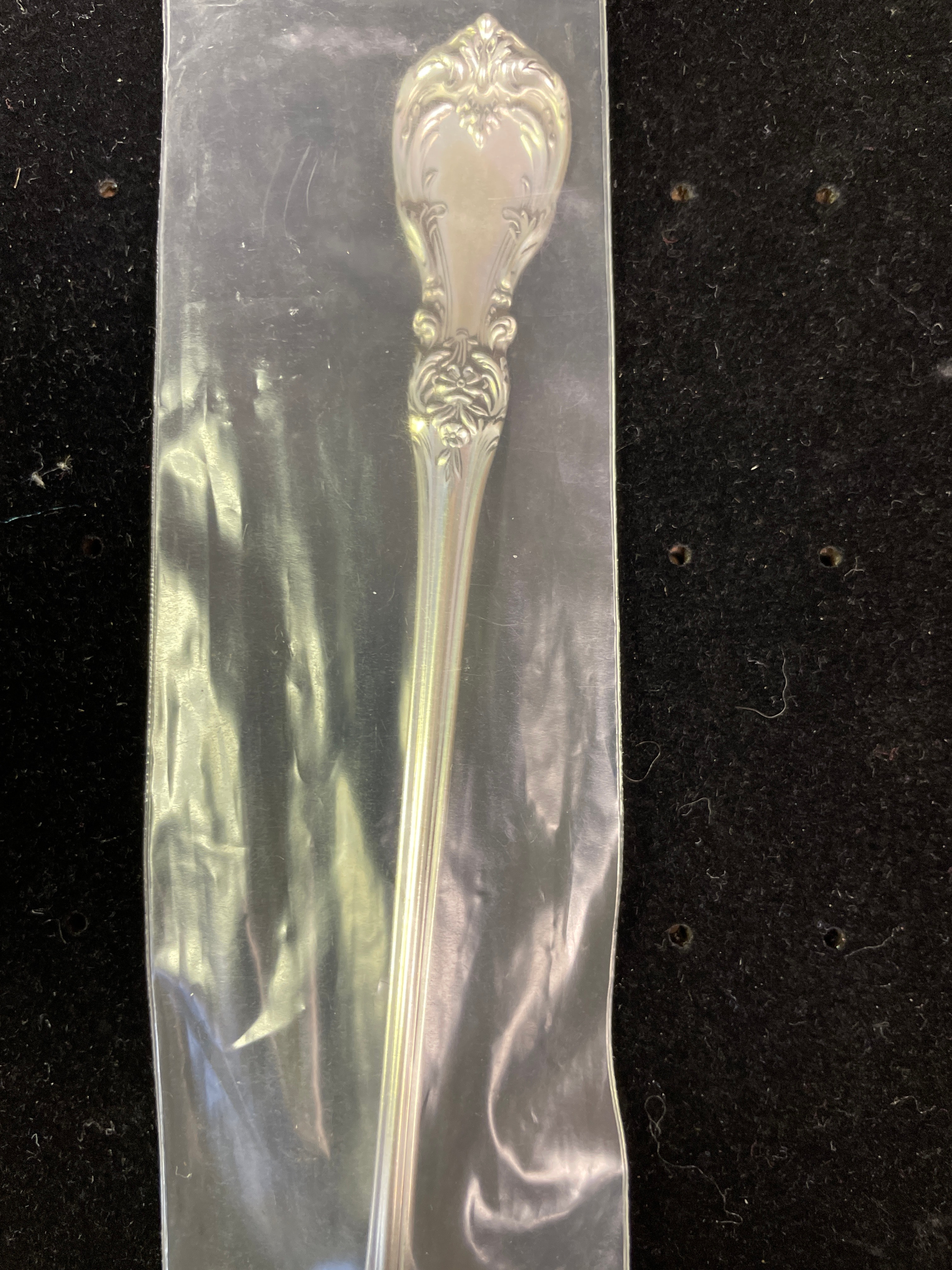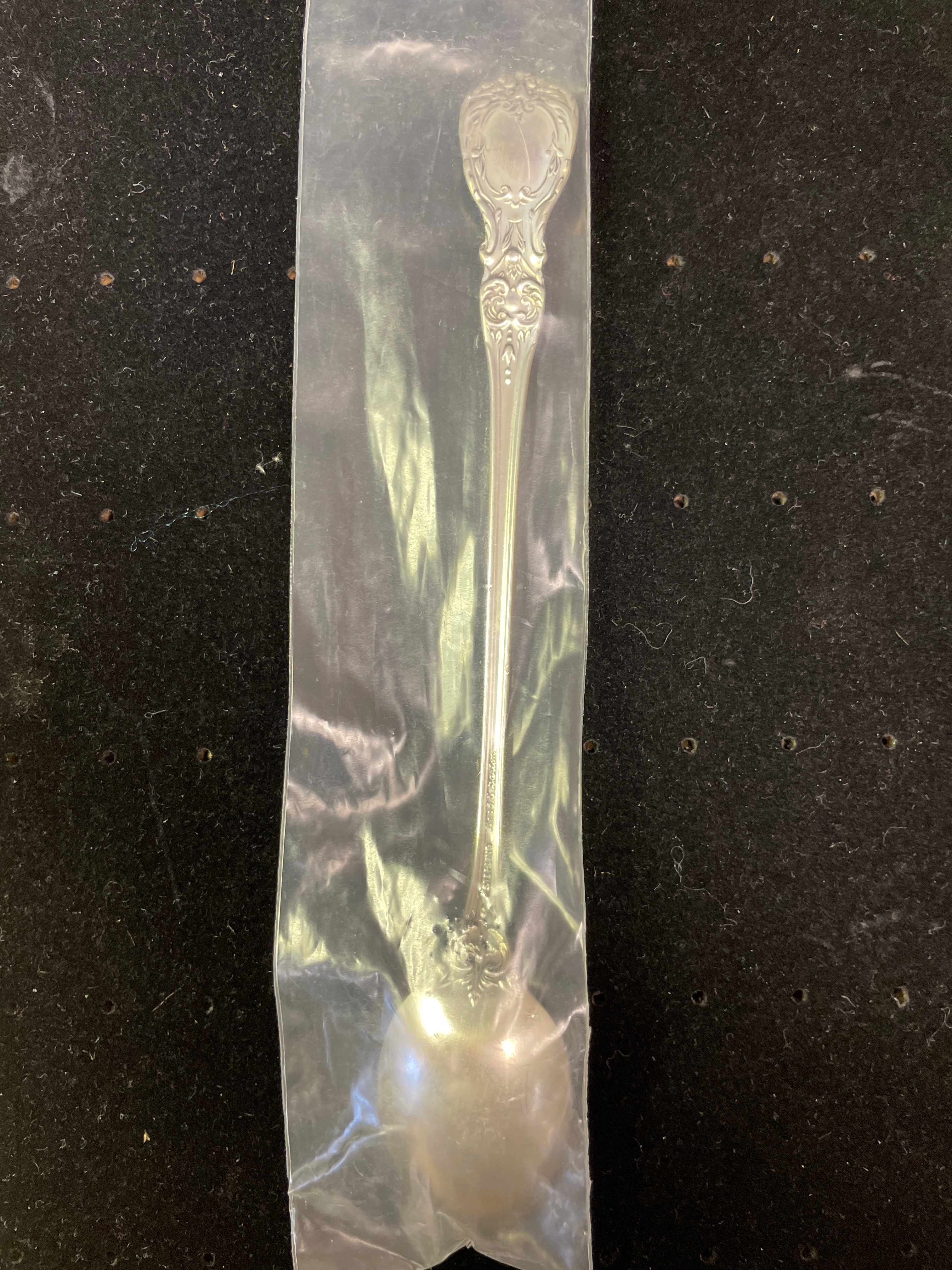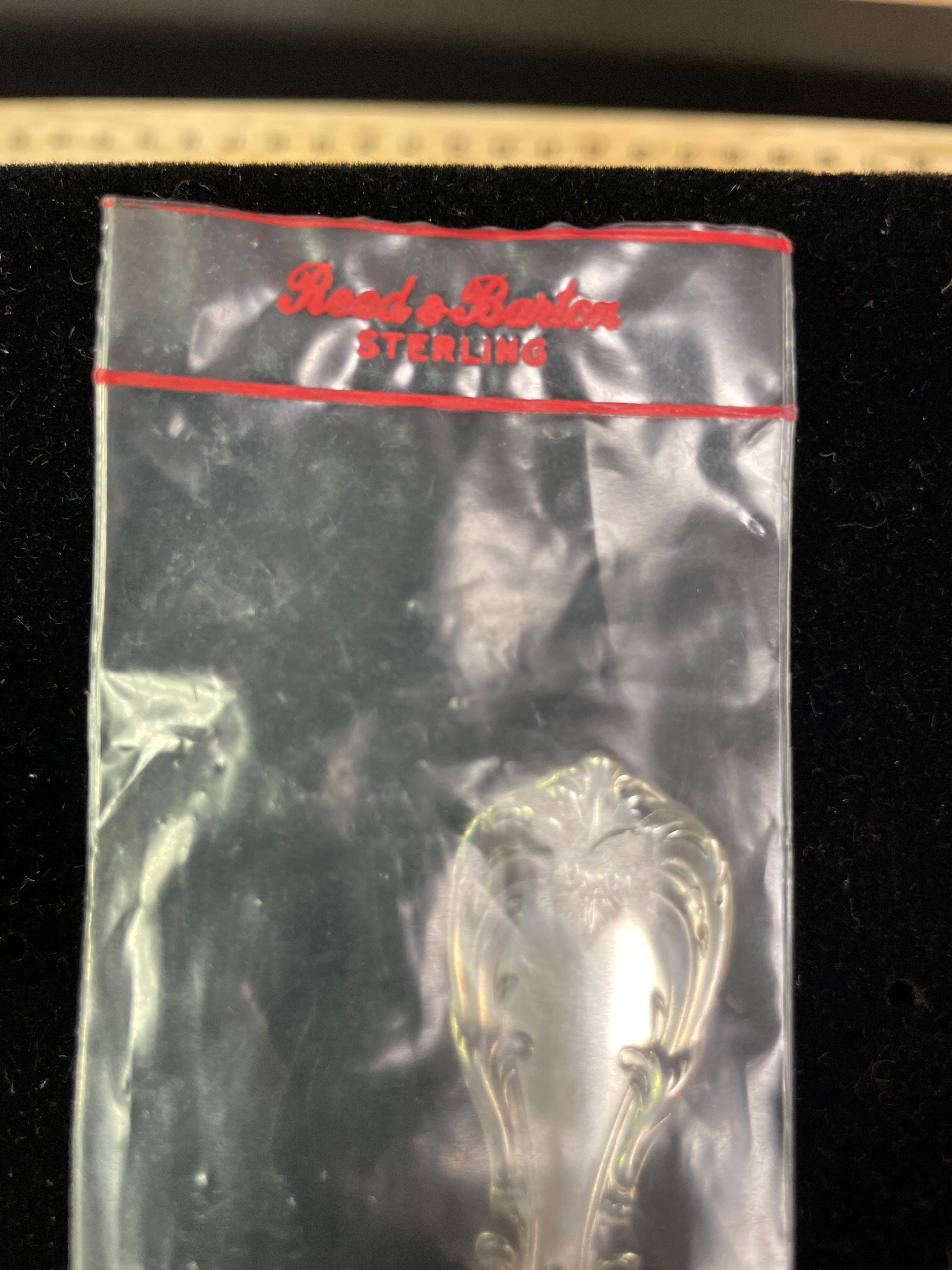 A single ornate silver 1oz sterling spoon by Reed & Barton, marked “Reed & Barton STERLING” on its handle and sealed in its original plastic packaging.