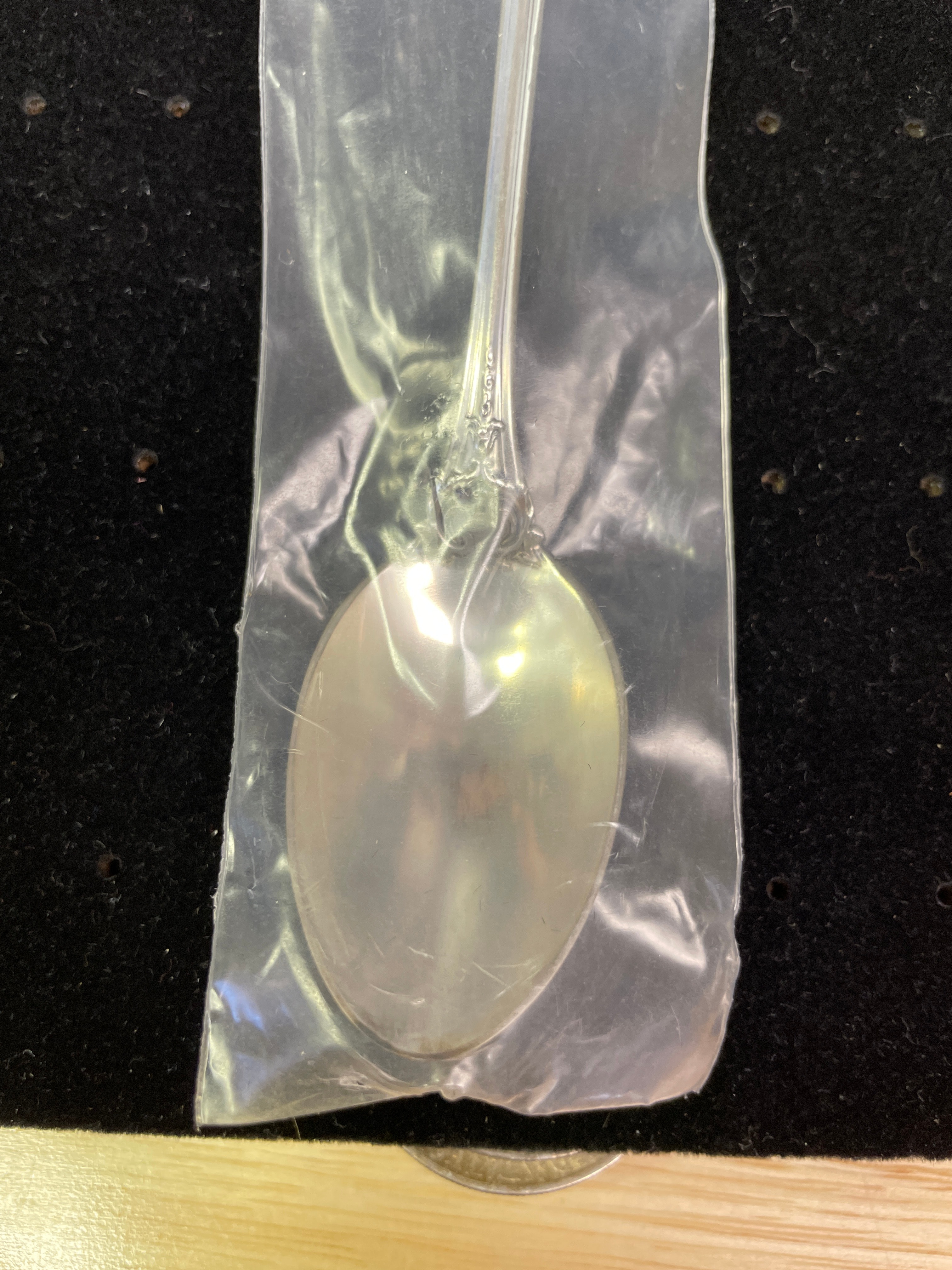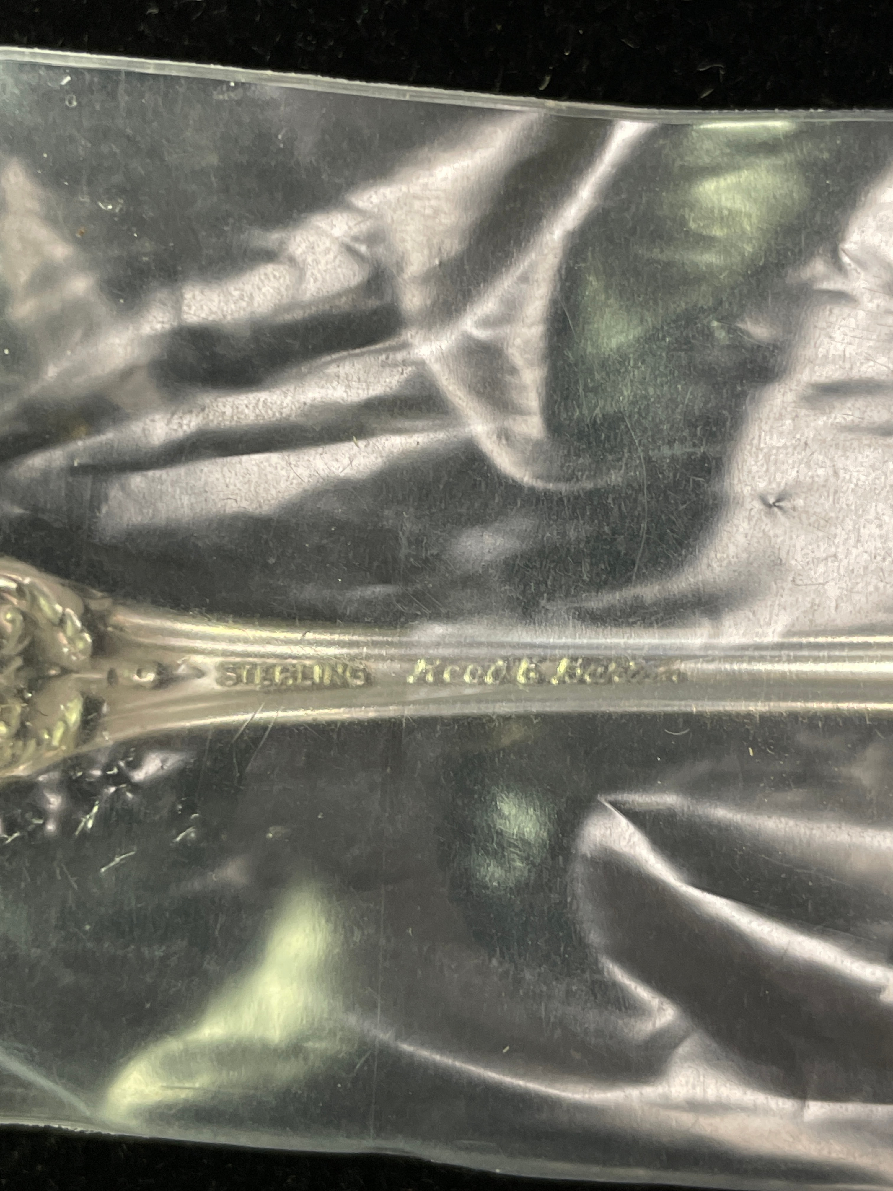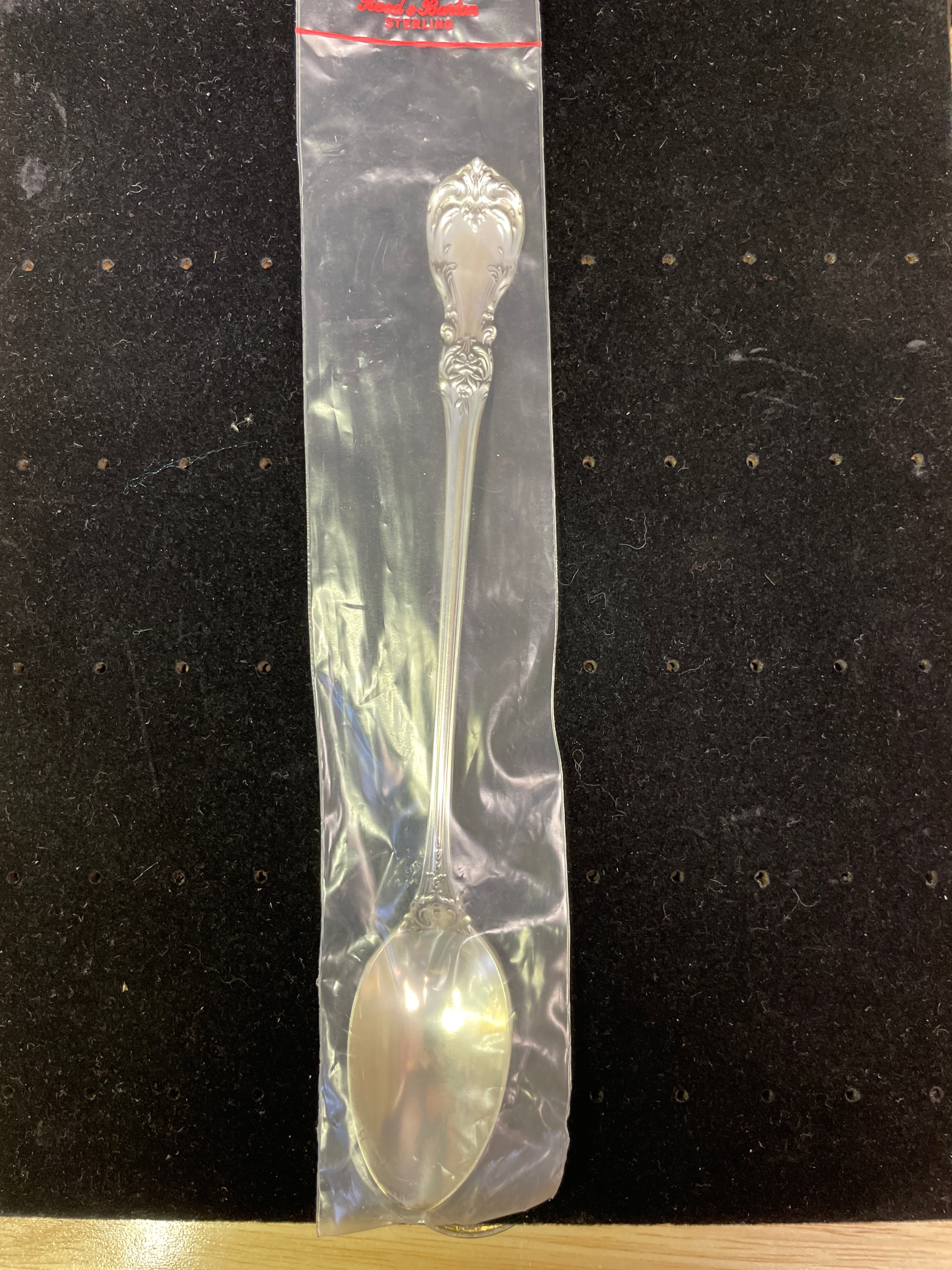 A single ornate silver 1oz sterling spoon by Reed & Barton, marked “Reed & Barton STERLING” on its handle and sealed in its original plastic packaging.