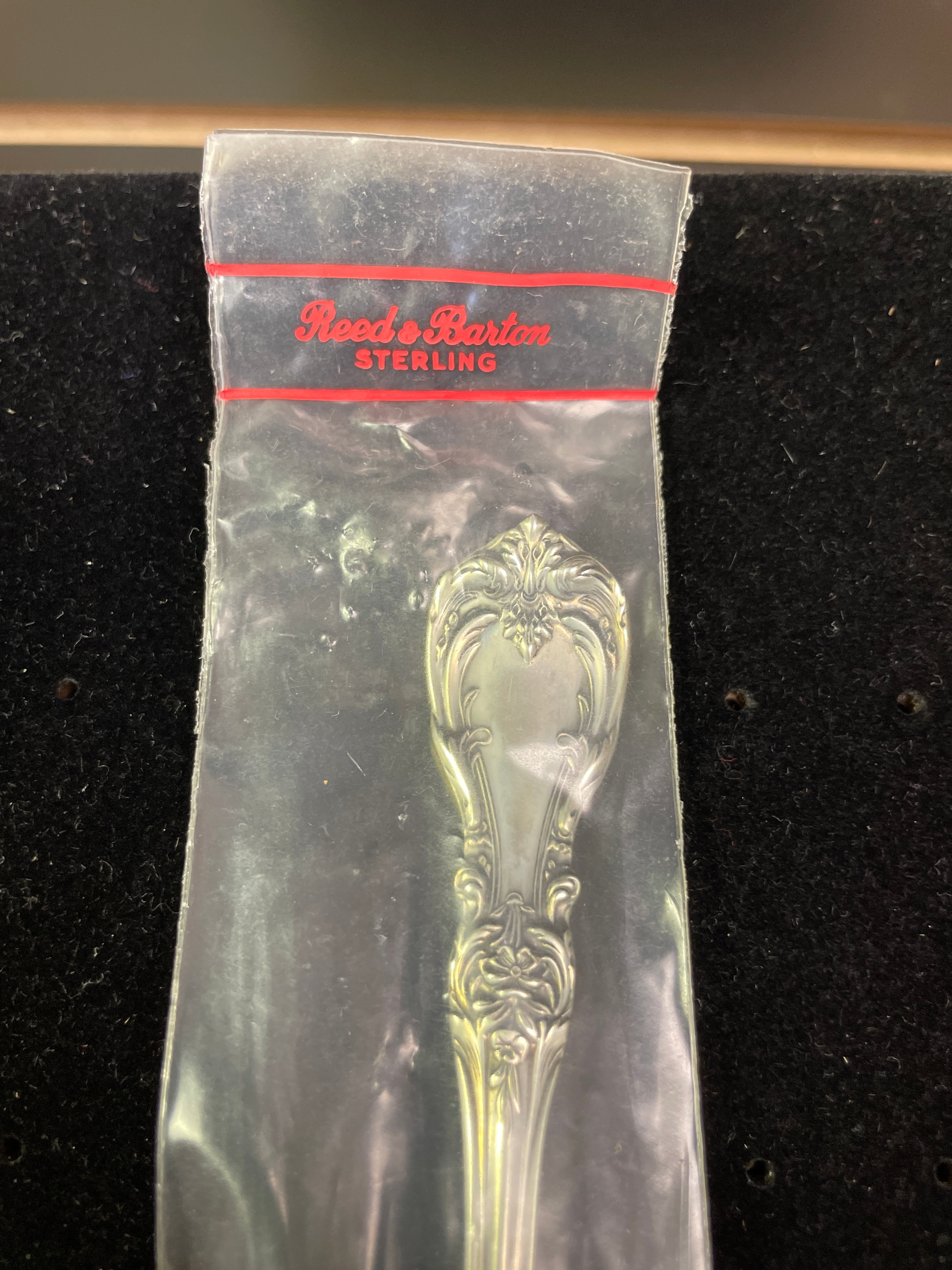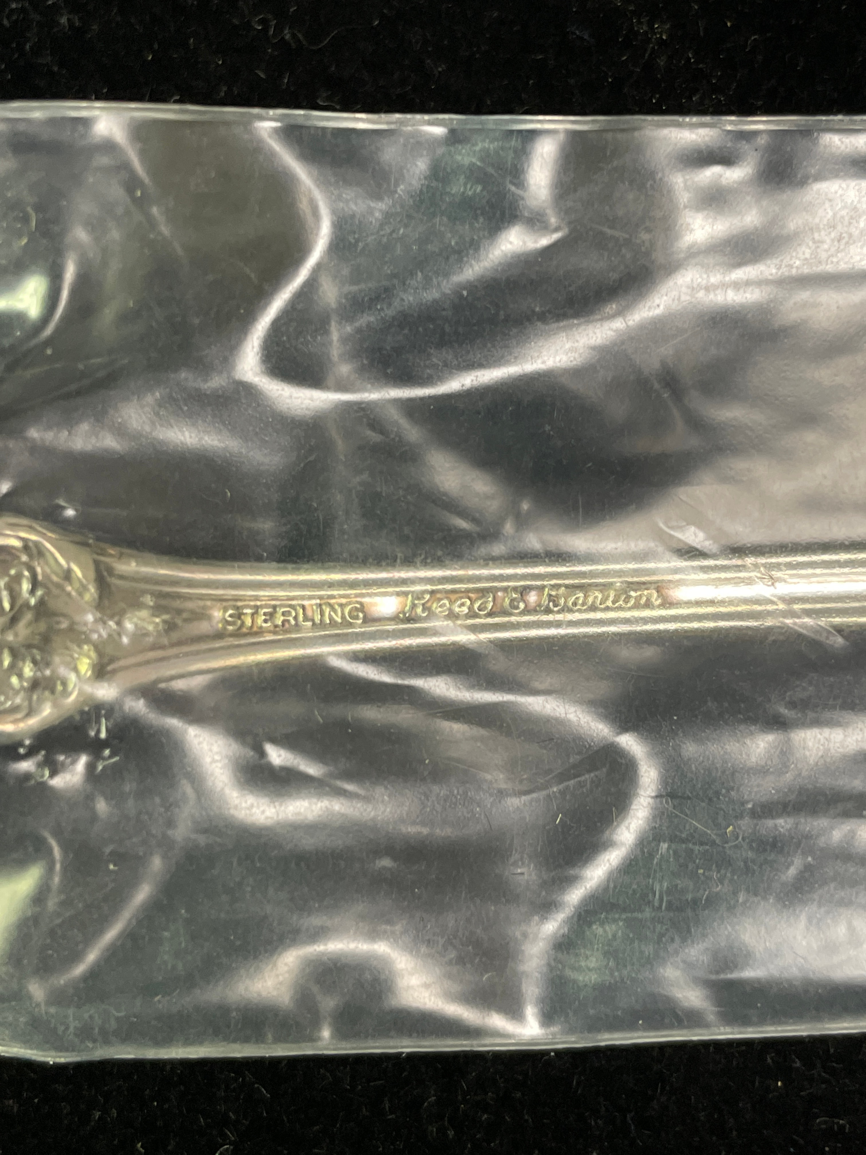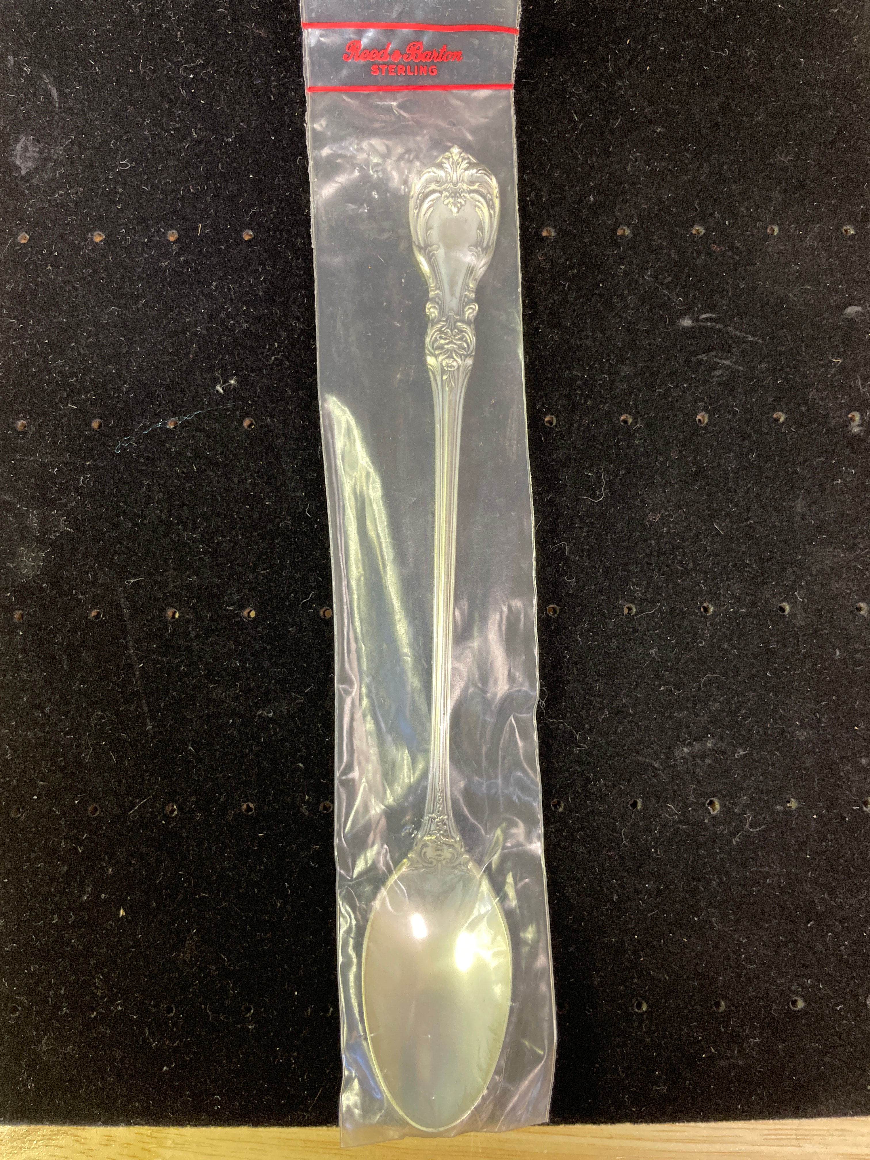 A silver sterling spoon by Reed & Barton, still in its original plastic packaging labeled “Reed & Barton STERLING”, with “STERLING Reed & Barton” also visible on the handle.