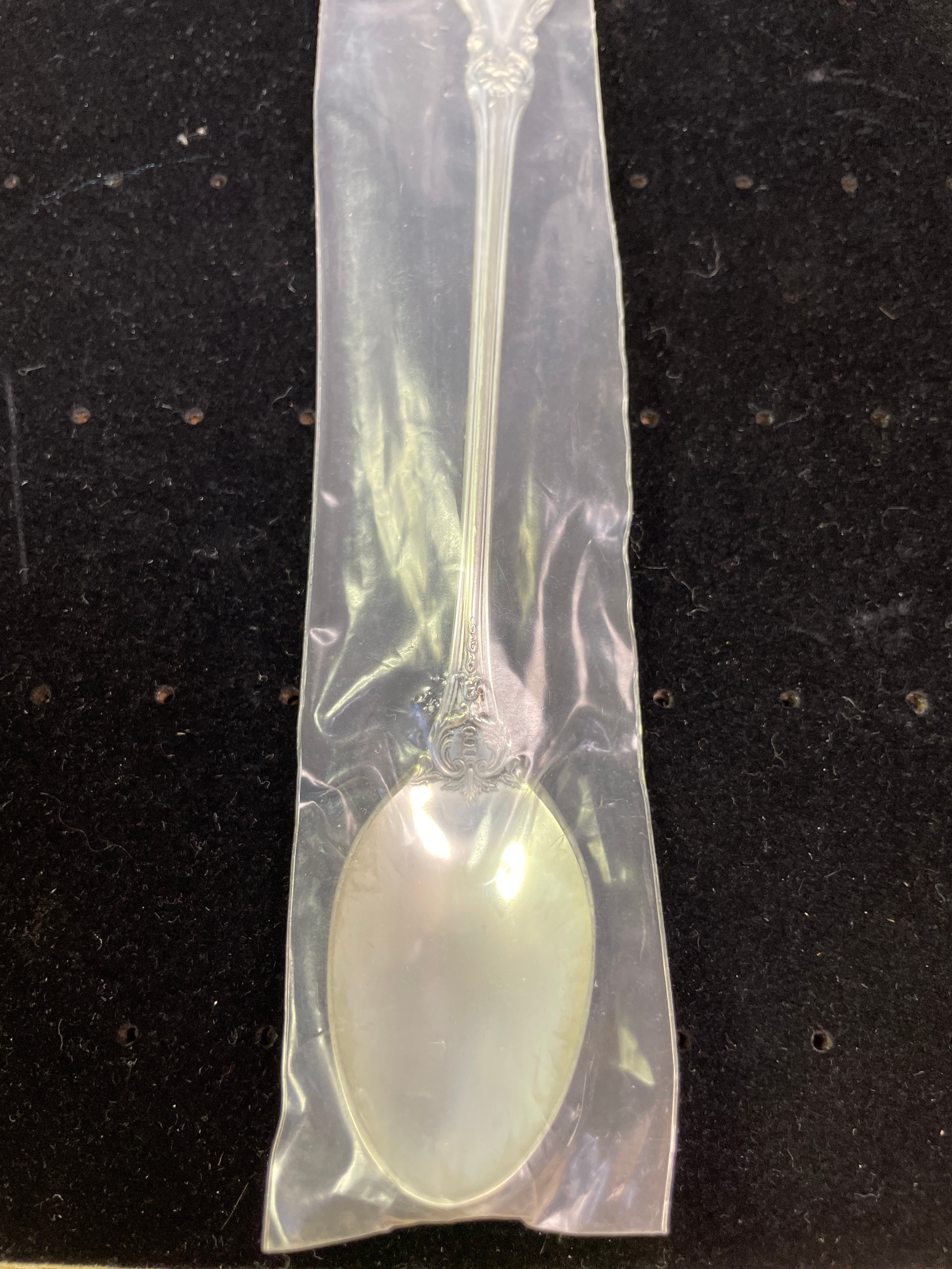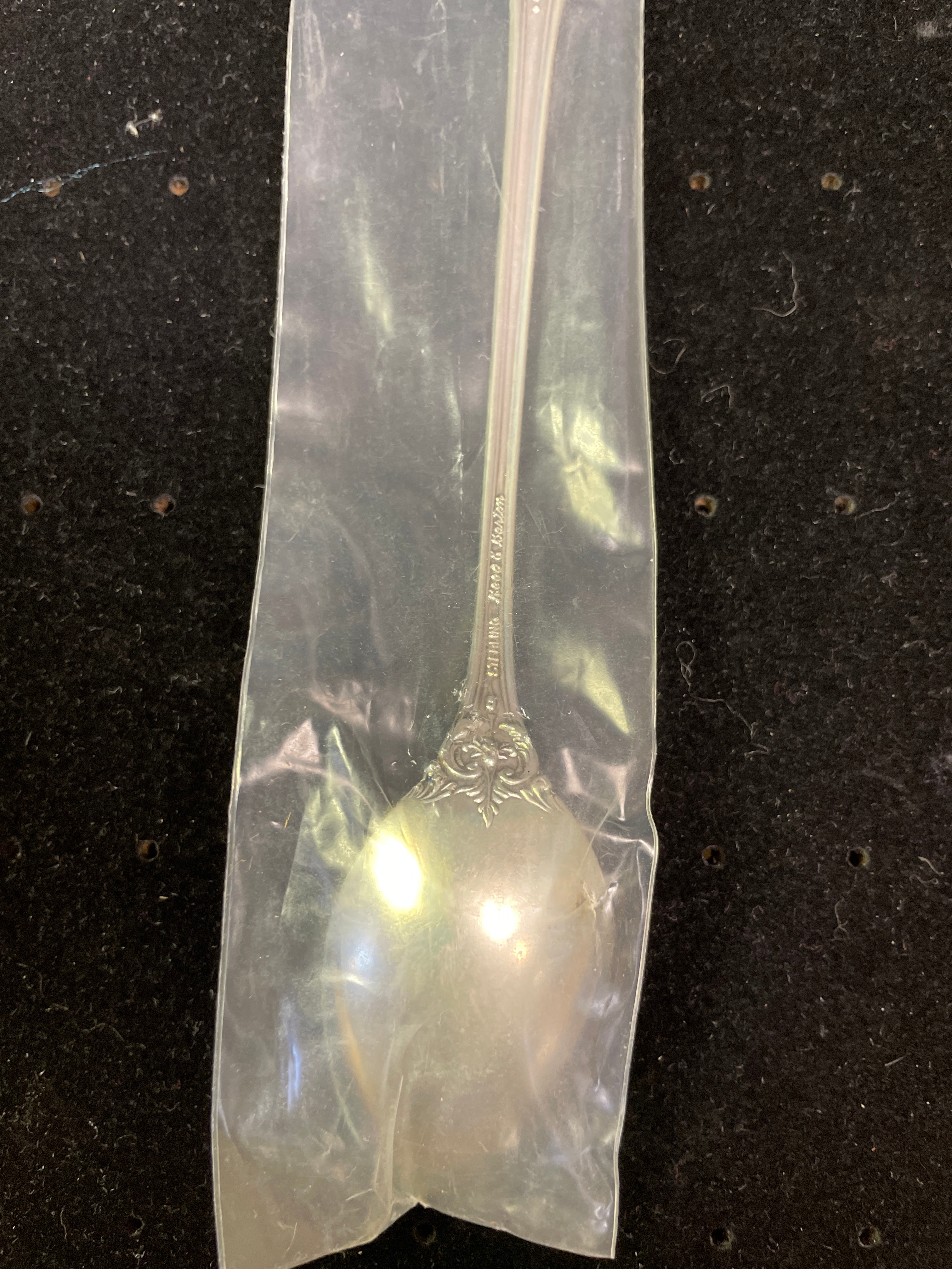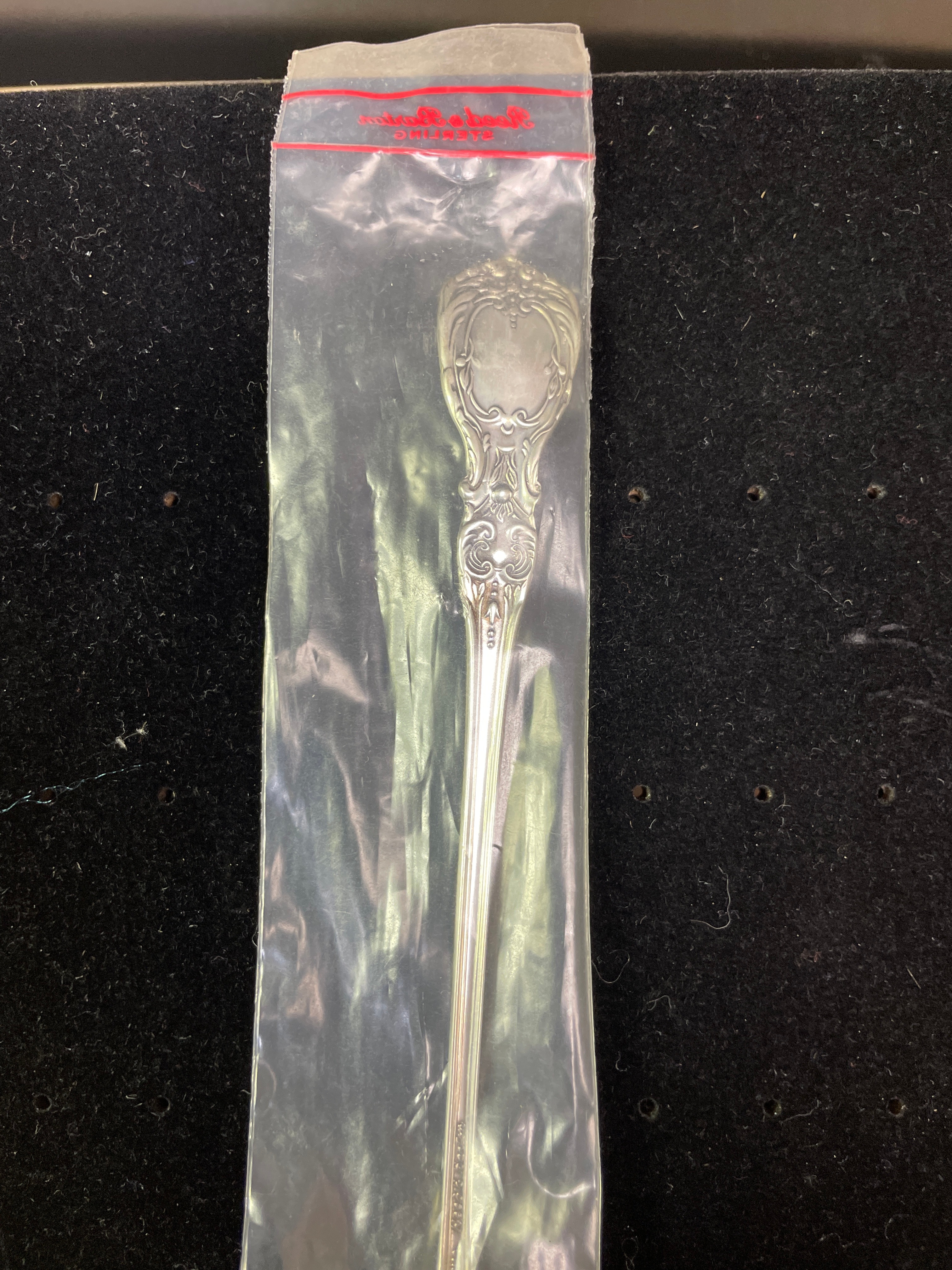 A silver sterling spoon by Reed & Barton, still in its original plastic packaging labeled “Reed & Barton STERLING”, with “STERLING Reed & Barton” also visible on the handle.