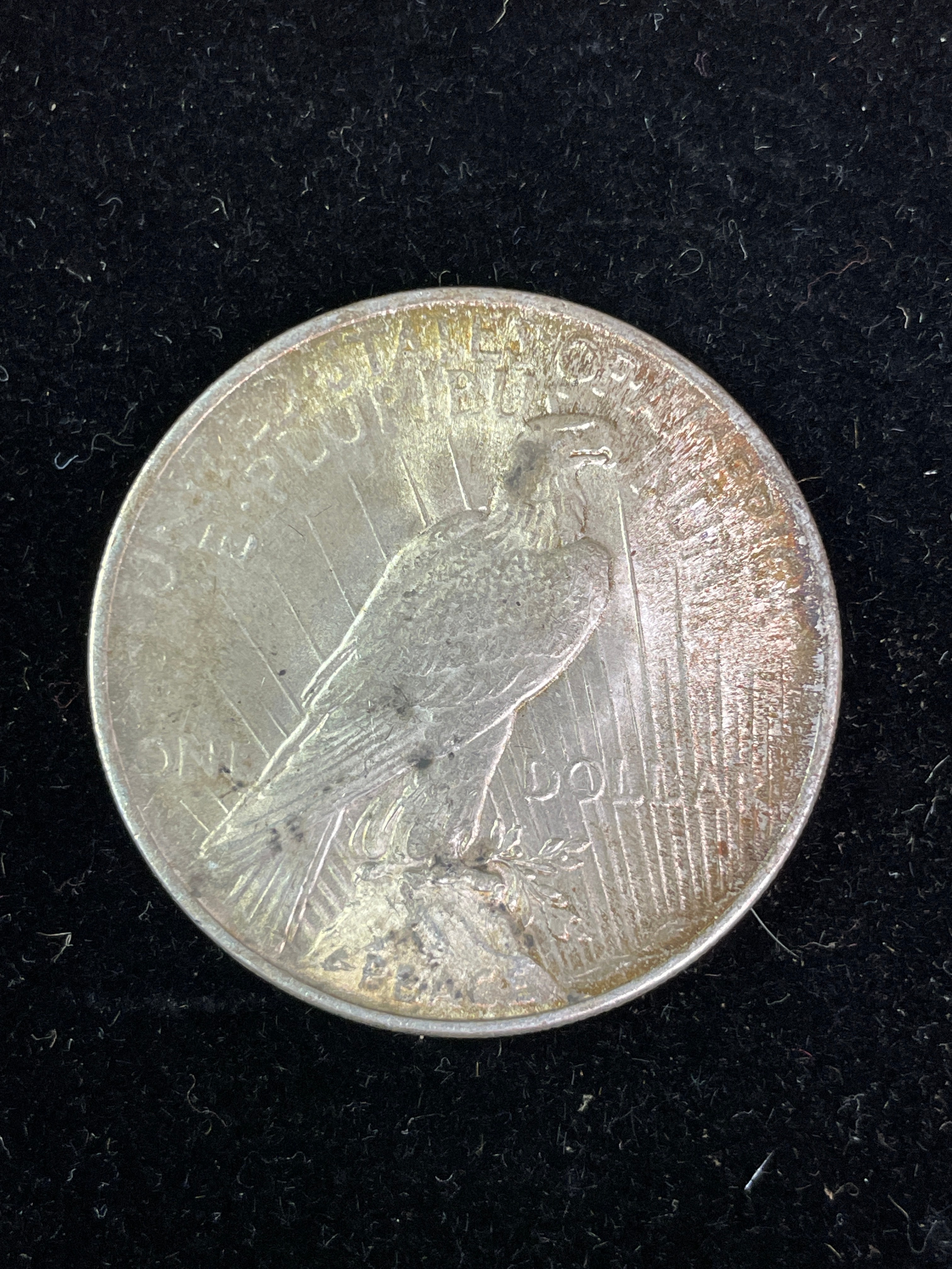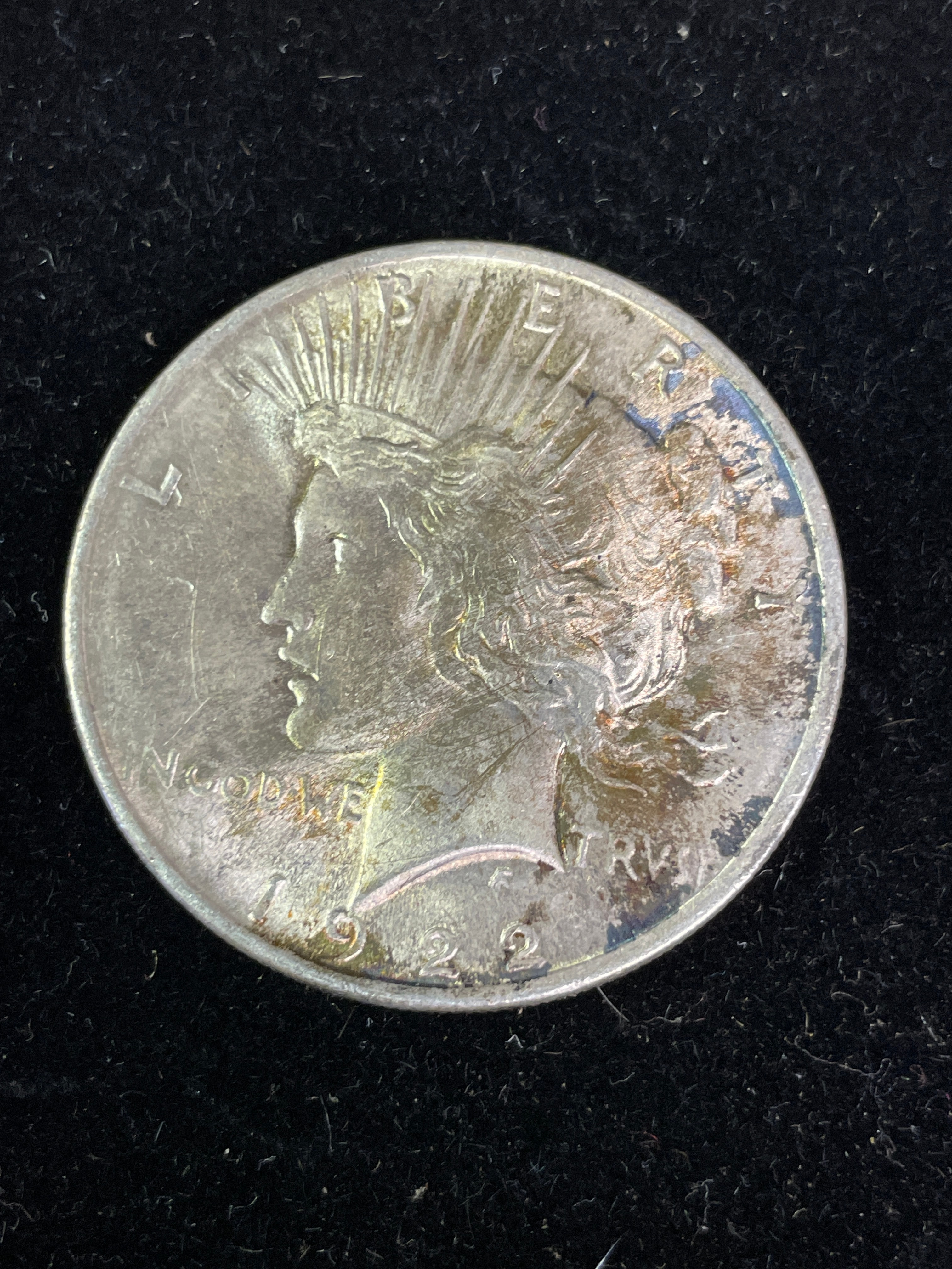 A 1922 Peace Dollar coin, silver-colored, inscribed with ‘LIBERTY’, ‘IN GOD WE TRVST’, ‘UNITED STATES OF AMERICA’, ‘E PLURIBUS UNUM’, ‘ONE DOLLAR’, and ‘PEACE’.