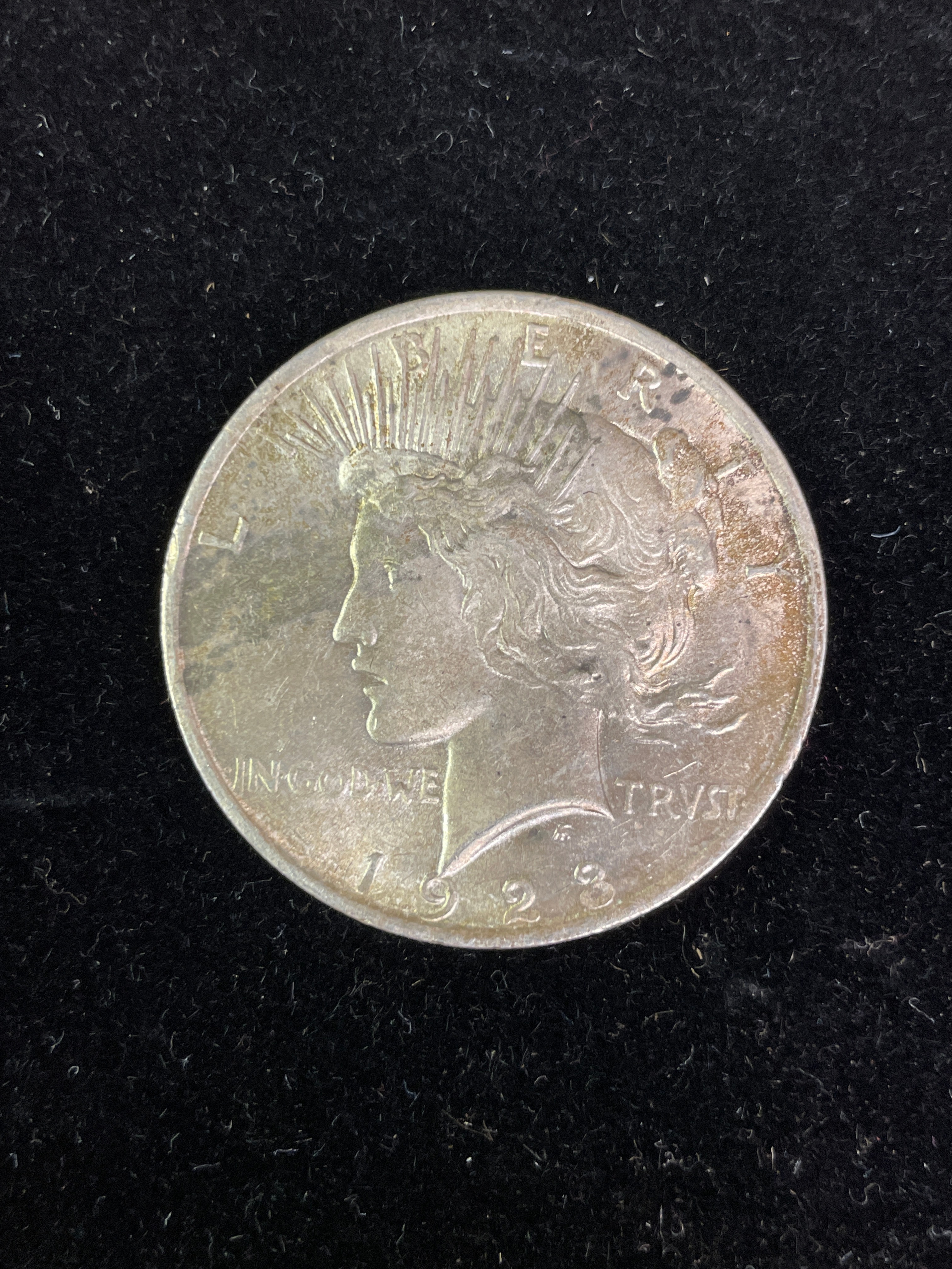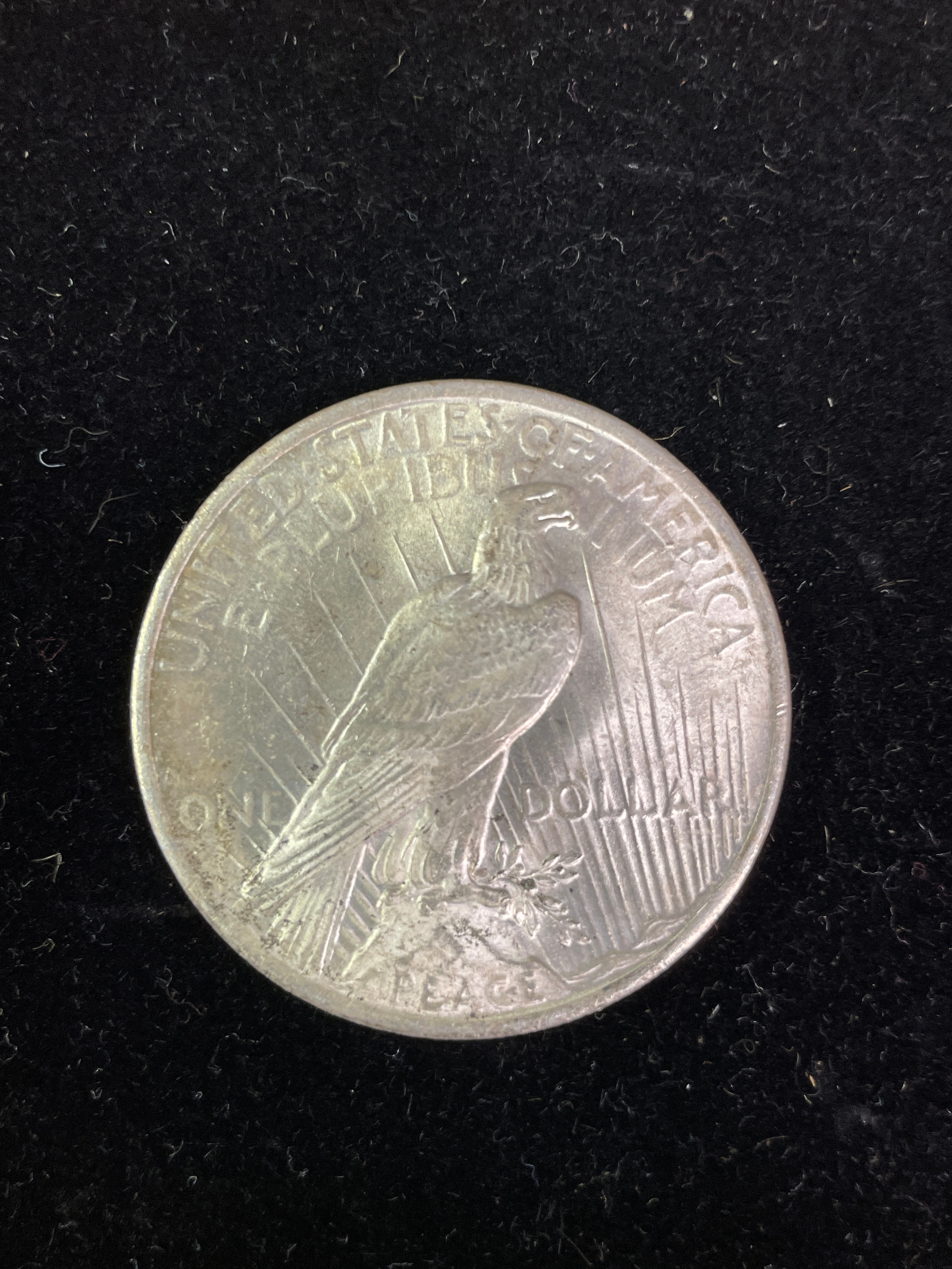 A 1923 silver-colored Peace Dollar coin, featuring Lady Liberty on the obverse and an eagle on the reverse.