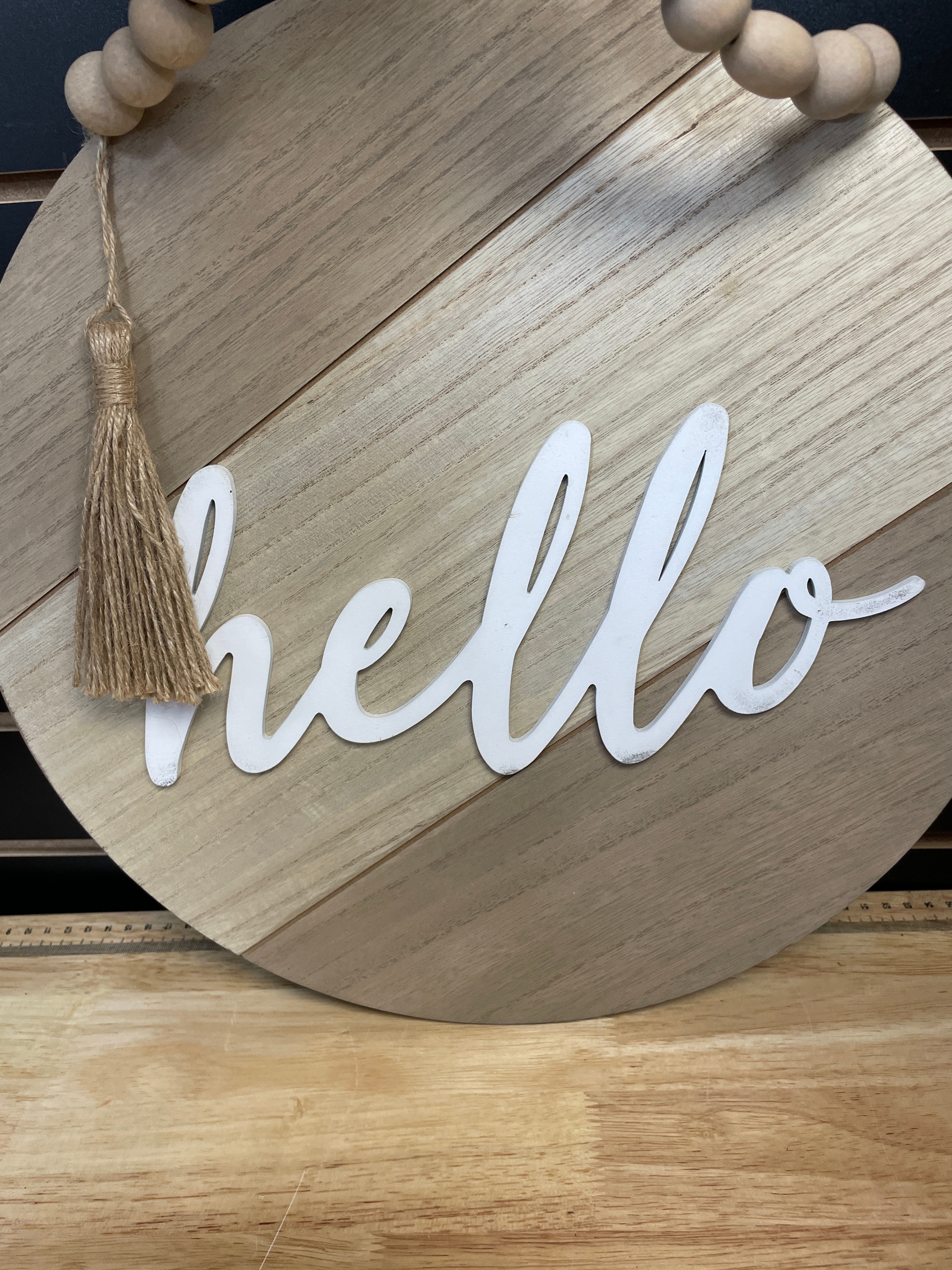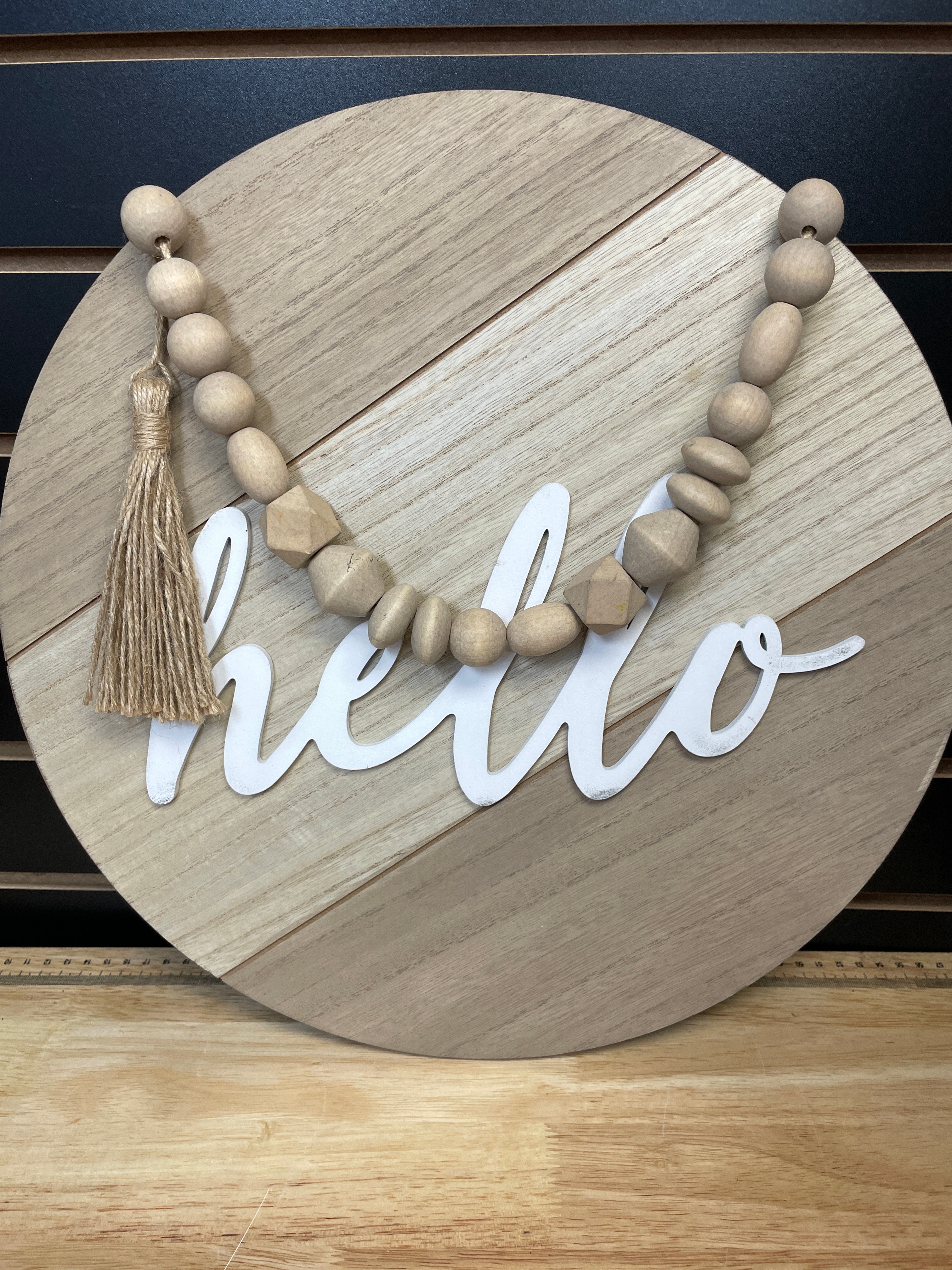 A round wooden wall sign, approximately 12 inches in diameter, in natural wood tones featuring “hello” in white script lettering, adorned with a strand of natural wood beads and a matching tassel.