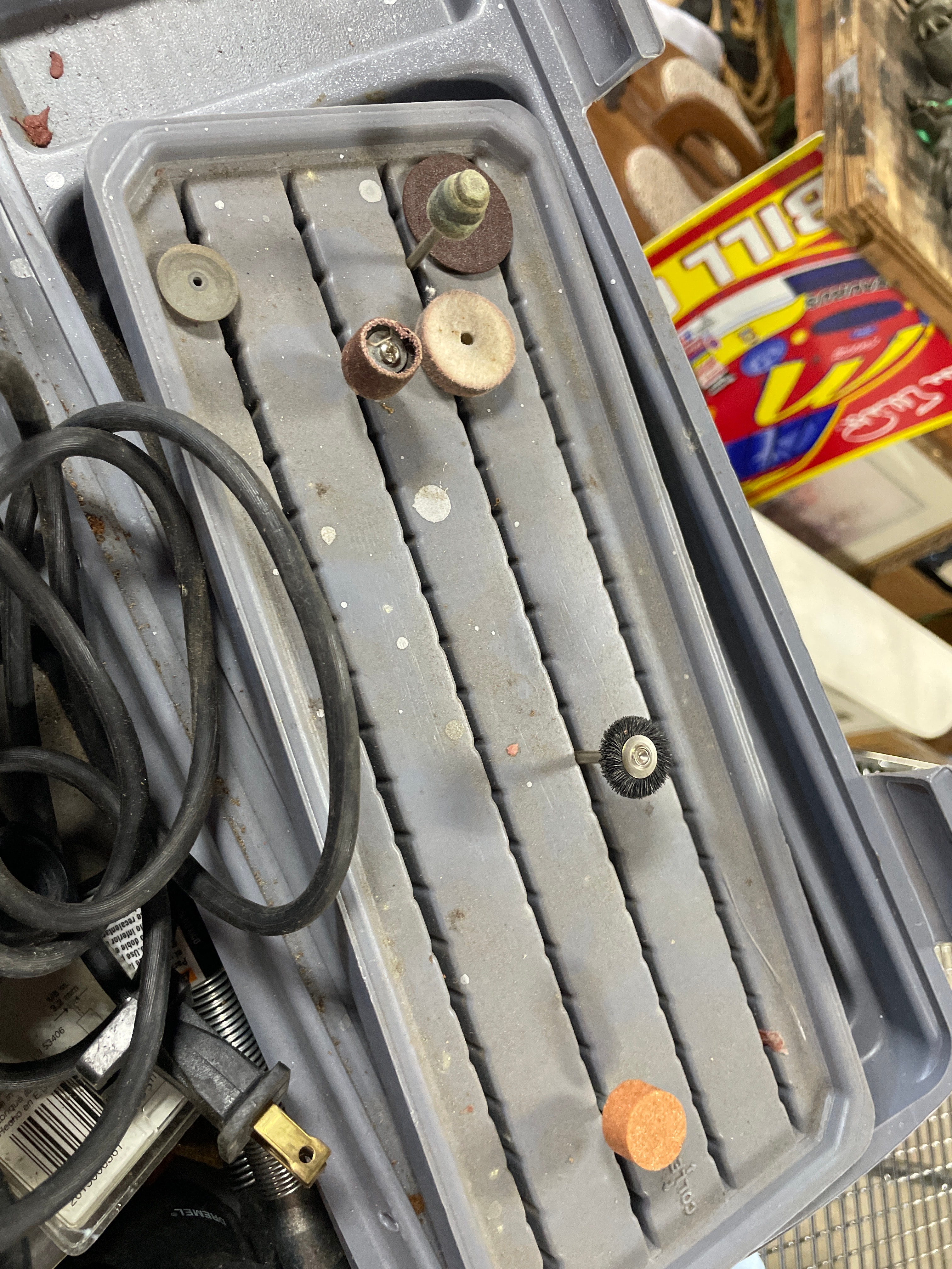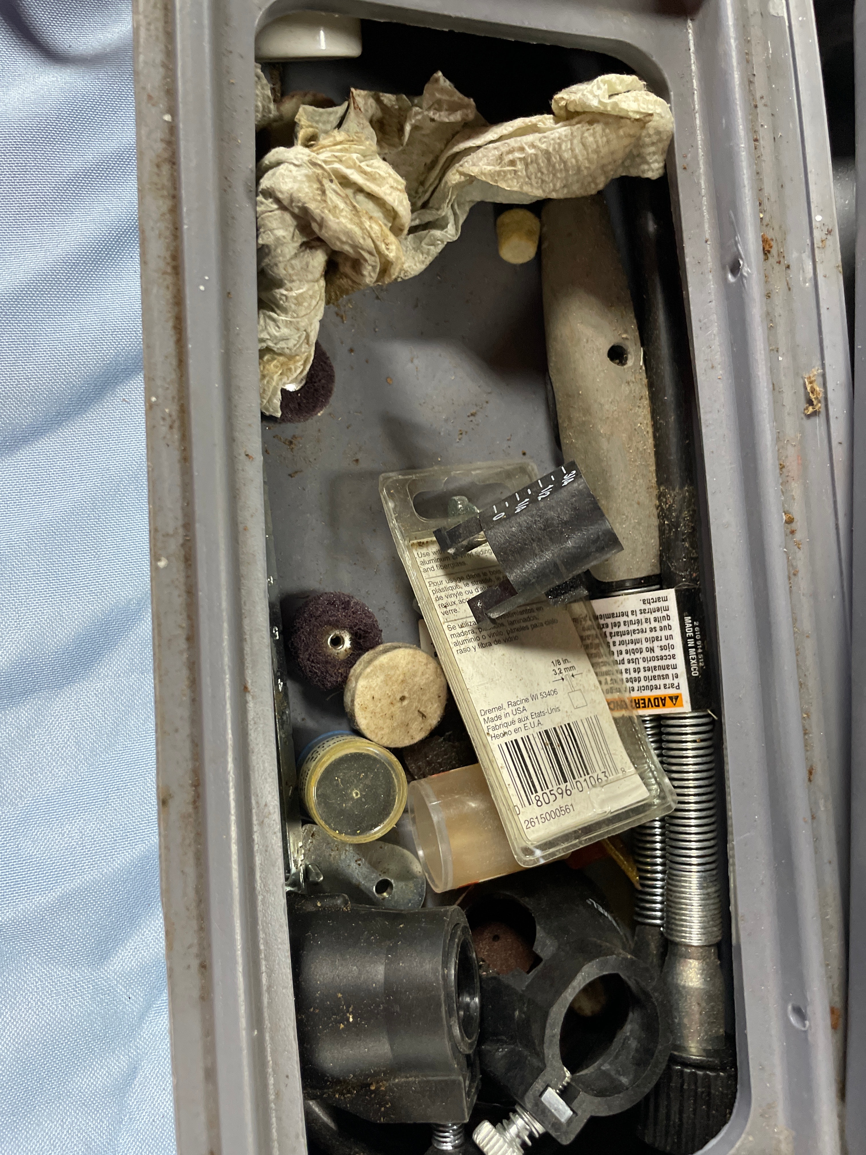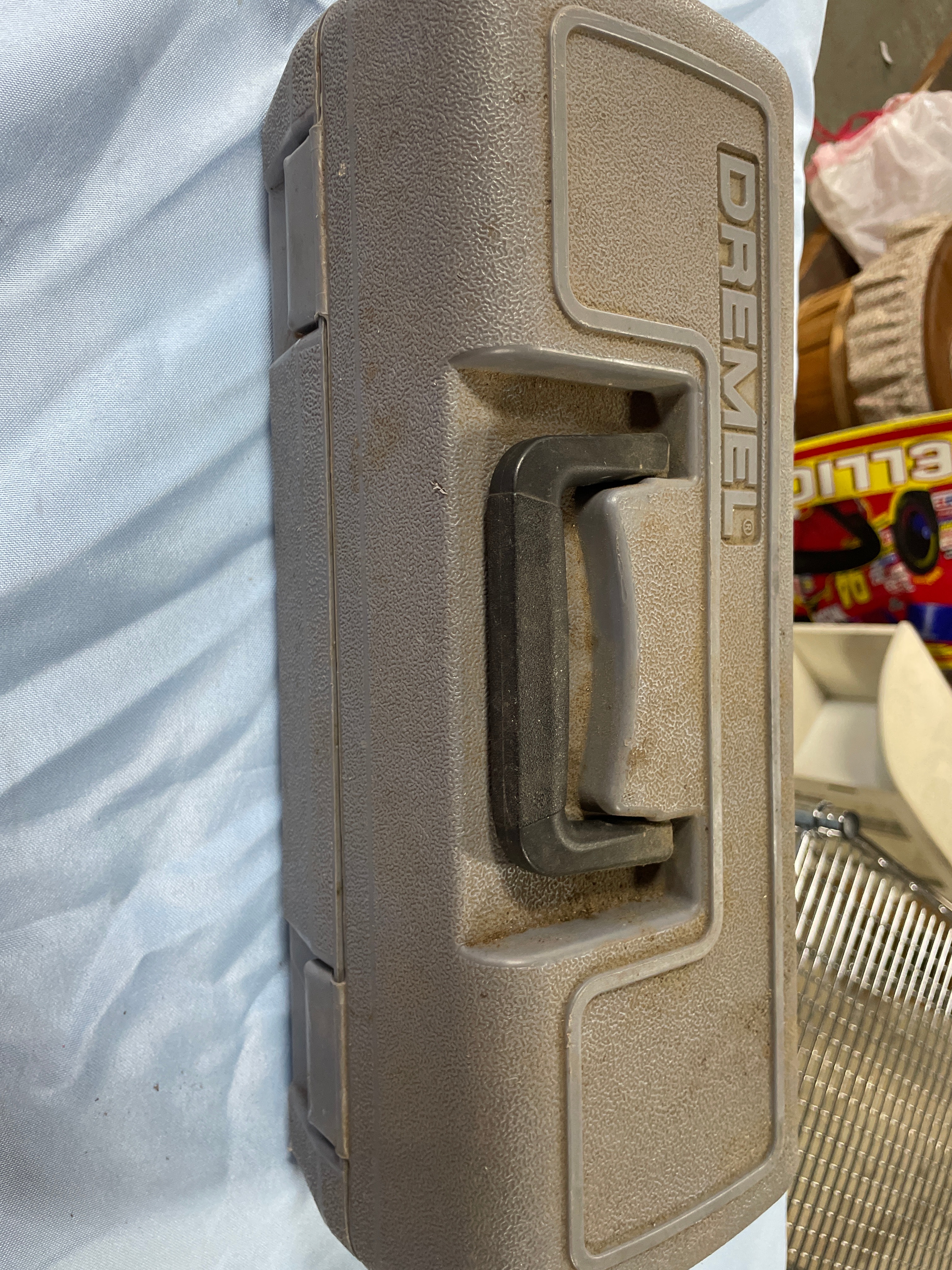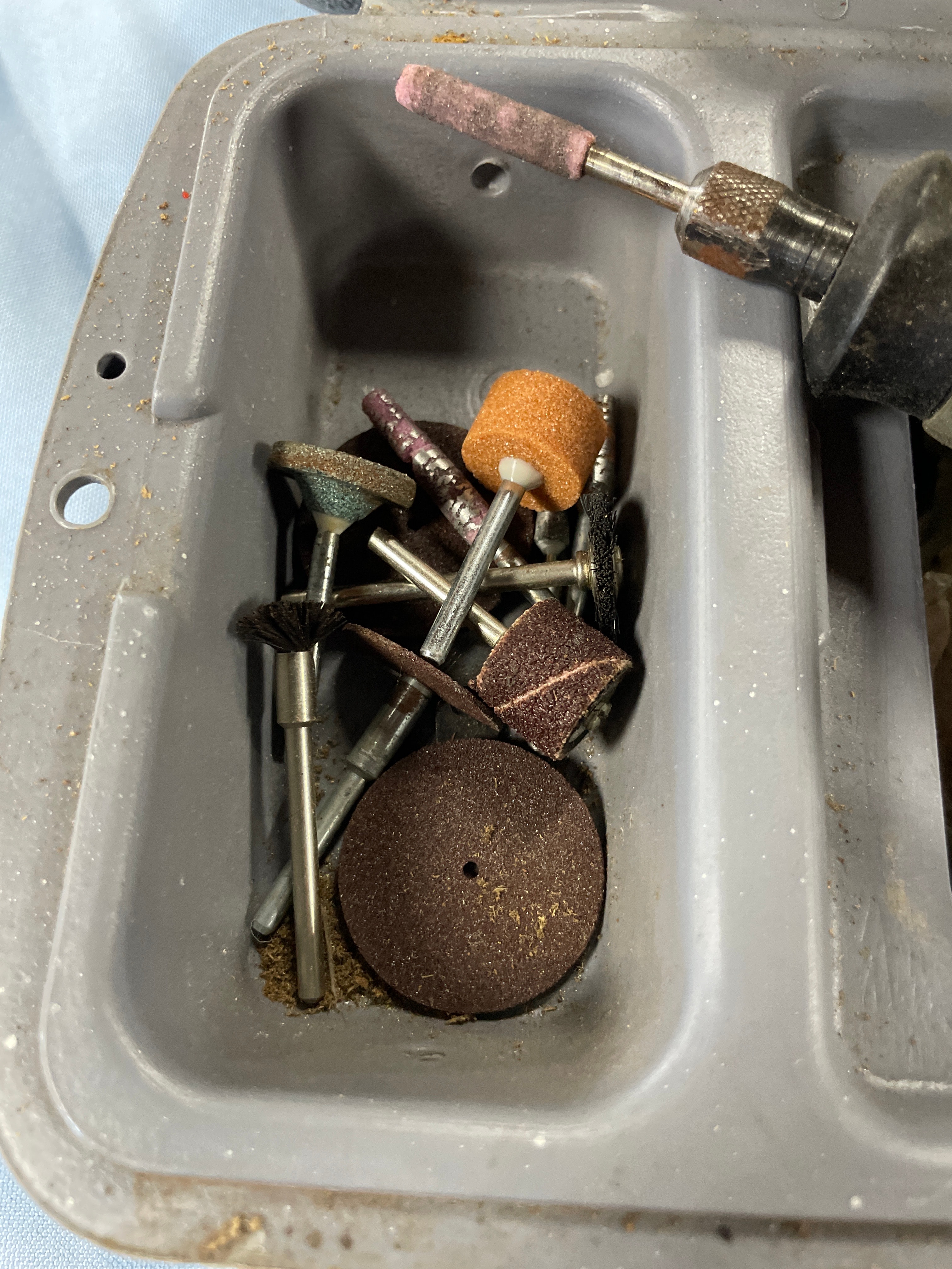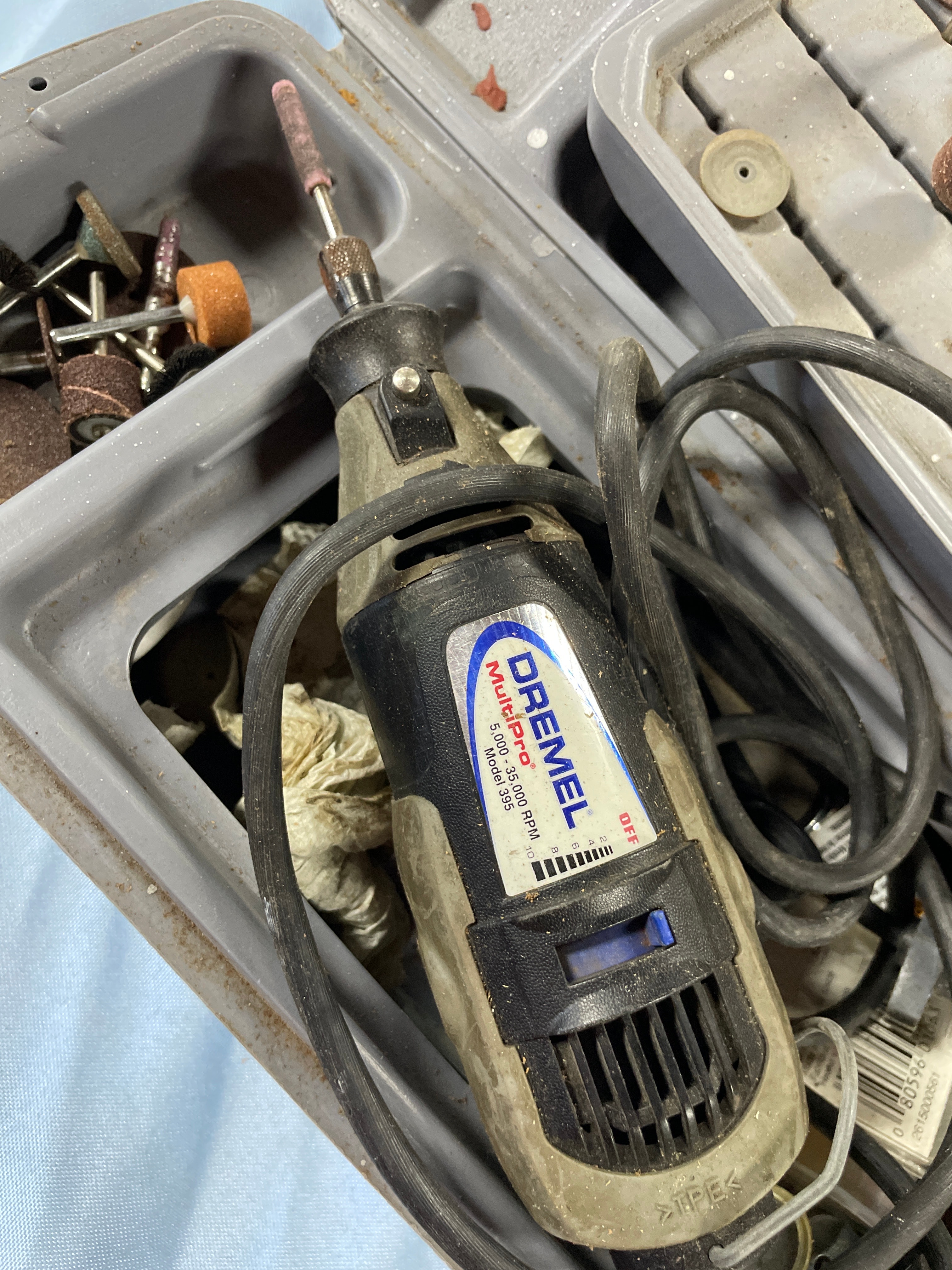 A gray and black Dremel MultiPro rotary tool, Model 395, with a visible label “DREMEL MultiPro 5,000 – 35,000 RPM Model 395” and an “OFF” switch, along with various brown, orange, gray, and silver grinding and sanding bits and other accessories, all stored in a gray Dremel brand carrying case.