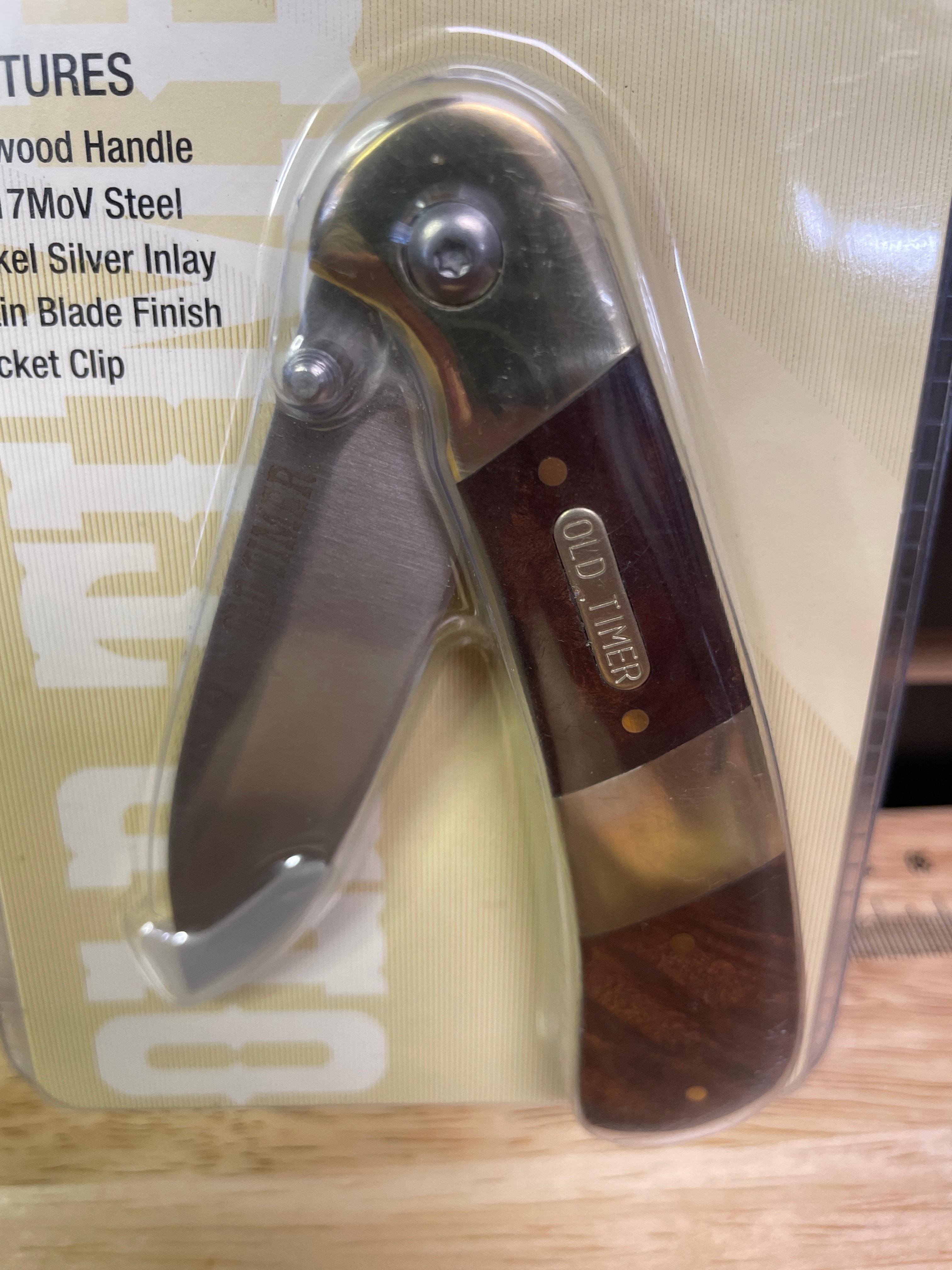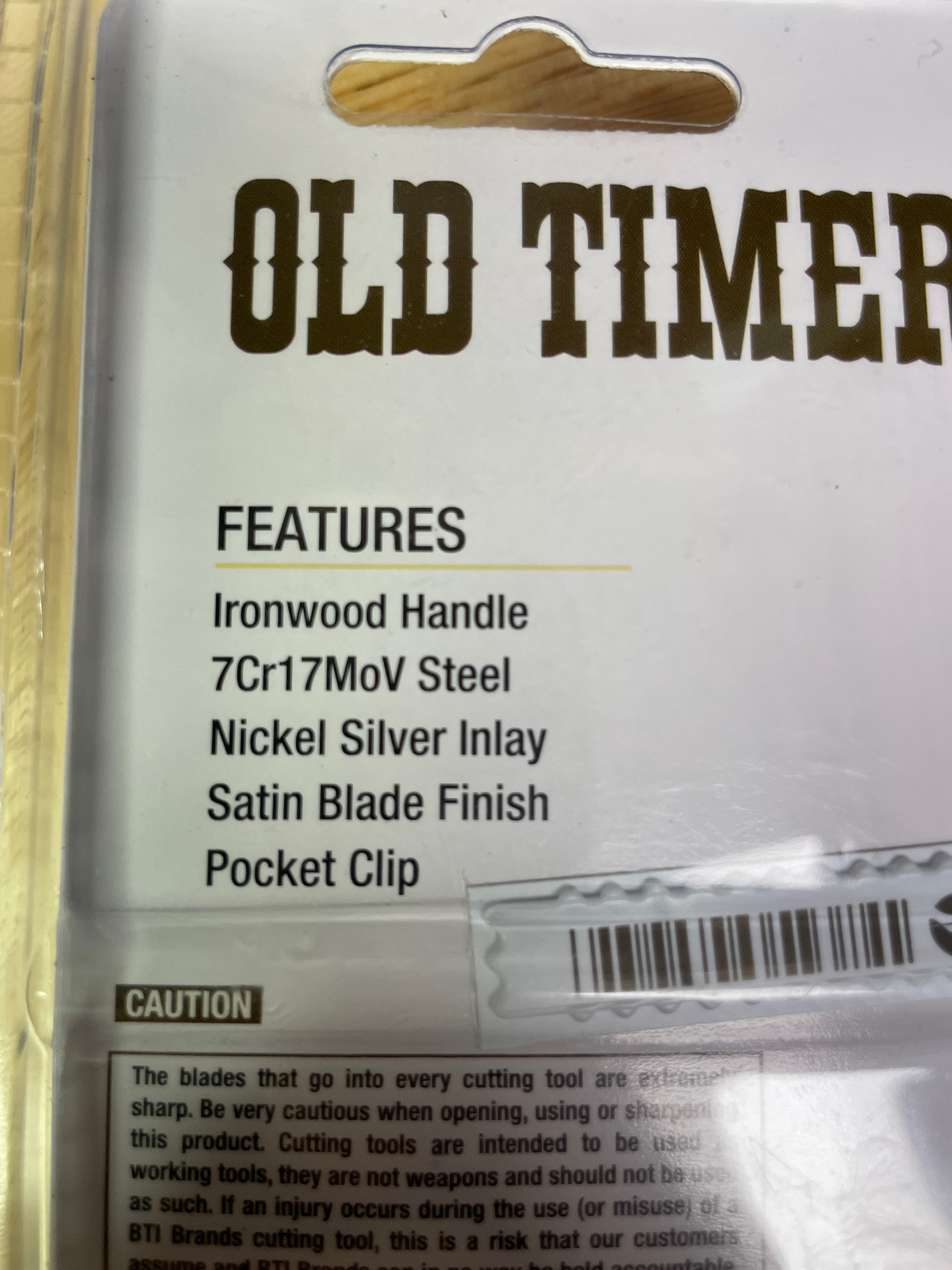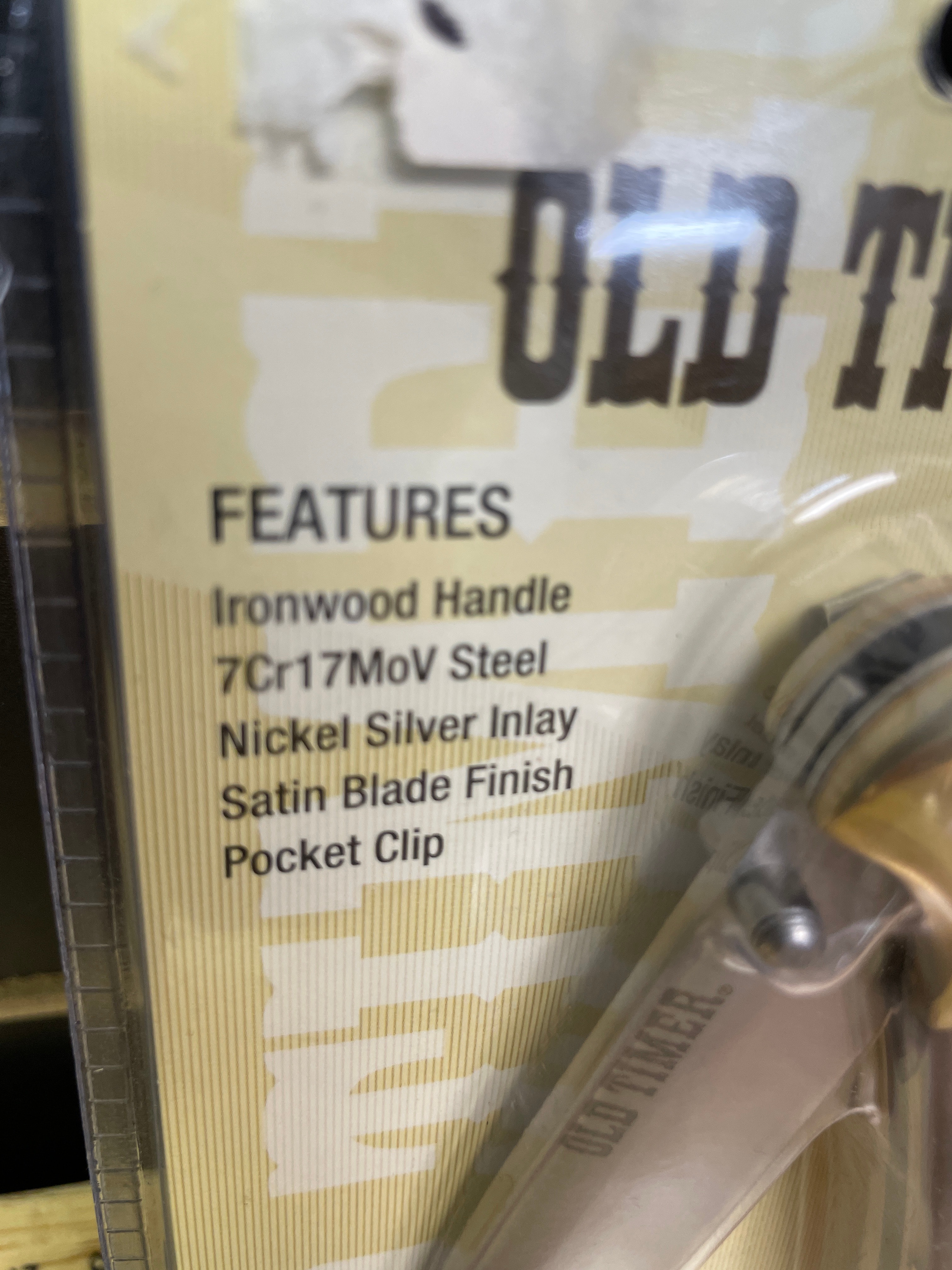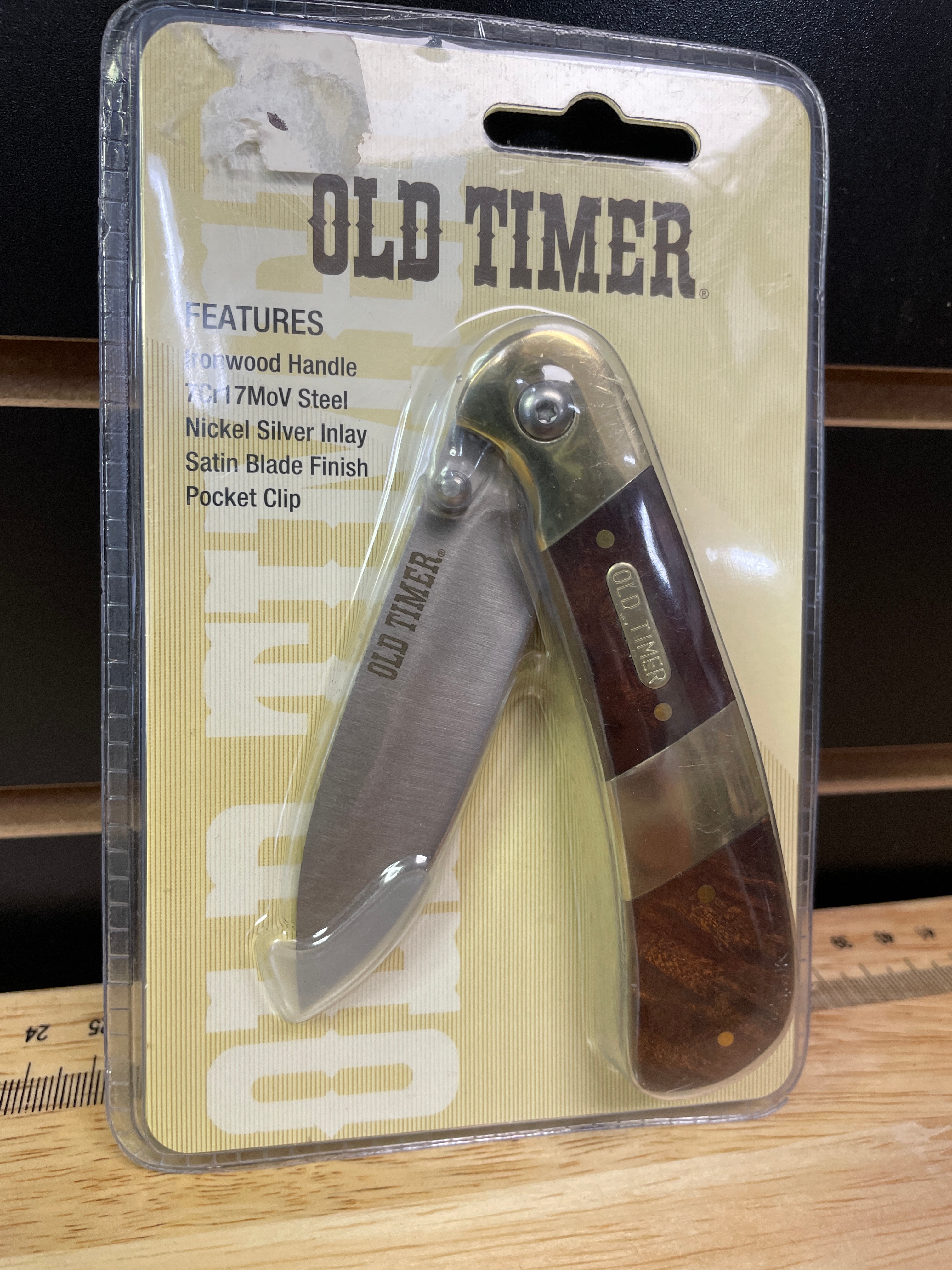 A single Old Timer folding knife, silver with dark brown and gold/brass accents, featuring an Ironwood Handle, 7Cr17MoV Steel, Nickel Silver Inlay, Satin Blade Finish, and Pocket Clip, presented in its original packaging.