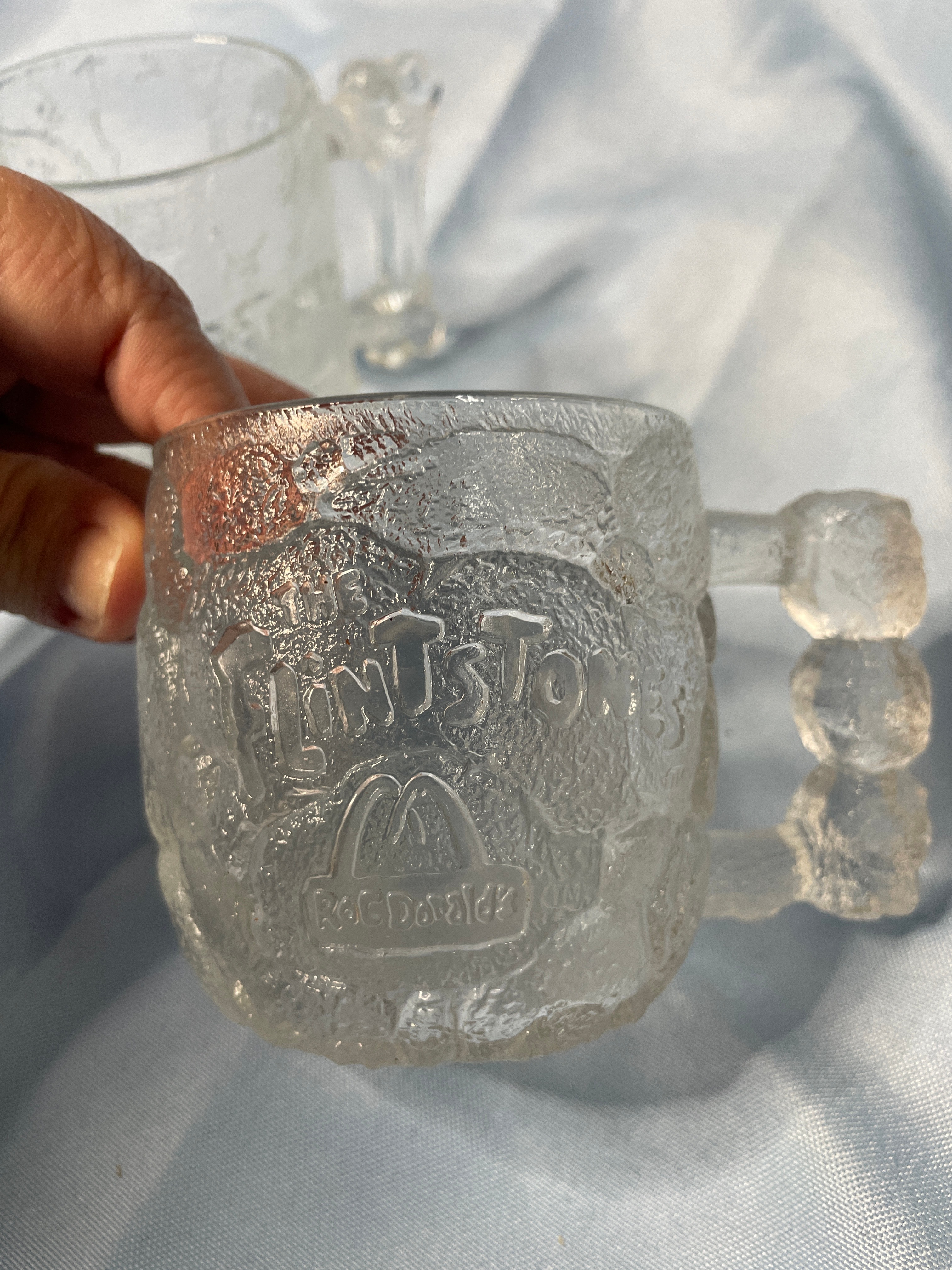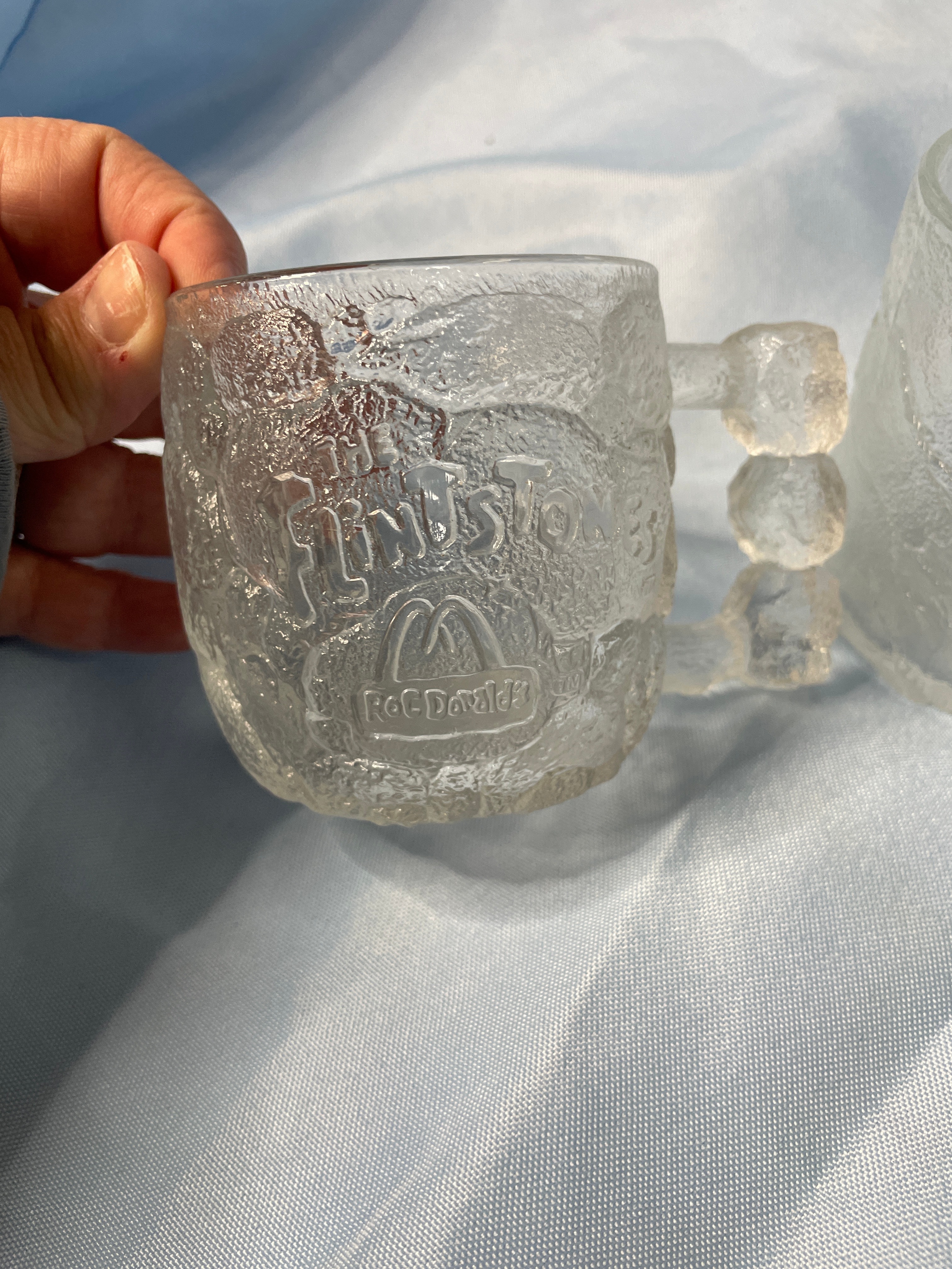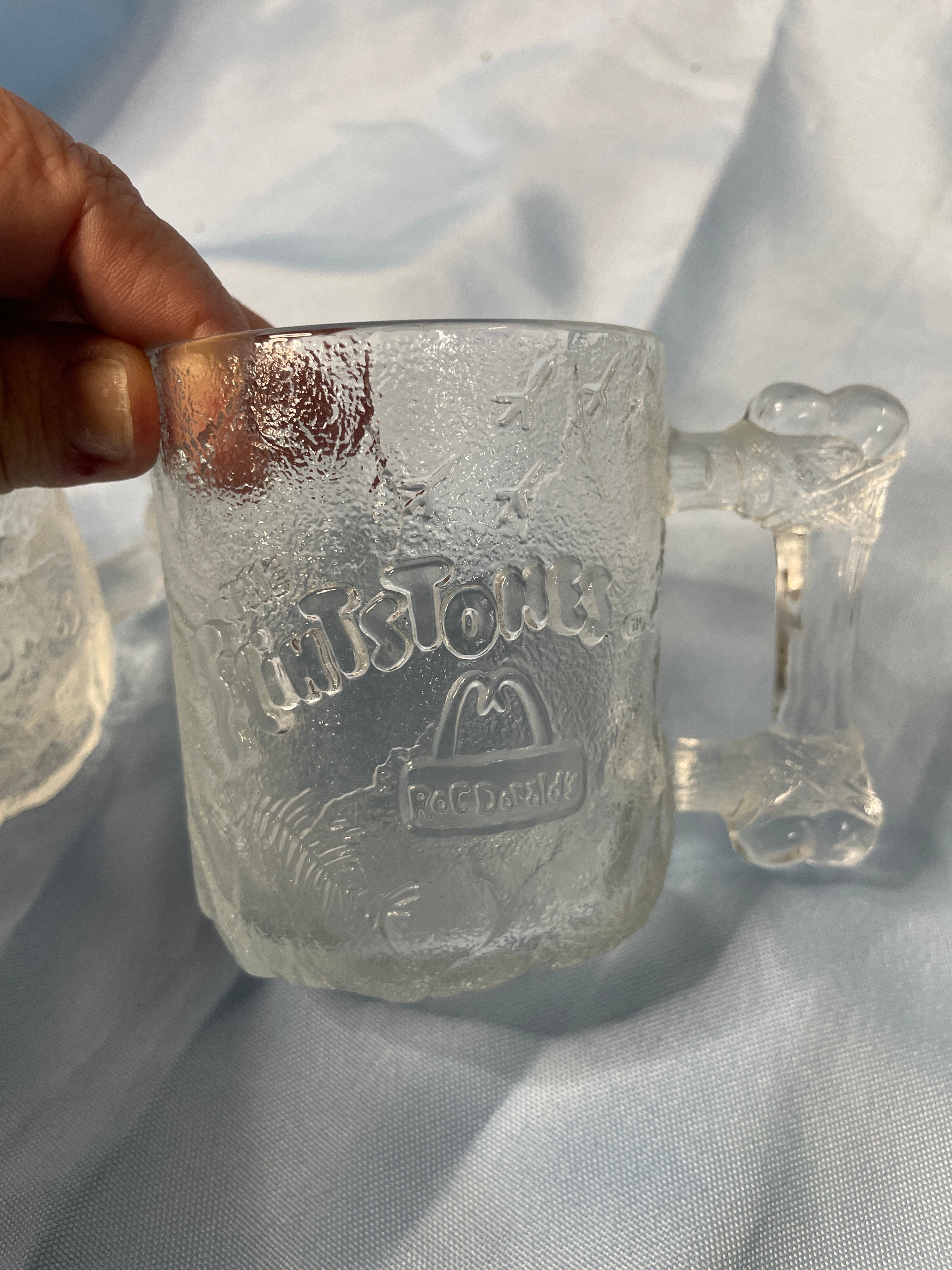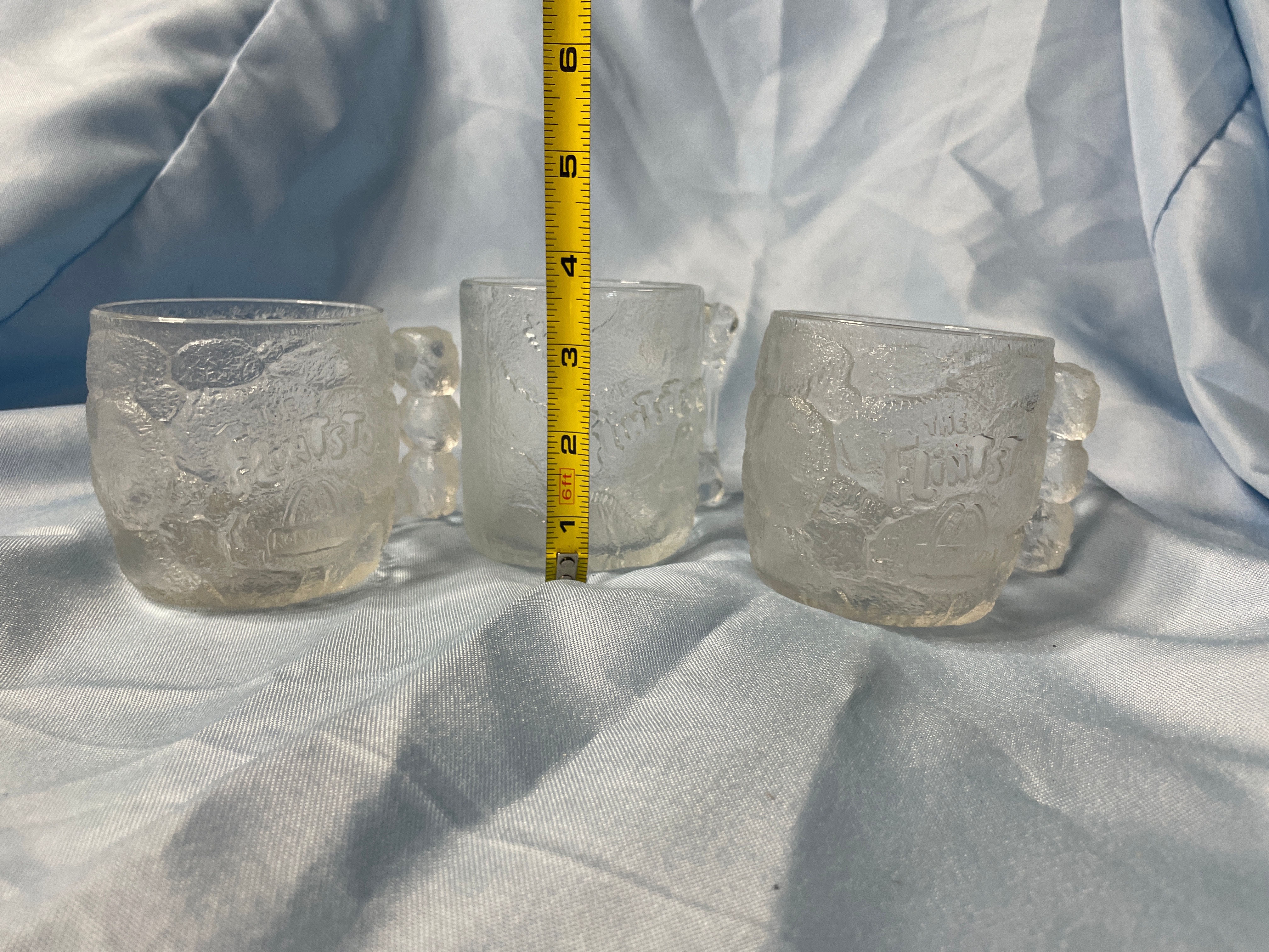 Three clear/frosted glass mugs, approximately 3.5 inches tall, each embossed with “THE FLINTSTONES” above a McDonald’s “M” logo and “McDonald’s” text.