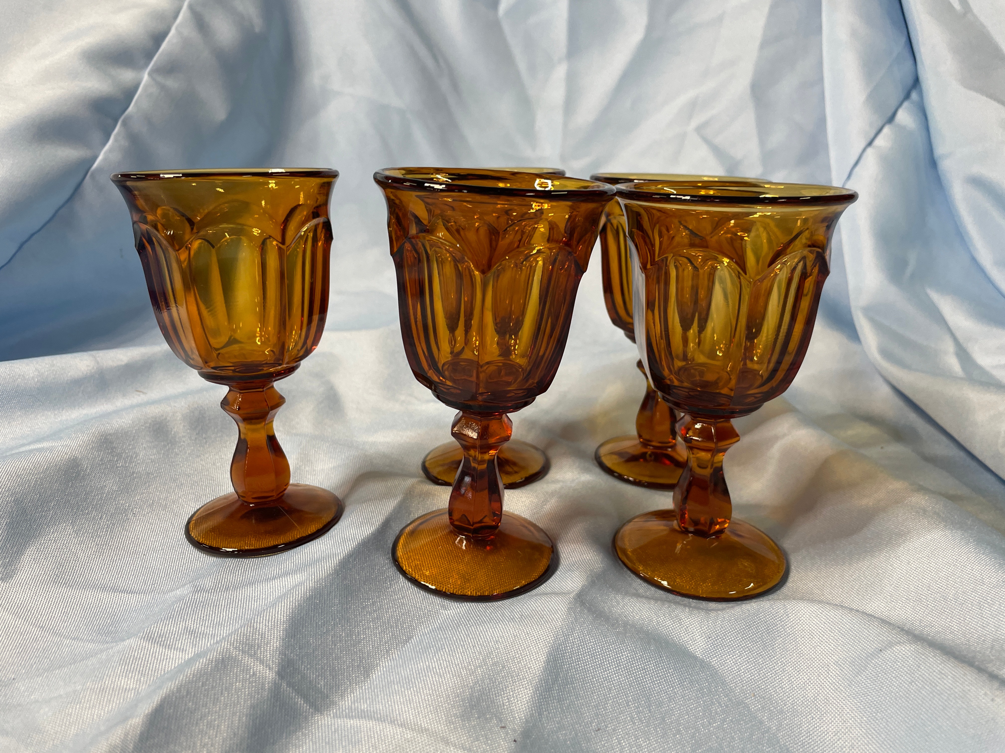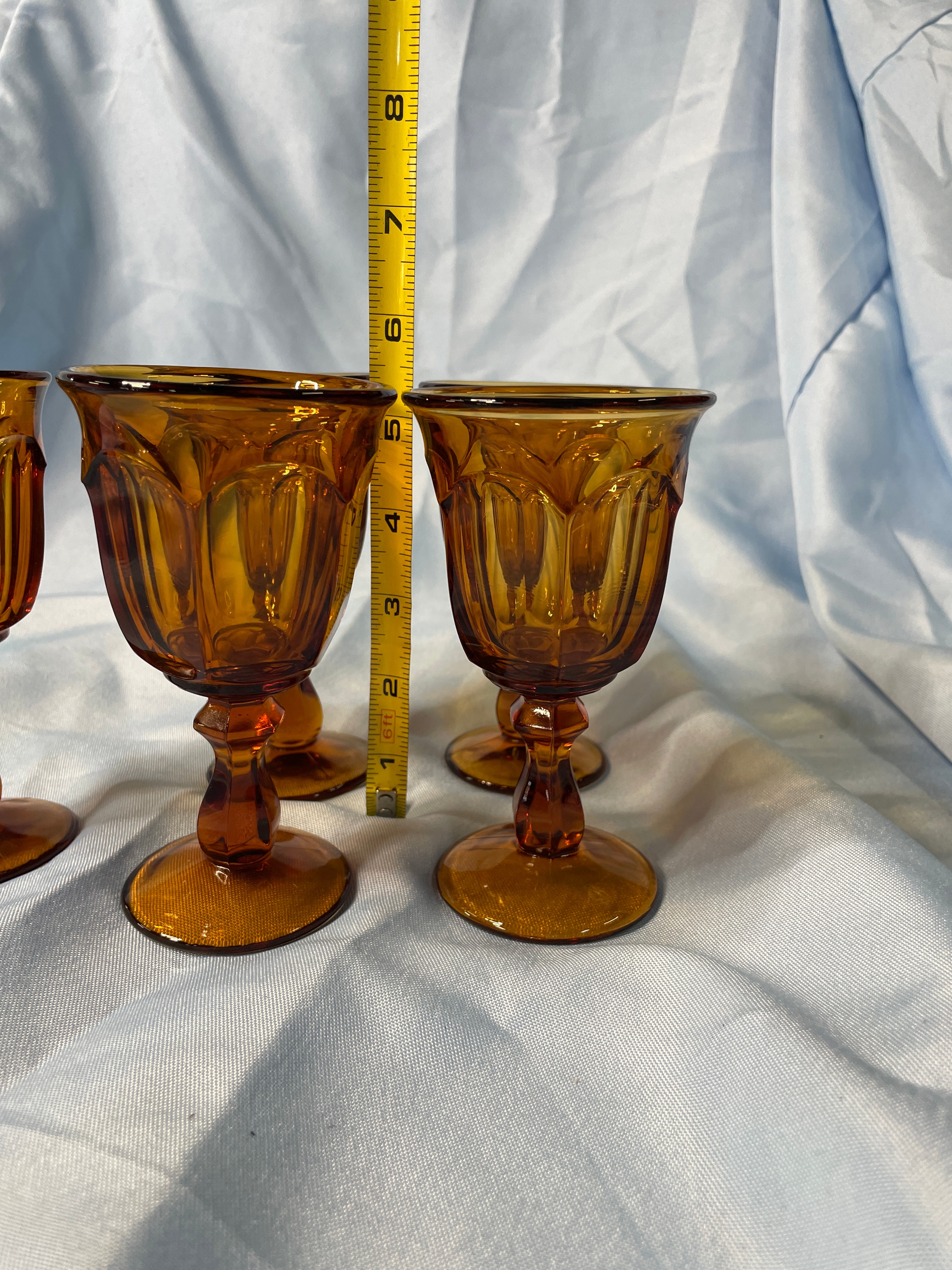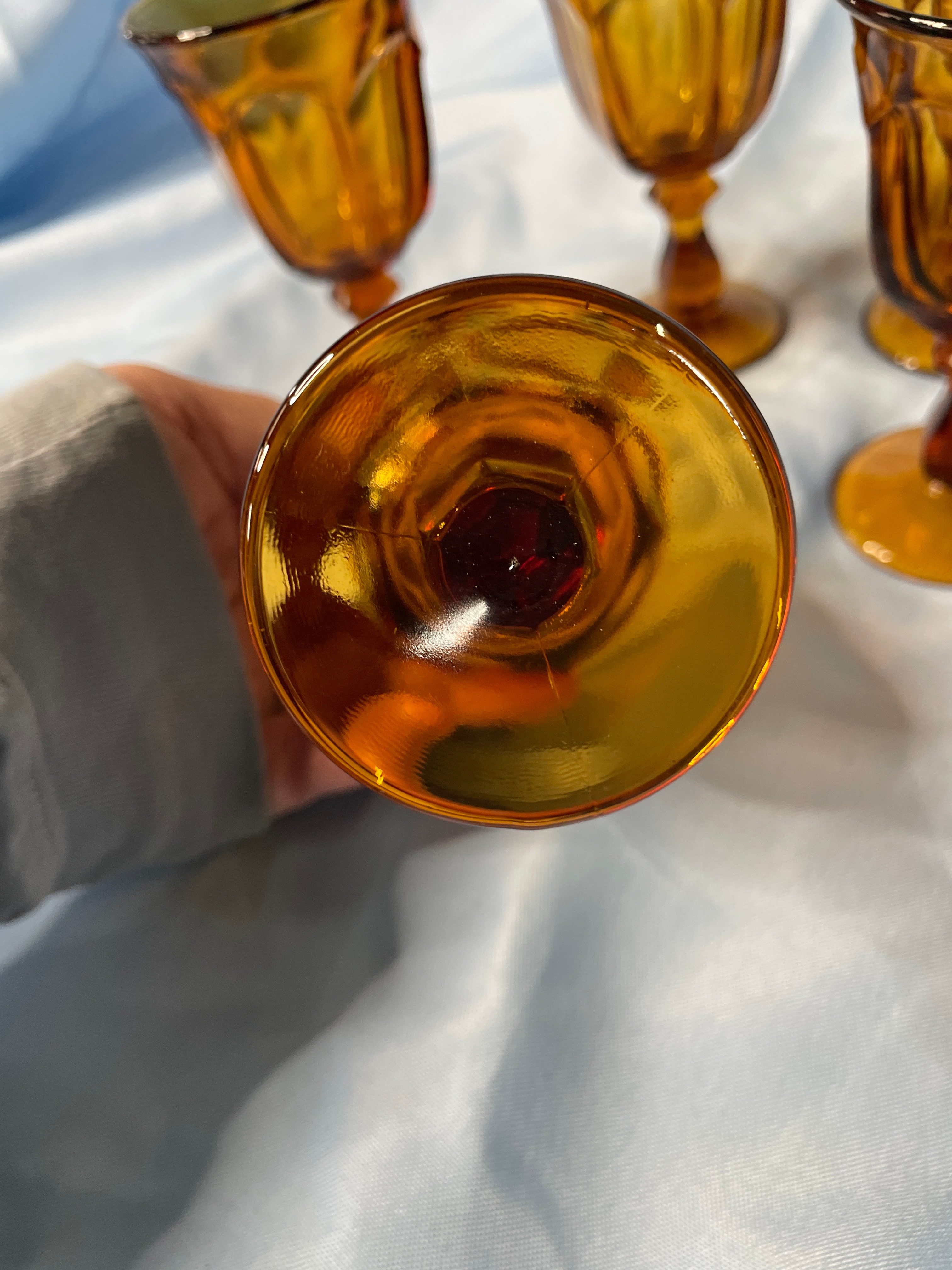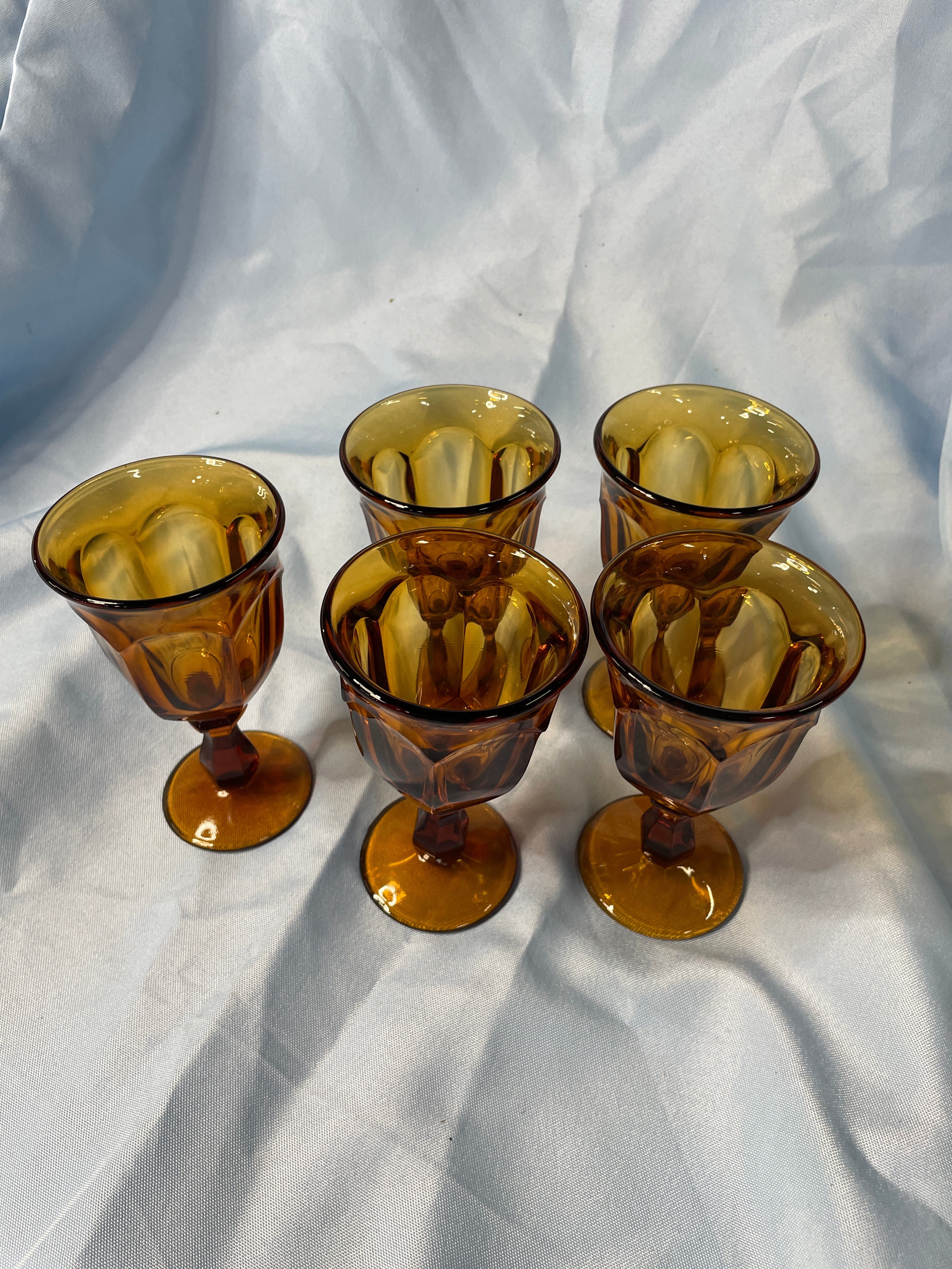 A set of six amber-colored stemmed glass goblets, each approximately 5 1/2 inches tall.