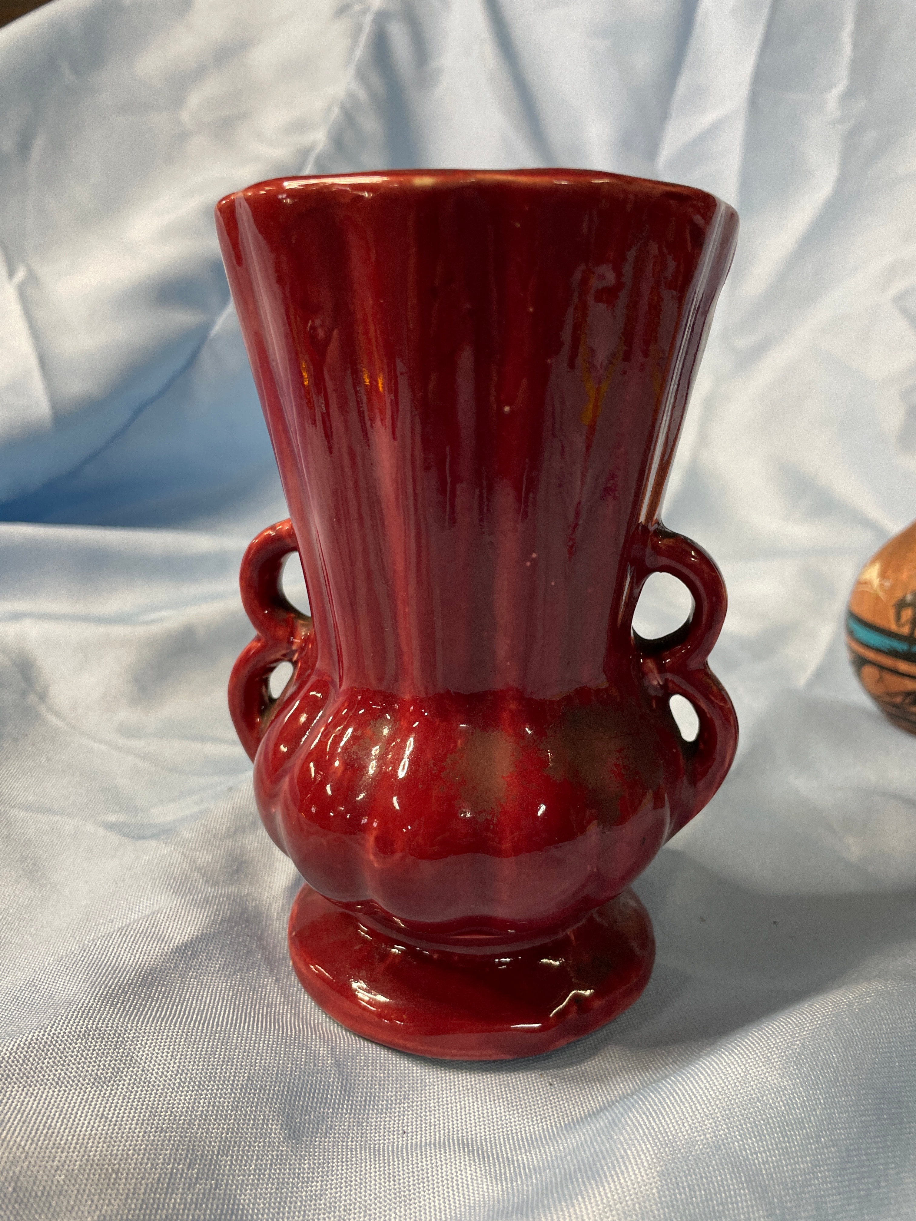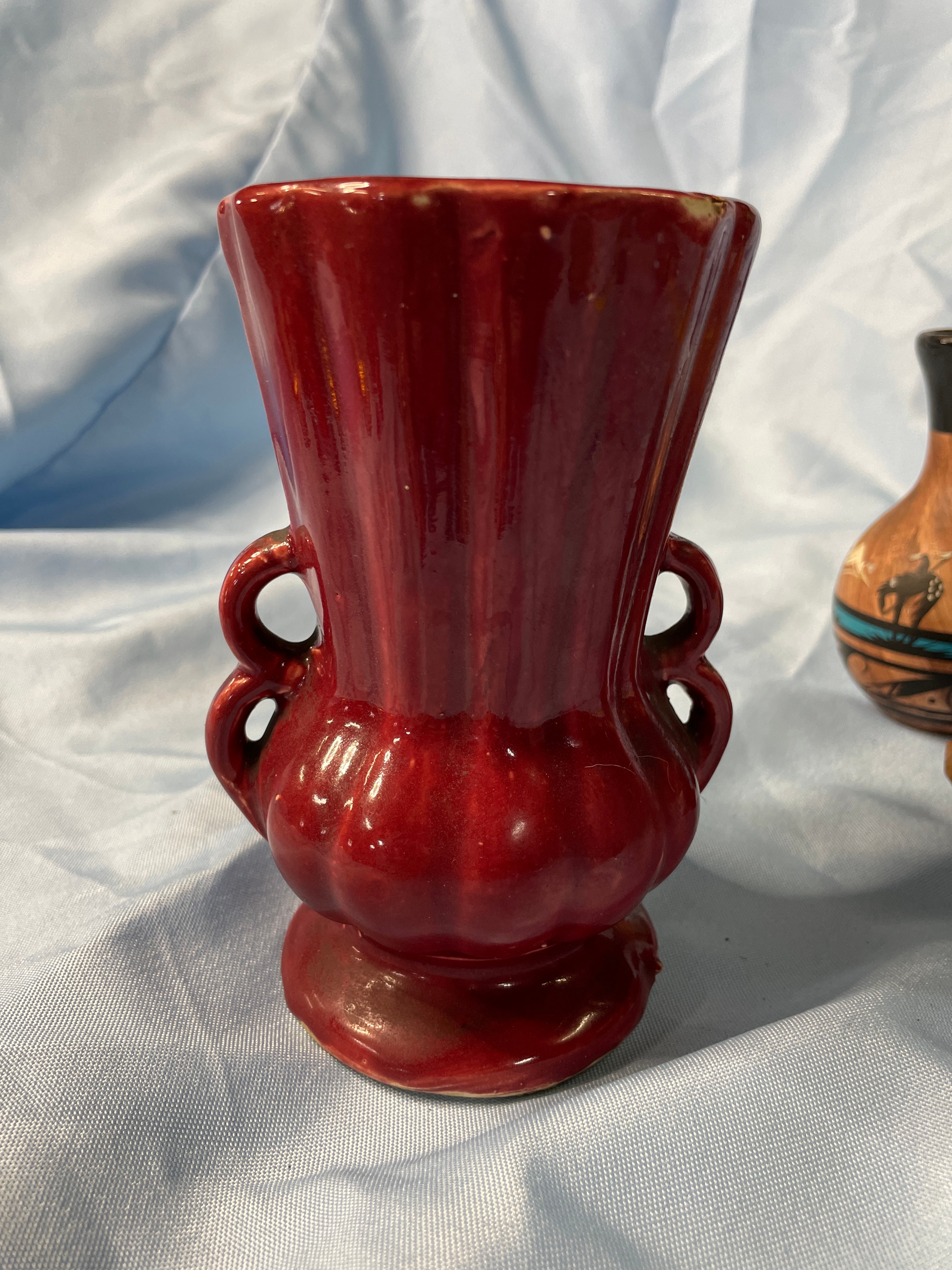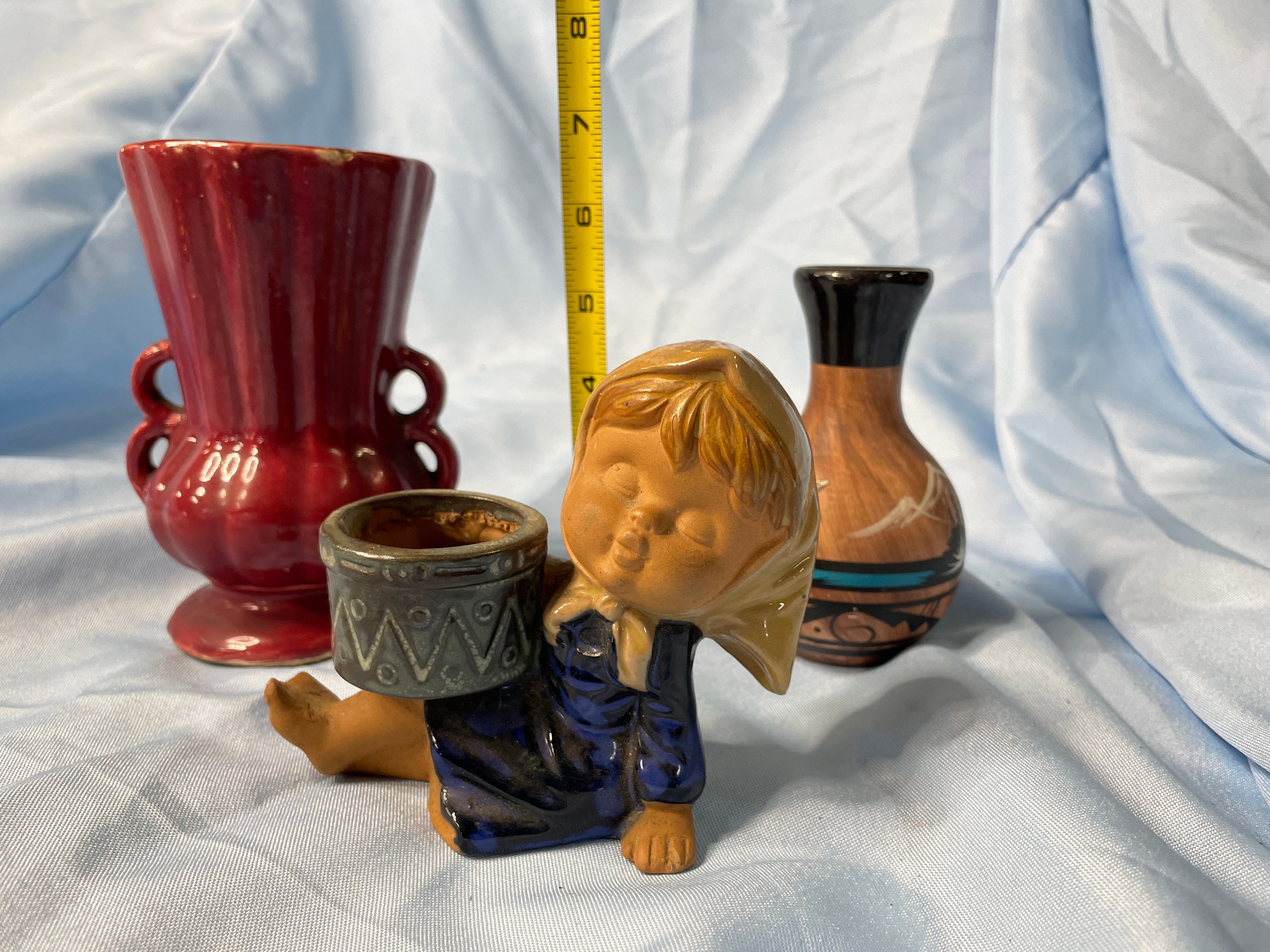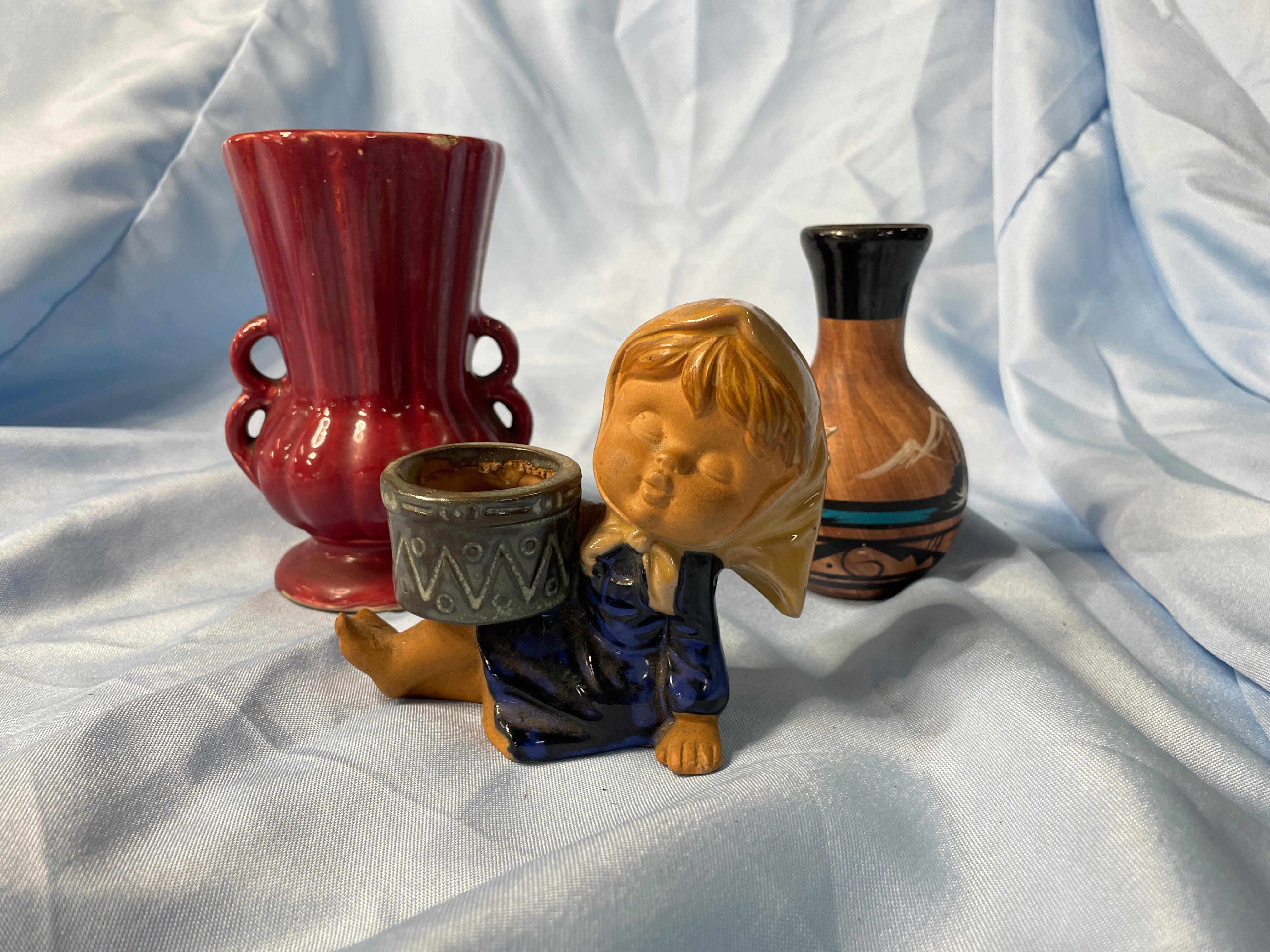 A glossy deep red ceramic vase with embossed swirl and ‘CV’ on base (approx. 5.5 inches tall), a brown, dark blue, and grey ceramic child figurine holding a patterned pot, and a brown, black, and teal ceramic vase with tribal designs signed ‘Brush Fire Navajo’ on bottom.