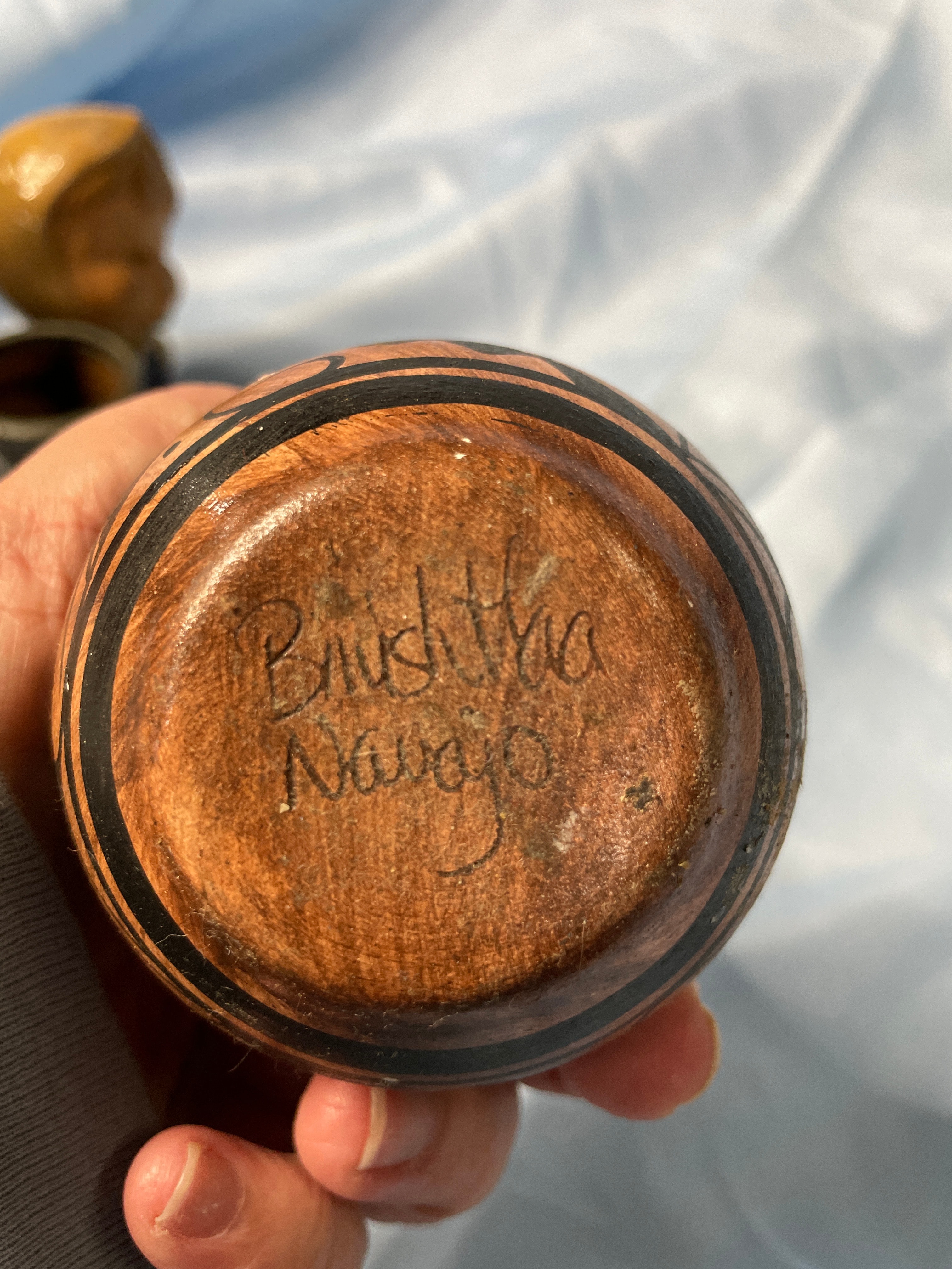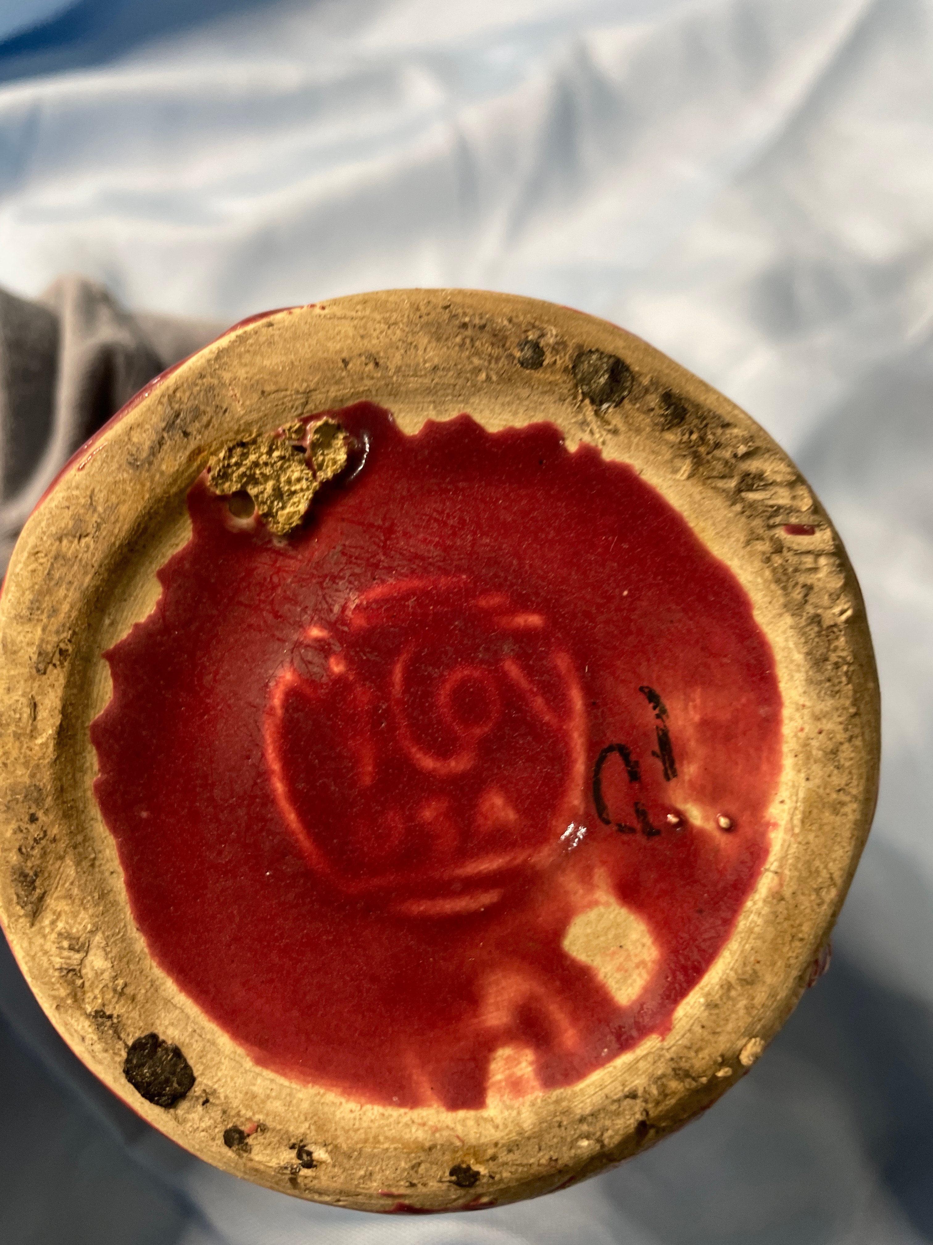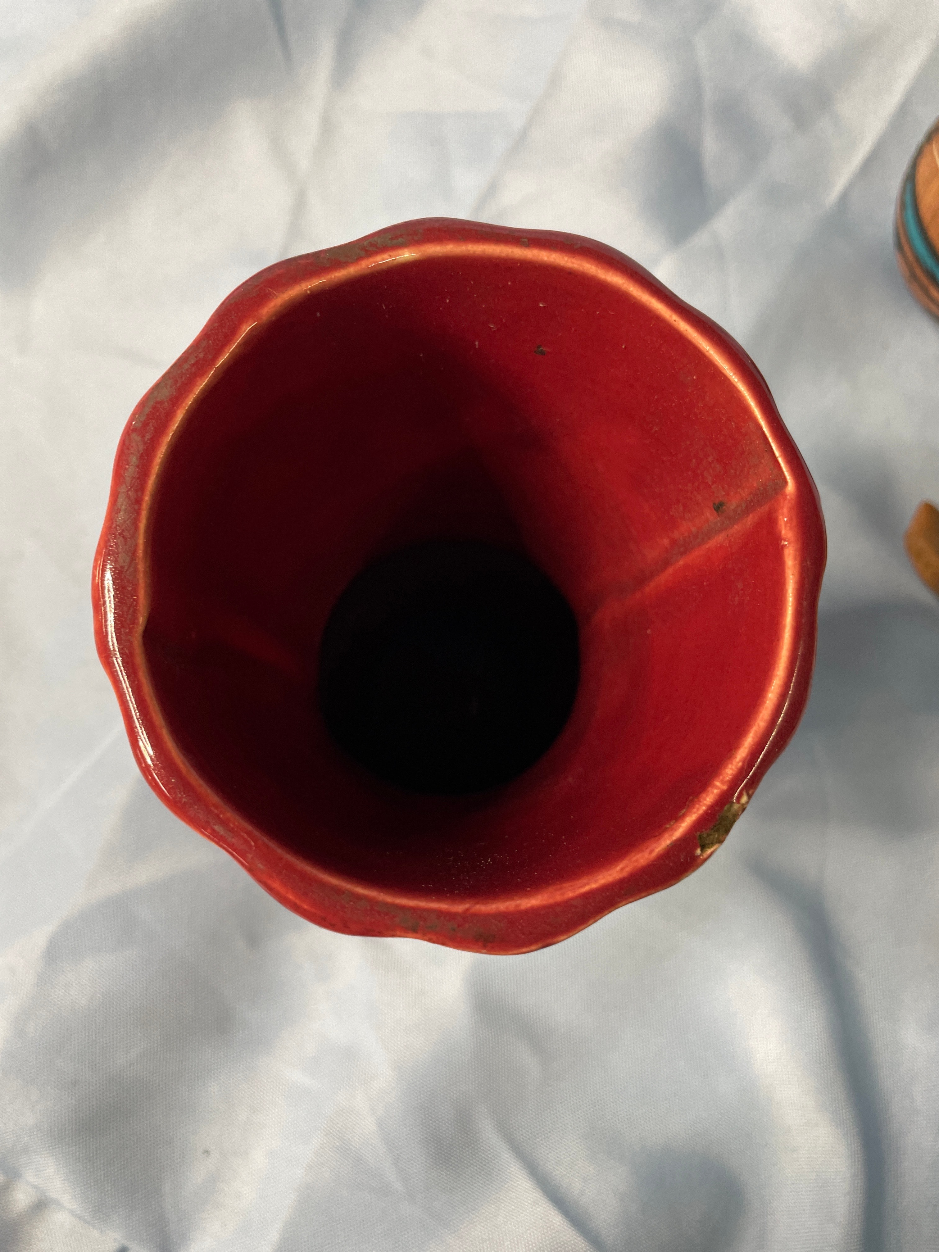 A glossy deep red ceramic vase with embossed swirl and ‘CV’ on base (approx. 5.5 inches tall), a brown, dark blue, and grey ceramic child figurine holding a patterned pot, and a brown, black, and teal ceramic vase with tribal designs signed ‘Brush Fire Navajo’ on bottom.