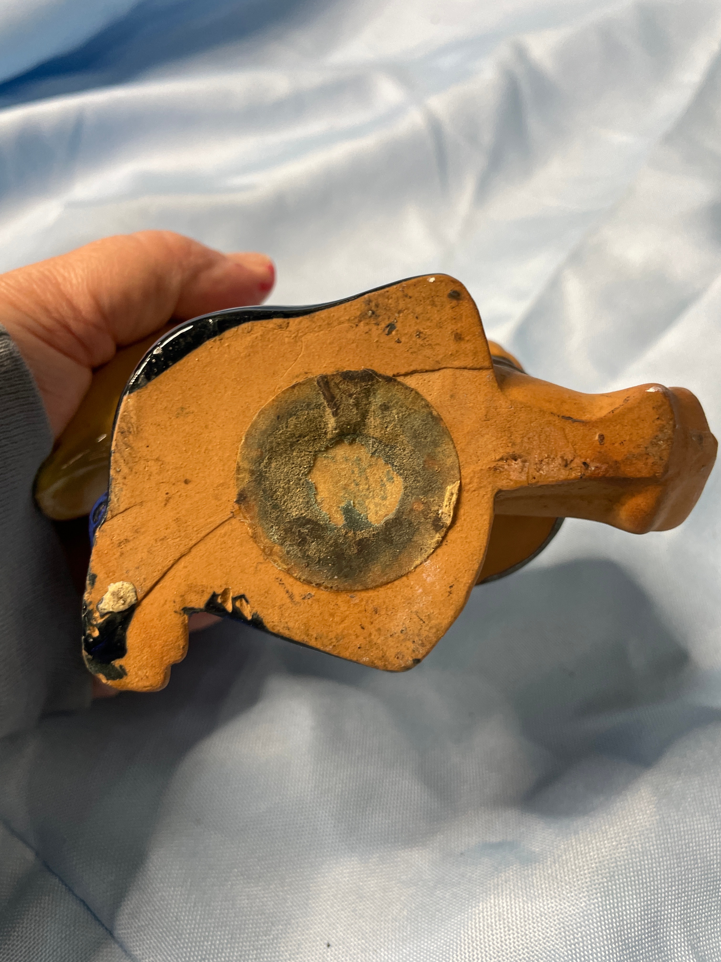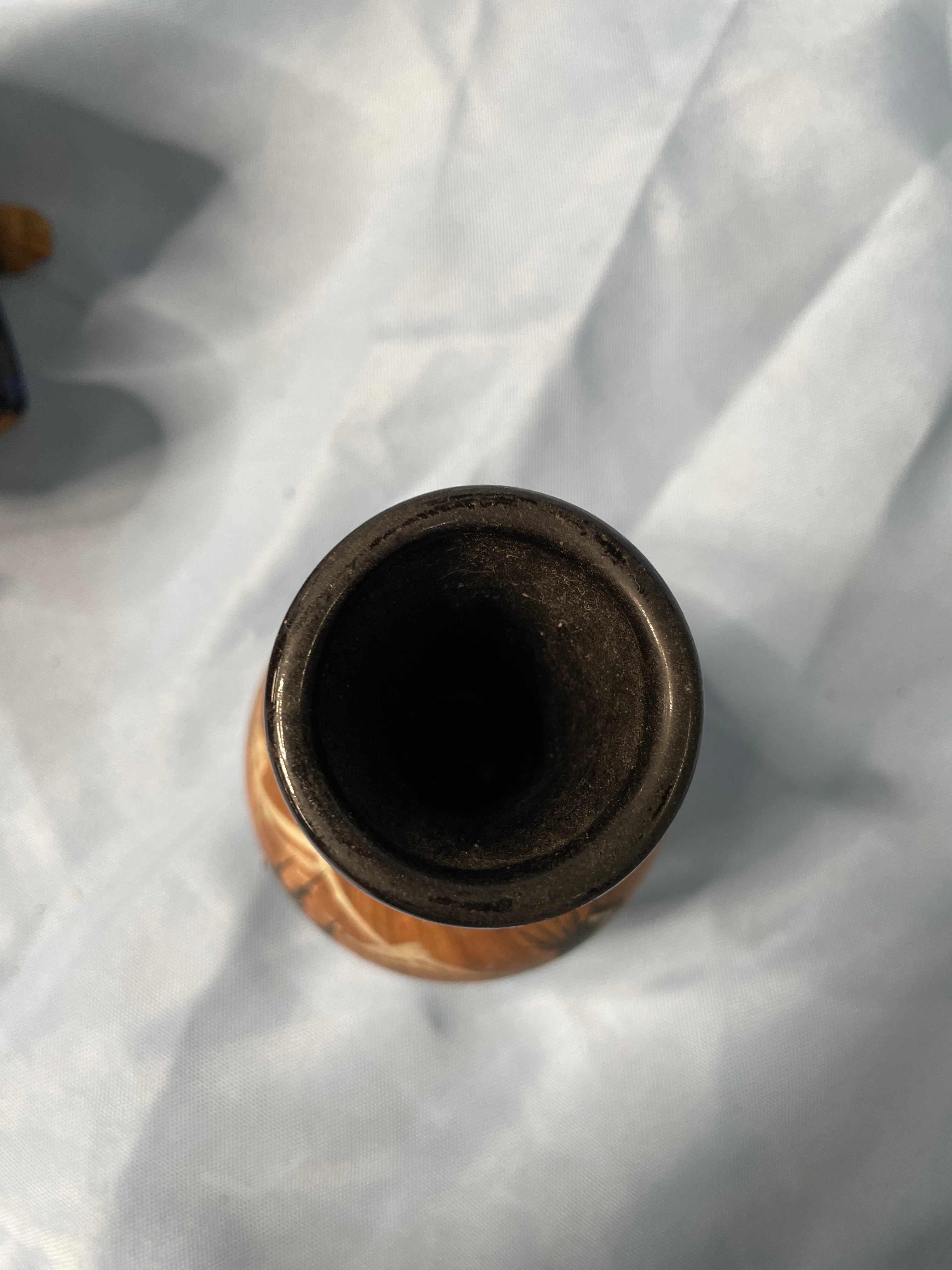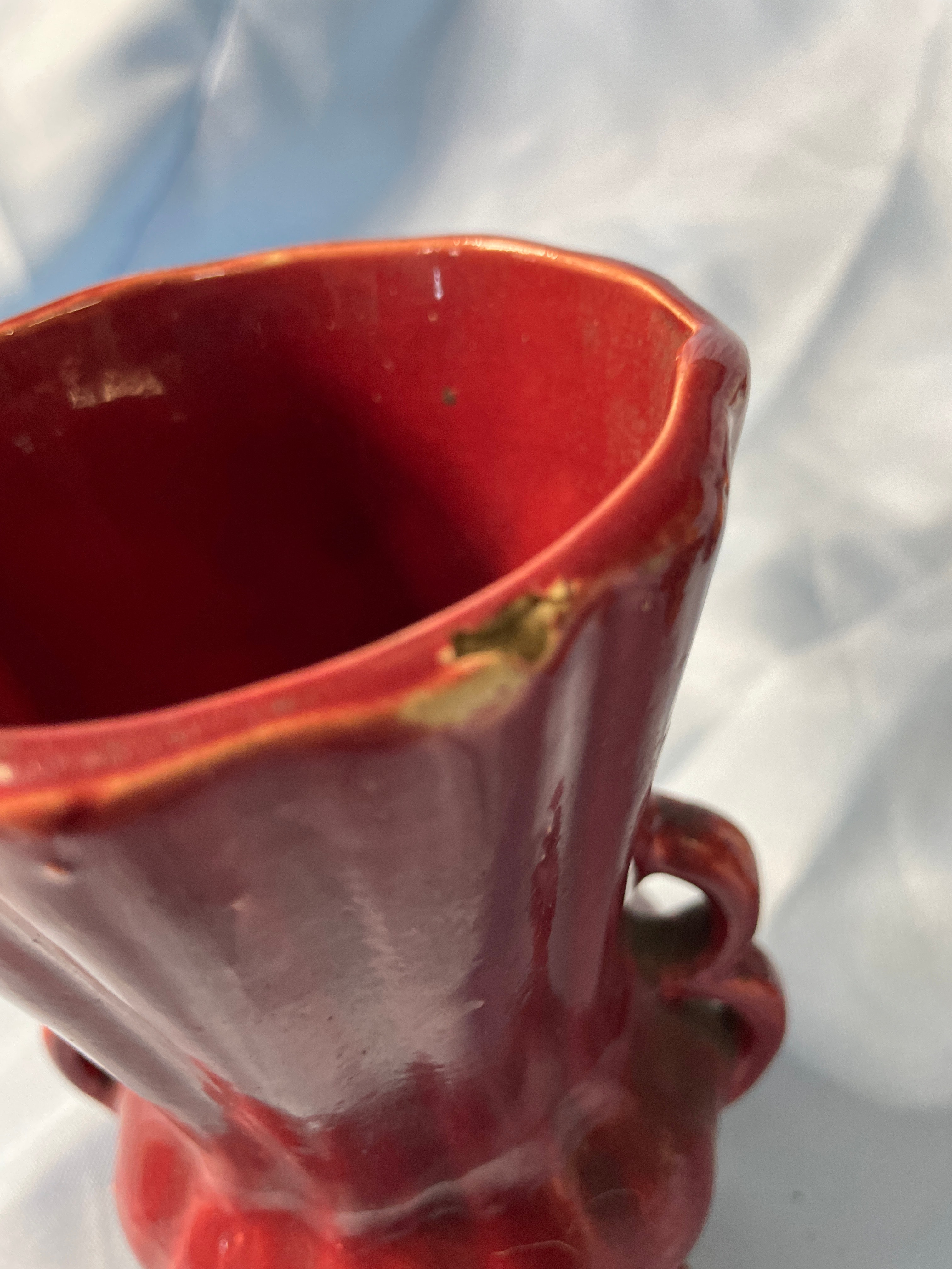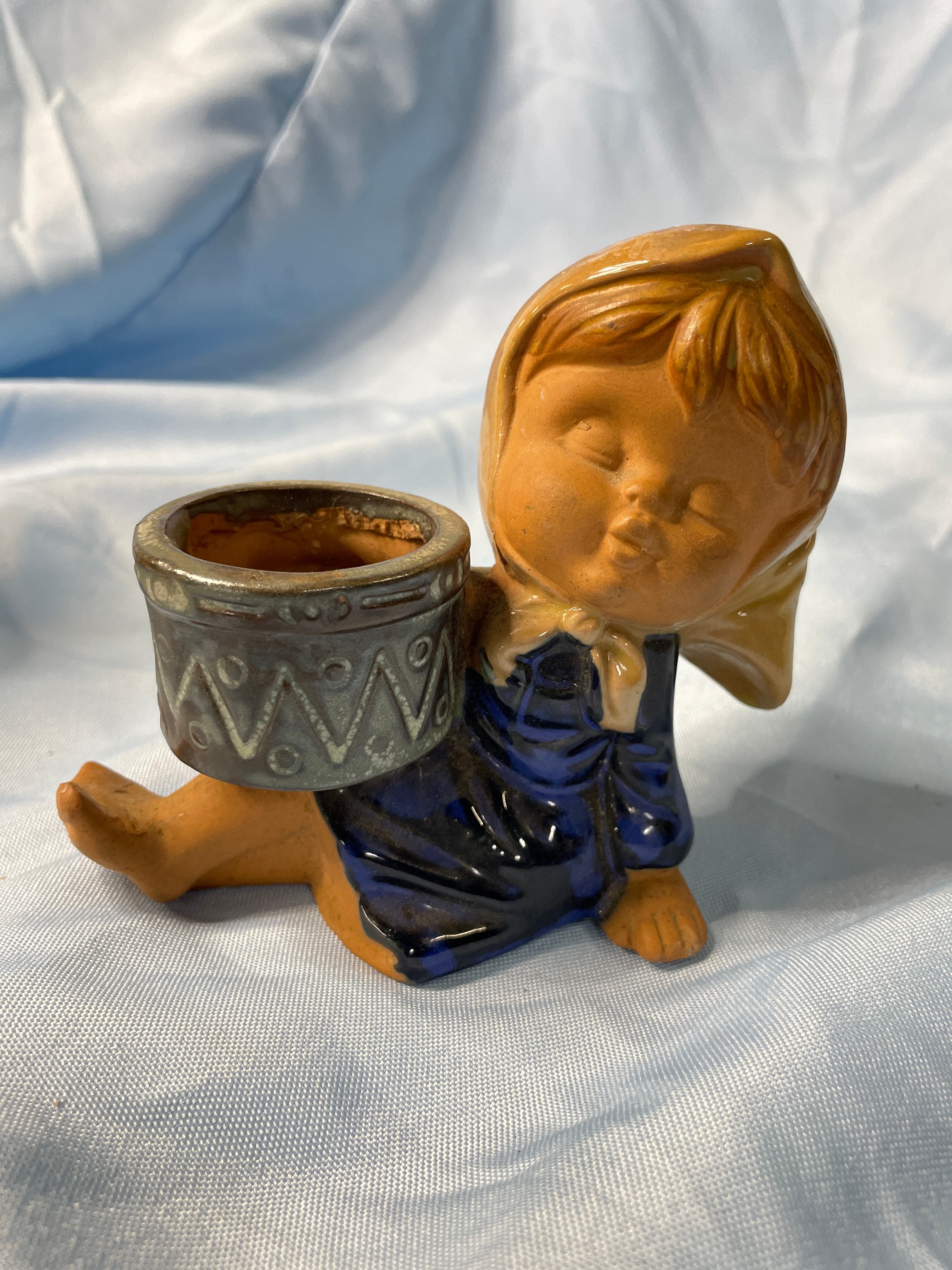 A glossy deep red ceramic vase with embossed swirl and ‘CV’ on base (approx. 5.5 inches tall), a brown, dark blue, and grey ceramic child figurine holding a patterned pot, and a brown, black, and teal ceramic vase with tribal designs signed ‘Brush Fire Navajo’ on bottom.
